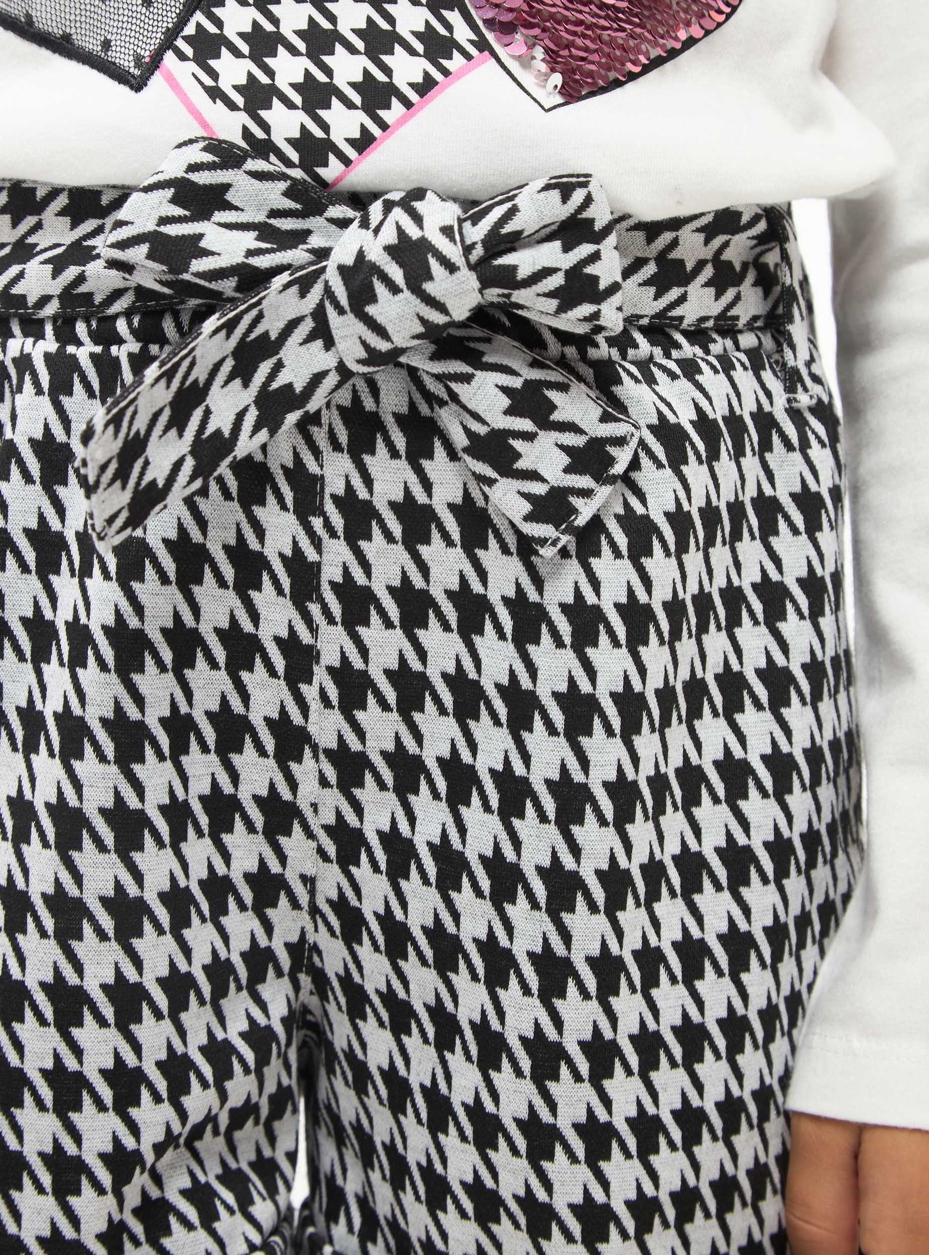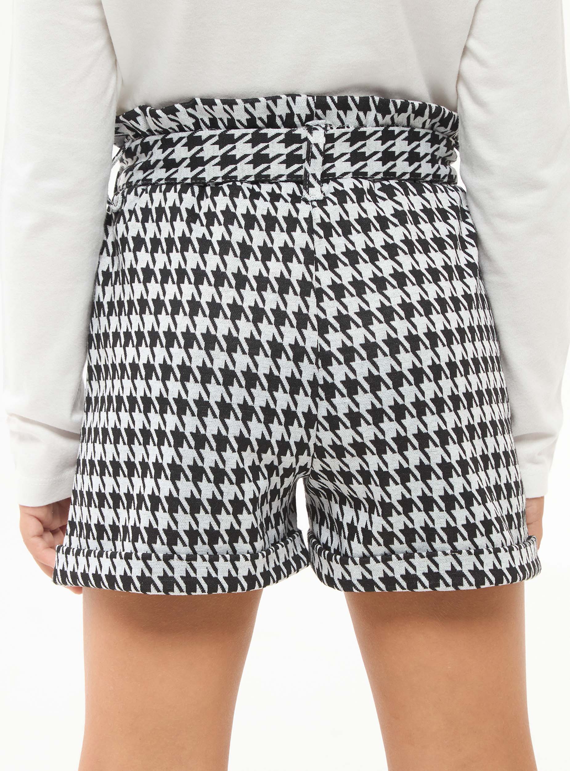 Shorts da bambina con vita arricciata ed elasticizzata. Fusciacca in vita, fantasia pied de poule.