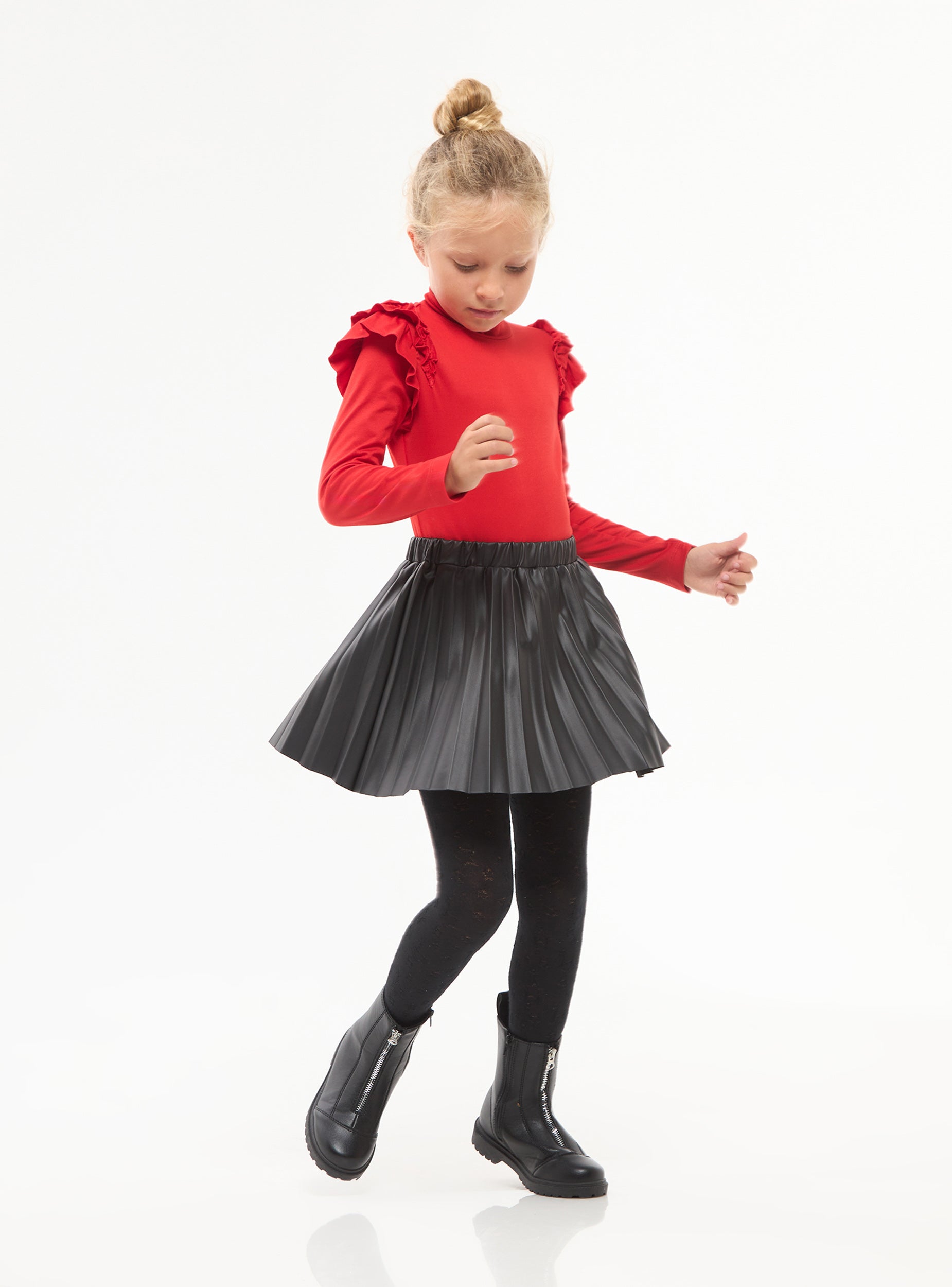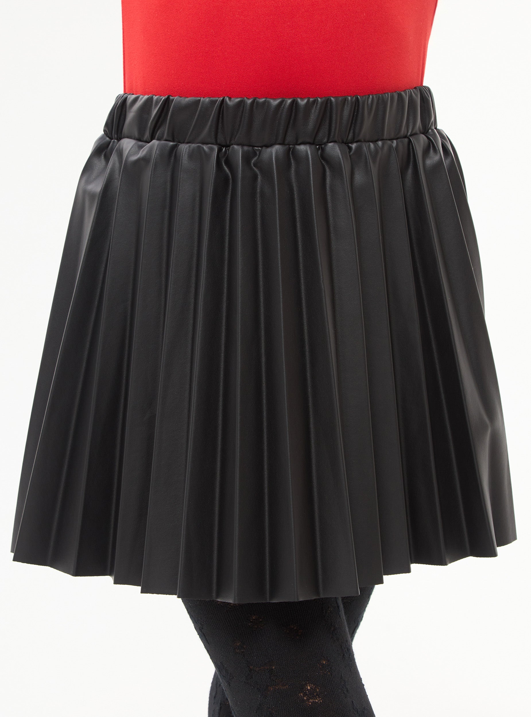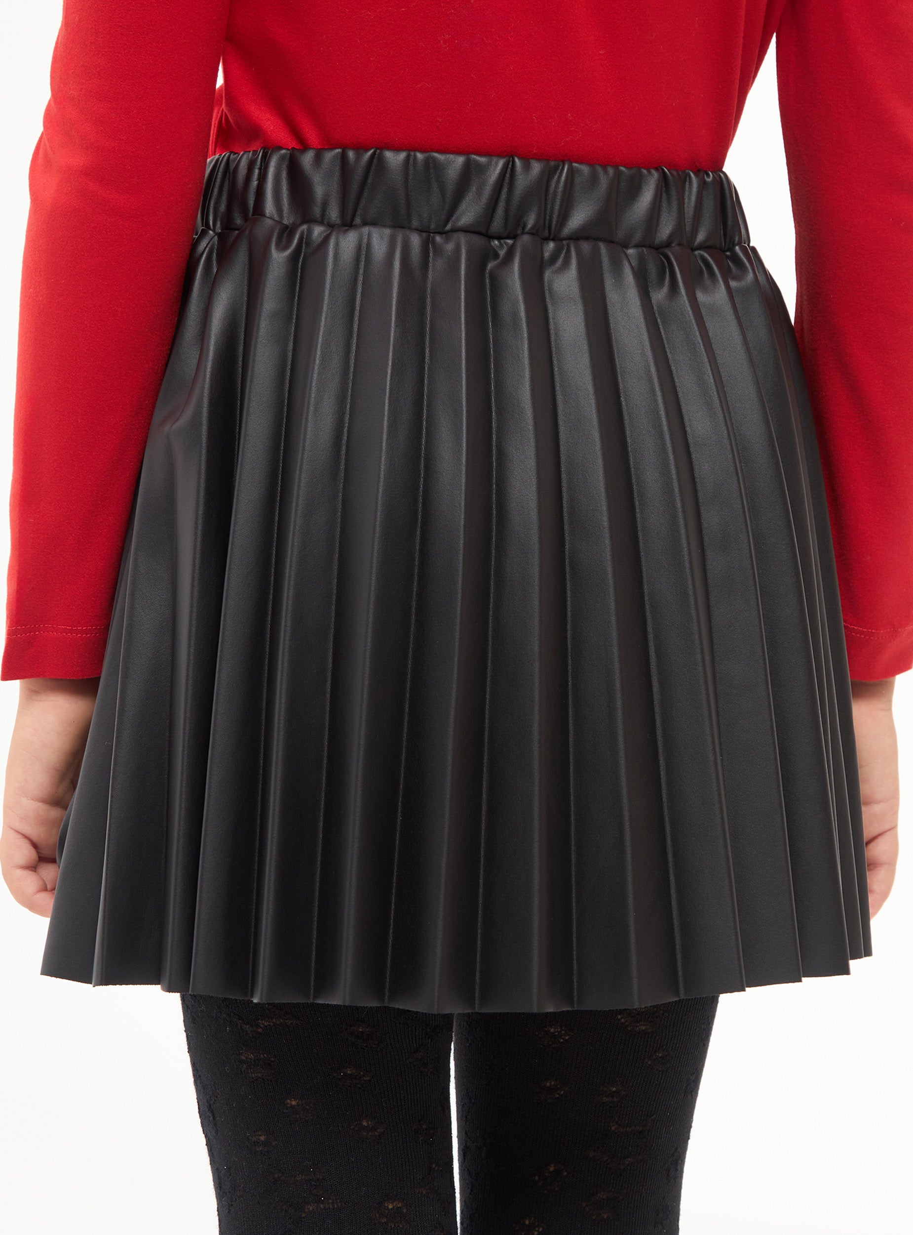 Gonna plissettata da bambina effetto pelle. Lunghezza sopra al ginocchio. La modella è alta 1,23 e indossa la taglia 6-7 anni.