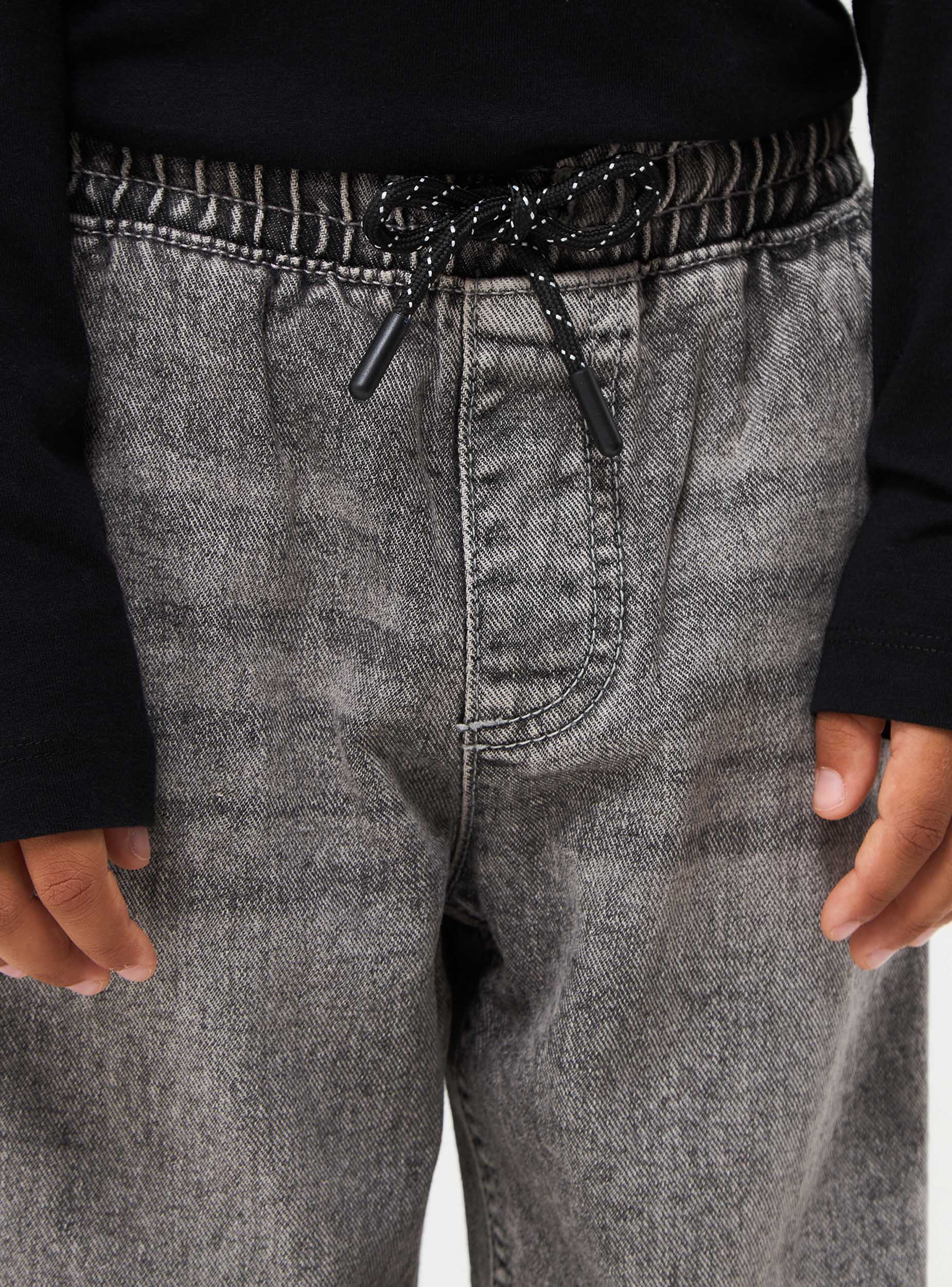 Jeans da bambino modello jogger con coulisse in vita e polsino sul fondo.