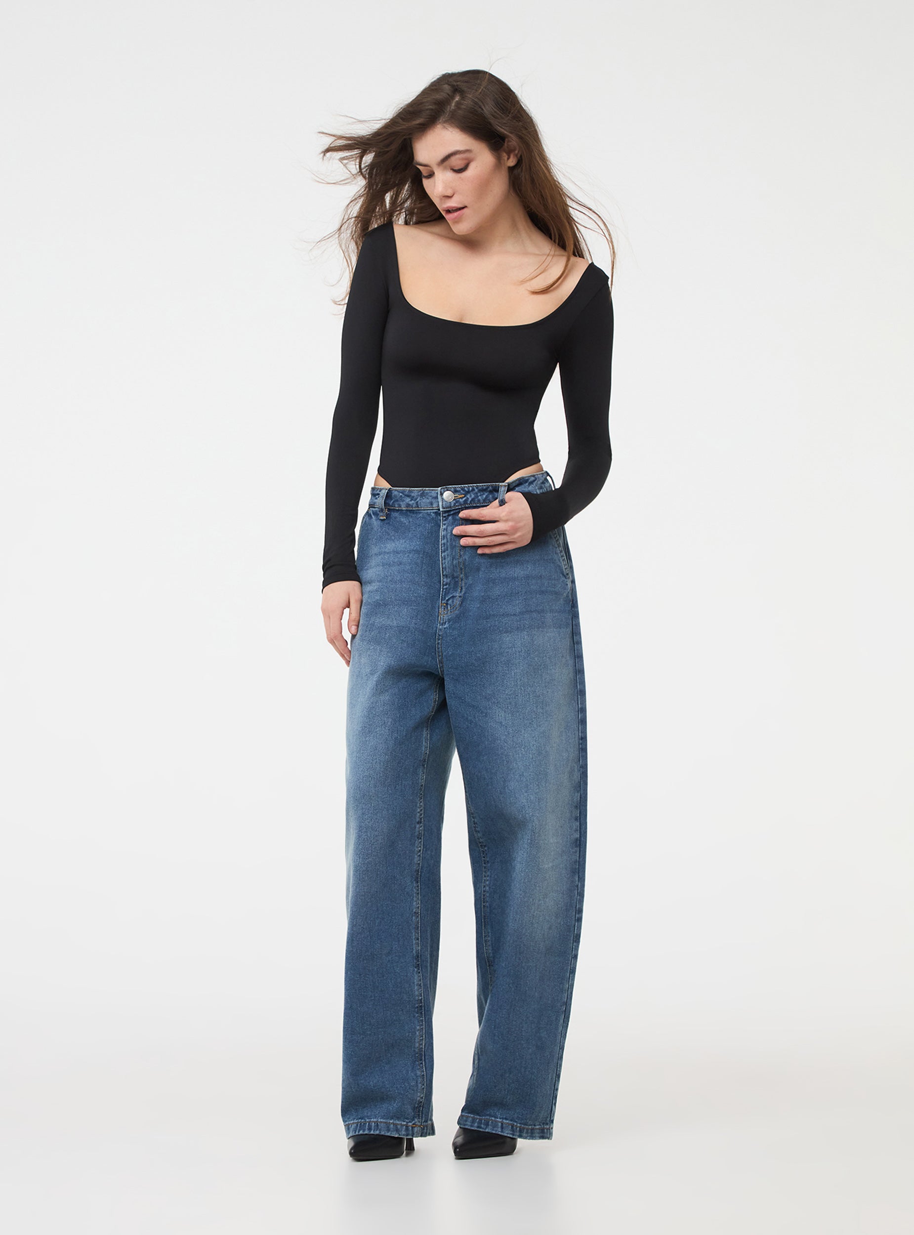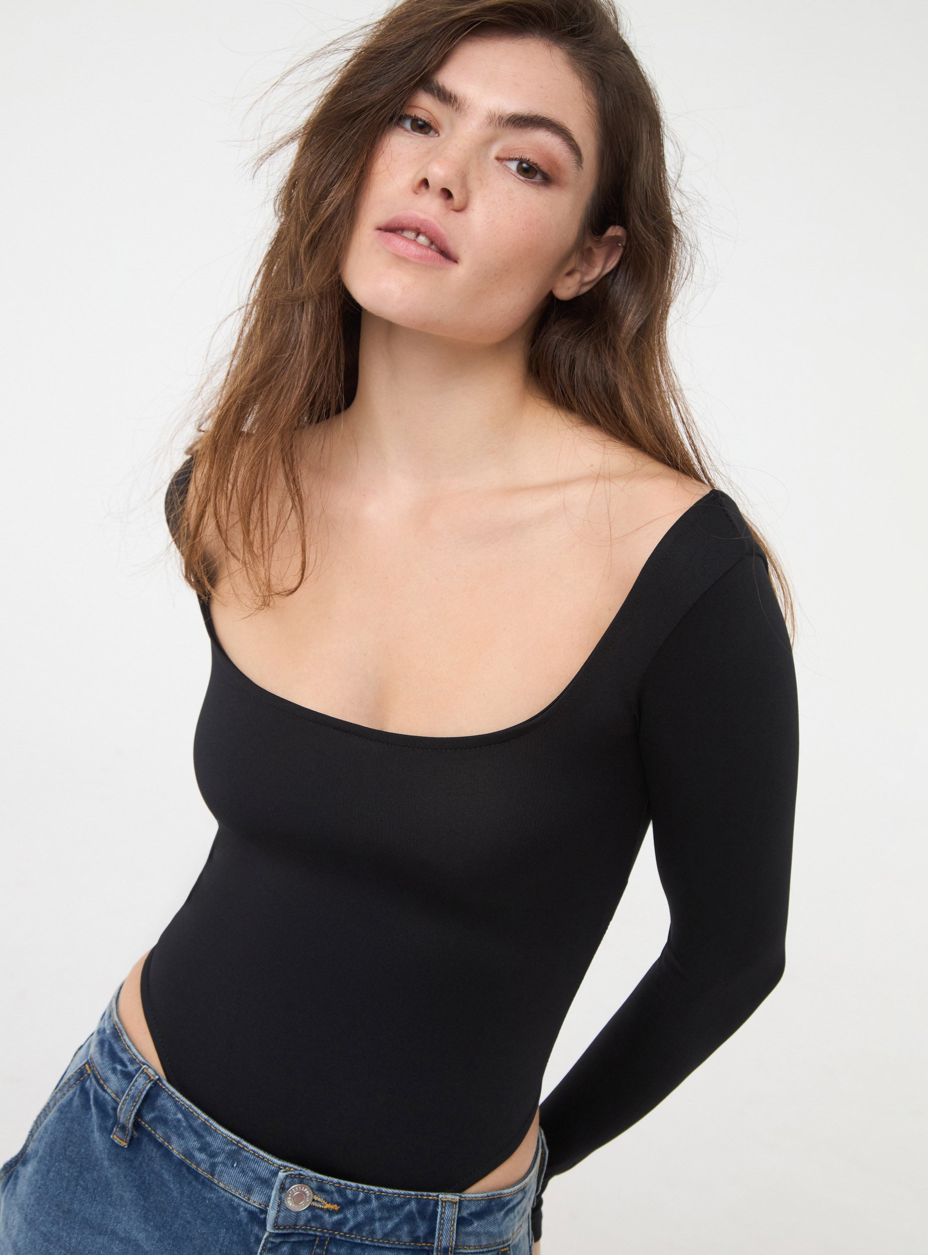 T-shirt body da donna, modello con ampia scollatura frontale e sul retro. Tessuto aderente elasticizzato a tinta unita. Maniche lunghe.