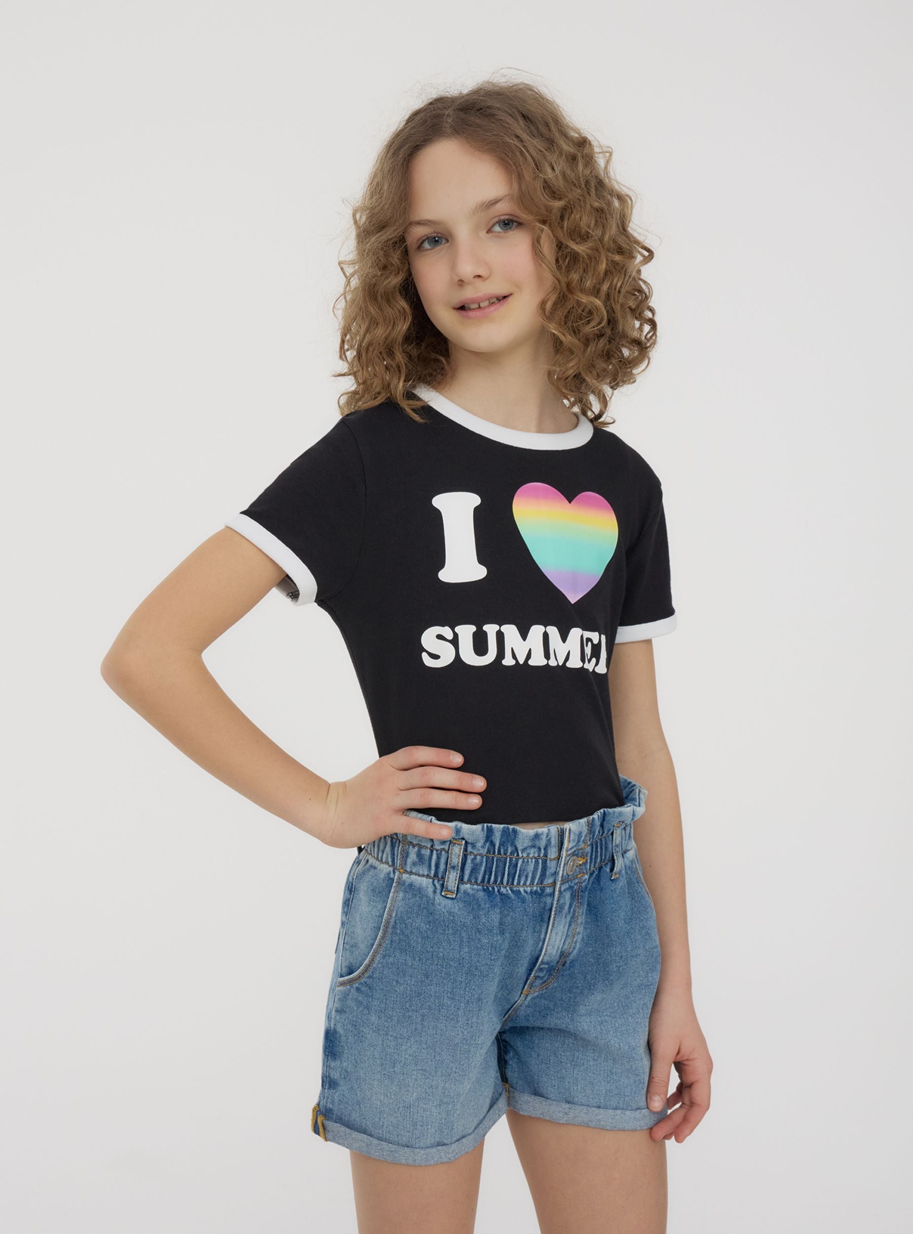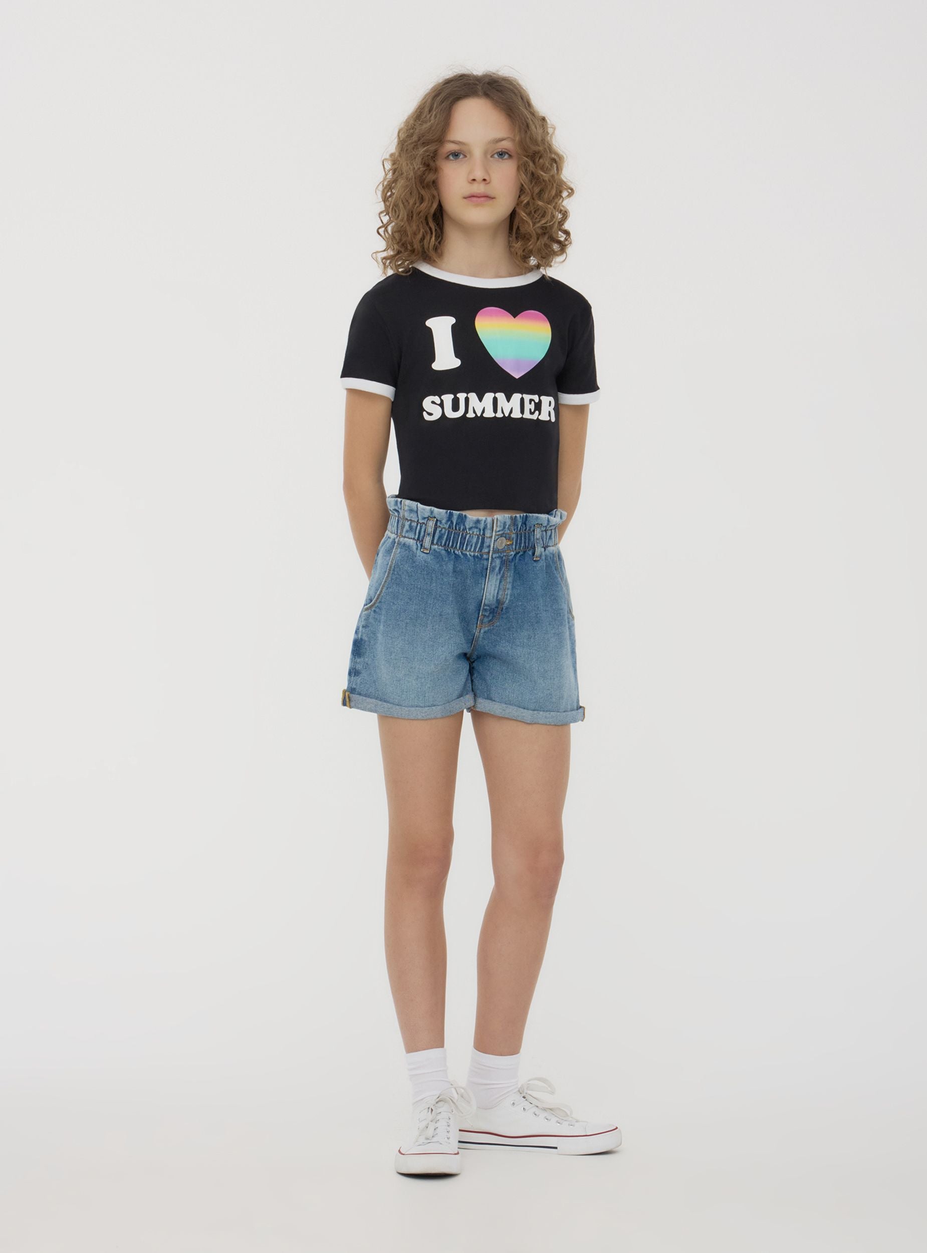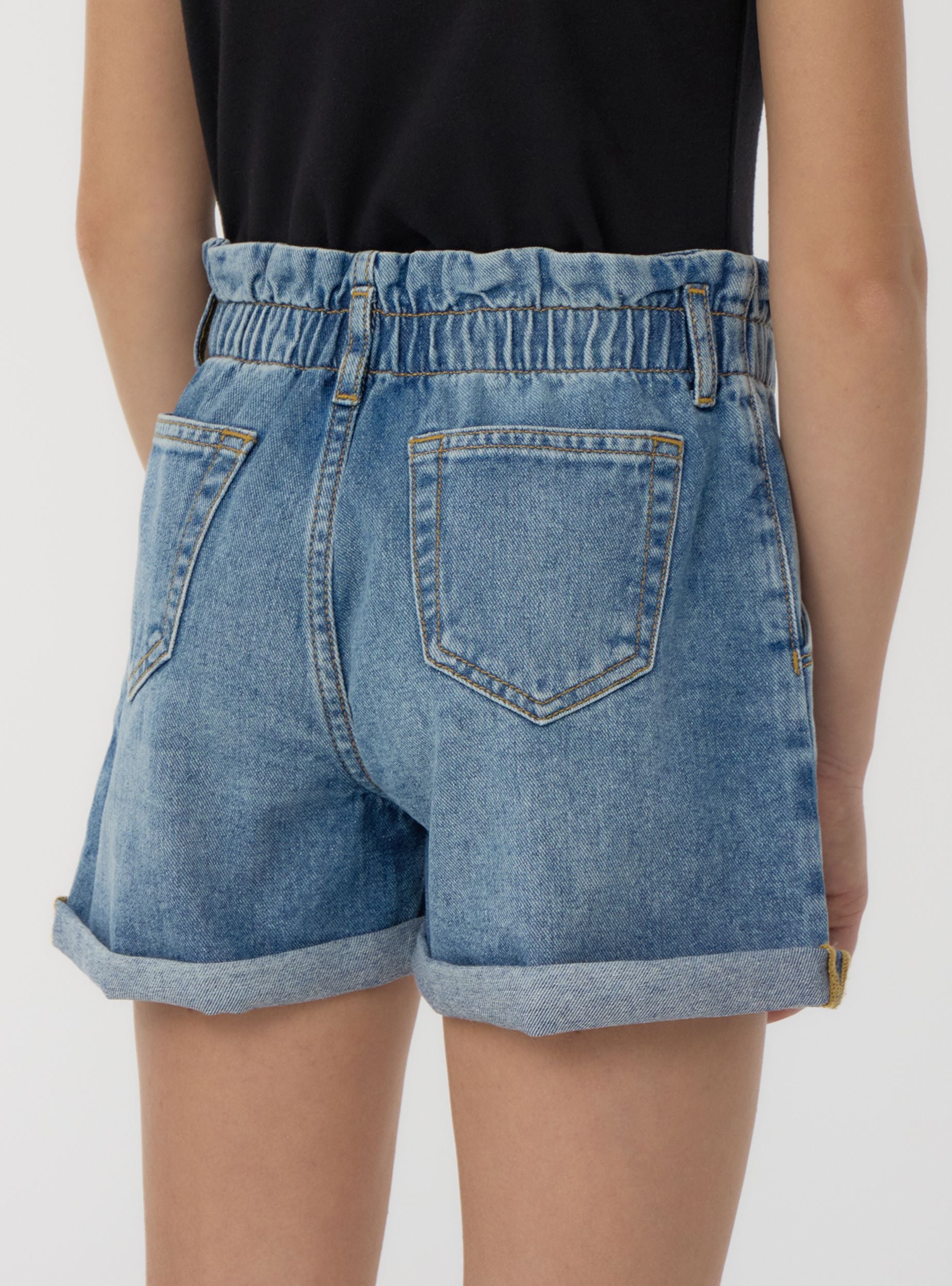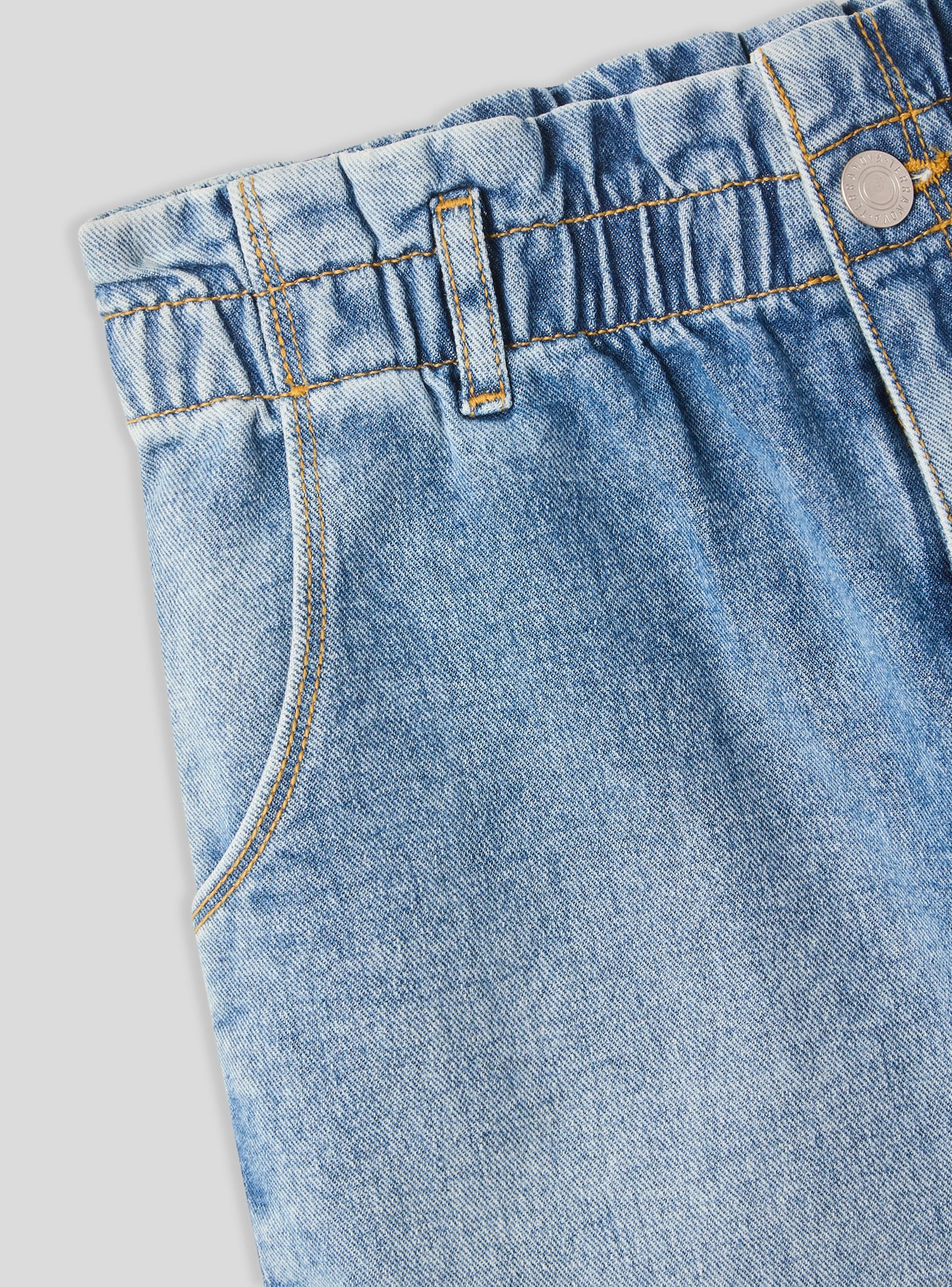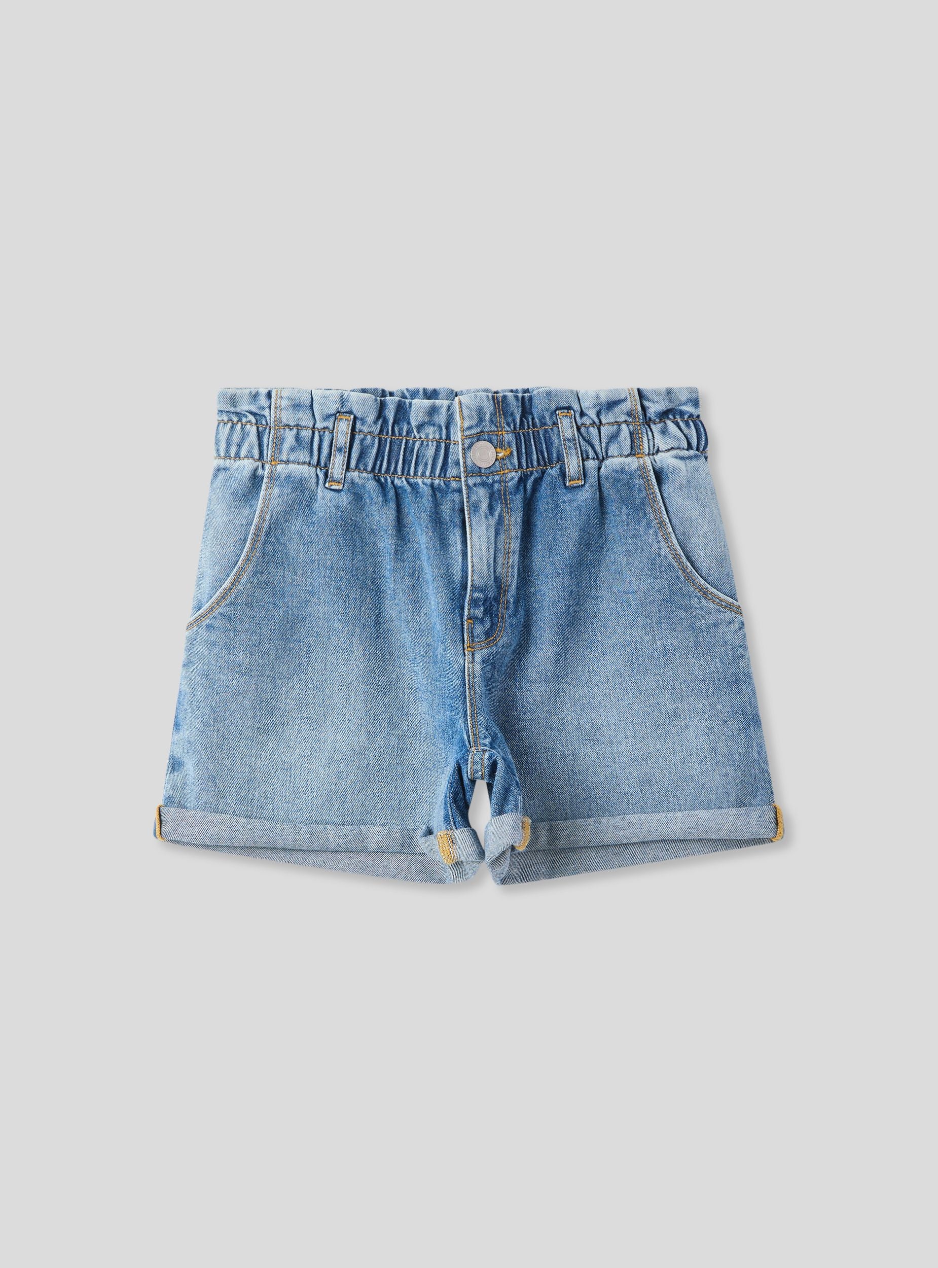 Pantaloncini da bambina ideali per il tempo libero e le giornate estive, caratterizzati da una linea paperbag in denim tinta unita. Presentano una chiusura con zip e bottone, passanti in vita per aggiungere una cintura, tasche laterali e posteriori per maggiore praticità e un lavaggio medio che dona un aspetto moderno e versatile.