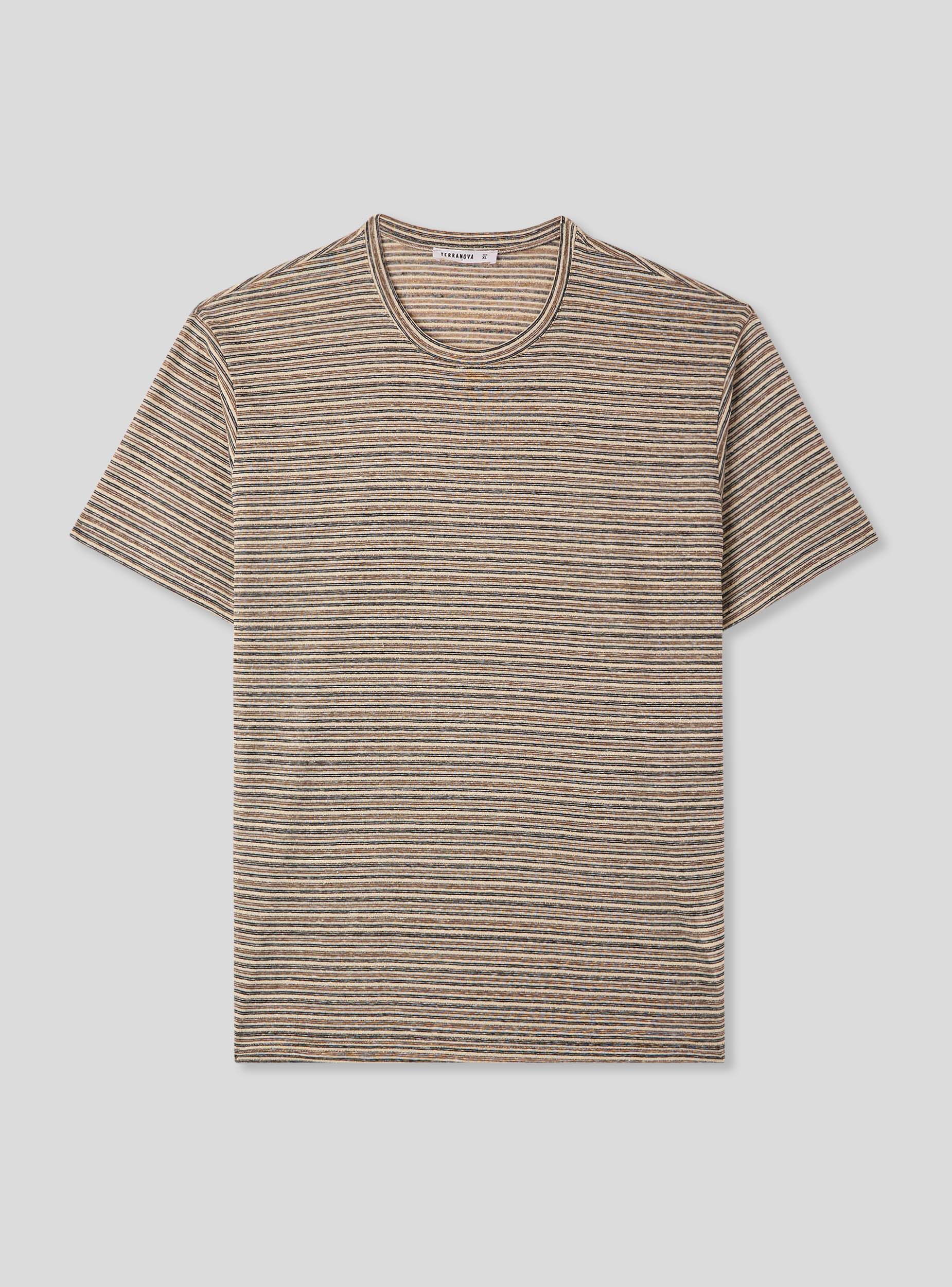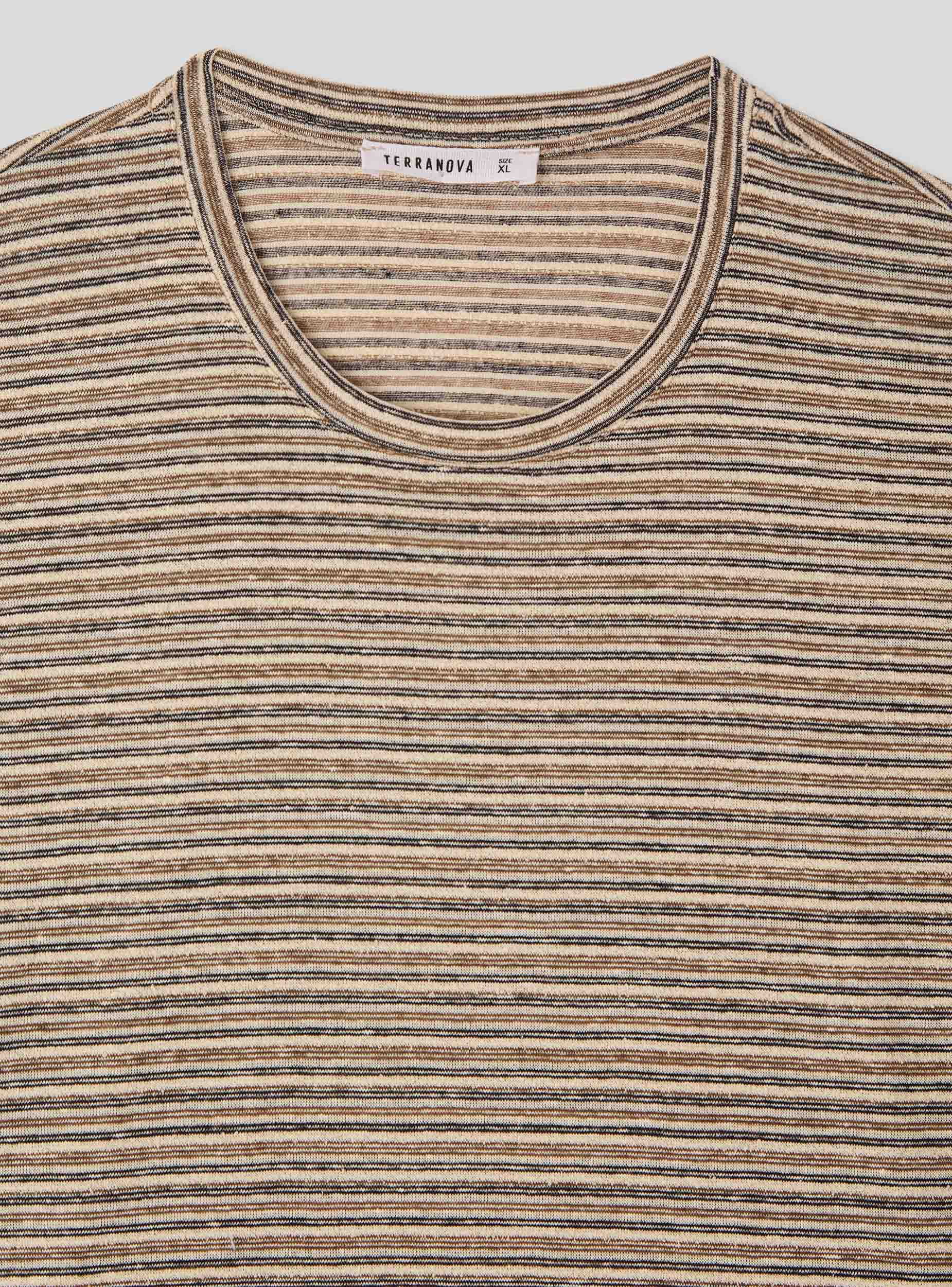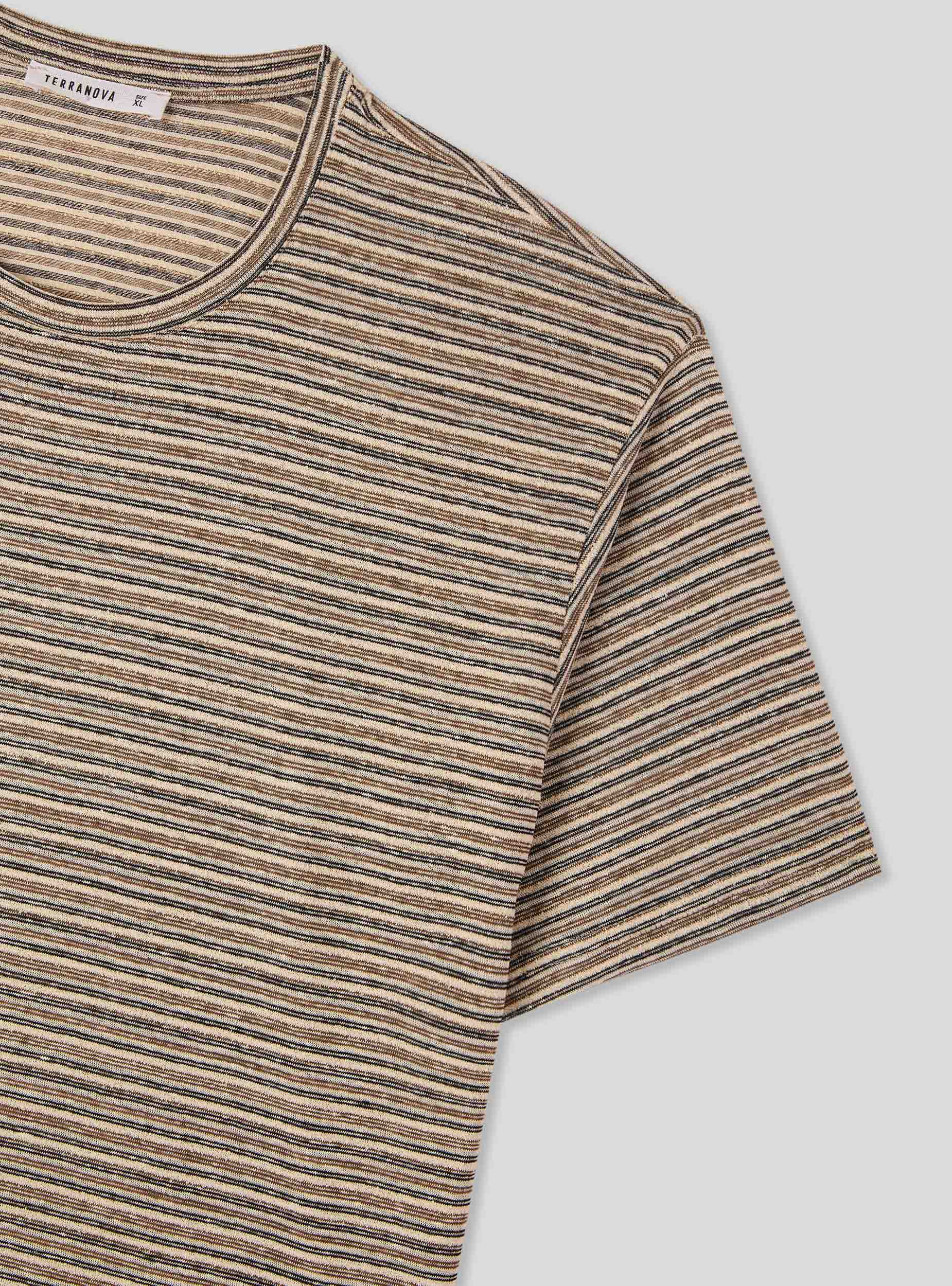 Maglietta da uomo a maniche corte con fantasia a righe sottili orizzontali, modello girocollo. Tessuto misto lino. Perfetta per look casual o rilassati, si abbina facilmente a jeans, bermuda o pantaloni chino. Stile versatile e senza tempo.