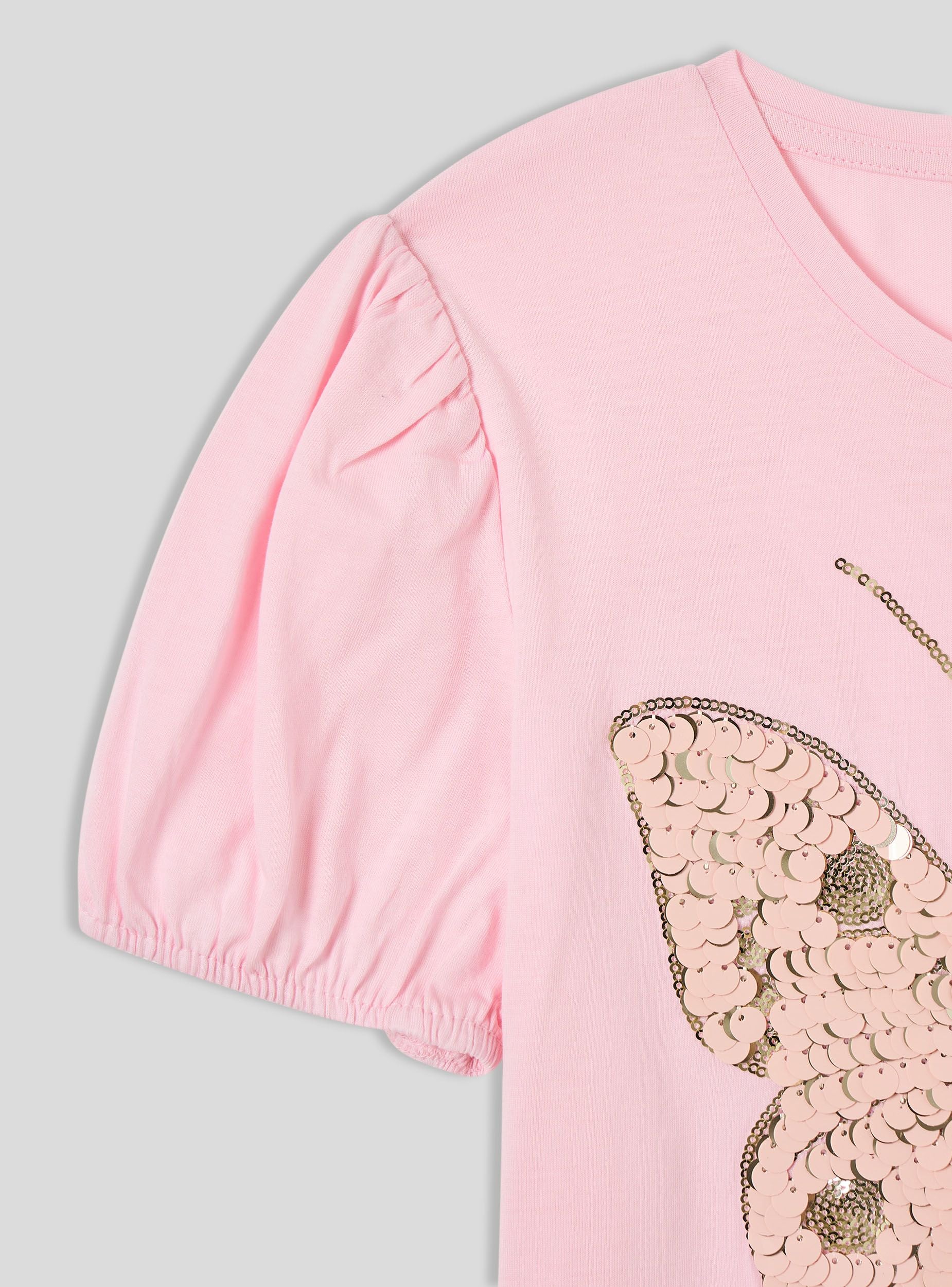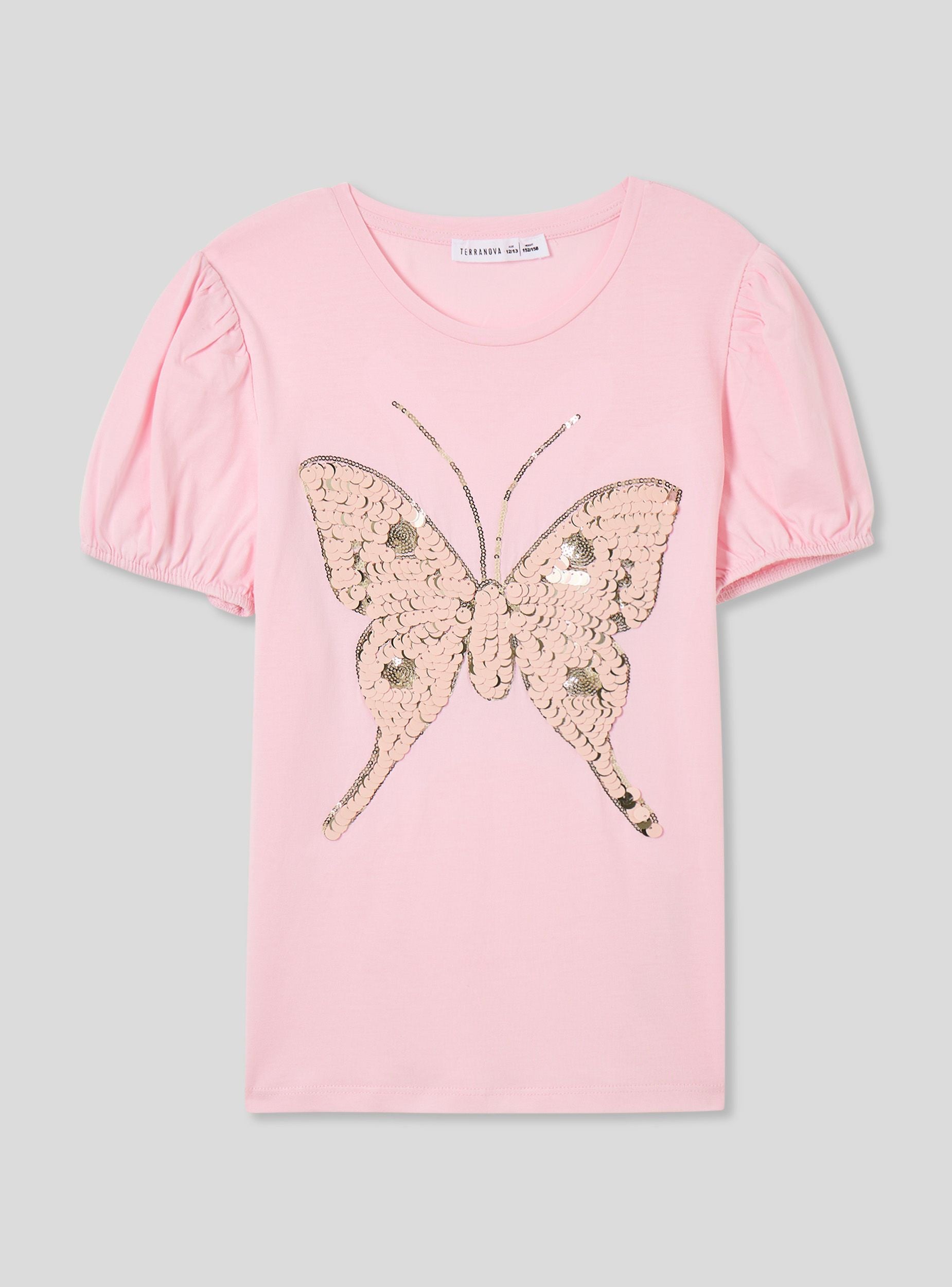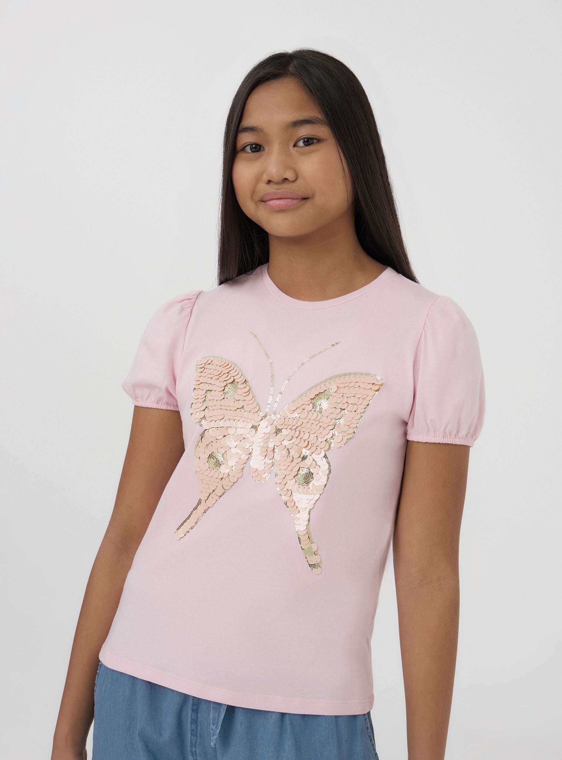 Maglietta da bambina dal design romantico e luminoso, con maniche corte e girocollo per un comfort ideale in ogni momento. La grande farfalla decorata con paillettes aggiunge un tocco scintillante e giocoso. Perfetta da abbinare a jeans, leggings o gonne per creare look allegri e versatili, è ideale per la scuola, il tempo libero e le occasioni speciali in cui brillare con stile.