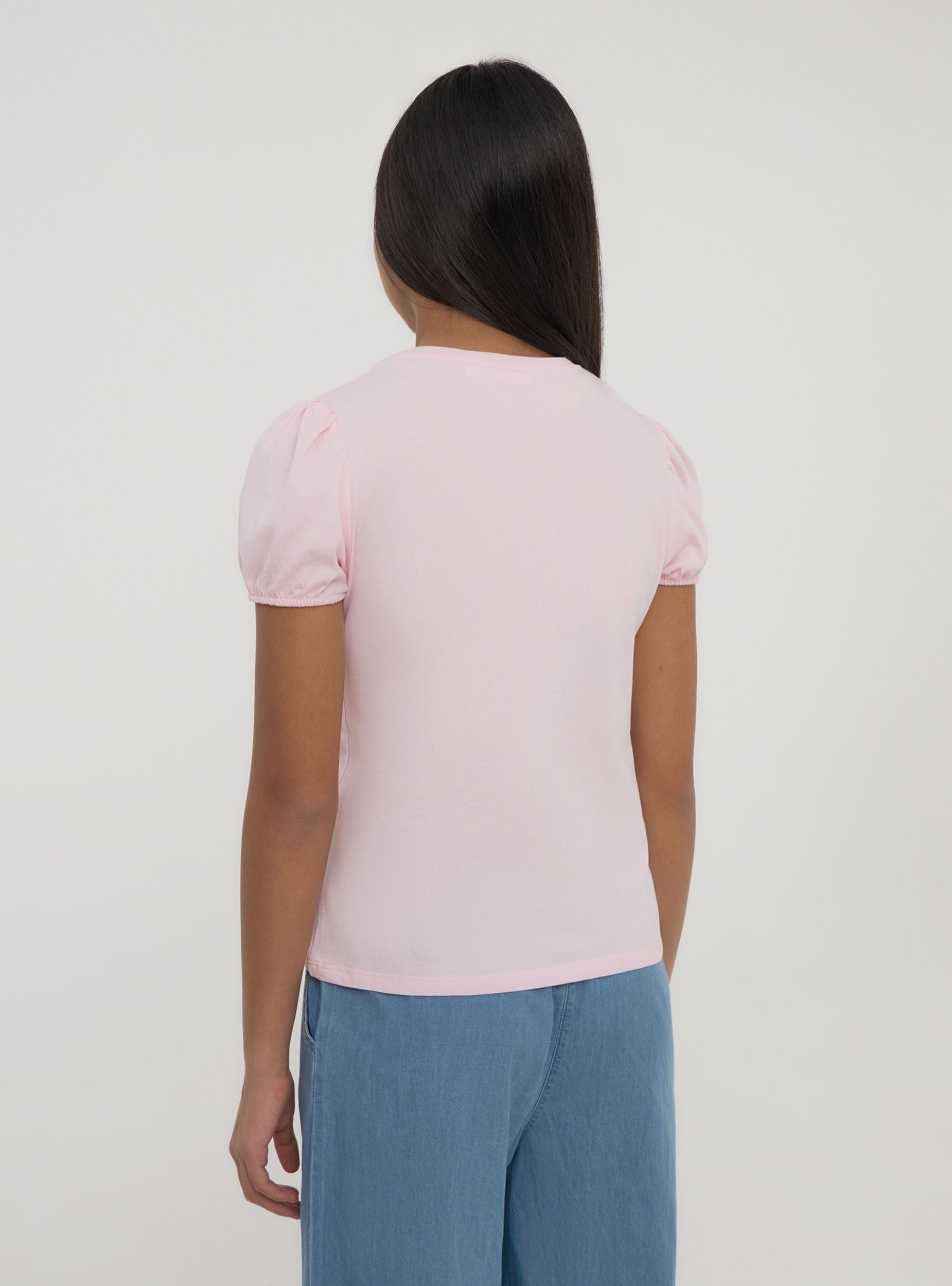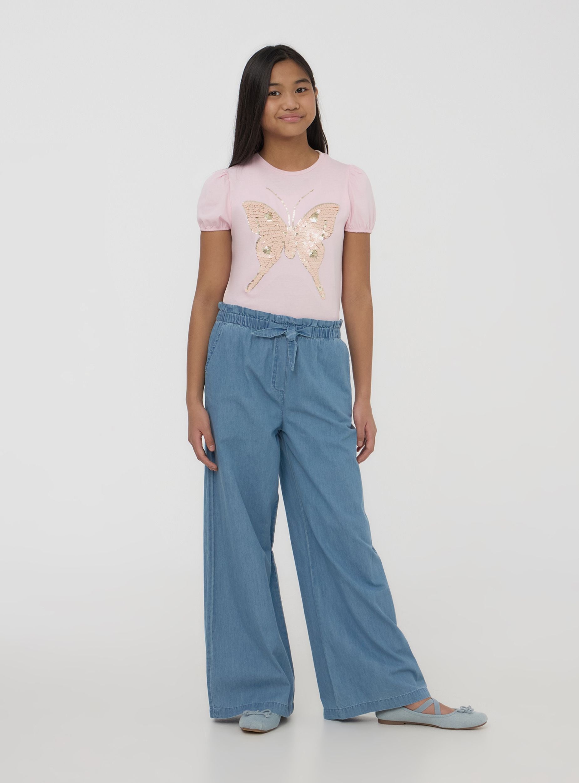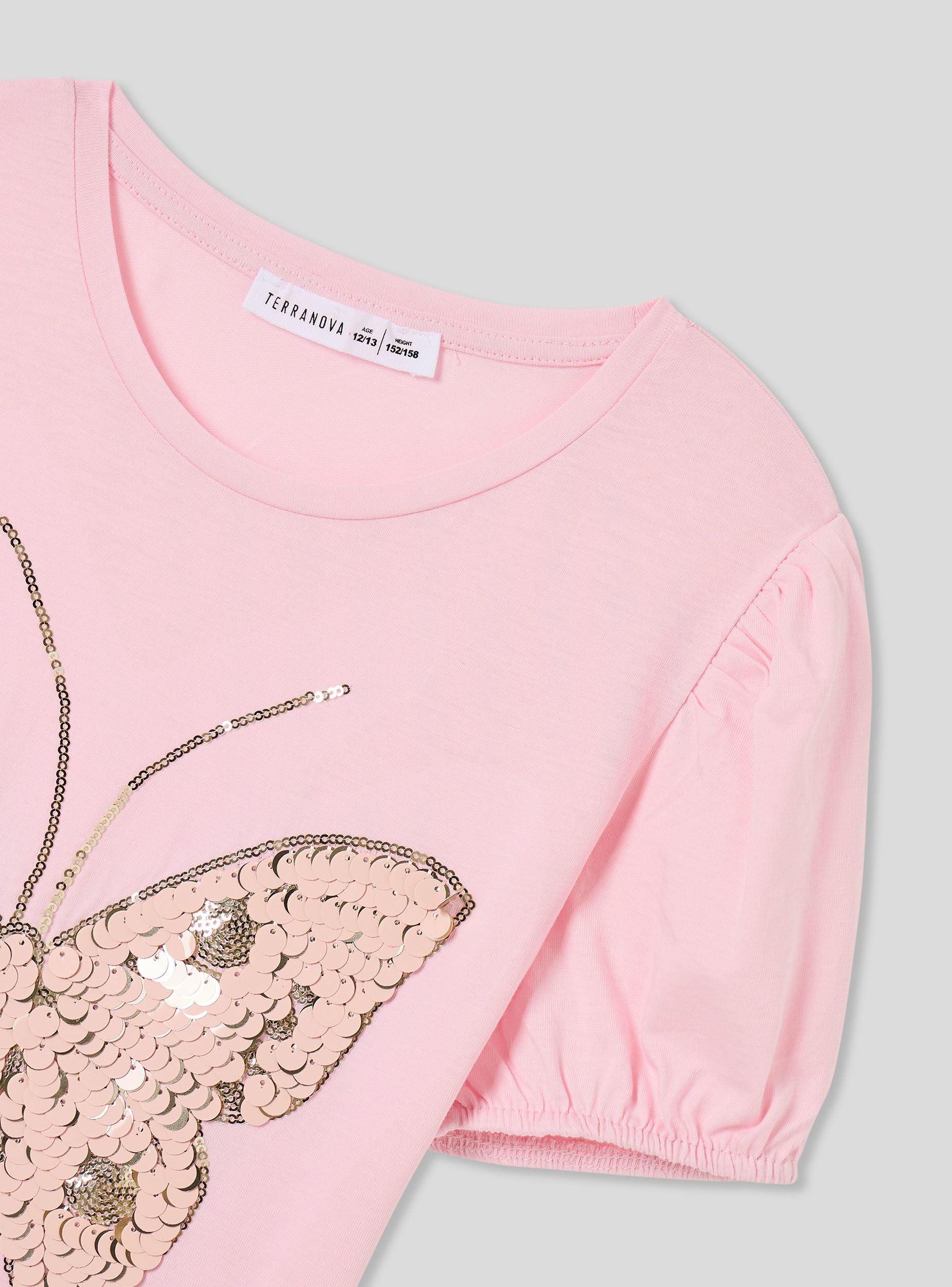 Maglietta da bambina dal design romantico e luminoso, con maniche corte e girocollo per un comfort ideale in ogni momento. La grande farfalla decorata con paillettes aggiunge un tocco scintillante e giocoso. Perfetta da abbinare a jeans, leggings o gonne per creare look allegri e versatili, è ideale per la scuola, il tempo libero e le occasioni speciali in cui brillare con stile.