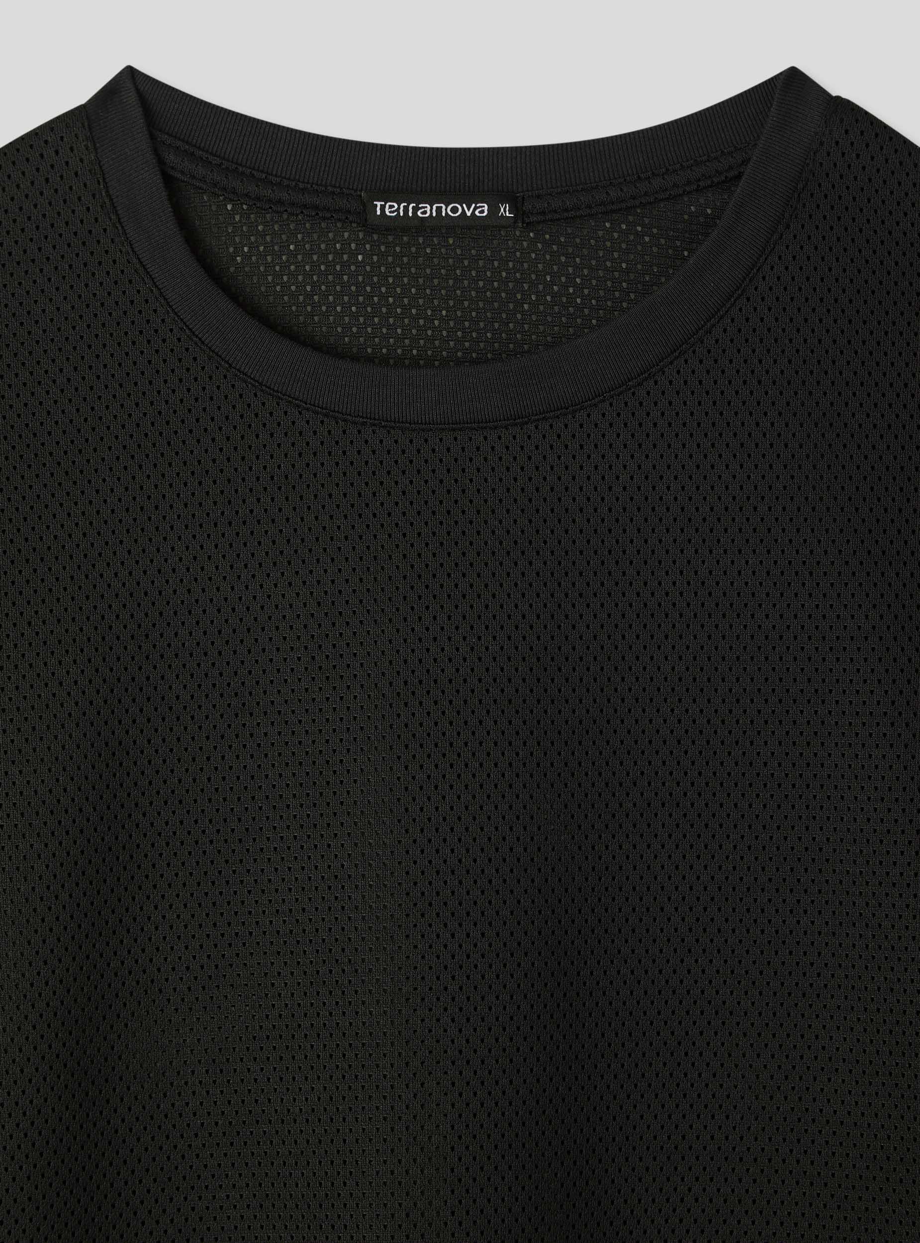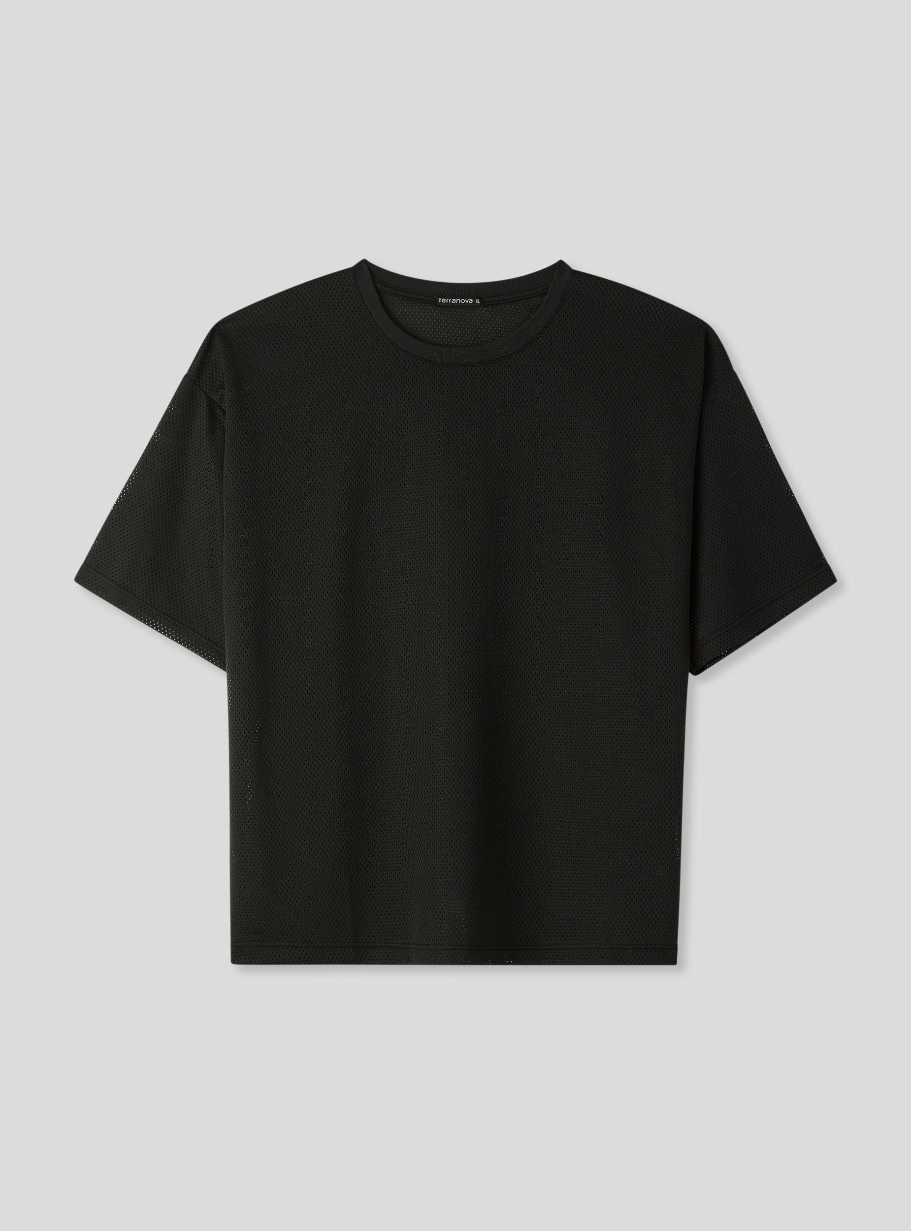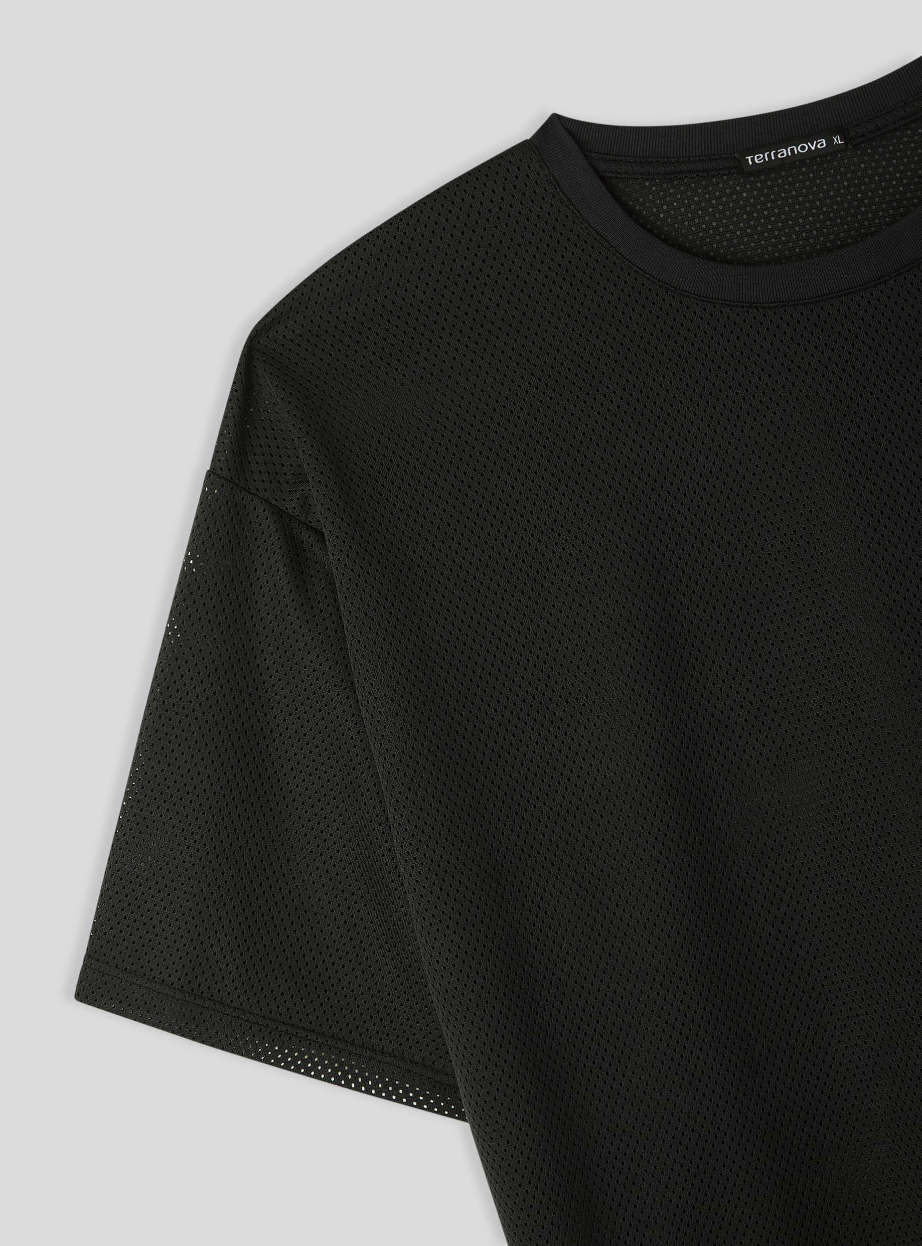 Maglietta da uomo con design boxy e tessuto a rete. Ideale per un look casual e sportivo, questa maglietta offre una vestibilità comoda e un tocco moderno. Perfetta per essere abbinata a pantaloni sportivi o jeans per un outfit versatile. Il girocollo e le maniche corte completano il design, rendendola adatta a diverse occasioni informali.