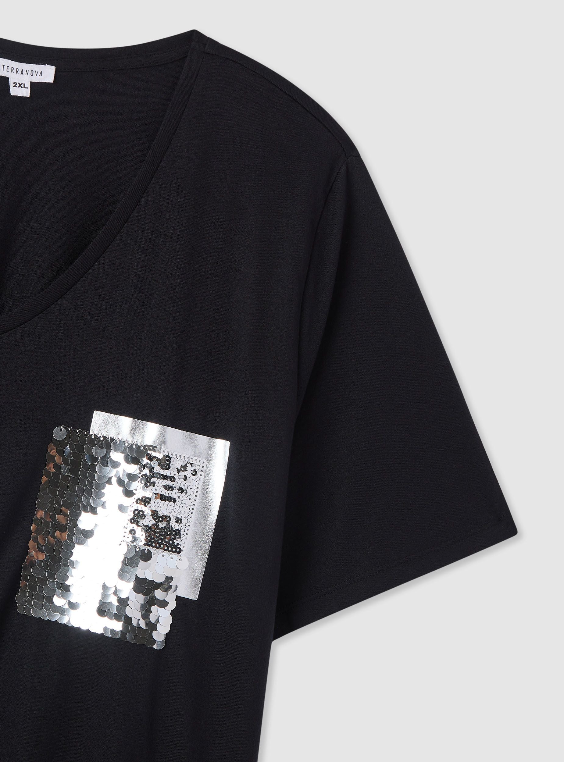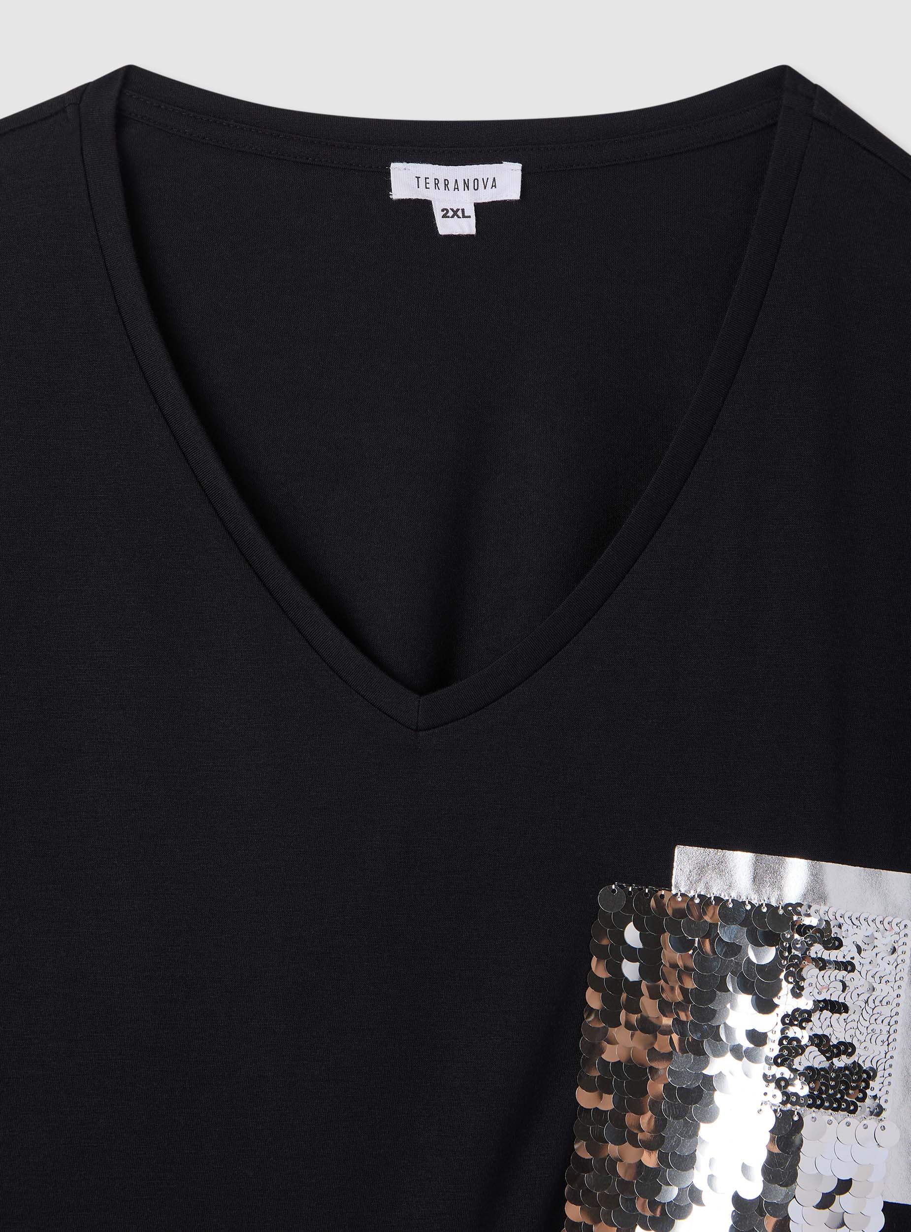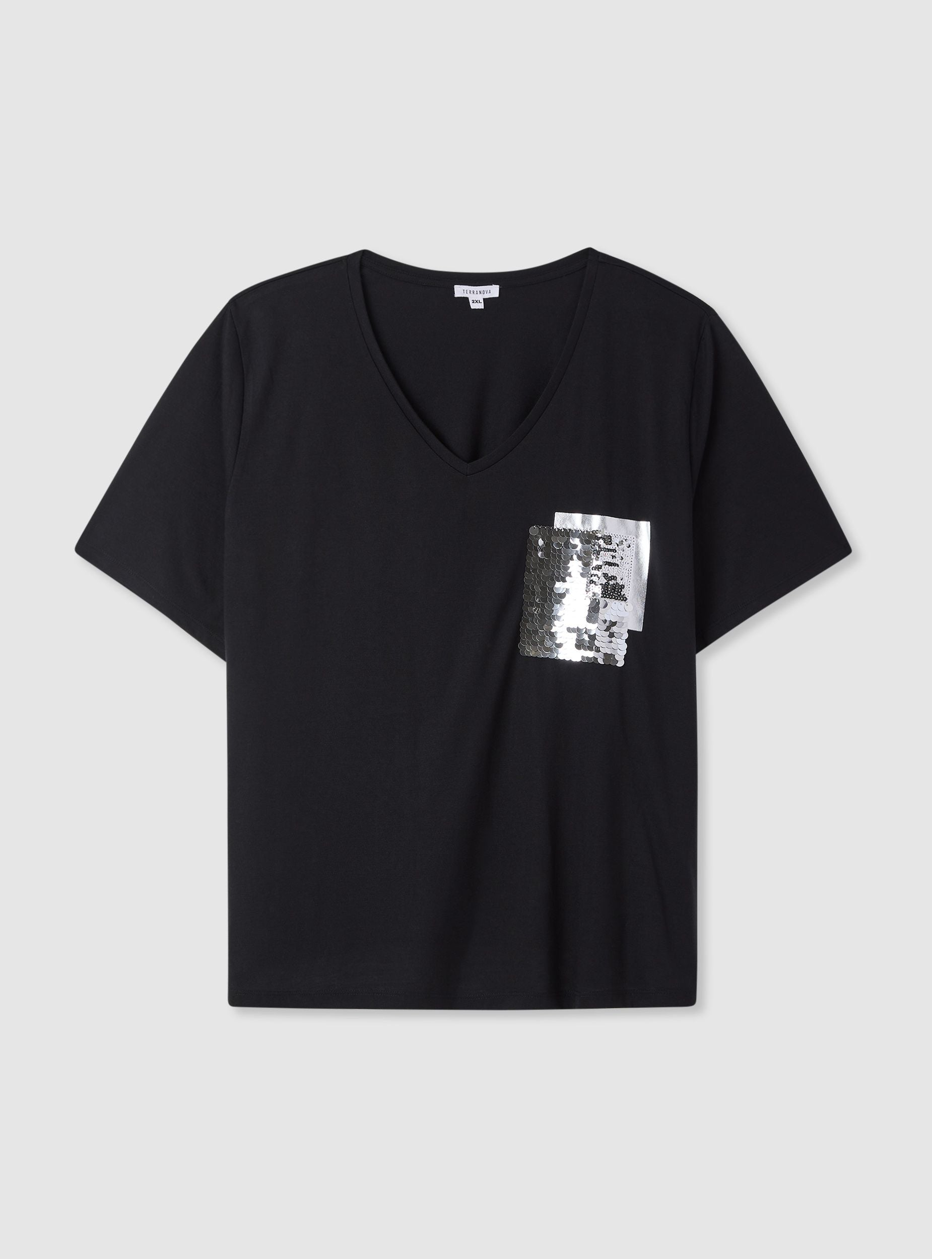 Maglietta da donna con scollo a V e maniche corte, perfetta per look casual dal tocco brillante. Il davanti è valorizzato da un taschino decorativo con paillettes e applicazioni a contrasto che donano effetto luccicante, ideale per dare personalità a jeans, gonne o pantaloni fluidi. Vestibilità regular che cade morbida sul corpo, orlo dritto e linea essenziale, facile da indossare sia di giorno sia per la sera.
