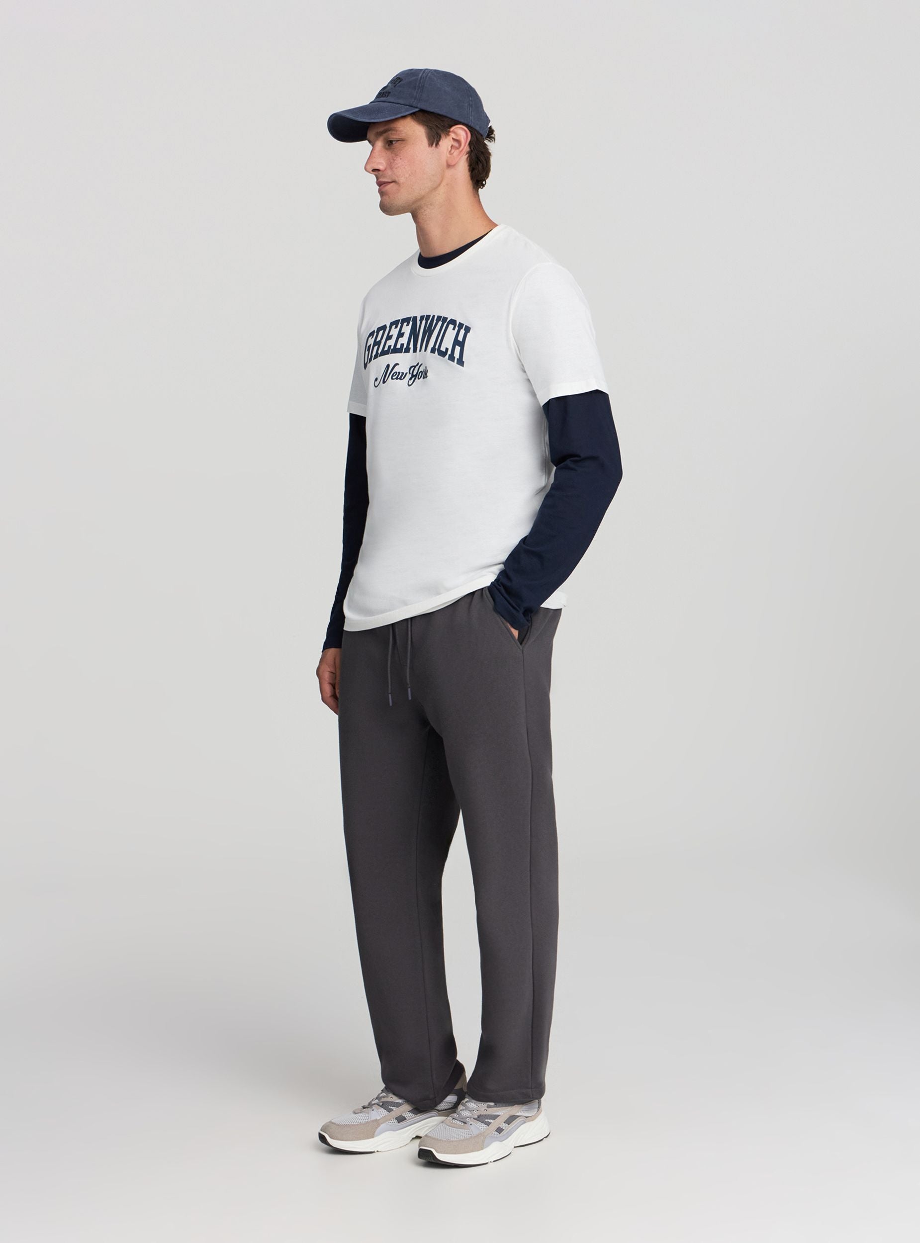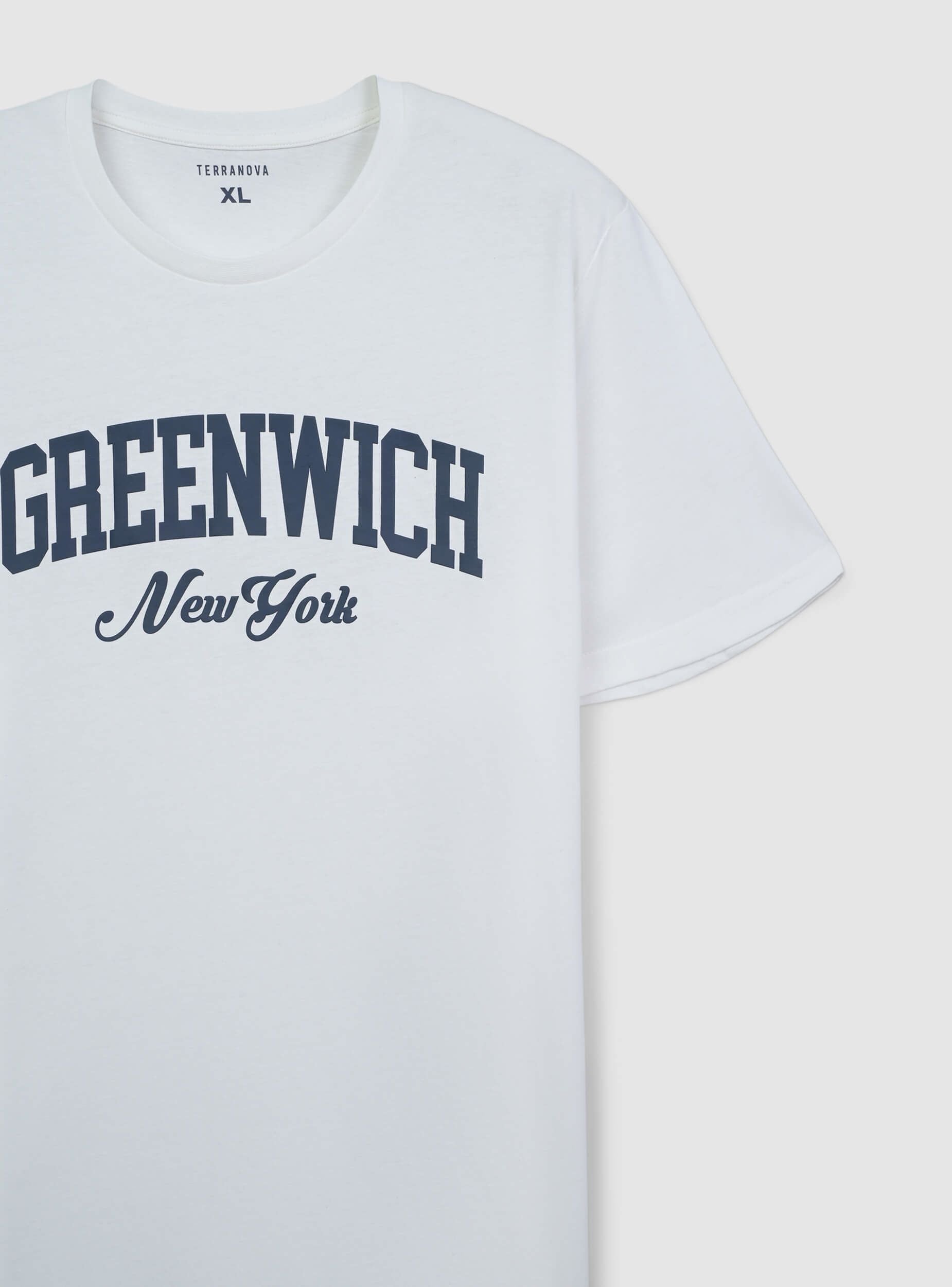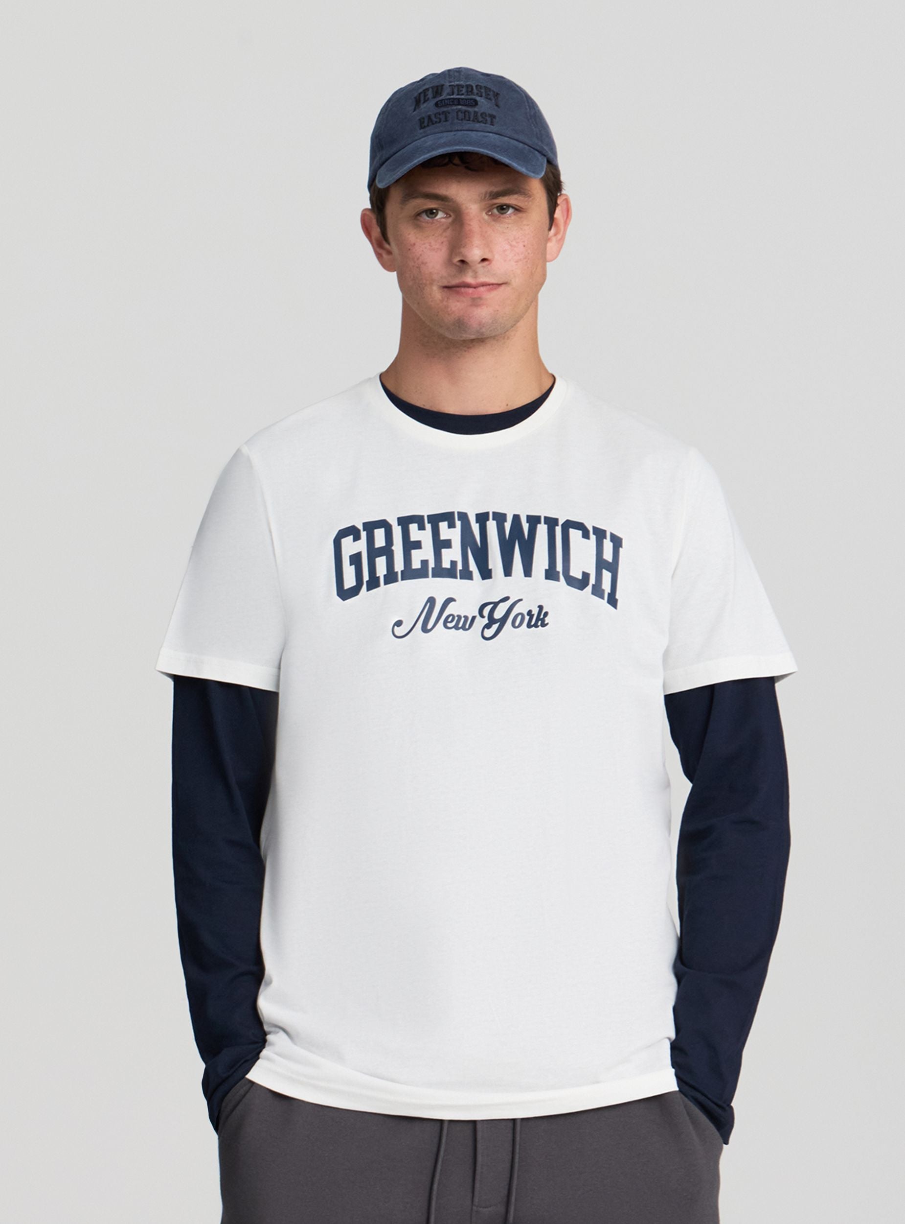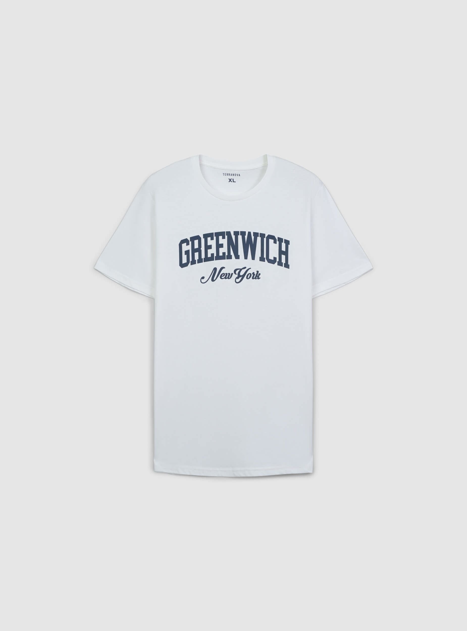 Maglietta da uomo con stampa in stile college, perfetta per un look casual e sportivo. Il design con scritta frontale aggiunge un tocco distintivo. Realizzata in morbido jersey di cotone, presenta maniche corte e girocollo rifinito a costine per il massimo comfort. Versatile e di tendenza, si abbina facilmente a jeans o pantaloni chino.