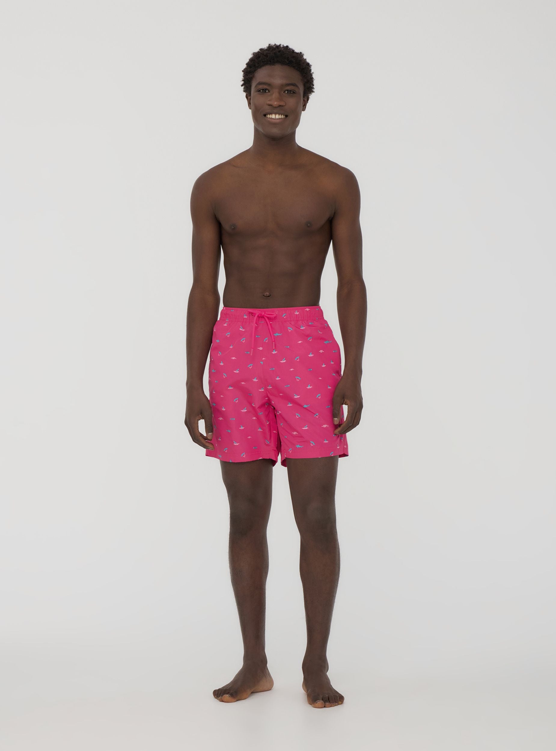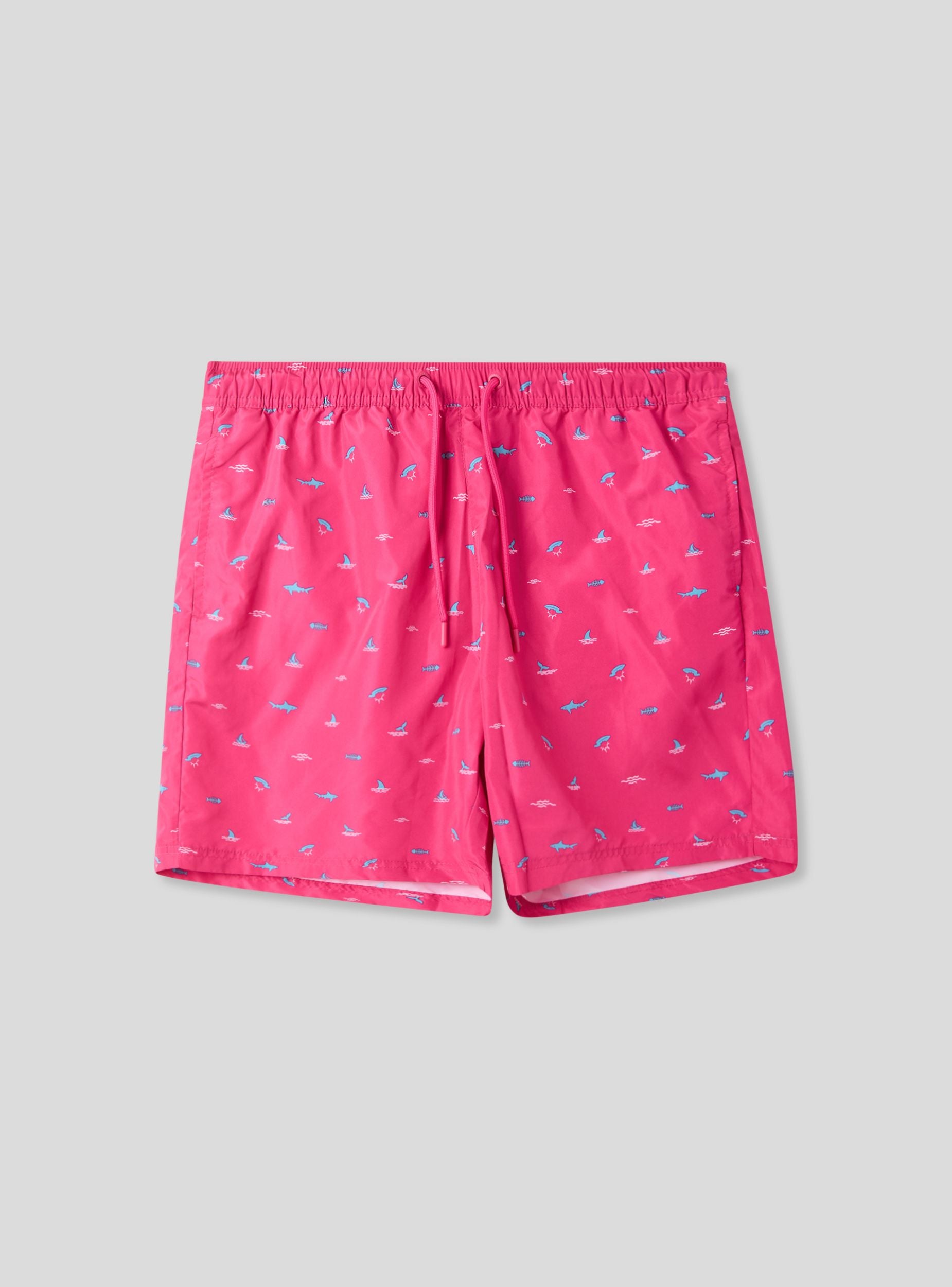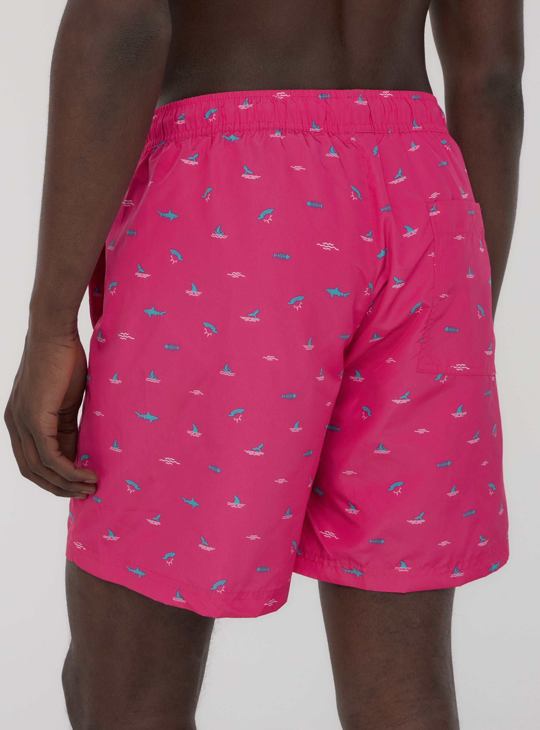 Costume da uomo in stile bermuda con una simpatica microfantasia ispirata al mare, arricchita da squali e balene per un tocco divertente e dinamico. Dotato di coulisse regolabile per una vestibilità comoda, presenta tasche laterali e una tasca posteriore con chiusura in velcro per maggiore praticità. Perfetto per la spiaggia o la piscina, si abbina con t-shirt leggere e infradito per un look rilassato e di tendenza.