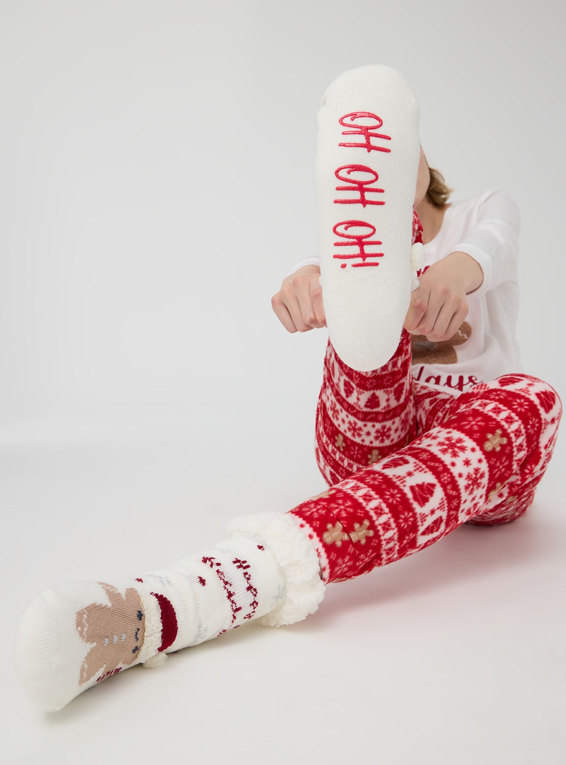 Calzettoni da donna con motivo natalizio raffigurante un omino di pan di zenzero con cappello di Babbo Natale e la scritta "Holidays". Con la scritta "OH OH OH" sulla suola in silicone per un effetto antiscivolo. Sono foderati in morbido sherpa ideale per mantenere i piedi caldi e comodi durante il periodo festivo.
