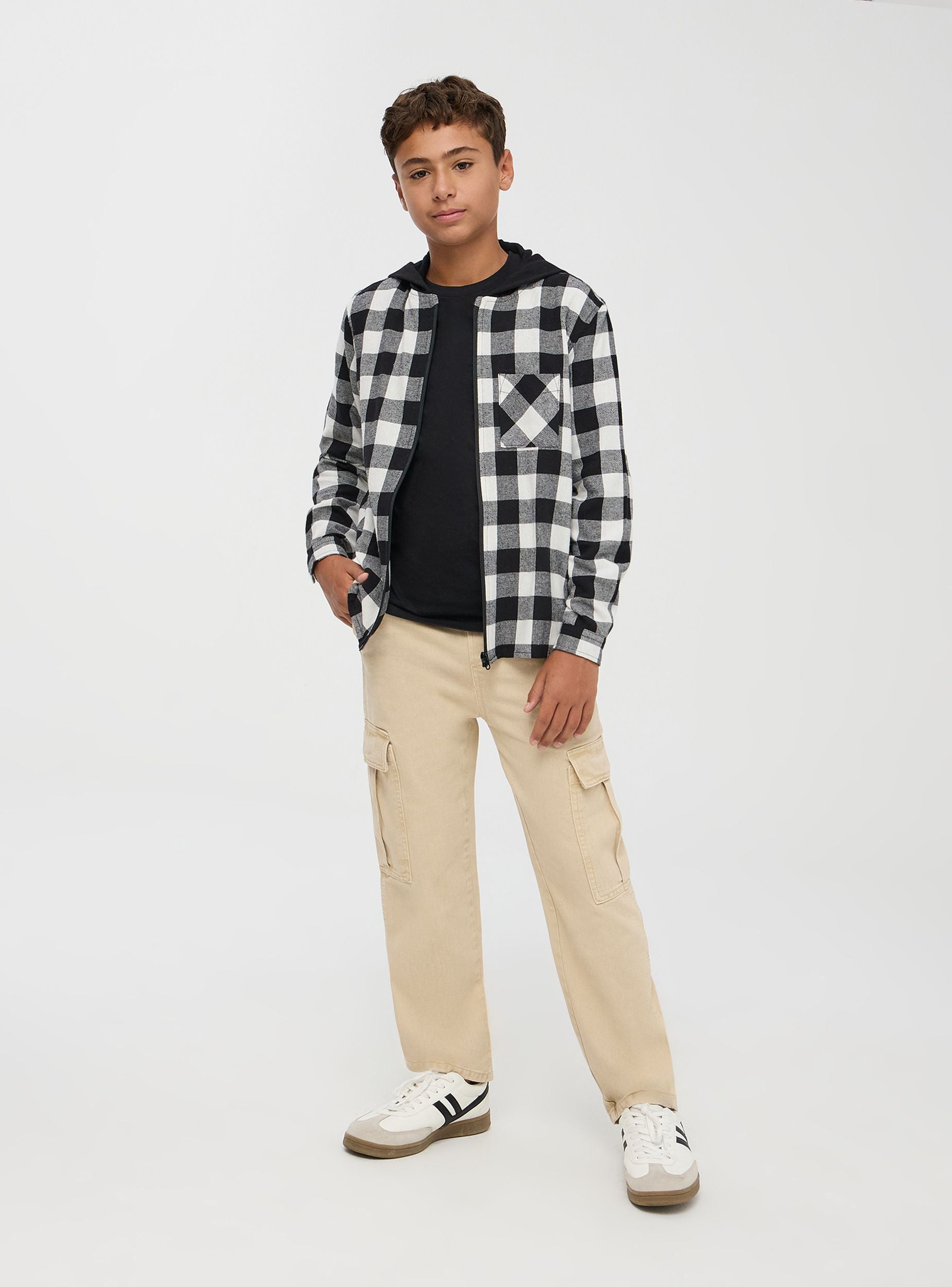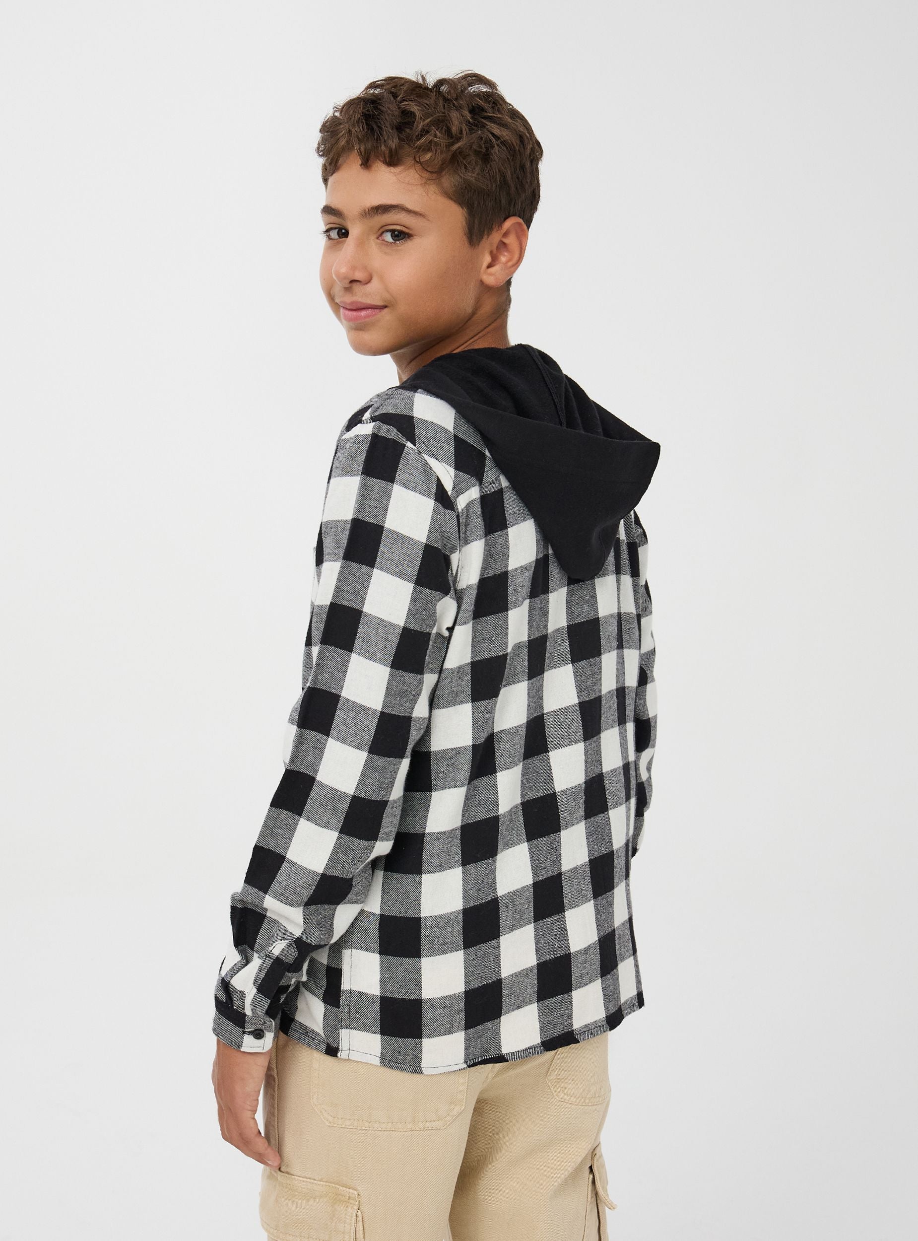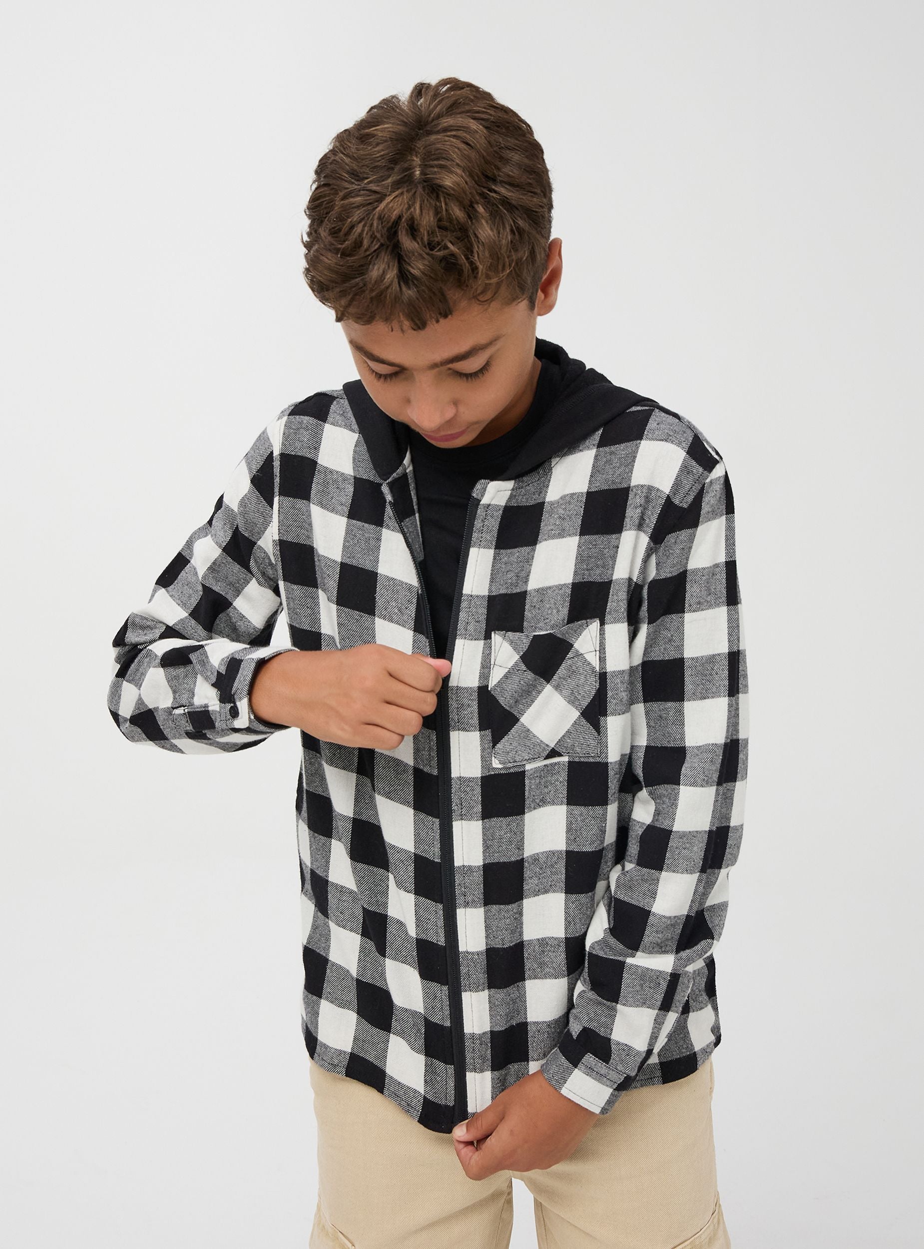 Camicia da bambino con design a quadri, ideale per look casual e informali. Dotata di un comodo cappuccio nero a contrasto, chiusura frontale con zip, e una tasca a petto perfettamente abbinata. La vestibilità è morbida, garantendo comfort quotidiano. Perfetta per passeggiate in città, tempo libero e occasioni informali. Un capo versatile e di stile per ogni guardaroba.