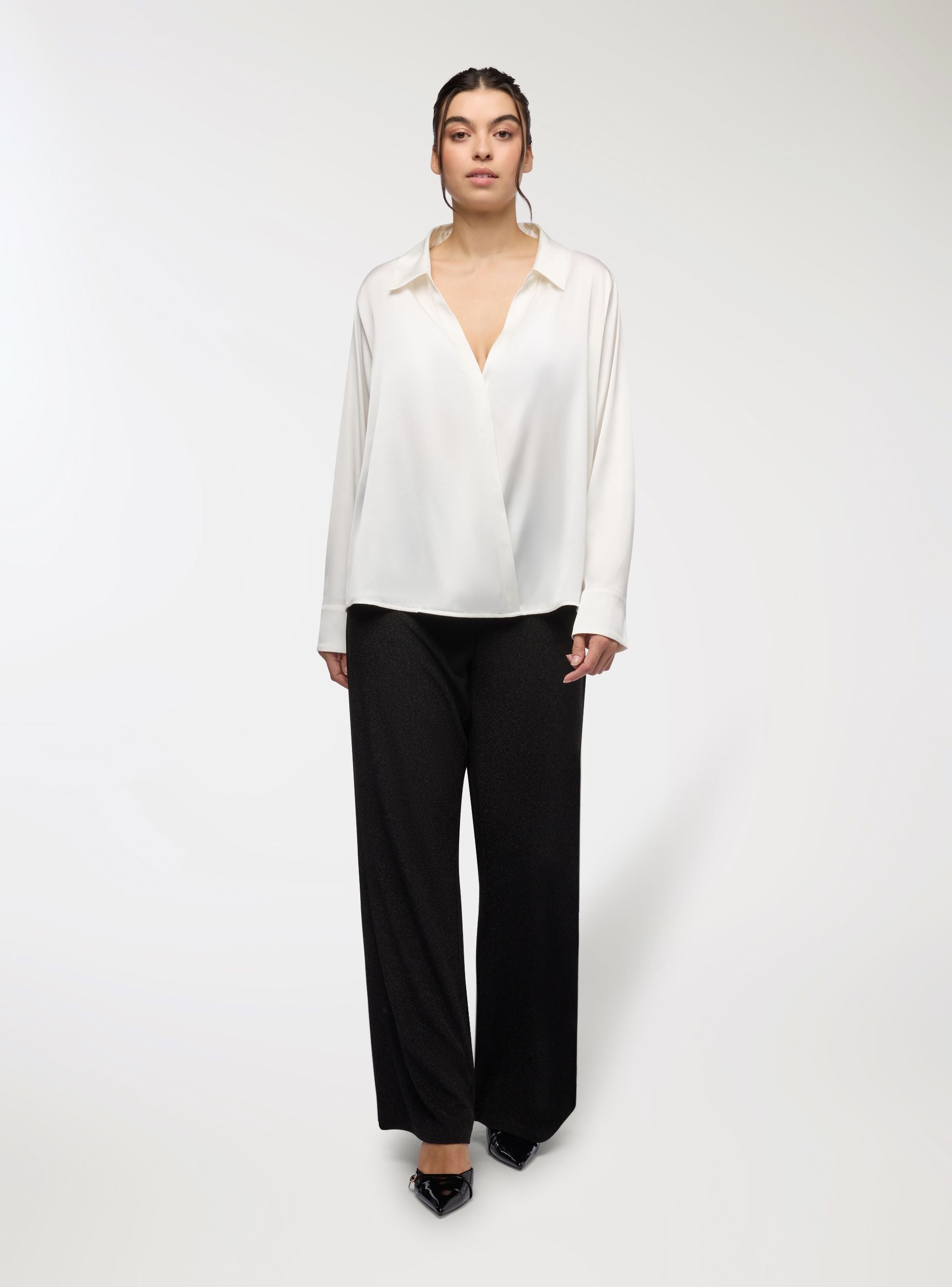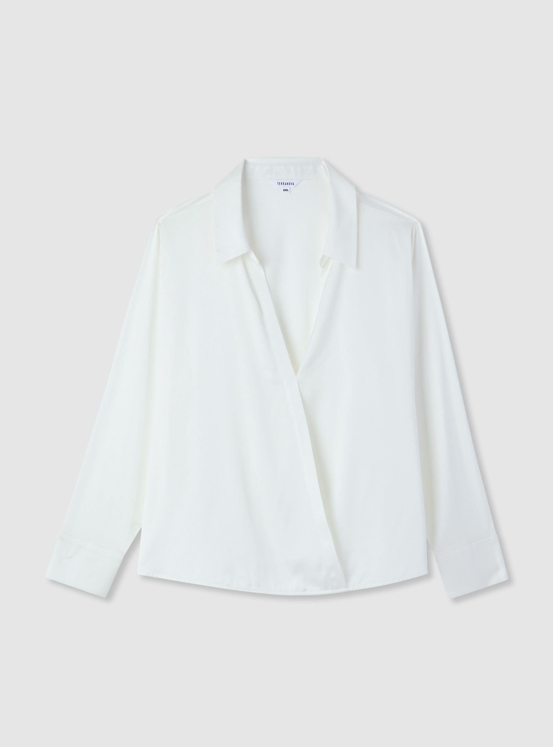 Camicia da donna con design incrociato e maniche lunghe, ideale per un look elegante e versatile. Presenta un colletto a punta e polsini con chiusura, perfetta per occasioni formali o per l'ufficio. La vestibilità regolare garantisce comfort e stile, mentre il design tinta unita la rende facilmente abbinabile a pantaloni o gonne per un outfit sofisticato.