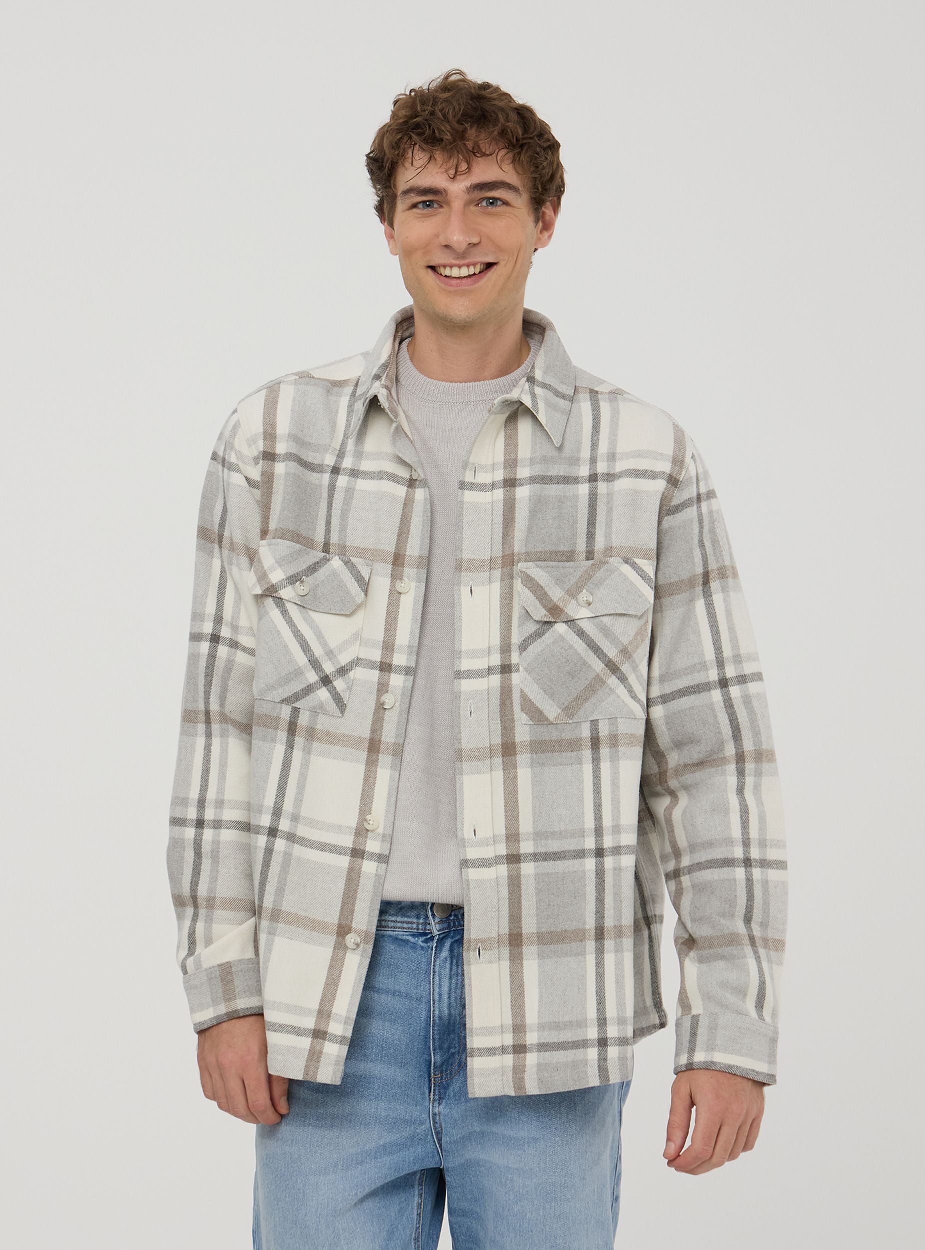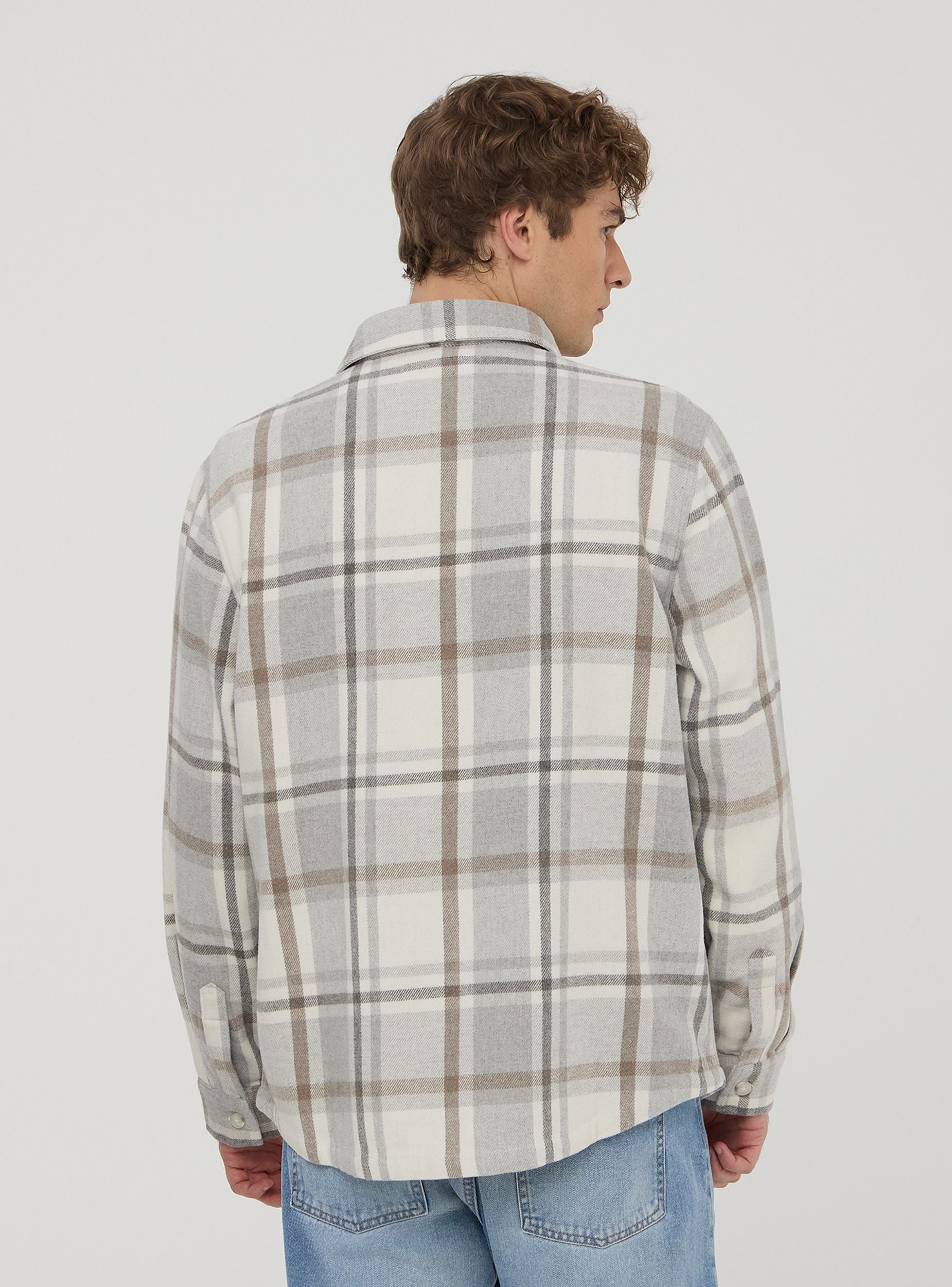 Camicia shacket da uomo in flanella con motivo a quadri. Presenta un colletto tradizionale e una chiusura frontale con bottoni. La camicia è dotata di due tasche con pattina sul petto, anch'esse chiuse con bottoni. Le maniche lunghe terminano con polsini chiusi da bottoni. Questa camicia è ideale per un look casual ma curato.