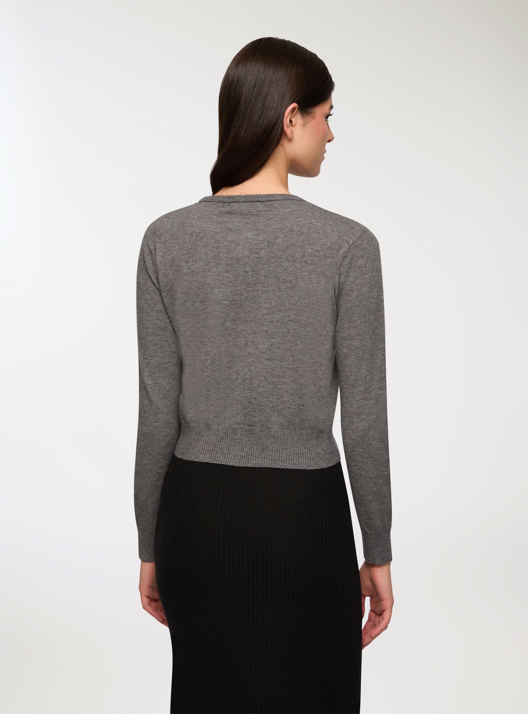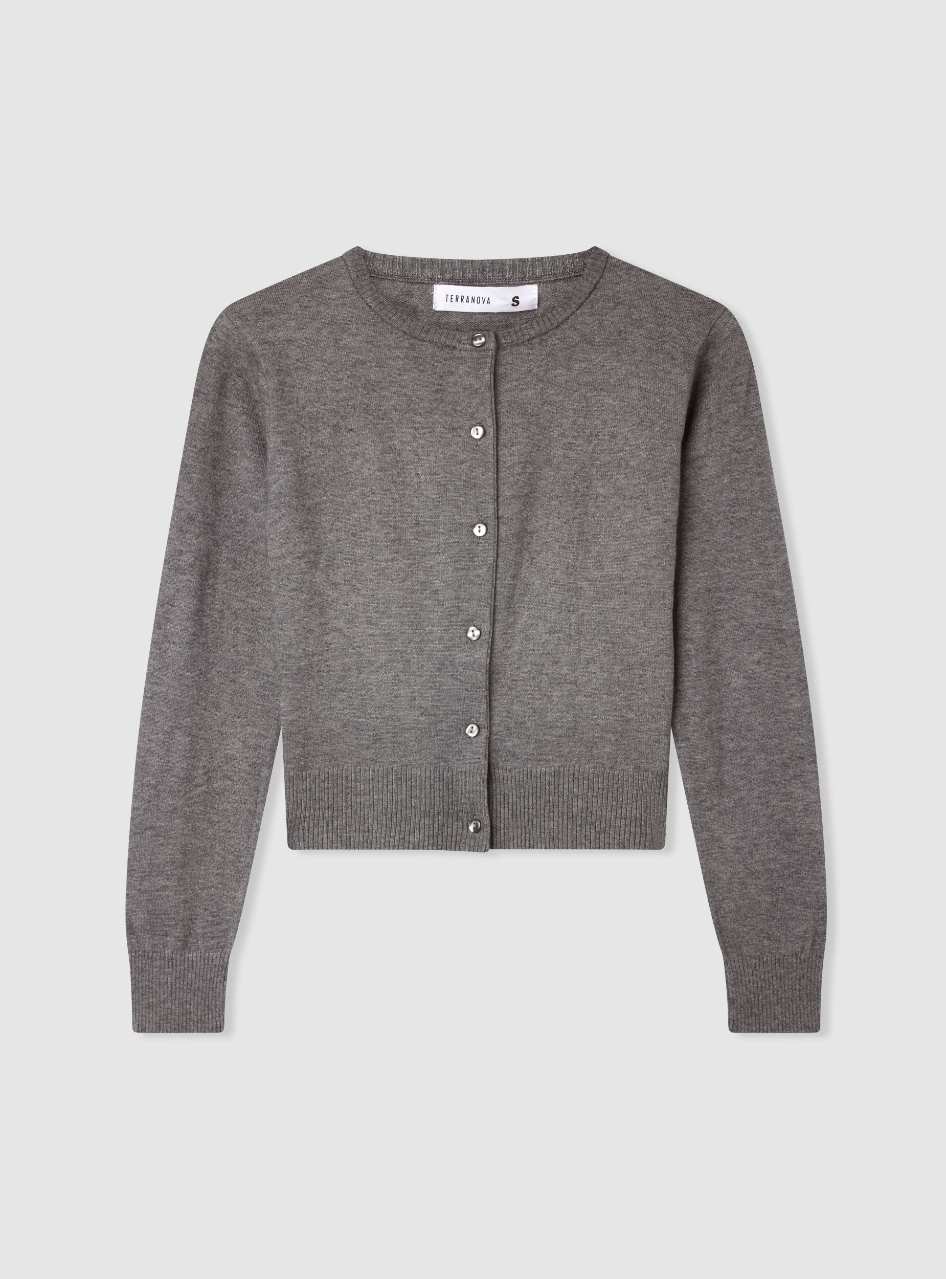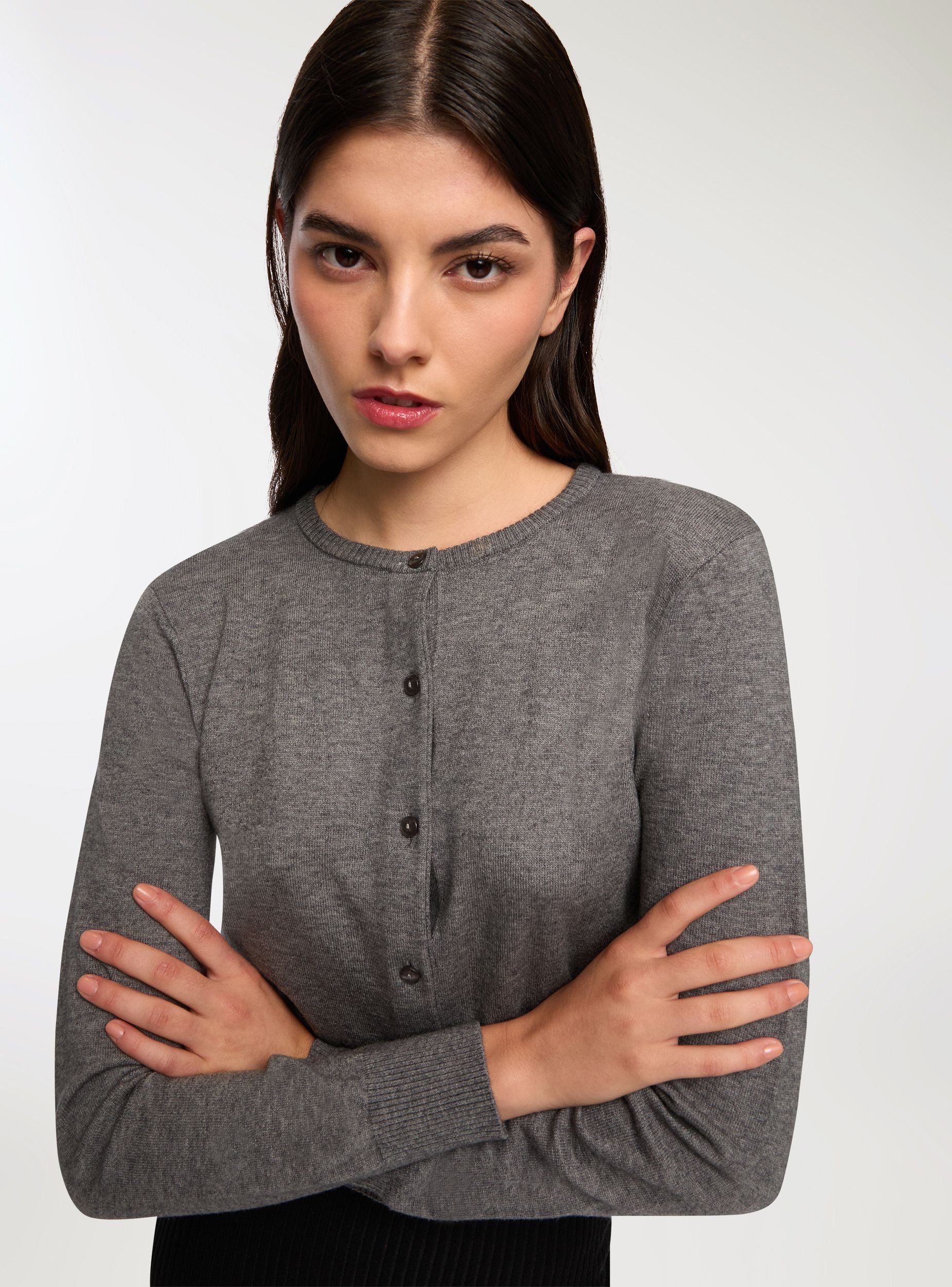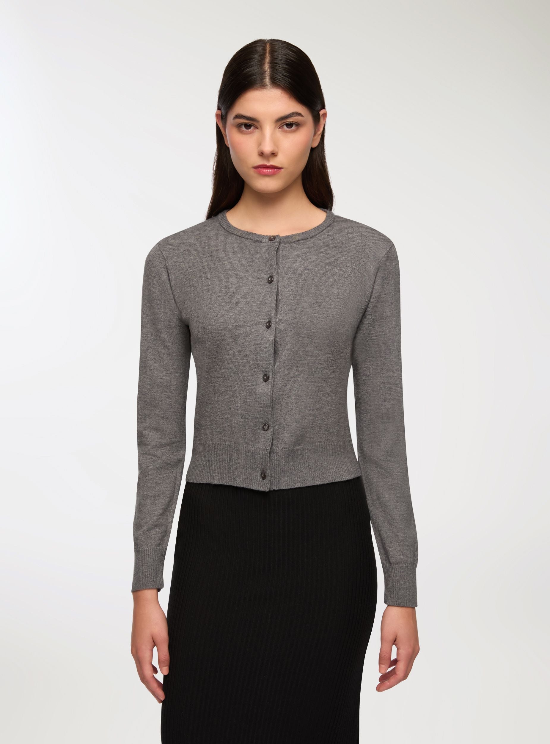 Maglia da donna con design cardigan, caratterizzata da una chiusura frontale con bottoni. Presenta una vestibilità aderente ideale per abbinamenti con gonne o pantaloni a vita alta. Perfetta per occasioni casual. Le maniche lunghe e il girocollo aggiungono un tocco di semplicità e versatilità al capo.
