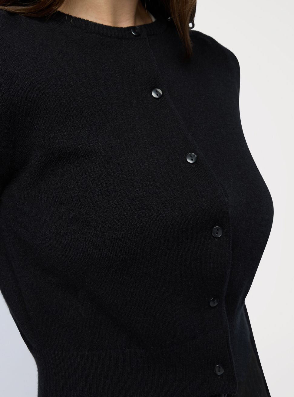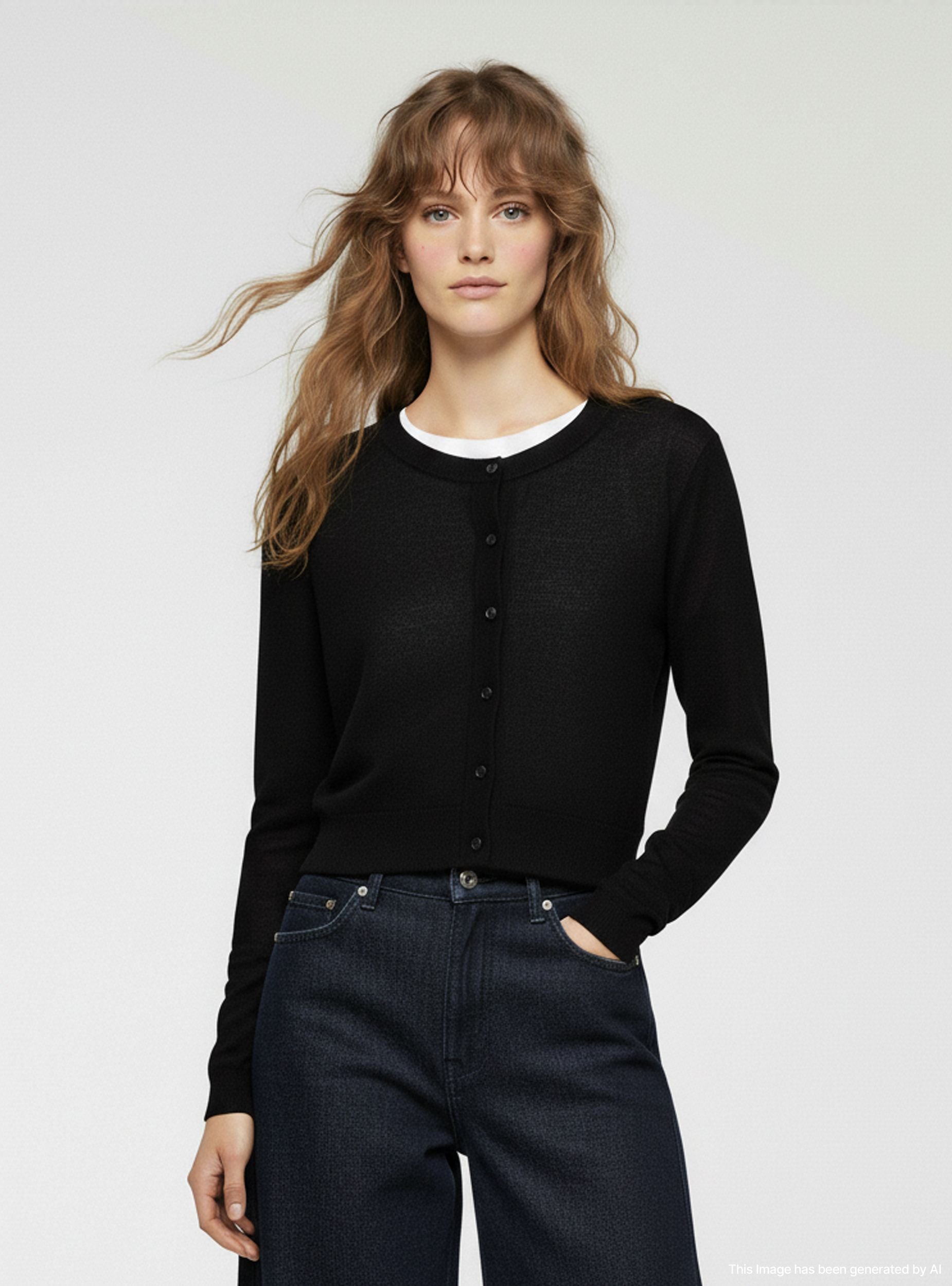 Maglia da donna con design cardigan, caratterizzata da una chiusura frontale con bottoni. Presenta una vestibilità aderente ideale per abbinamenti con gonne o pantaloni a vita alta. Perfetta per occasioni casual. Le maniche lunghe e il girocollo aggiungono un tocco di semplicità e versatilità al capo.