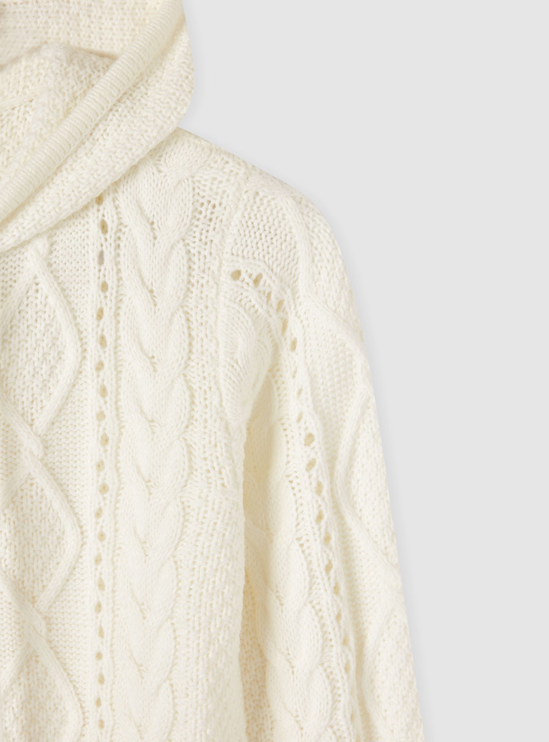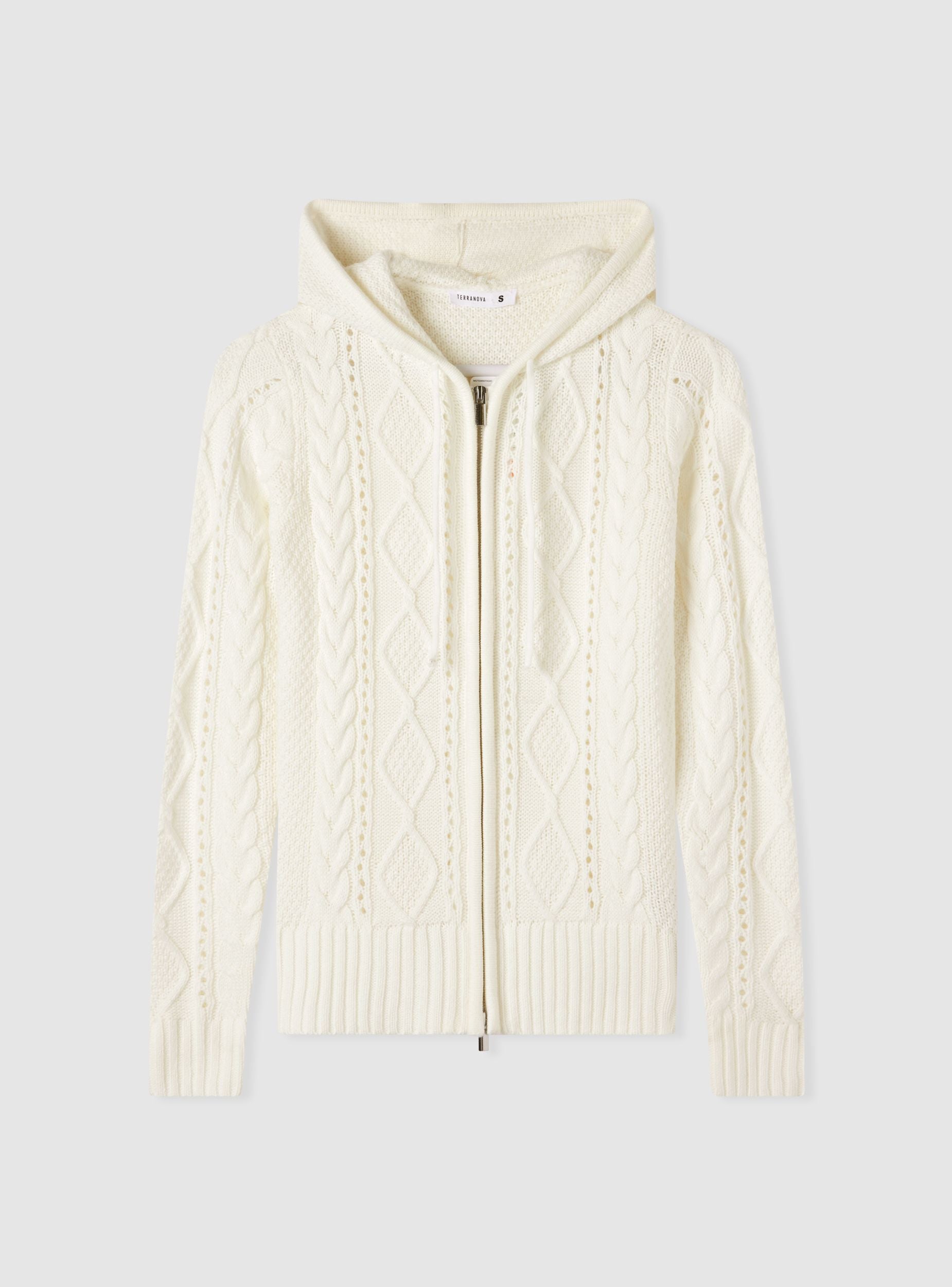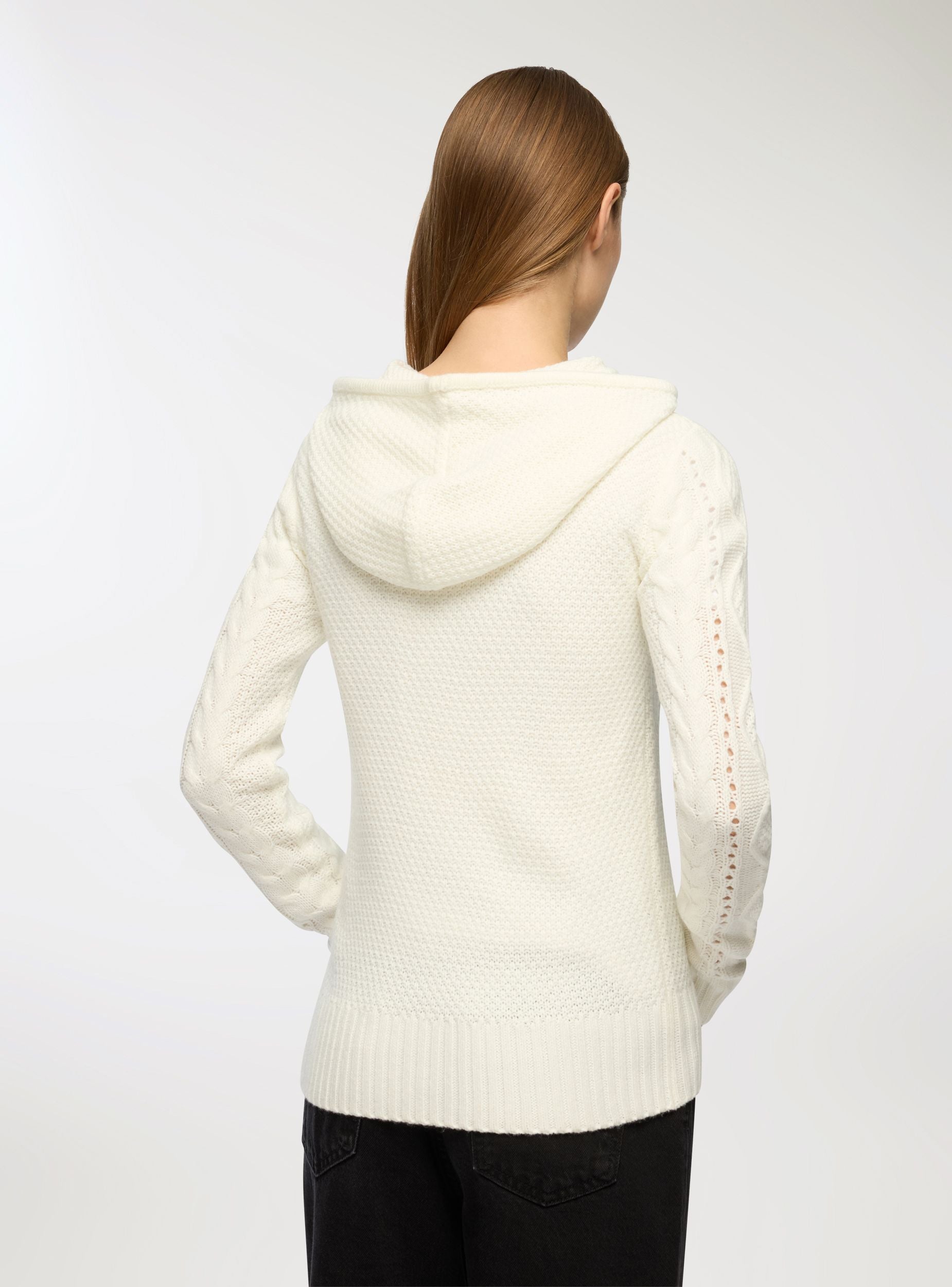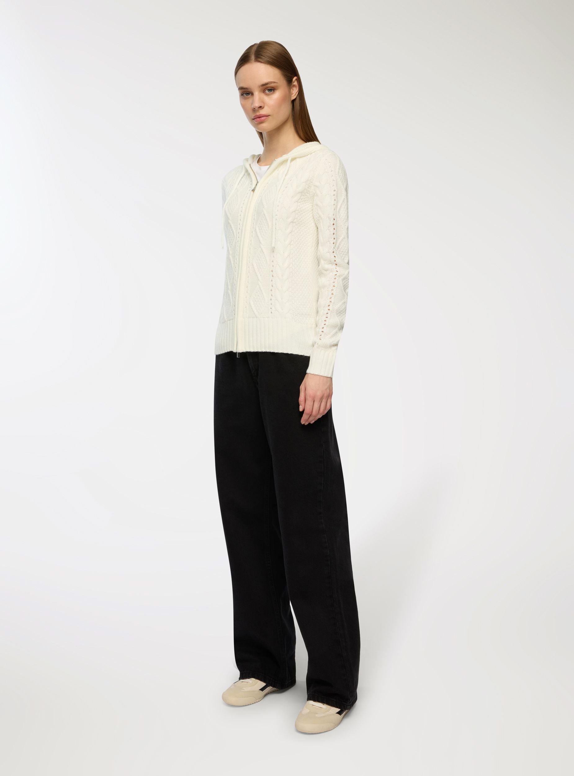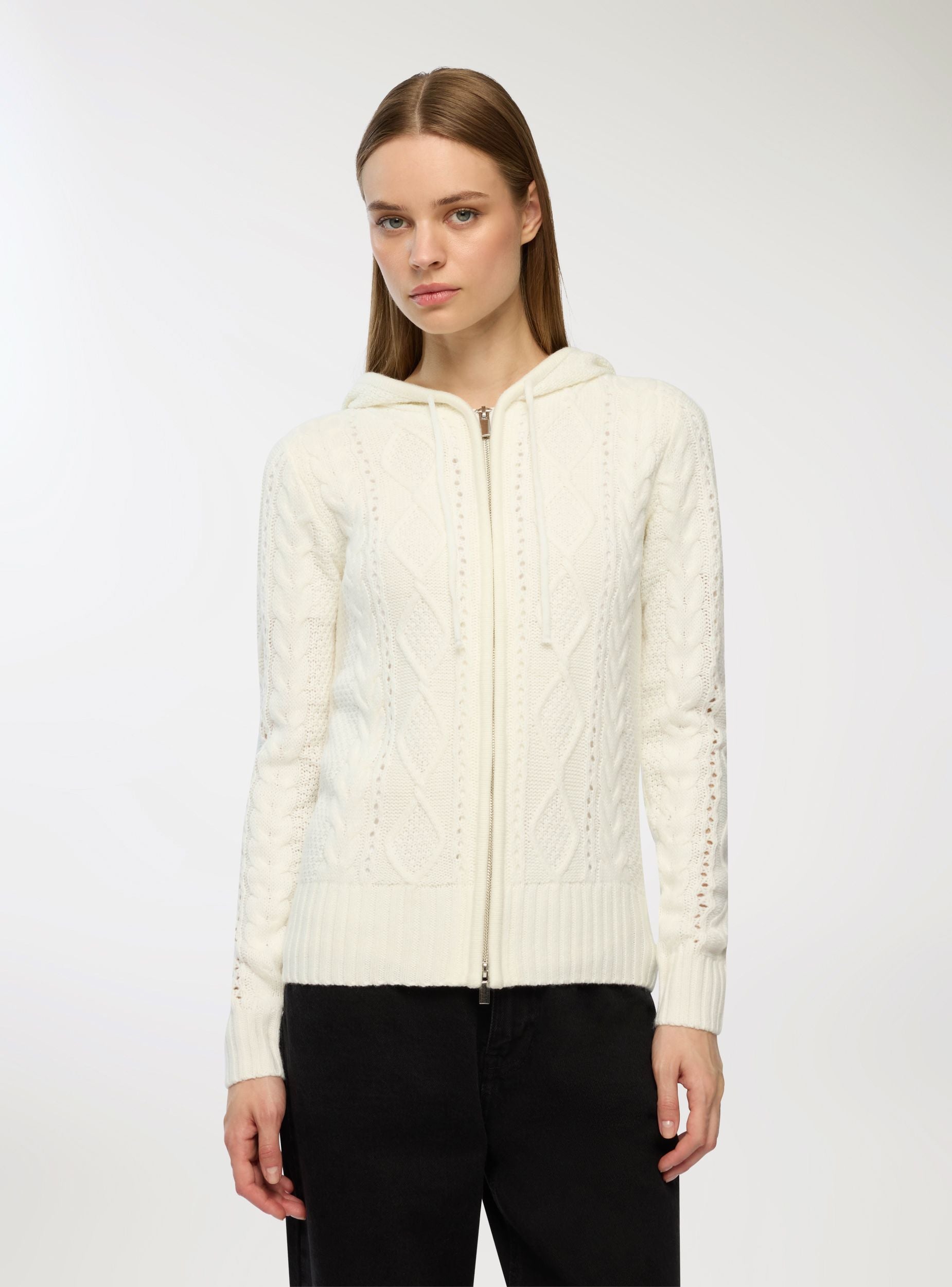 Maglia da donna con cappuccio e zip, caratterizzata da un design intrecciato che aggiunge un tocco di eleganza. Perfetta per un look casual e versatile, si abbina facilmente a jeans o pantaloni per un outfit comodo e alla moda. La vestibilità regolare e il cappuccio con coulisse la rendono ideale per le giornate fresche.