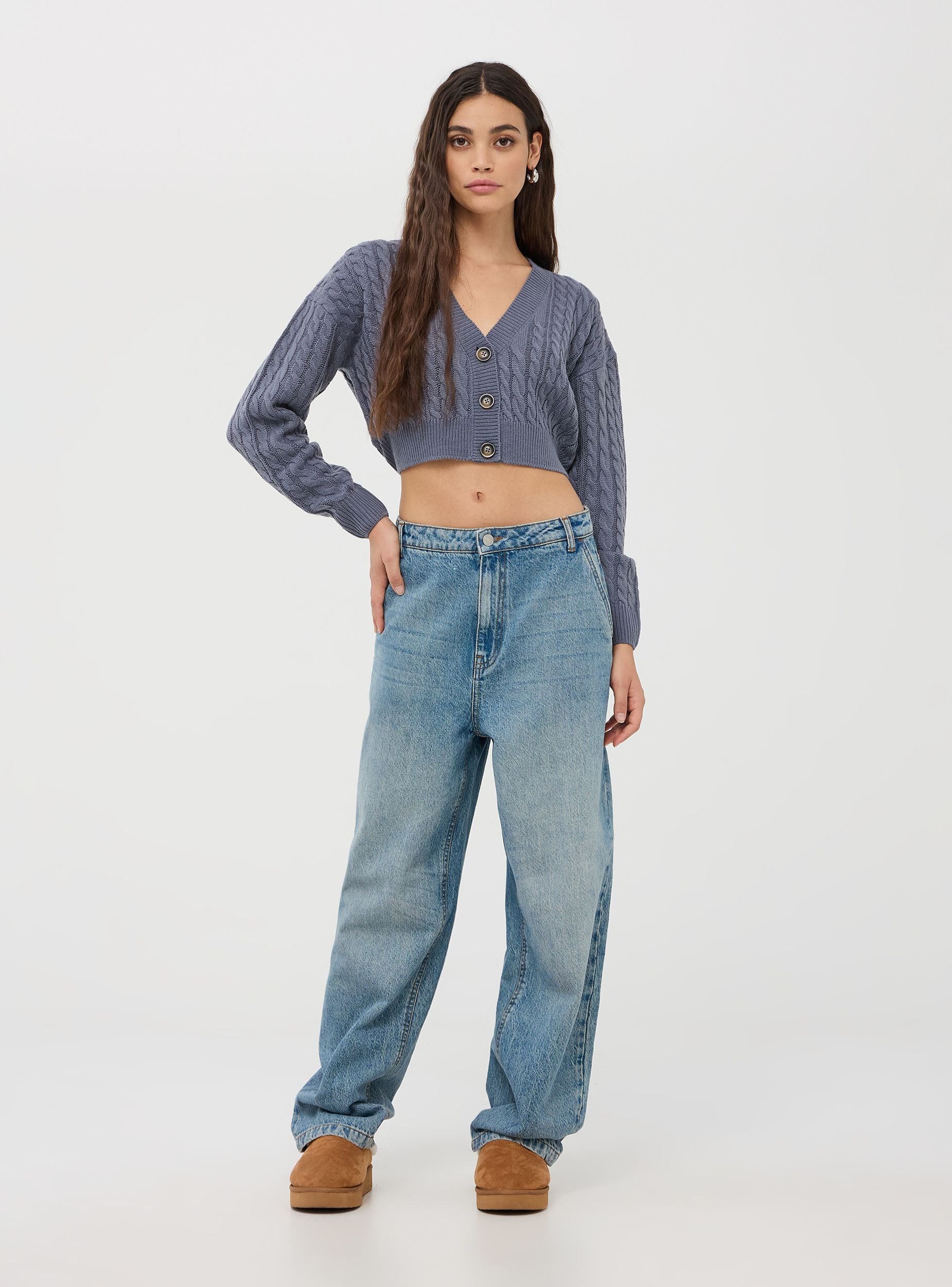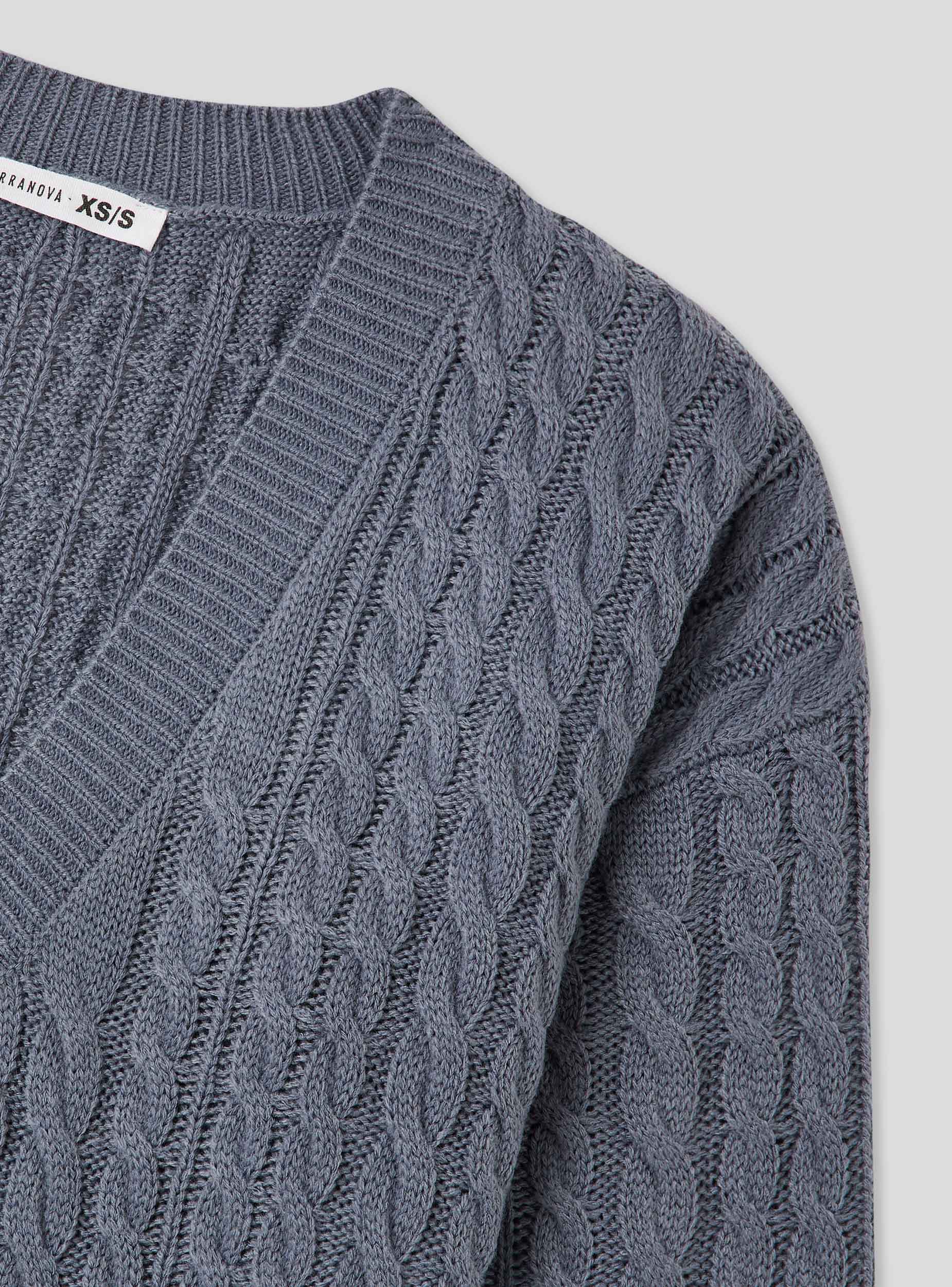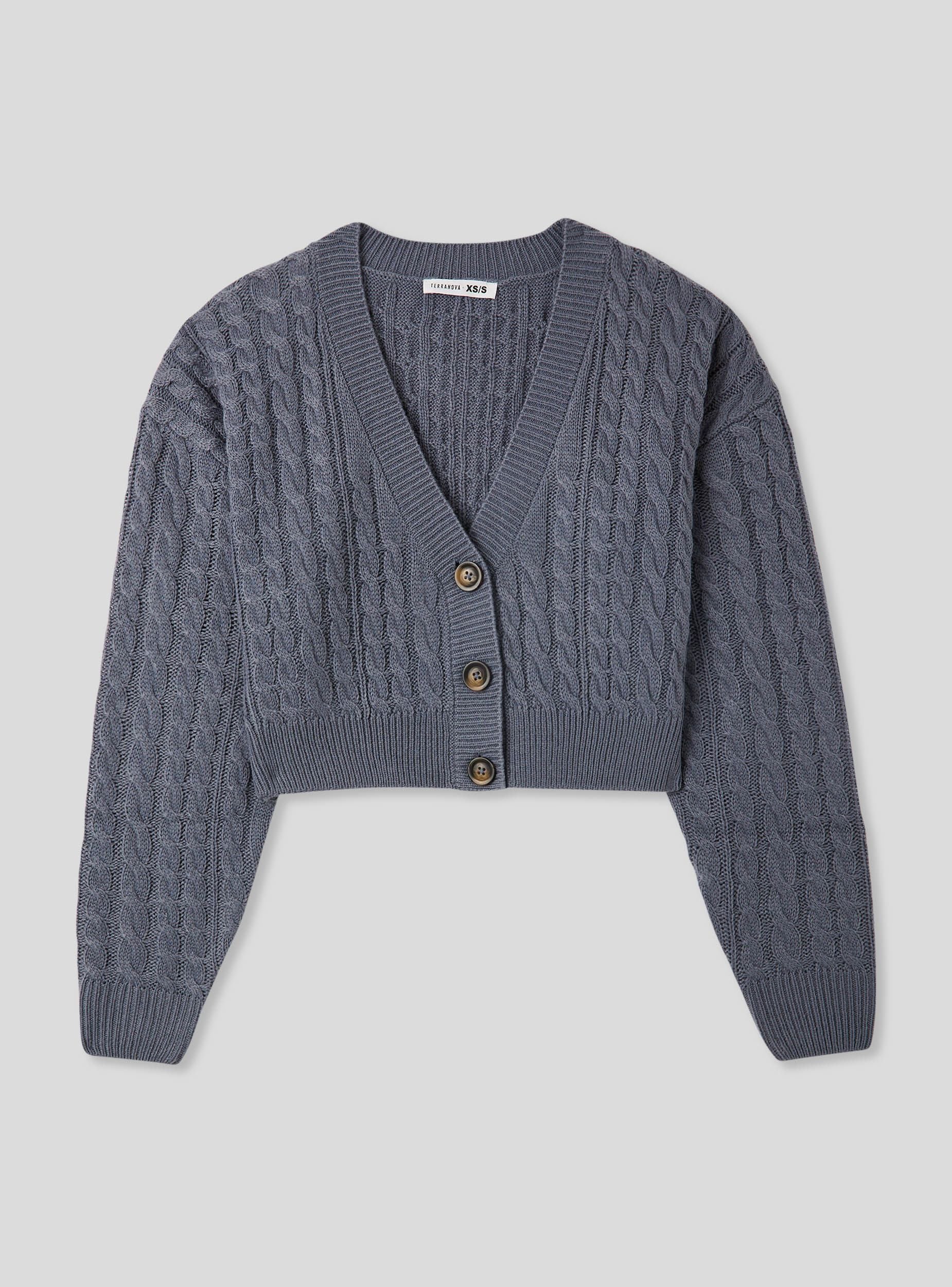Cardigan crop da donna, realizzato in morbido tessuto a maglia con un elegante motivo a trecce. Il design presenta un taglio corto che arriva sopra la vita, conferendo un look moderno e alla moda. Il cardigan è dotato di maniche lunghe e di una chiusura frontale con quattro bottoni, che aggiungono un tocco classico al capo. Il colletto a V e i bordi a coste completano il design, garantendo una vestibilità aderente e confortevole.