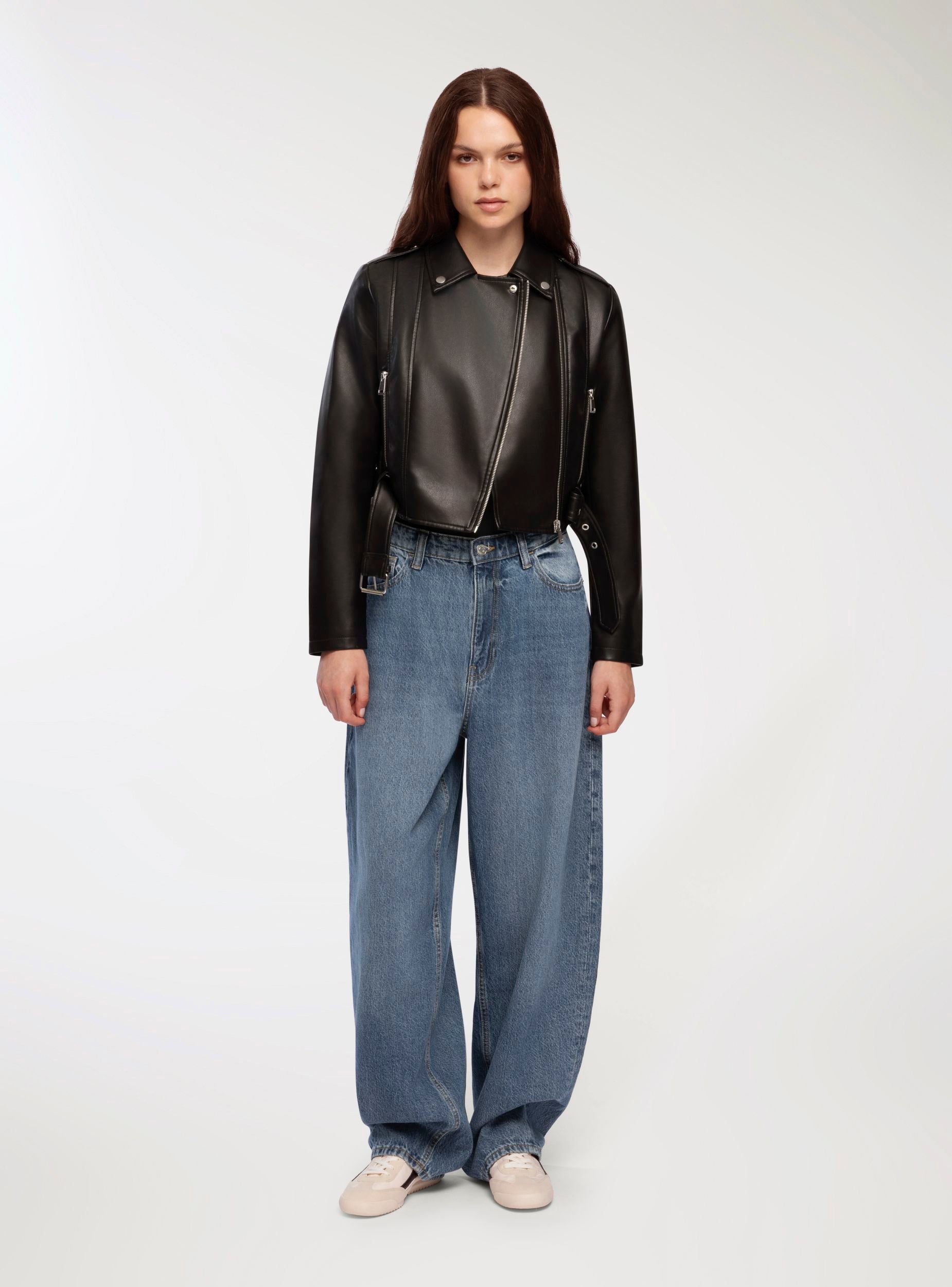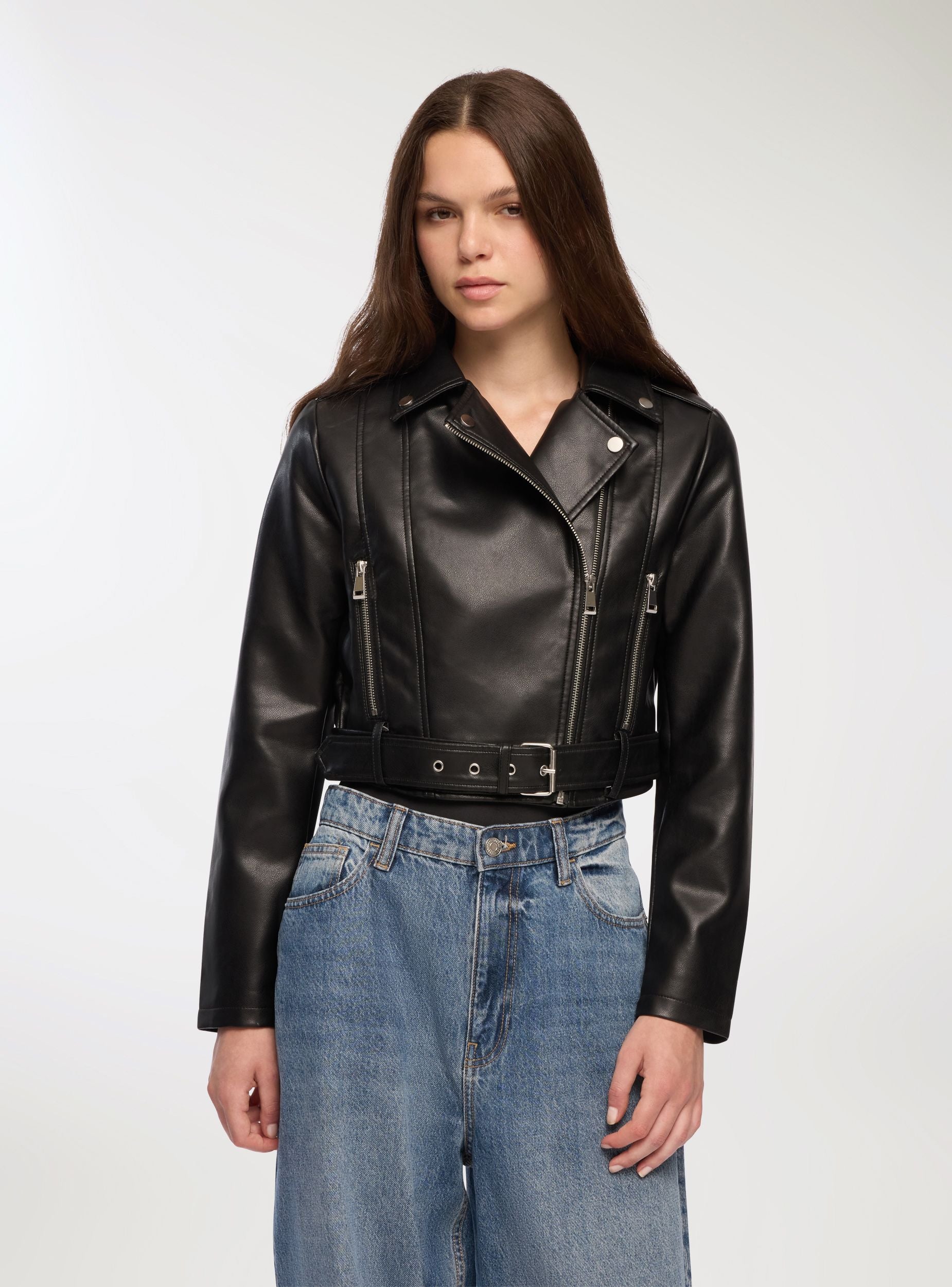 Giacca da donna stile chiodo, con maniche lunghe, zip diagonale e colletto con revers con bottoni a pressione. La cintura con fibbia sul fondo permette di regolare la vestibilità e aggiunge un dettaglio grintoso, mentre le tasche frontali con zip completano il design dal carattere deciso. Perfetto per look da giorno con jeans skinny o per serate in città abbinato a un abito attillato, dona un tocco urban e moderno a qualsiasi outfit.