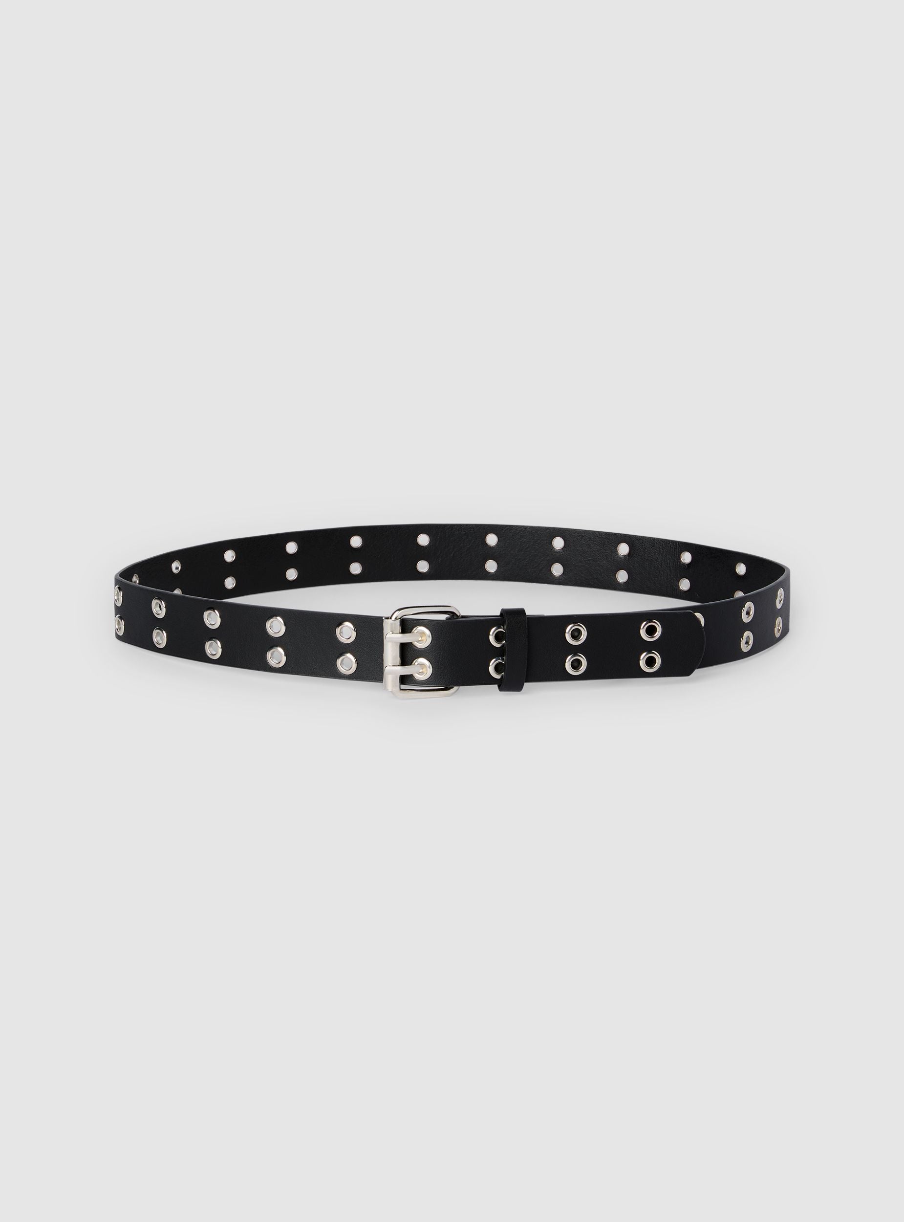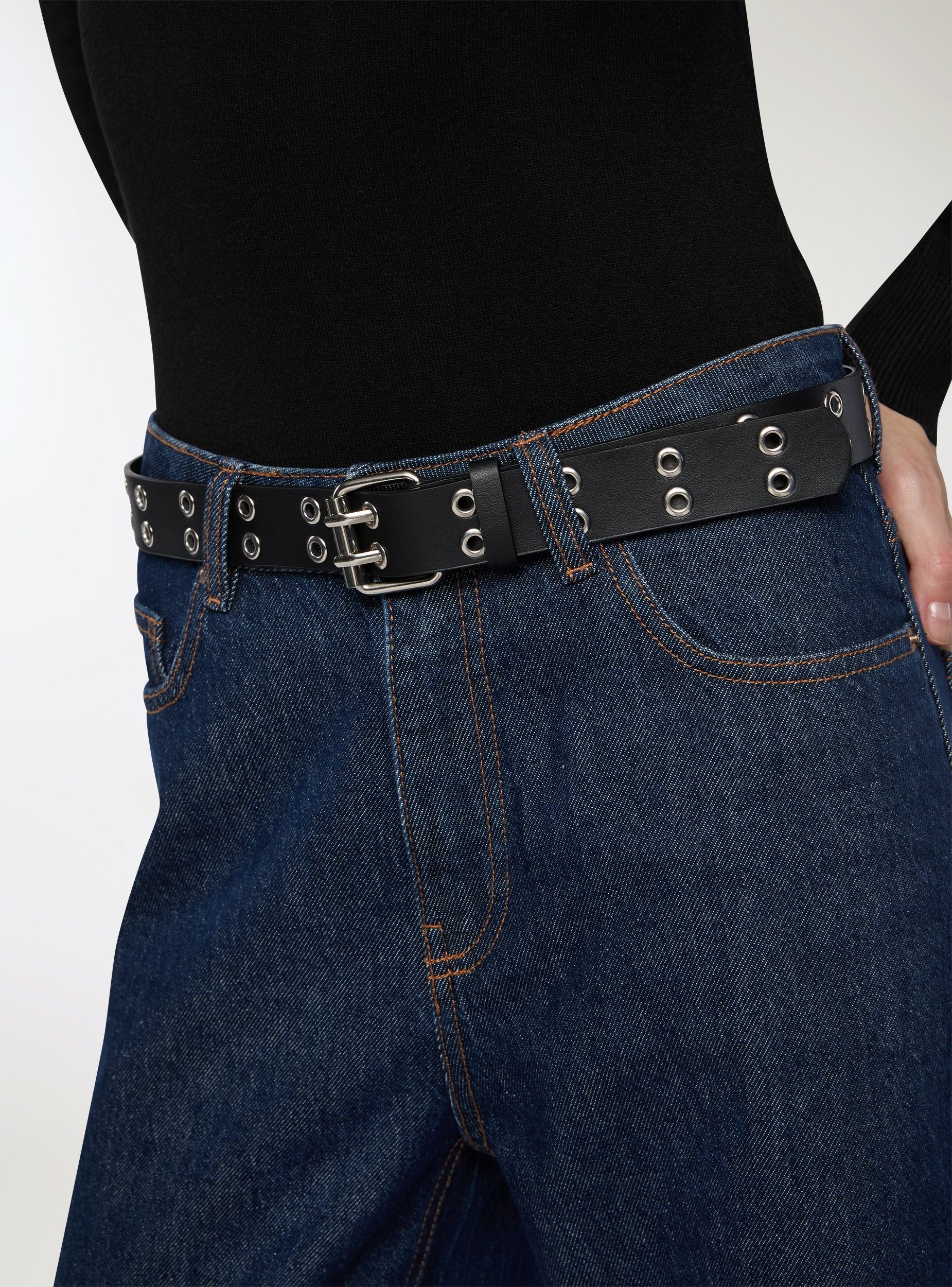 Cintura da donna con dettagli di occhielli lungo tutta la lunghezza. Ideale per aggiungere un tocco di stile a qualsiasi outfit, questa cintura si adatta perfettamente a look casual e trendy. Realizzata in similpelle a tinta unita è dotata di fibbia squadrata con doppio ardiglione. Perfetta per essere abbinata a jeans o pantaloni, offre un design moderno e versatile che si distingue per la sua eleganza e praticità.