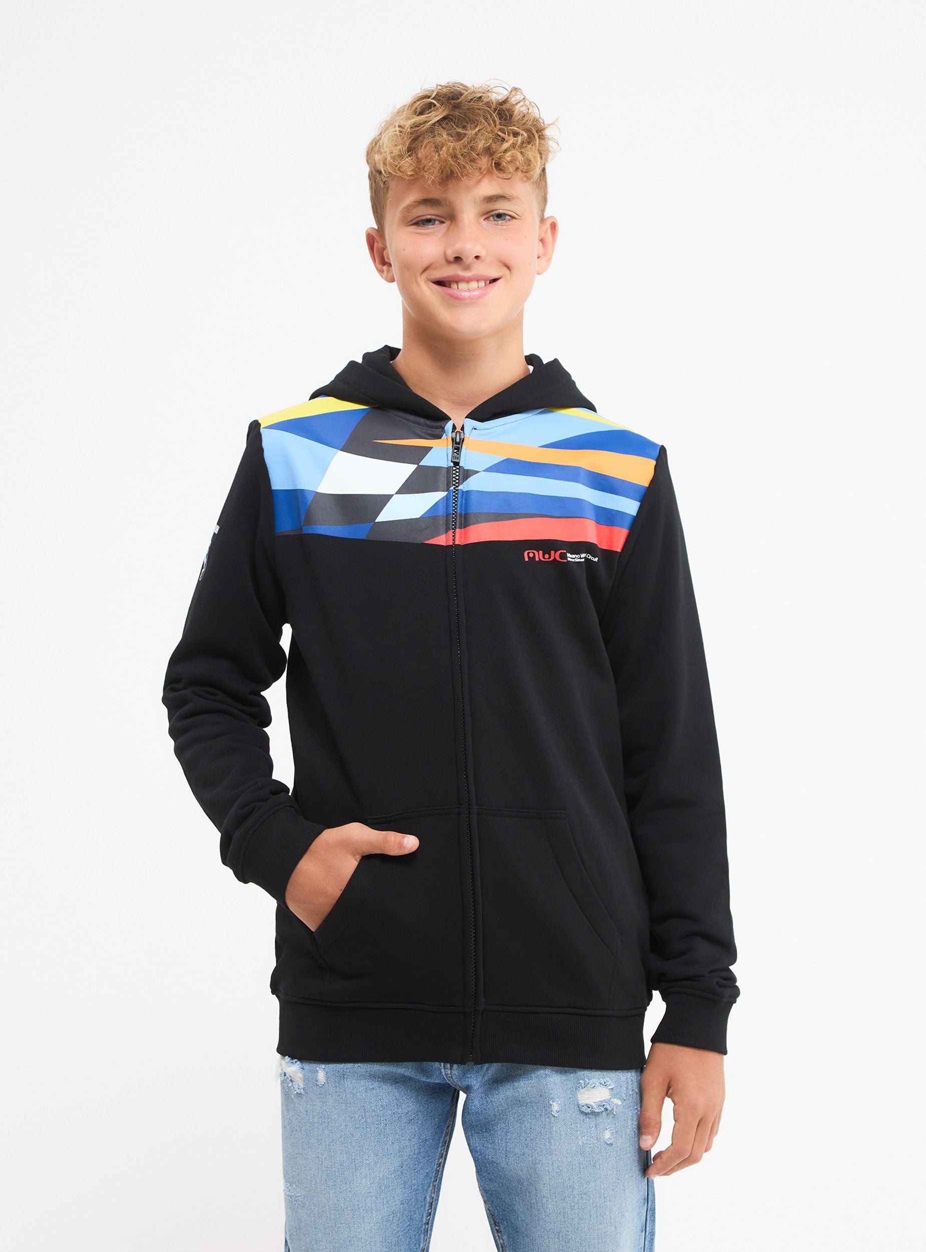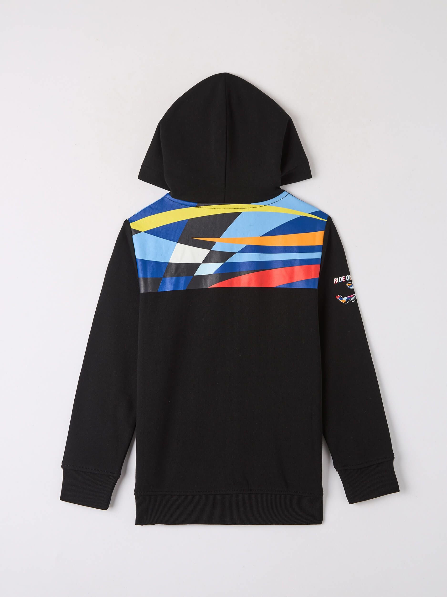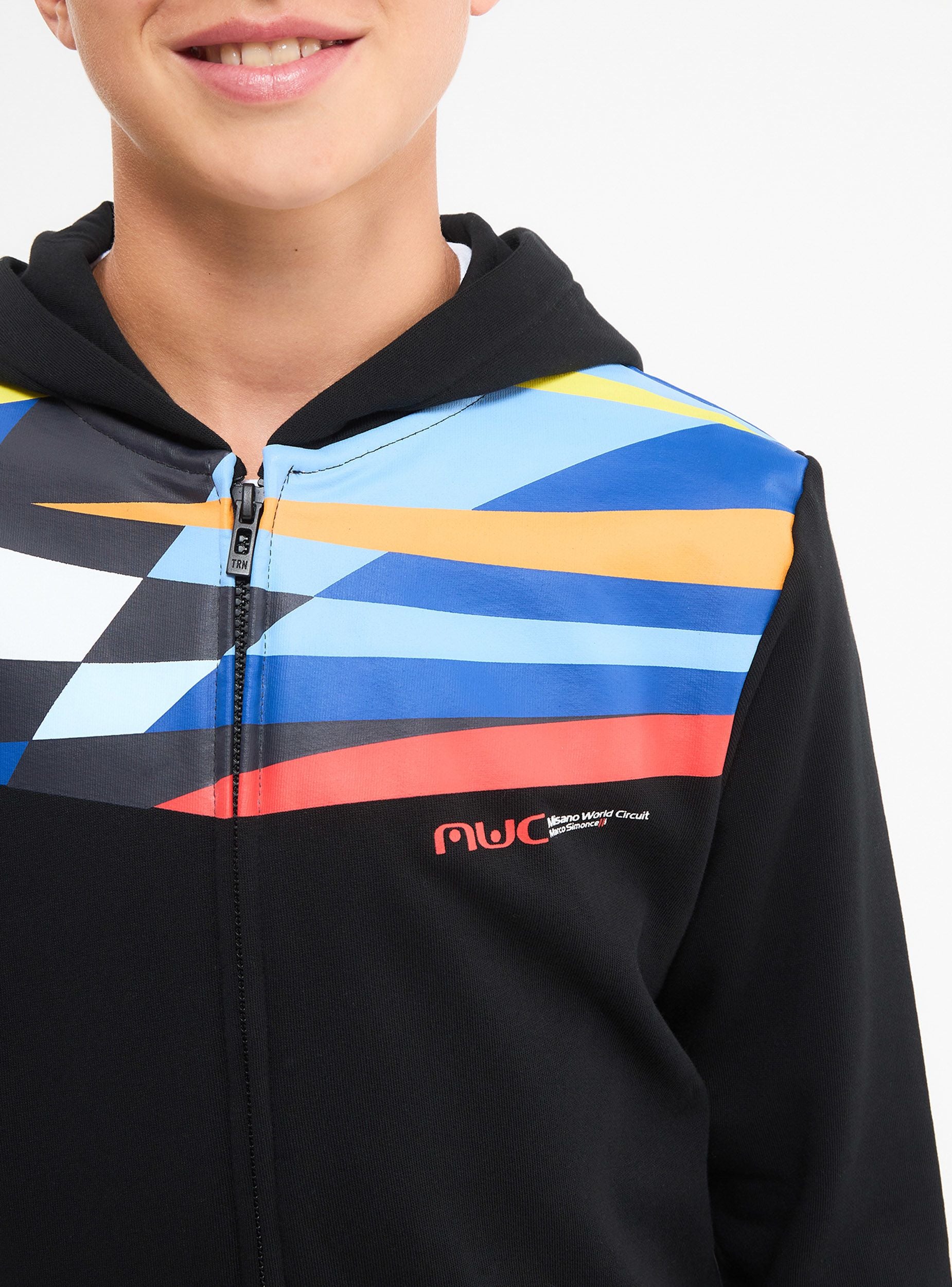 Felpa da bambino con cappuccio, dotata di chiusura frontale a zip e comode tasche laterali. Presenta una stampa frontale e posteriore ispirata al Misano World Circuit, che aggiunge un tocco di dinamismo e stile. Ideale per i piccoli appassionati di motori, offre una vestibilità regular che assicura comfort e libertà di movimento. Perfetta per un look casual e sportivo.