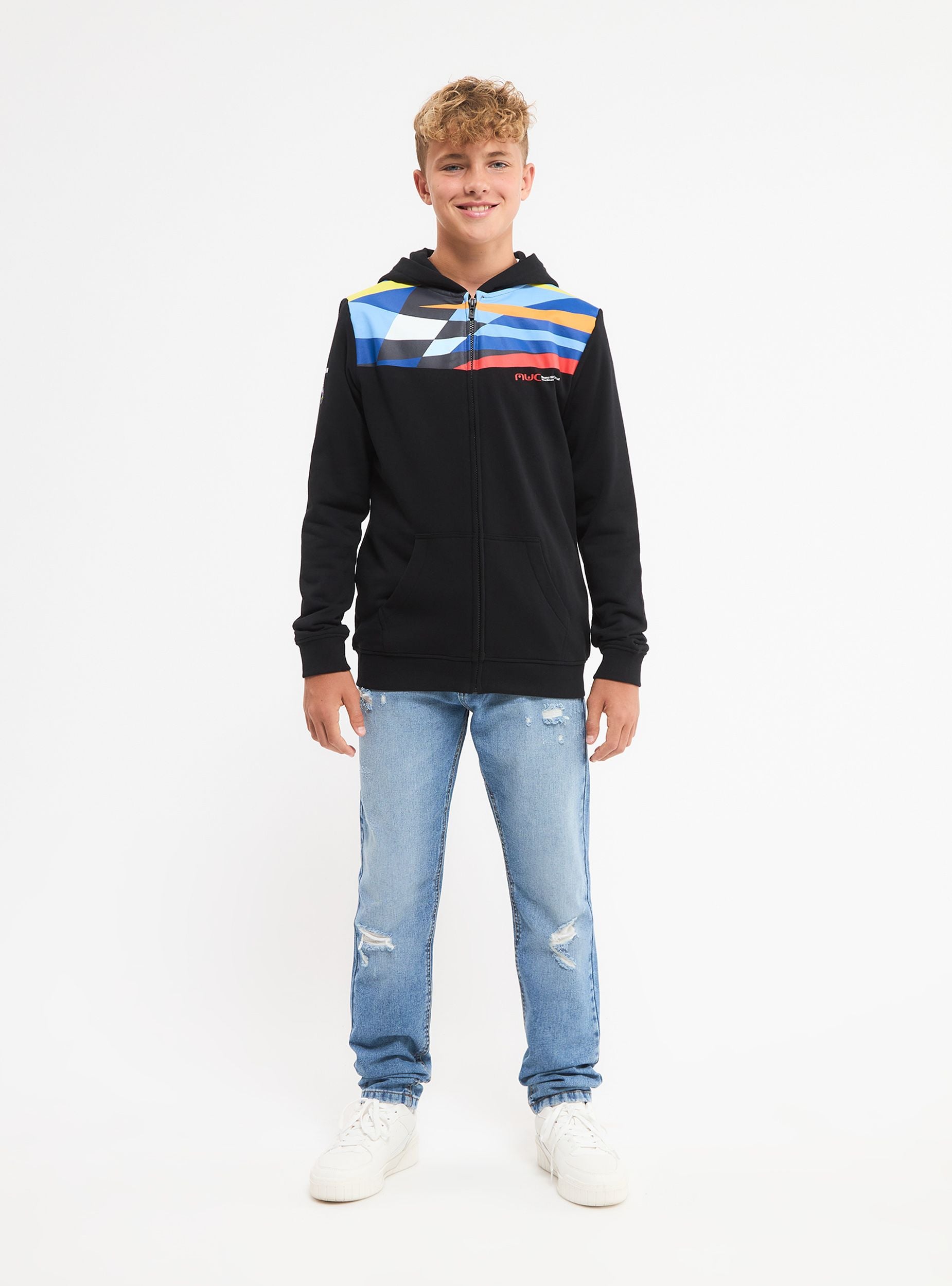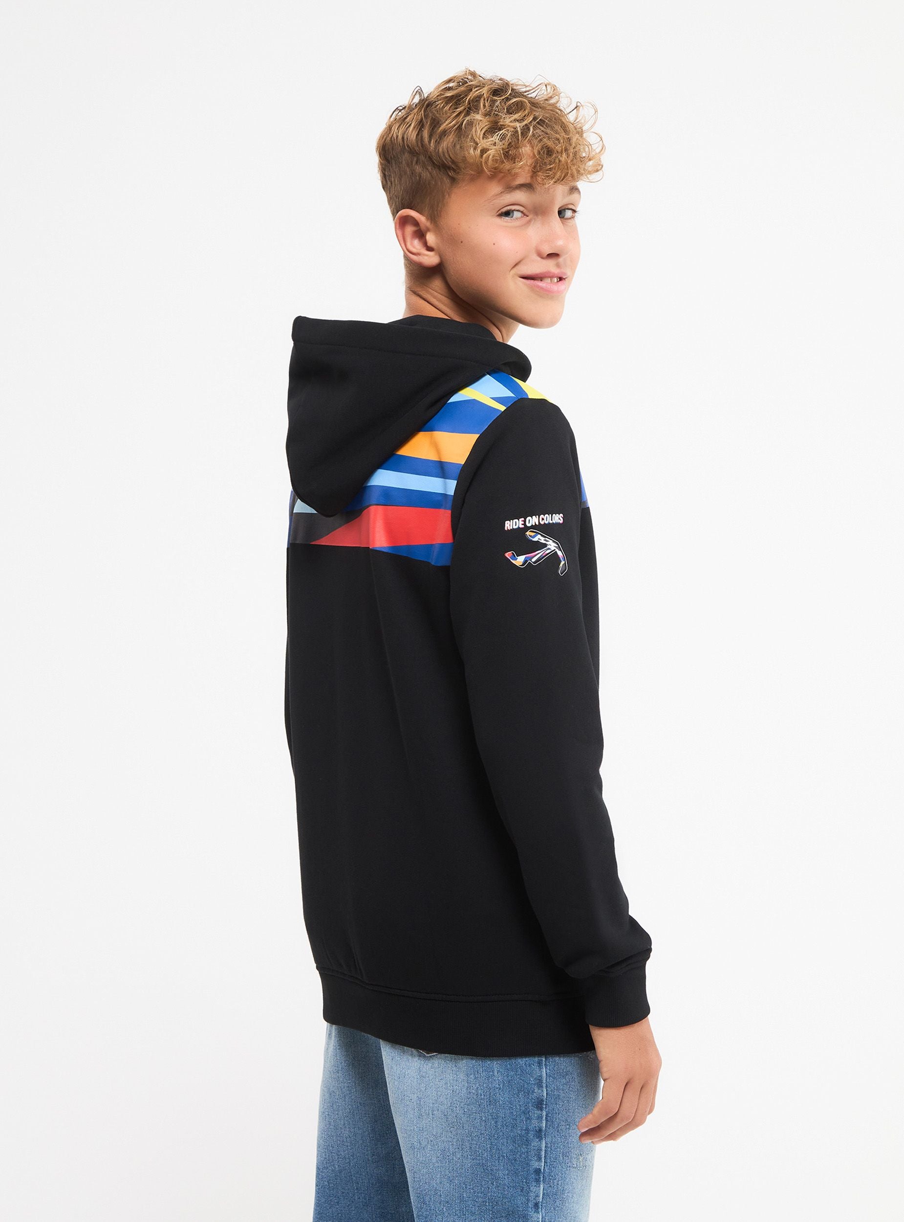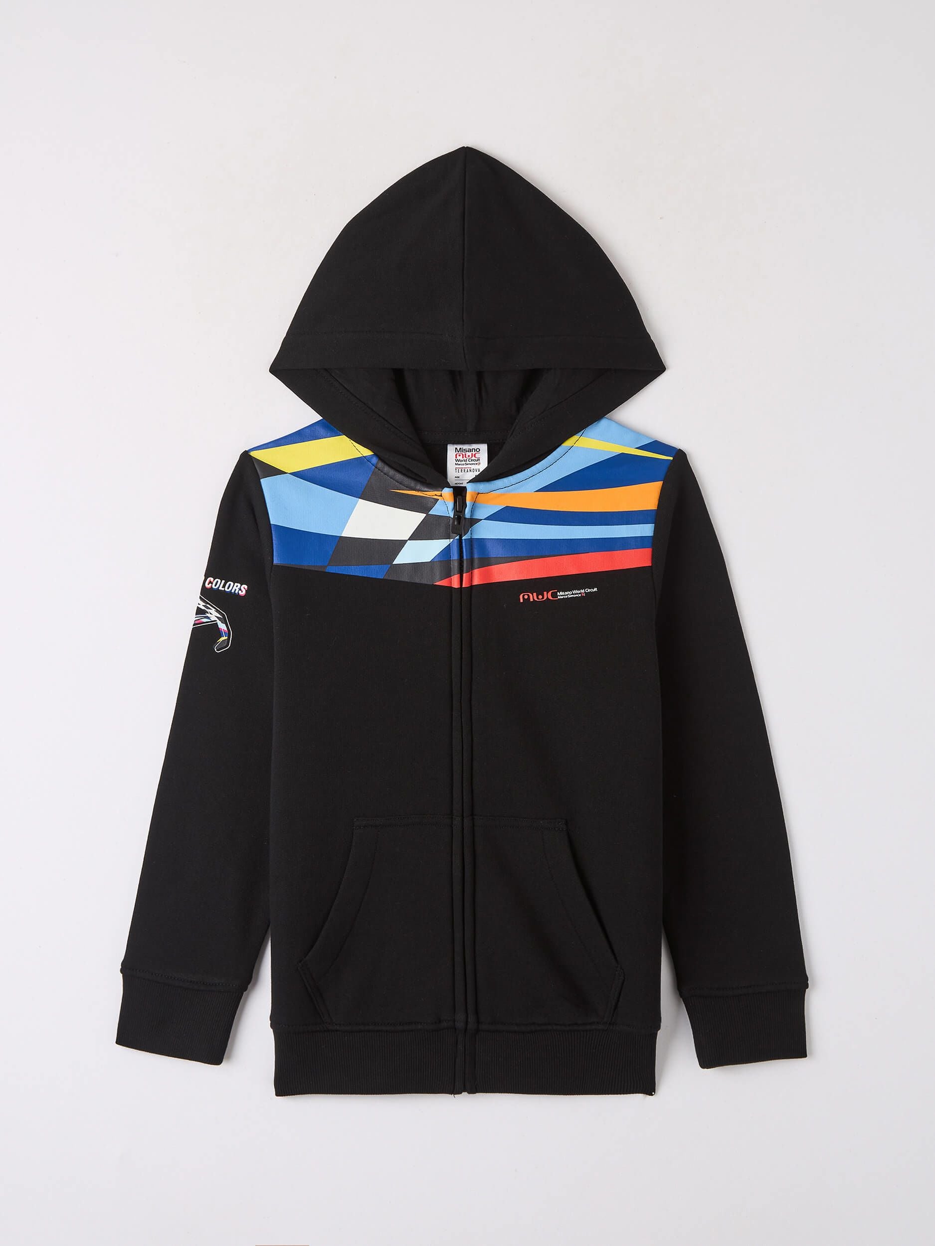 Felpa da bambino con cappuccio, dotata di chiusura frontale a zip e comode tasche laterali. Presenta una stampa frontale e posteriore ispirata al Misano World Circuit, che aggiunge un tocco di dinamismo e stile. Ideale per i piccoli appassionati di motori, offre una vestibilità regular che assicura comfort e libertà di movimento. Perfetta per un look casual e sportivo.