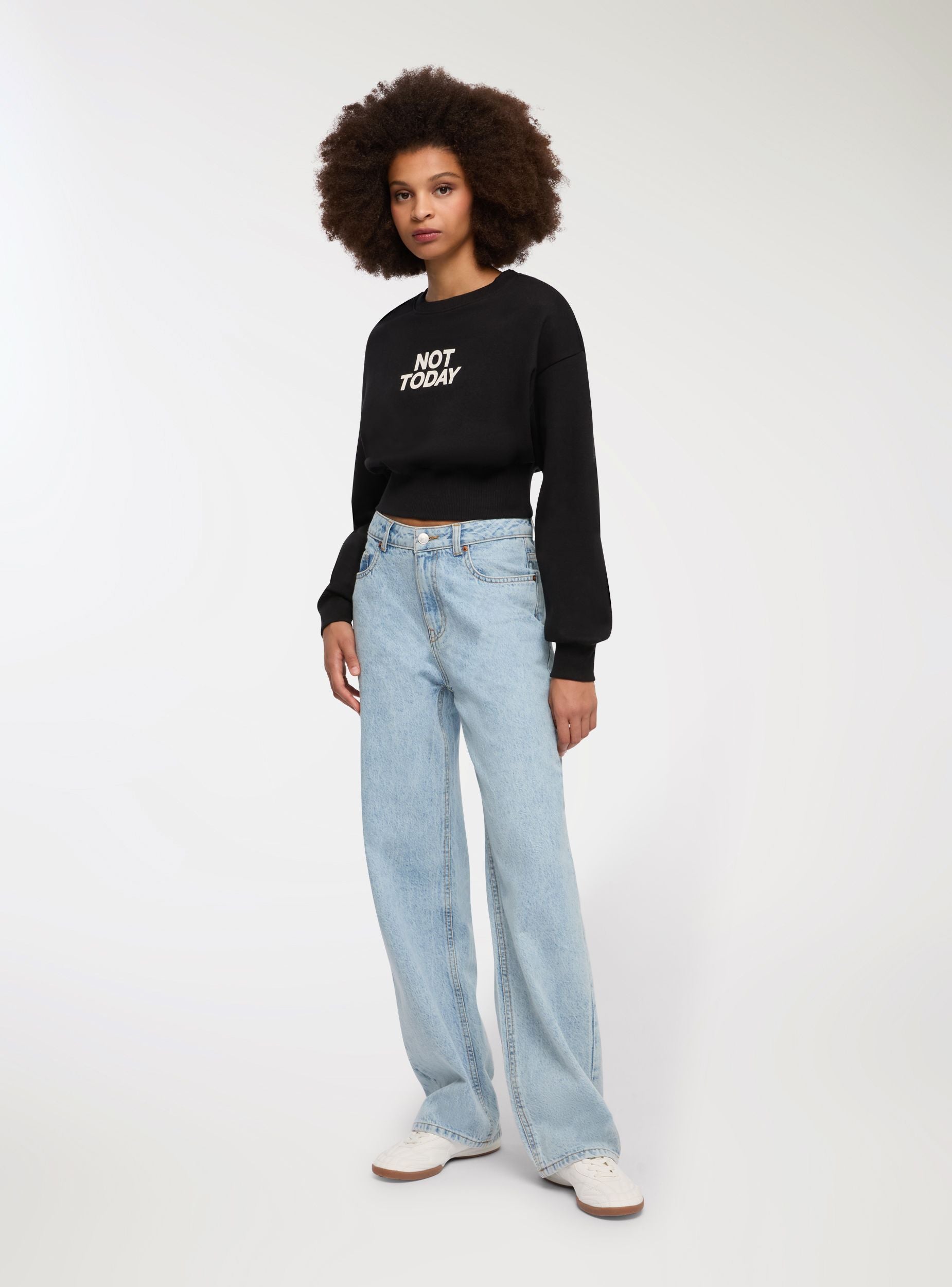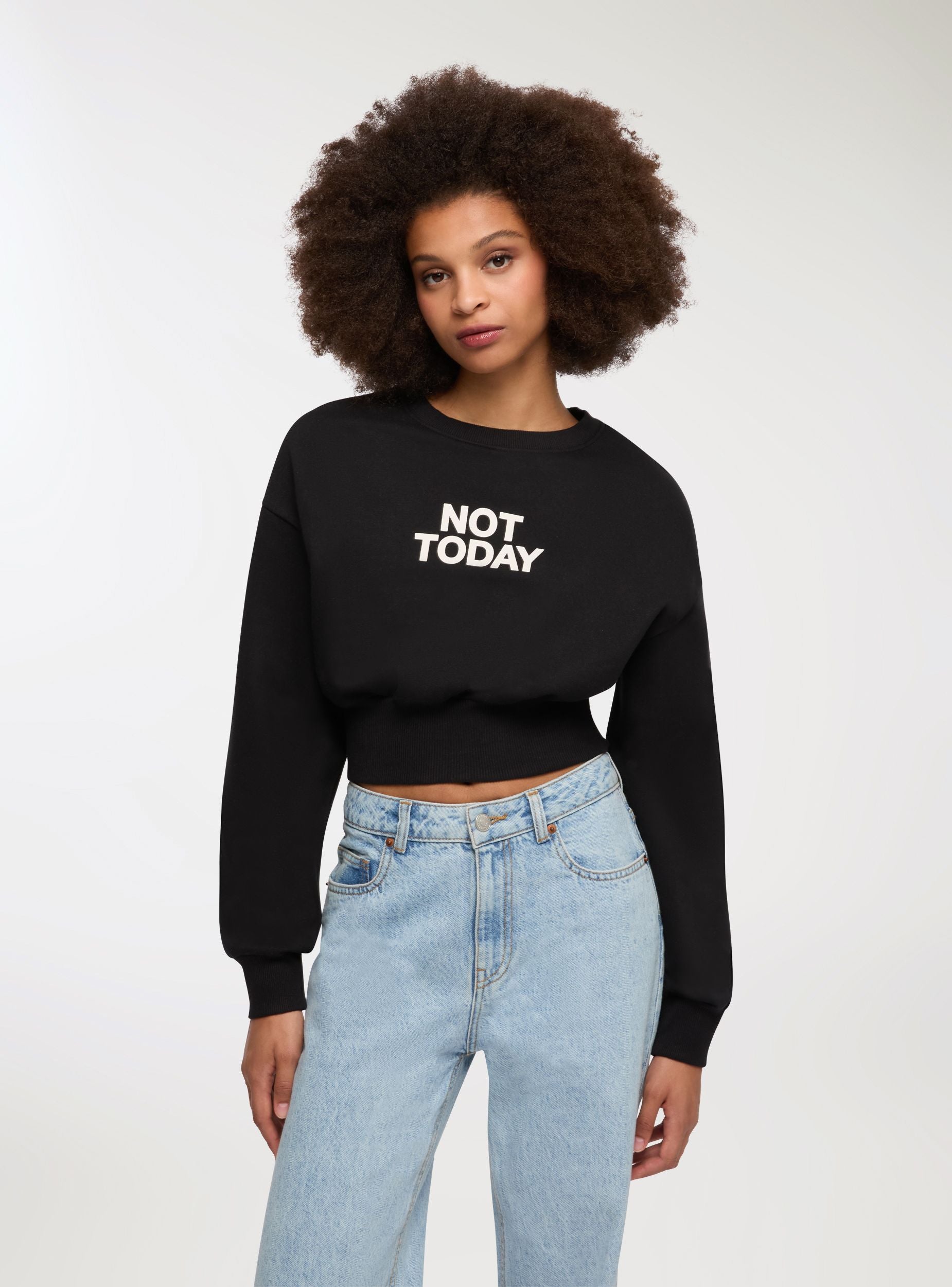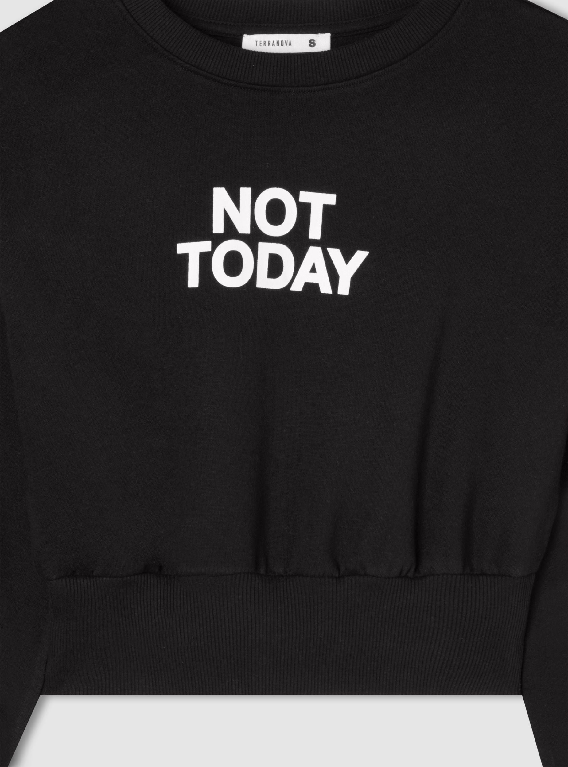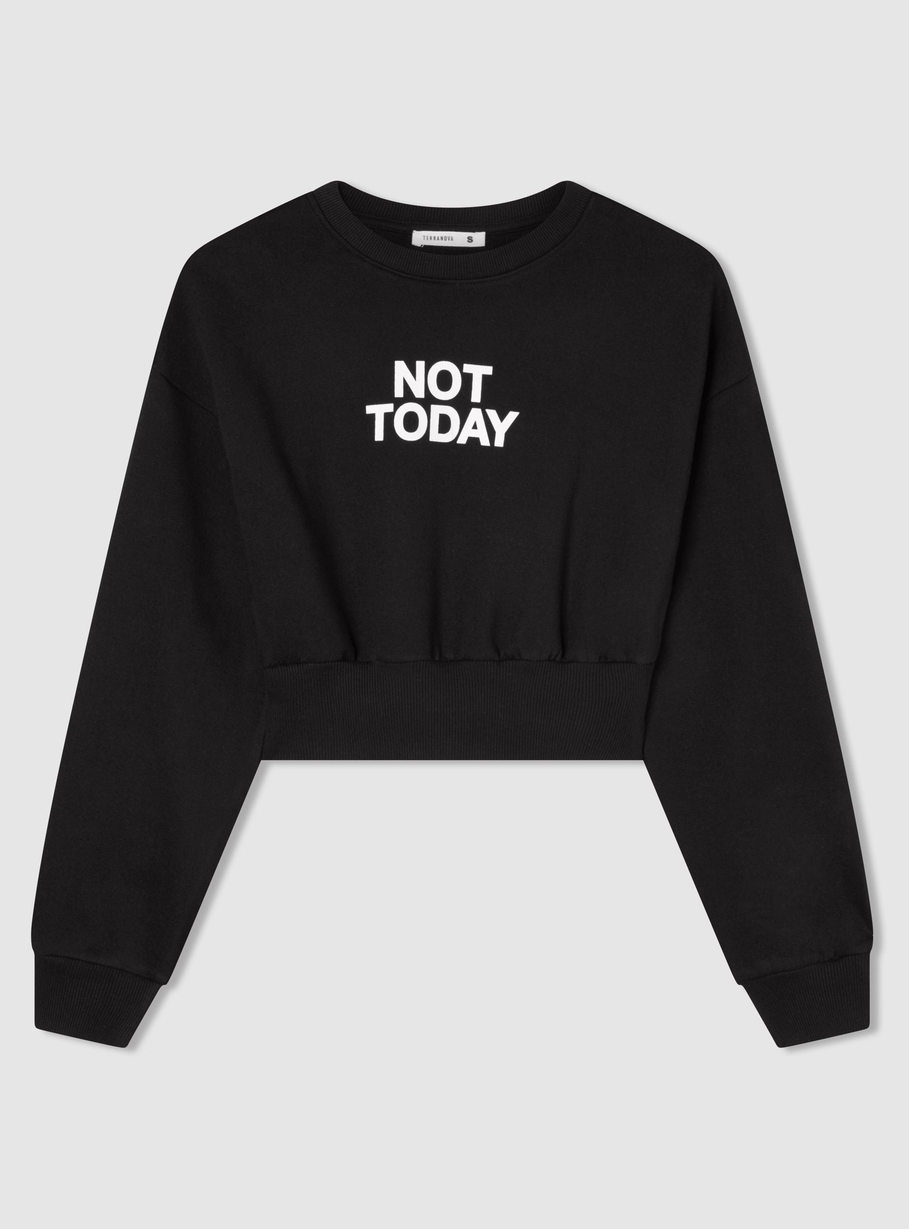 Felpa pesante da donna con scritta “Not Today” stampata sul davanti, perfetta per uno stile ironico e grintoso. Il modello cropped con fascia ampia in vita e polsi a costine valorizza la silhouette e offre una vestibilità confortevole. Realizzata in tessuto felpato è ideale per la stagione invernale. Da indossare con jeans o pantaloni relaxed per un look casual e deciso.