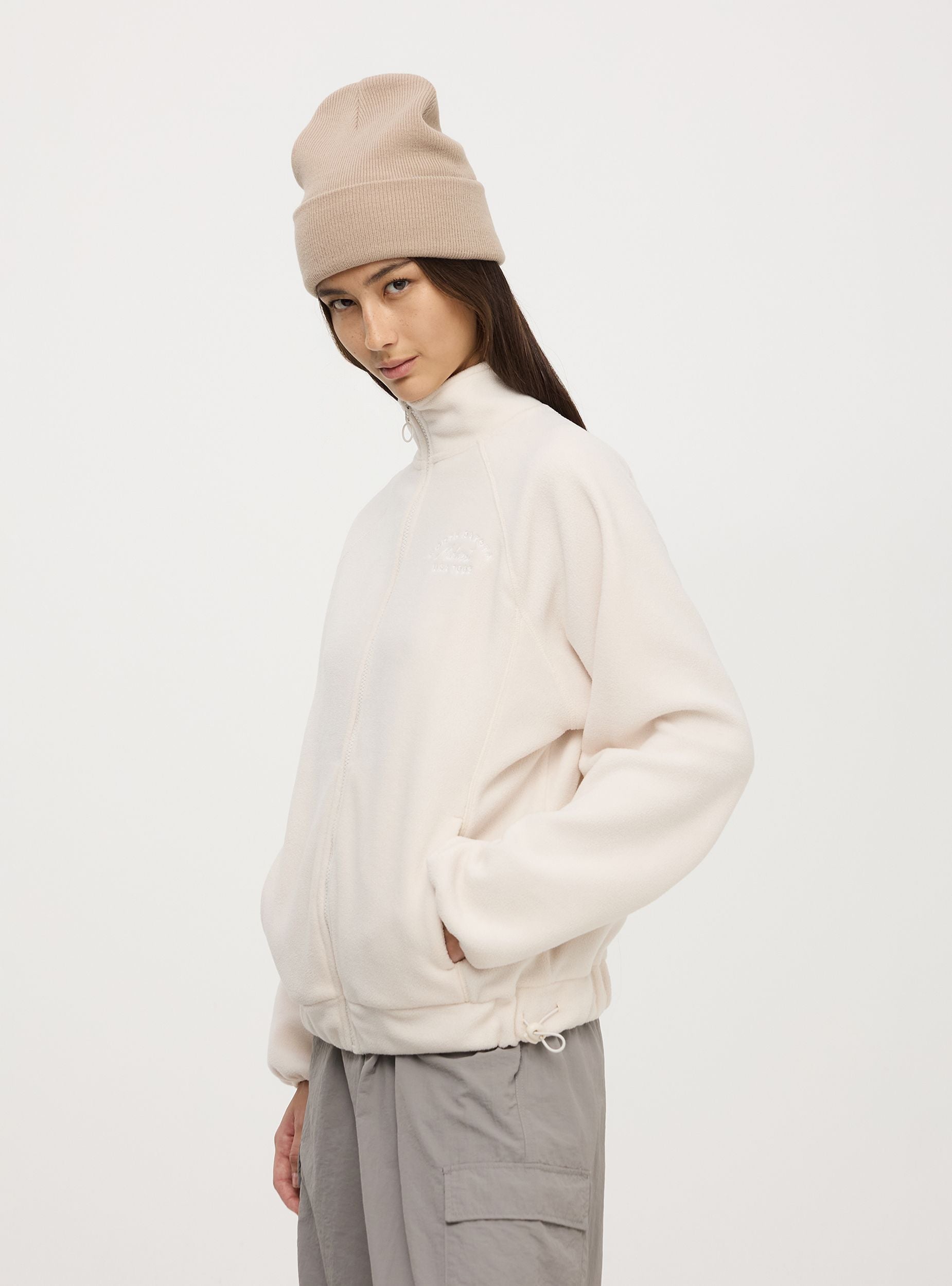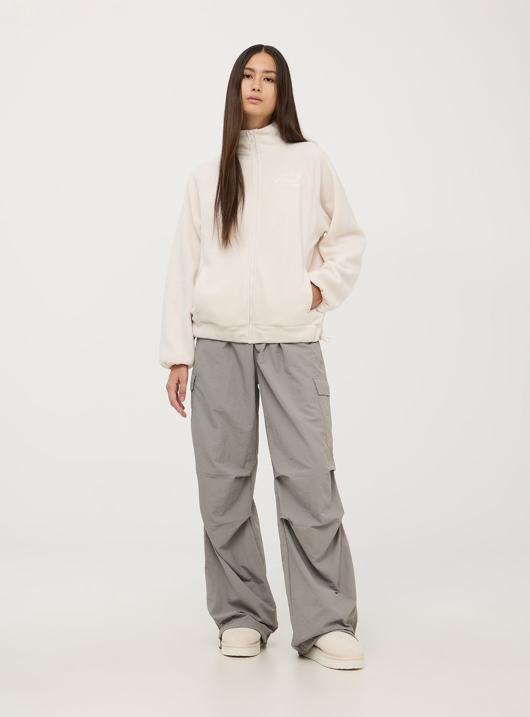 Felpa in pile da donna con chiusura con zip frontale e colletto alto per maggiore protezione. Dotata di due tasche laterali, ha una vestibilità comoda che permette libertà di movimento. Il design include una scritta ricamata discreta sul petto sinistro. Perfetta per occasioni casual e attività all'aperto, mantenendoti calda nelle giornate fresche.