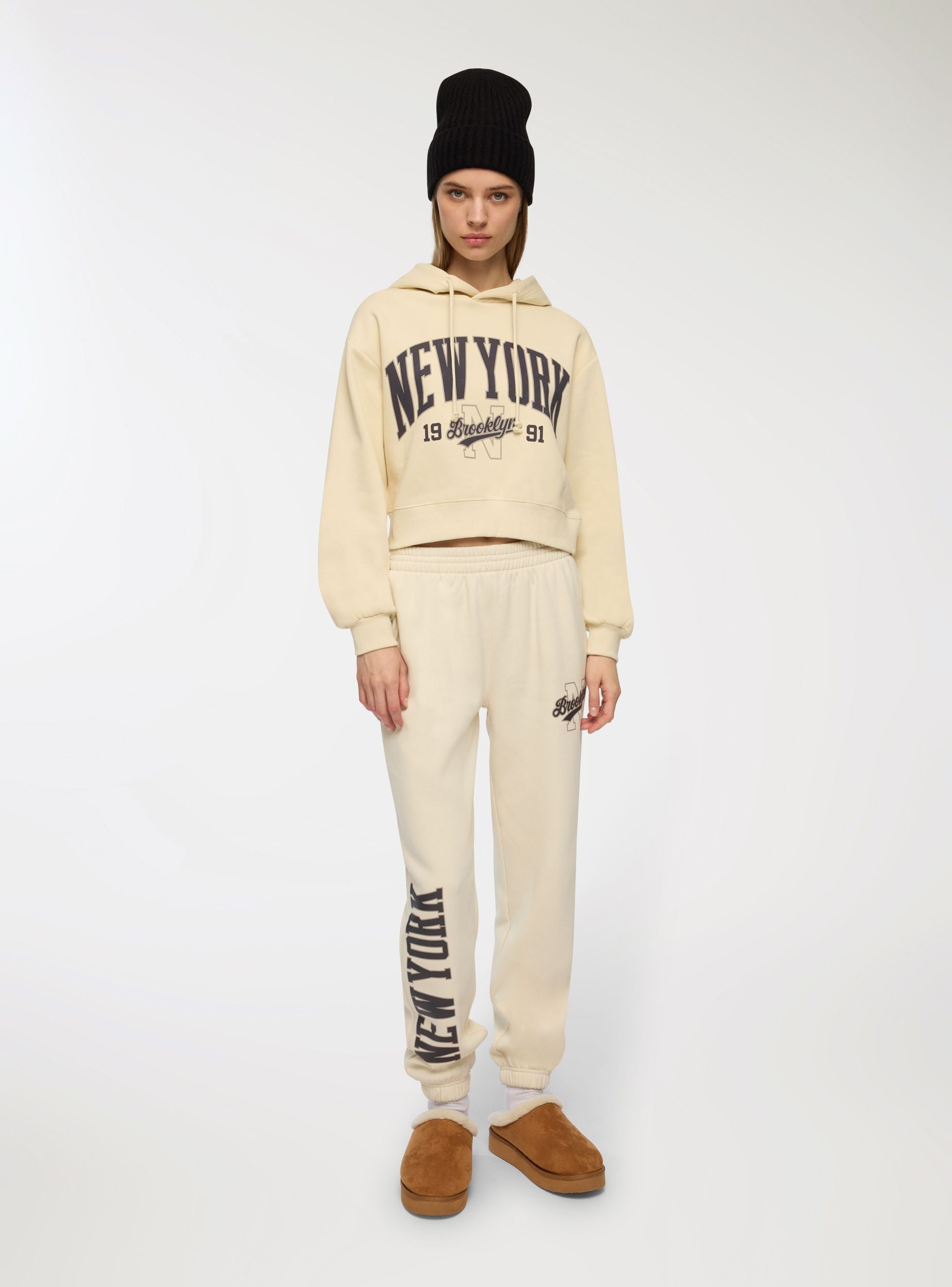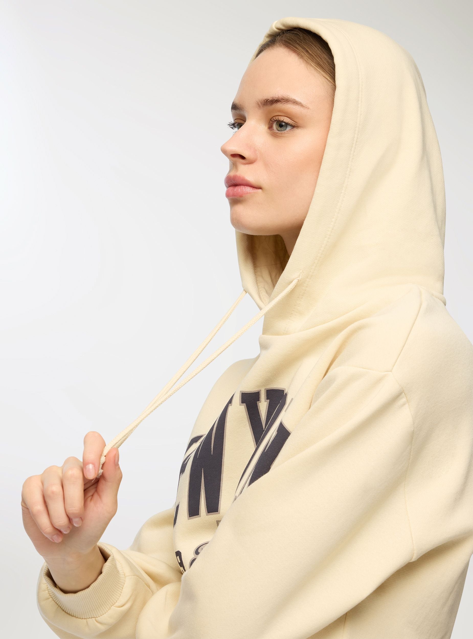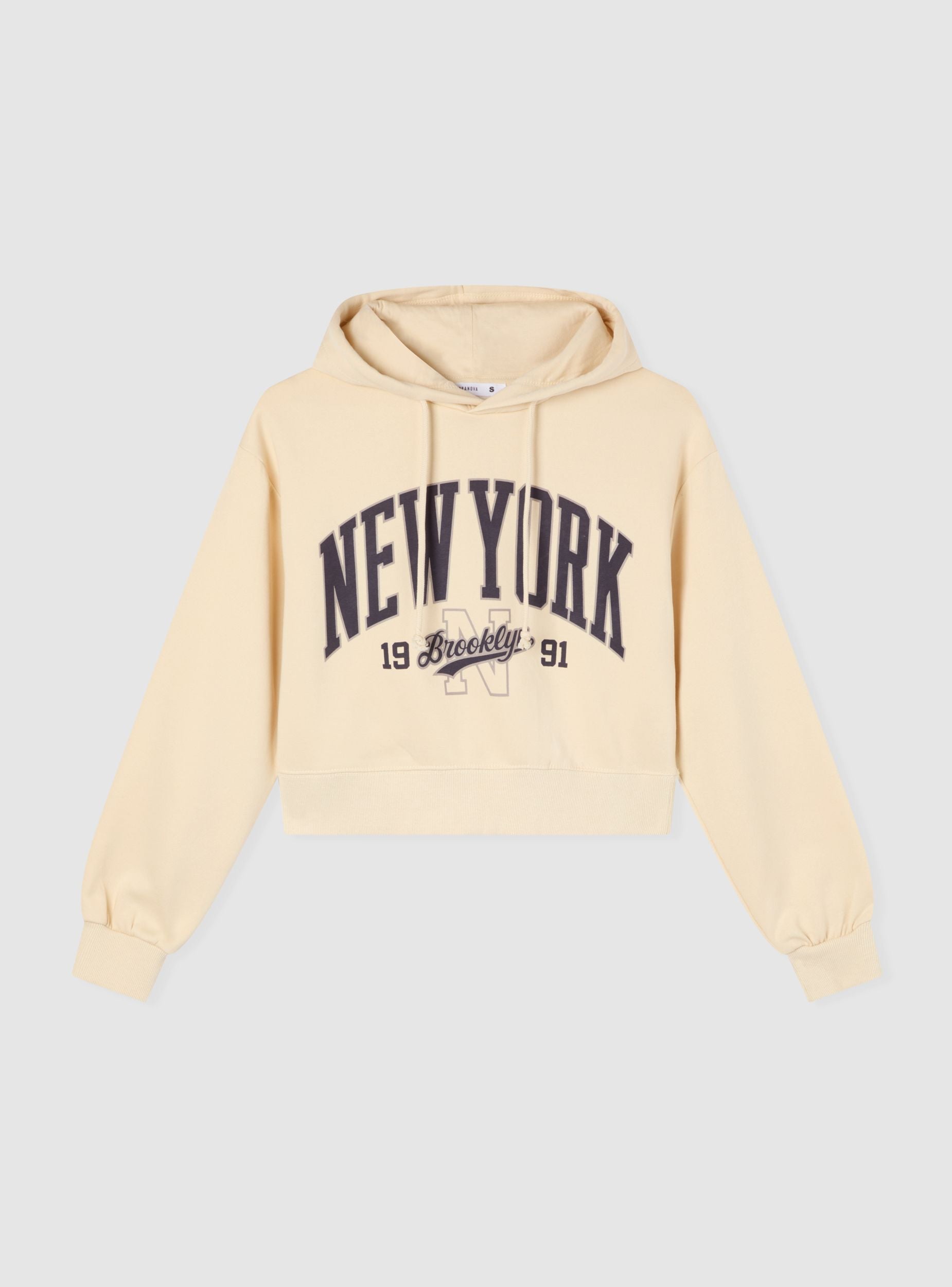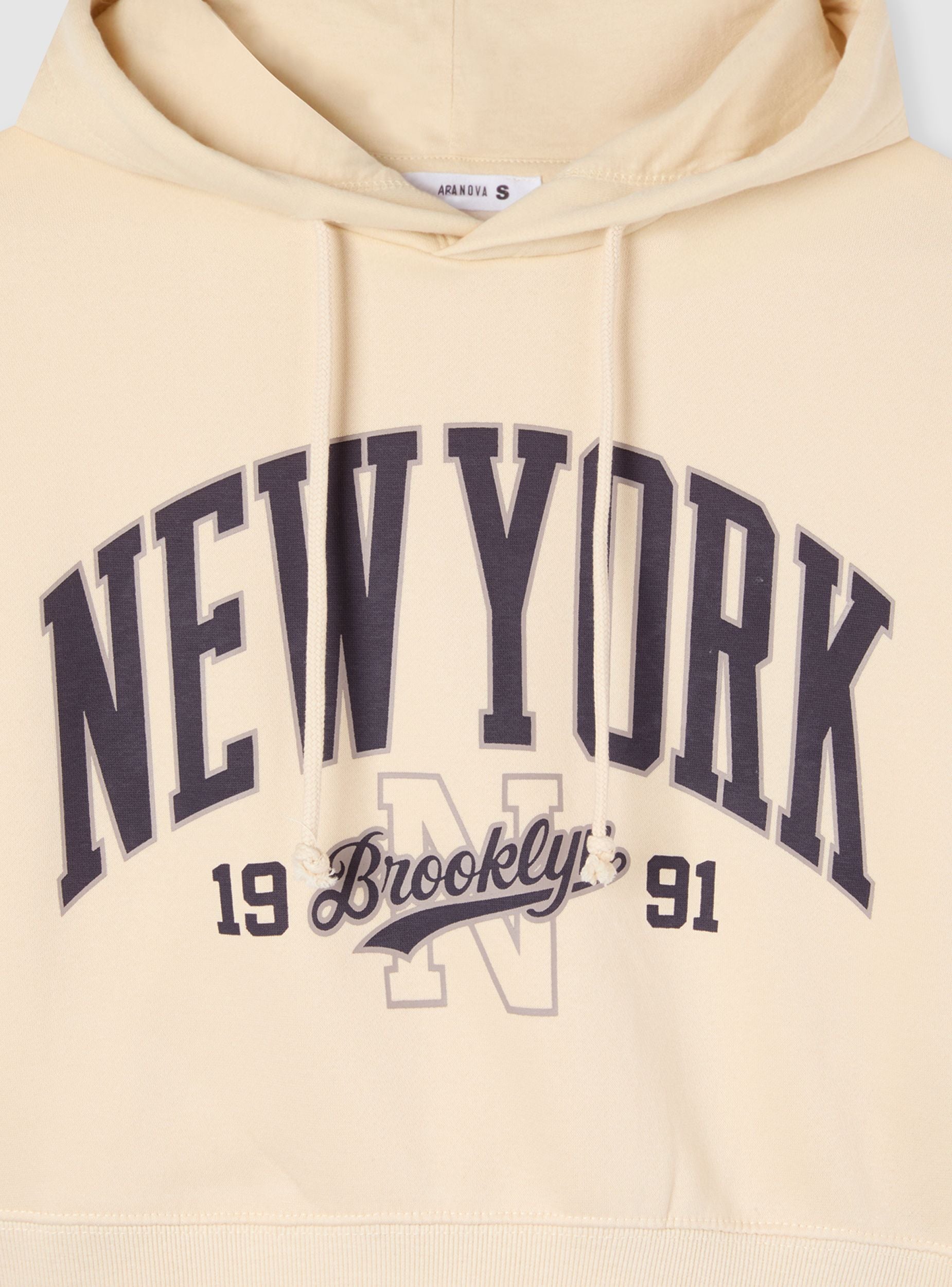 Felpa pesante da donna con cappuccio regolabile con coulisse e stampa in stile college americano sul davanti. Il modello cropped con fondo e polsi a costine valorizza la silhouette e dona un tocco sportivo al look. Ideale per affrontare le giornate più fredde con stile e comfort. Perfetta con jeans, joggers o leggings per outfit casual d’ispirazione urban, comodi e di tendenza.