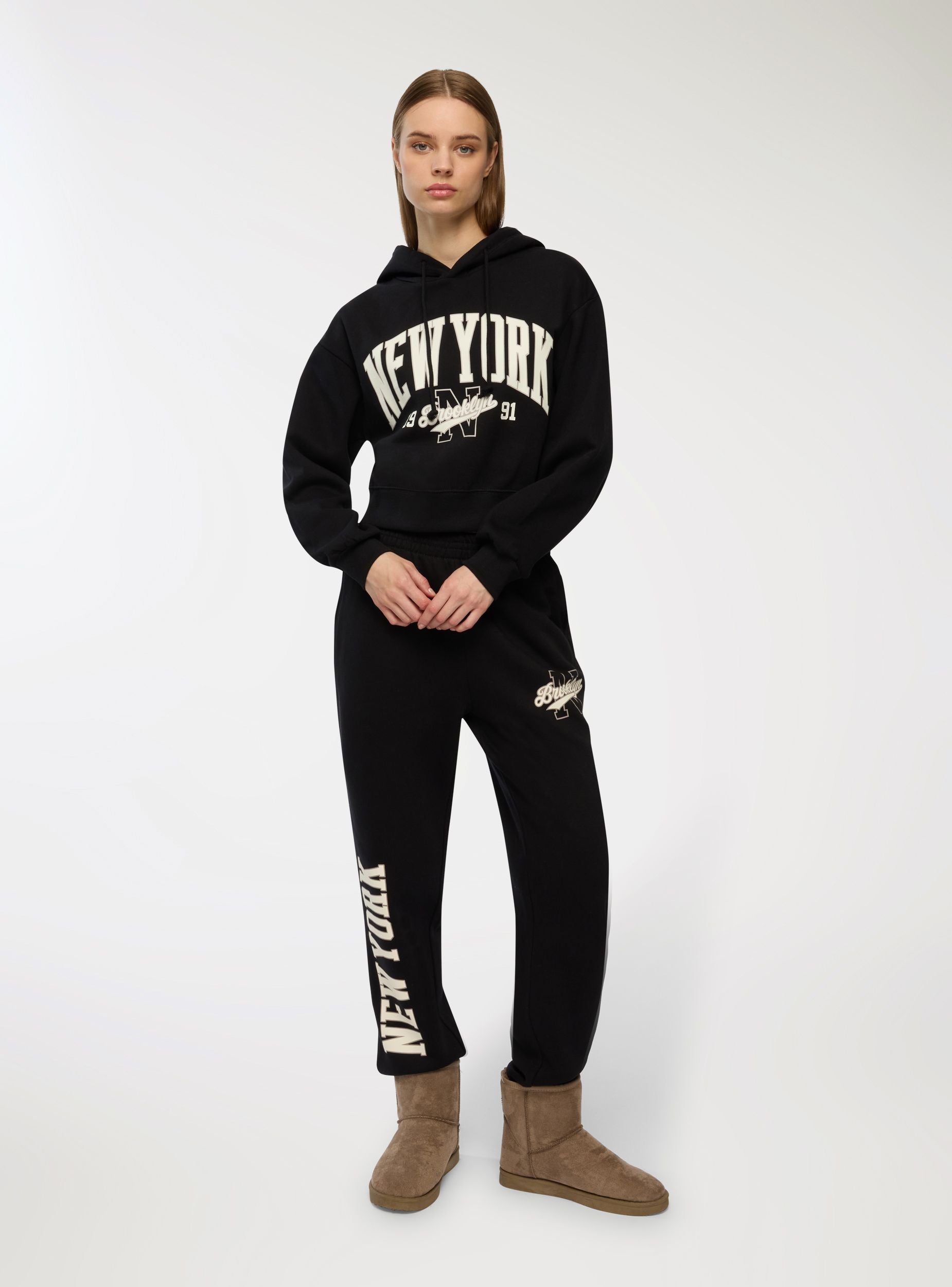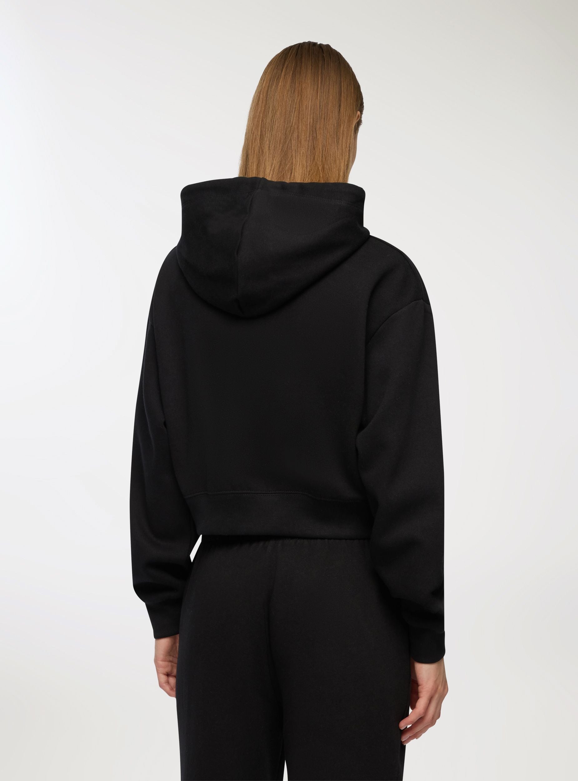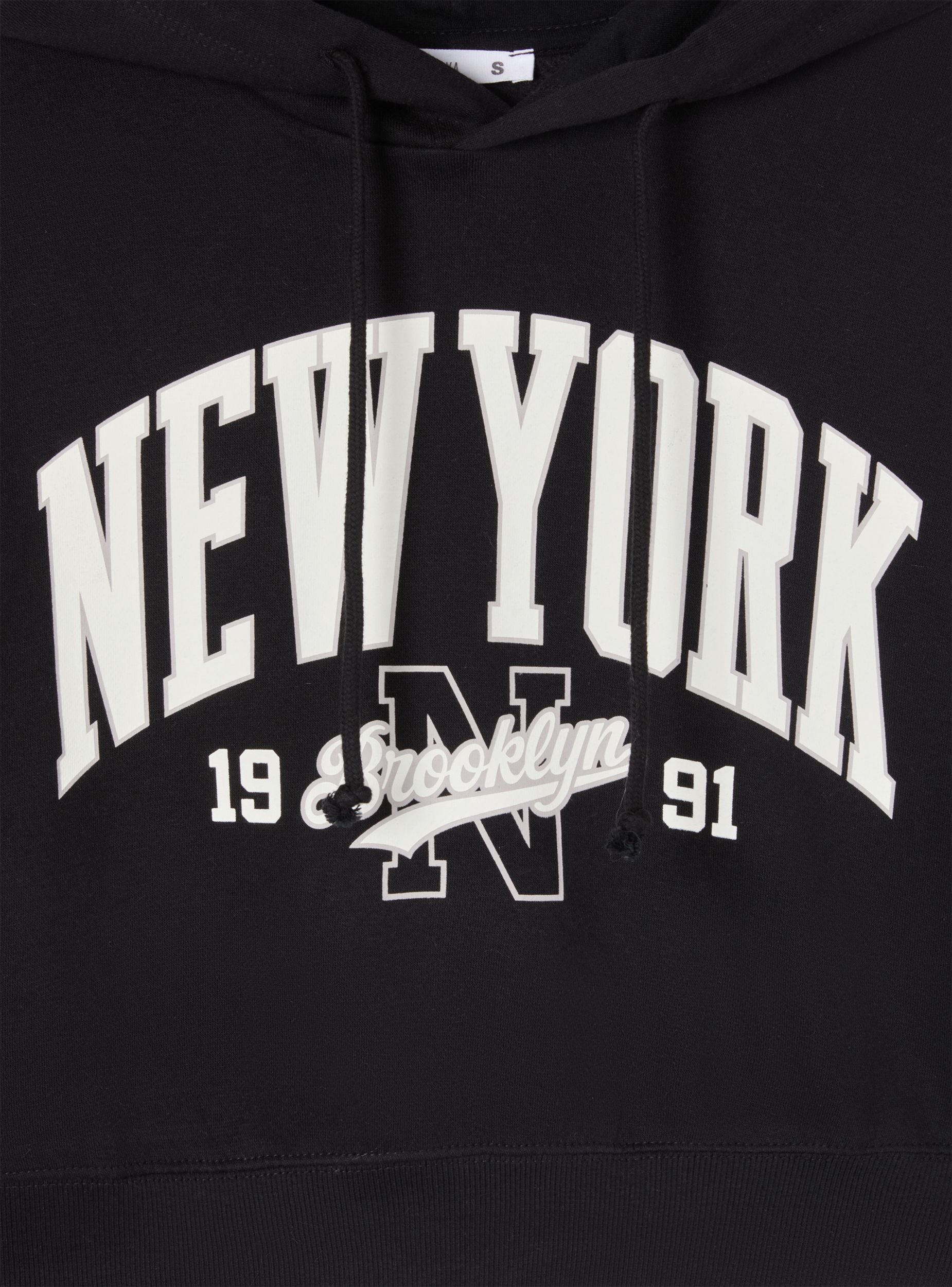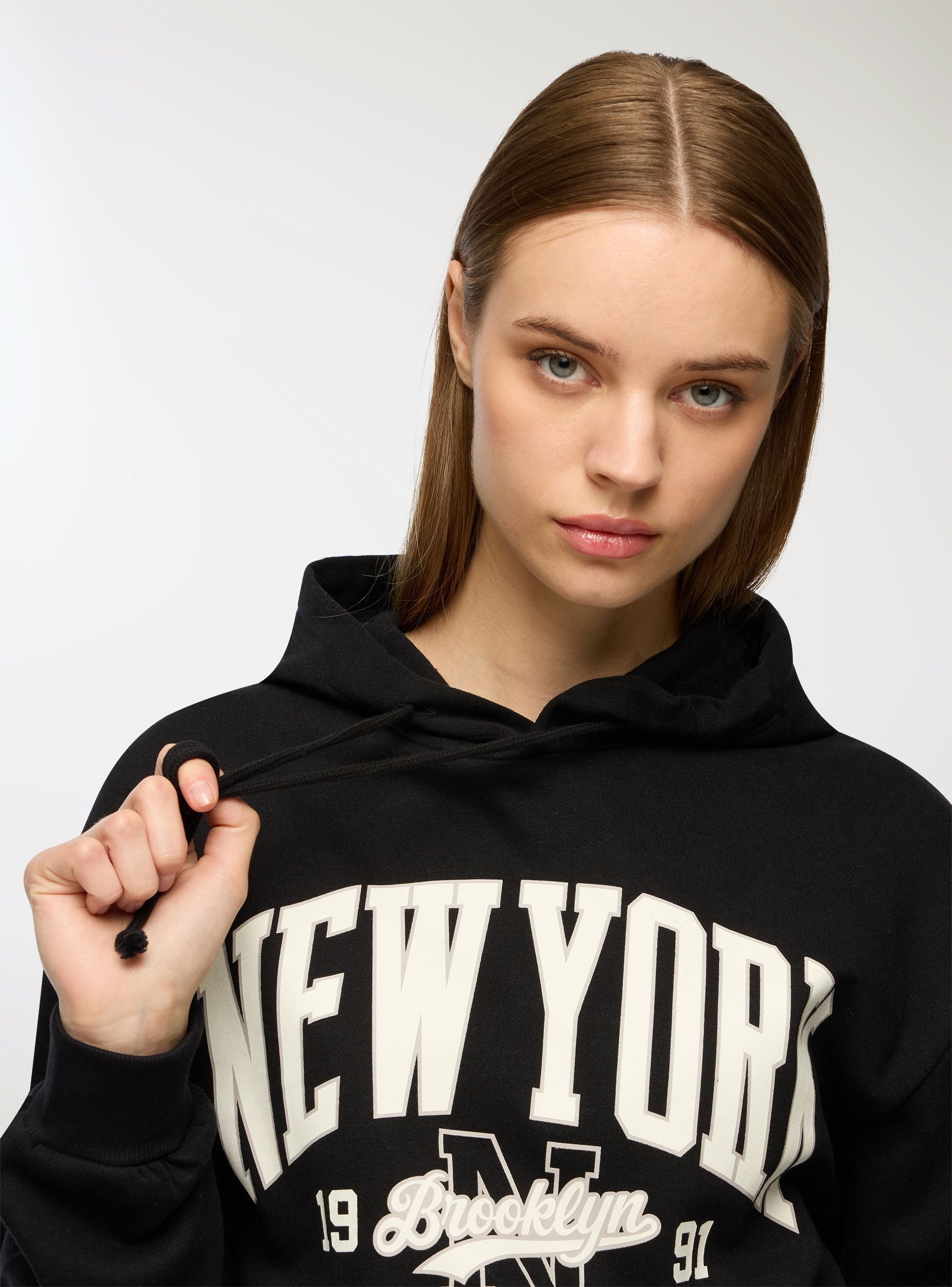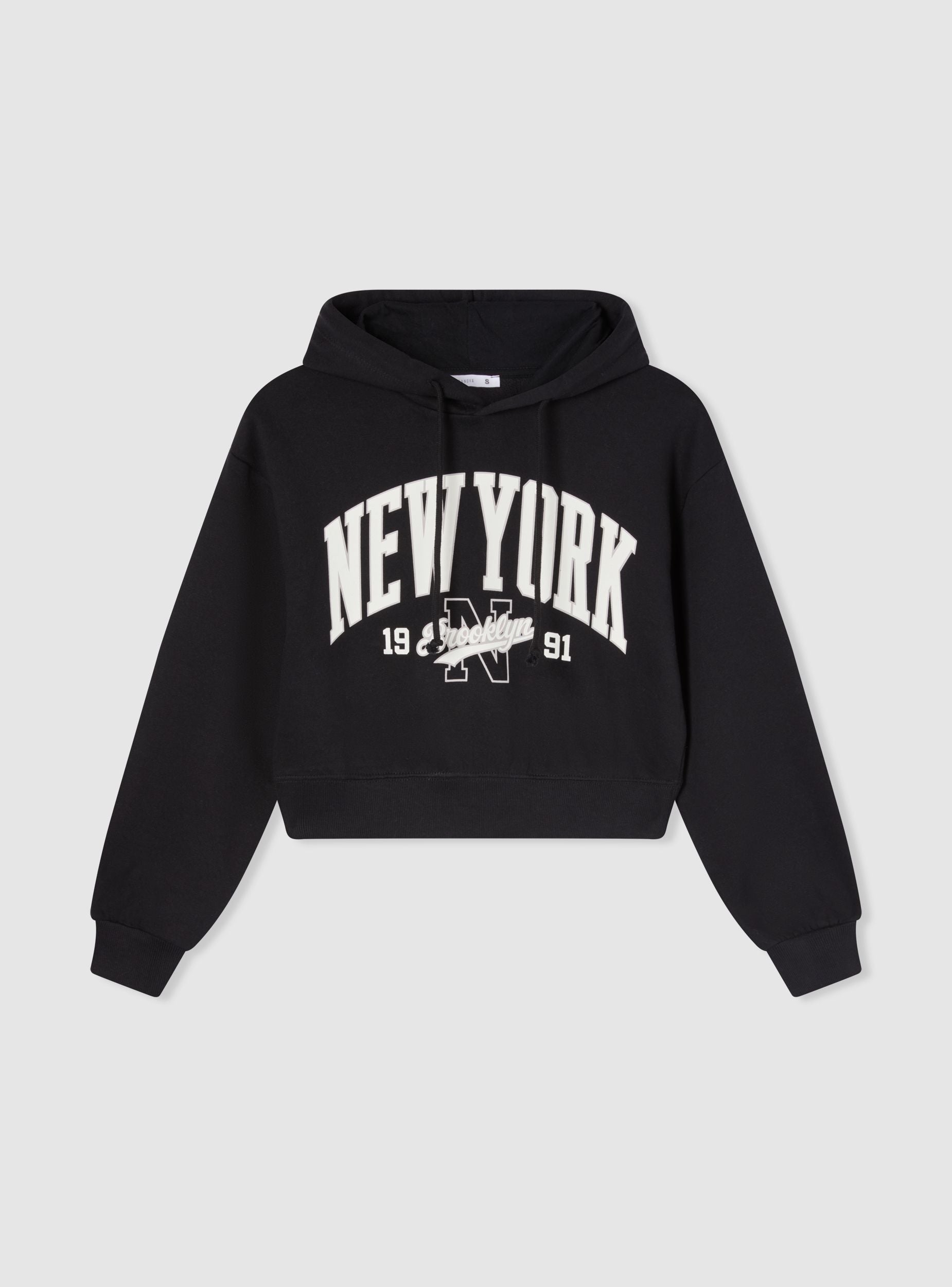 Felpa pesante da donna con cappuccio regolabile con coulisse e stampa in stile college americano sul davanti. Il modello cropped con fondo e polsi a costine valorizza la silhouette e dona un tocco sportivo al look. Ideale per affrontare le giornate più fredde con stile e comfort. Perfetta con jeans, joggers o leggings per outfit casual d’ispirazione urban, comodi e di tendenza.
