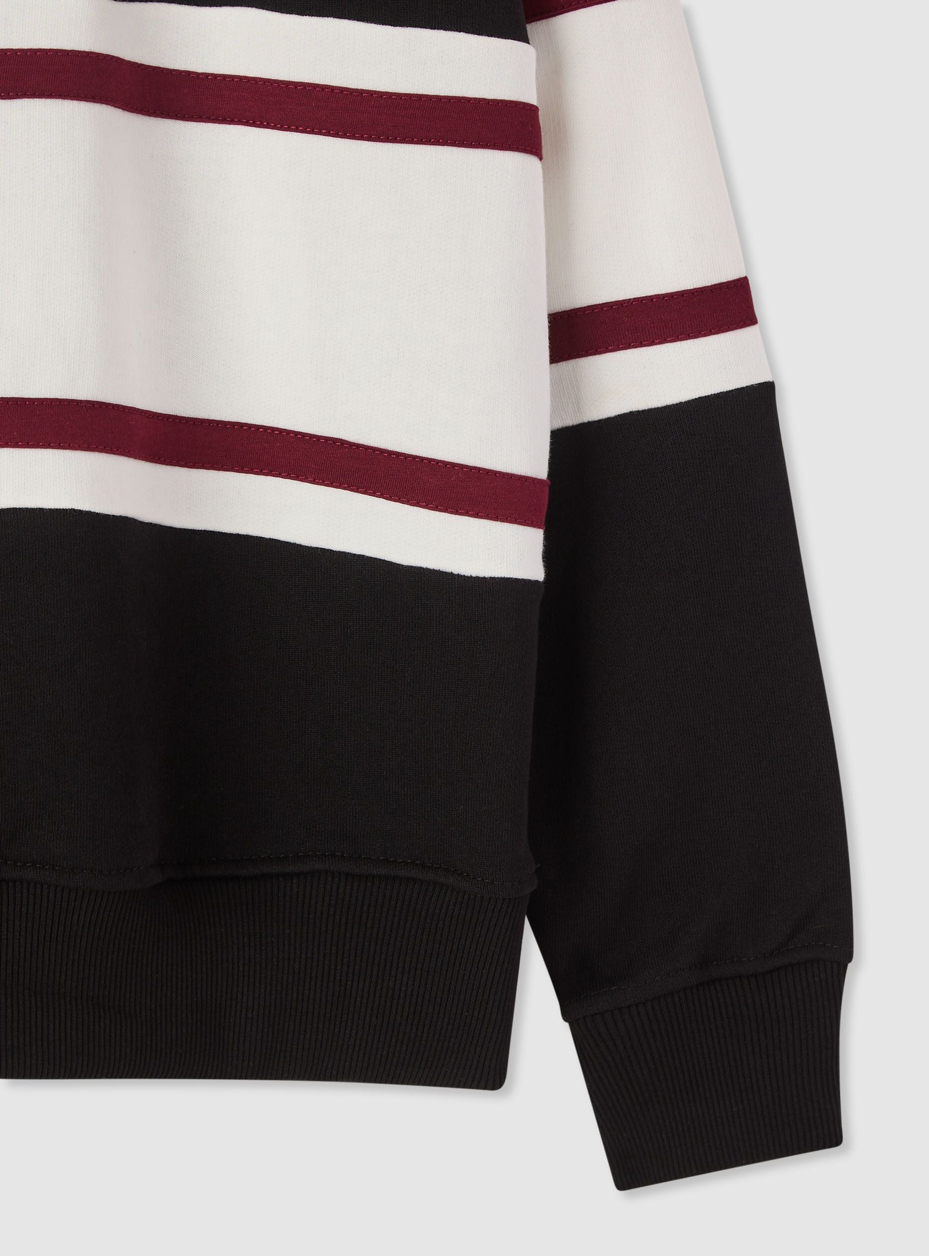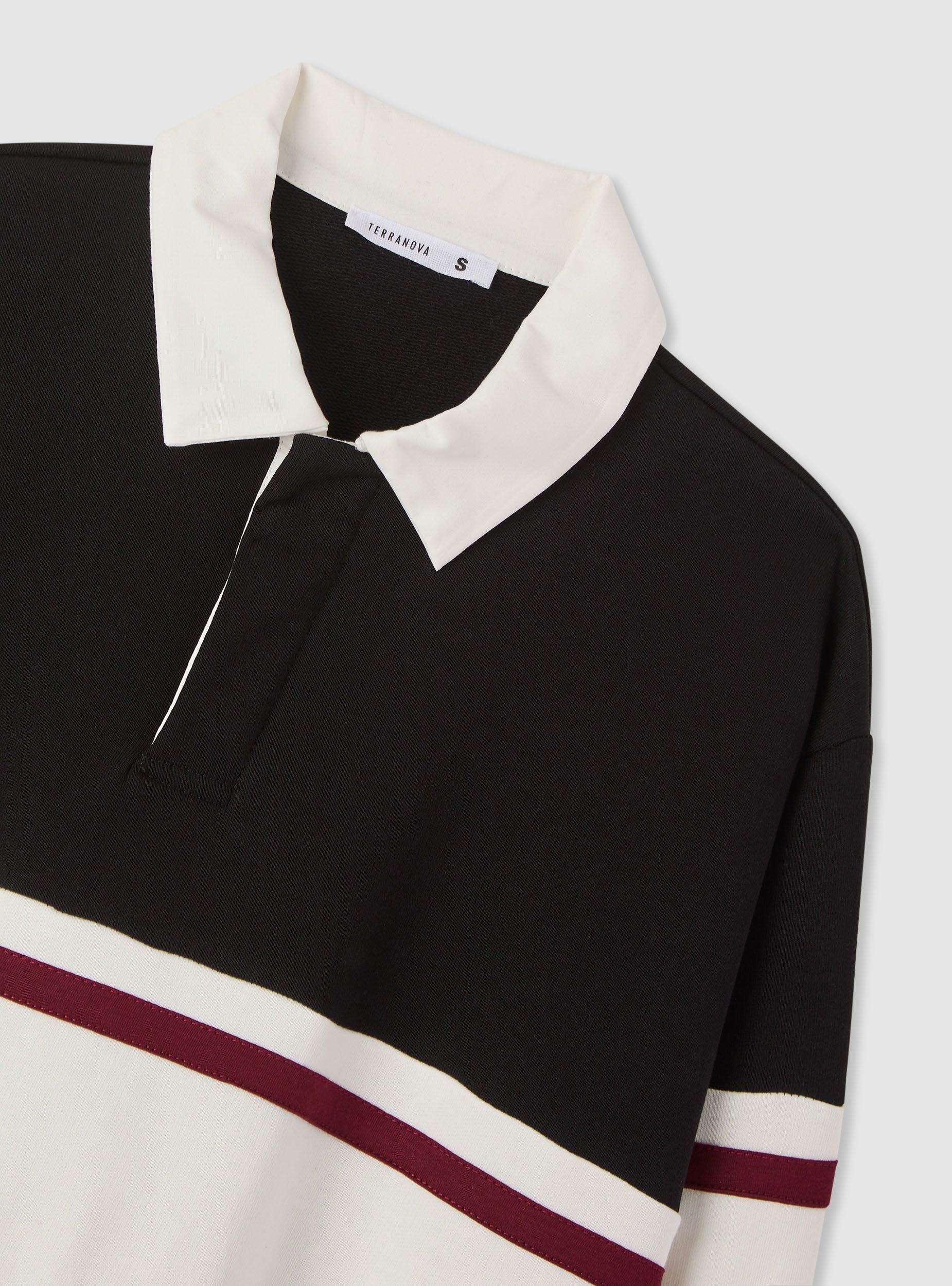 Felpa da donna con collo polo. Design block color a righe orizzontali con inserti a contrasto, polsini e fondo a coste per una vestibilità confortevole. Ideale per look casual e urban, perfetta con jeans o pantaloni jogger. Maniche lunghe e vestibilità regular offrono libertà di movimento, mentre il motivo a righe aggiunge un tocco sporty-chic per il tempo libero e le uscite in città.