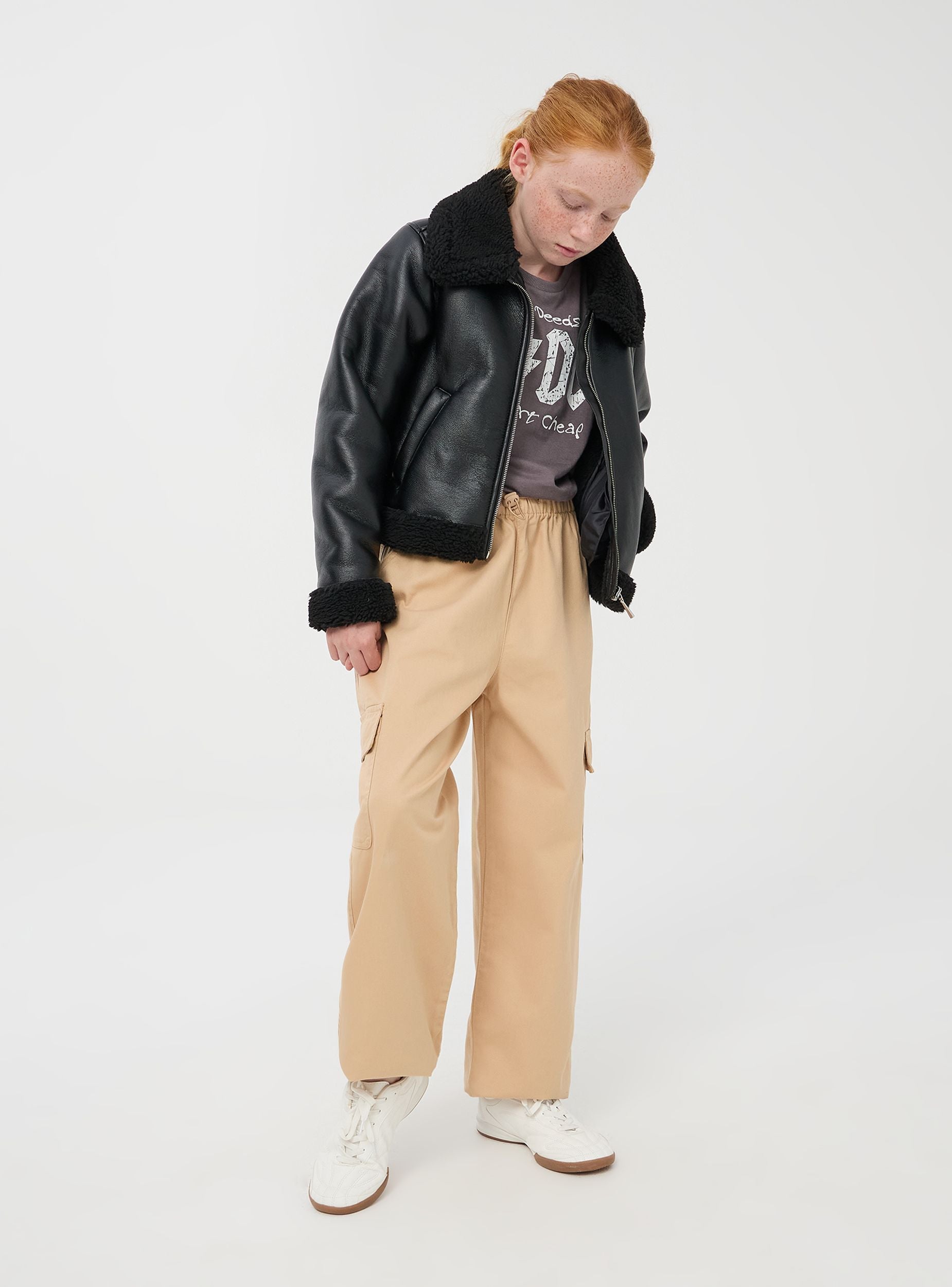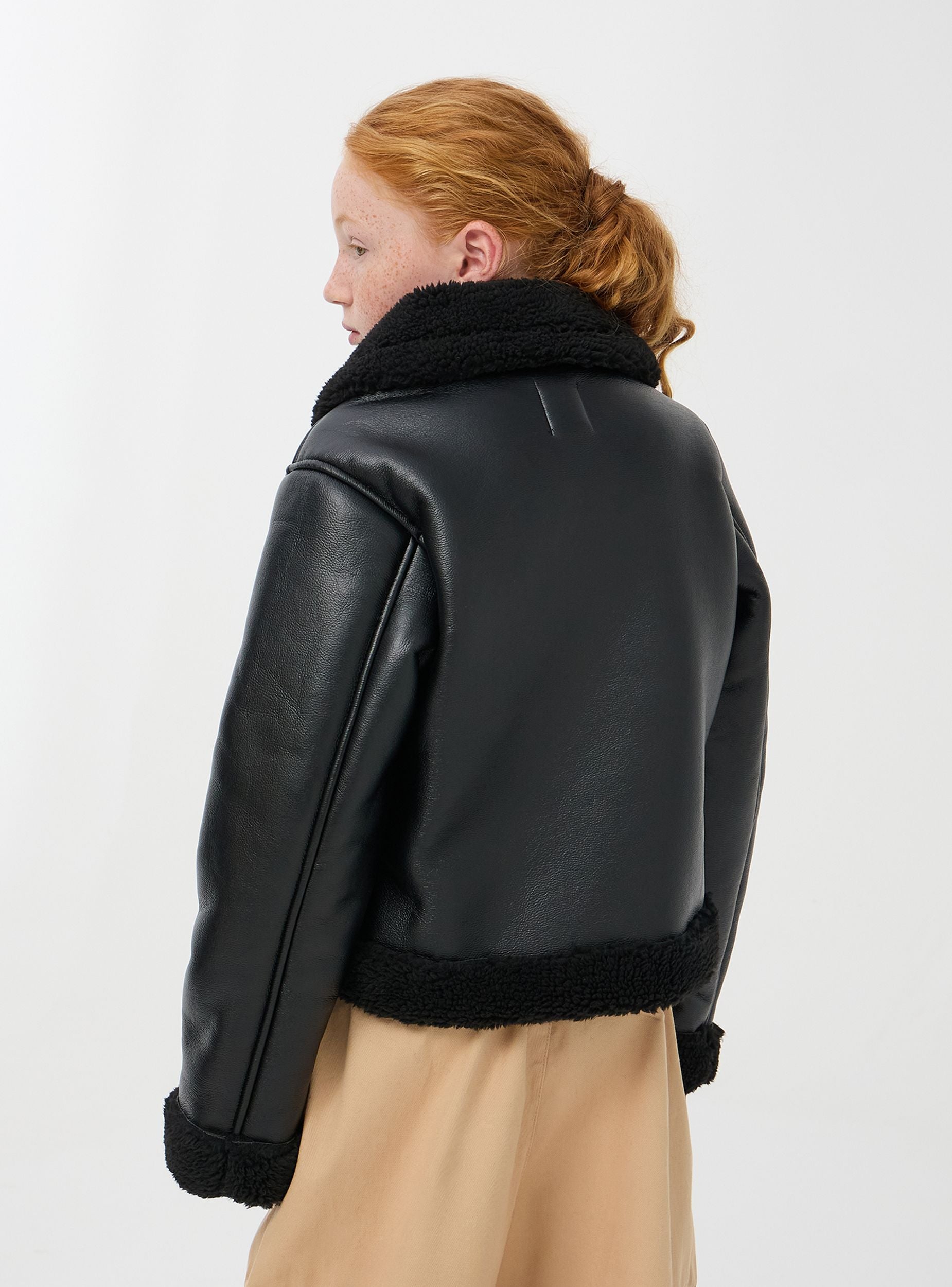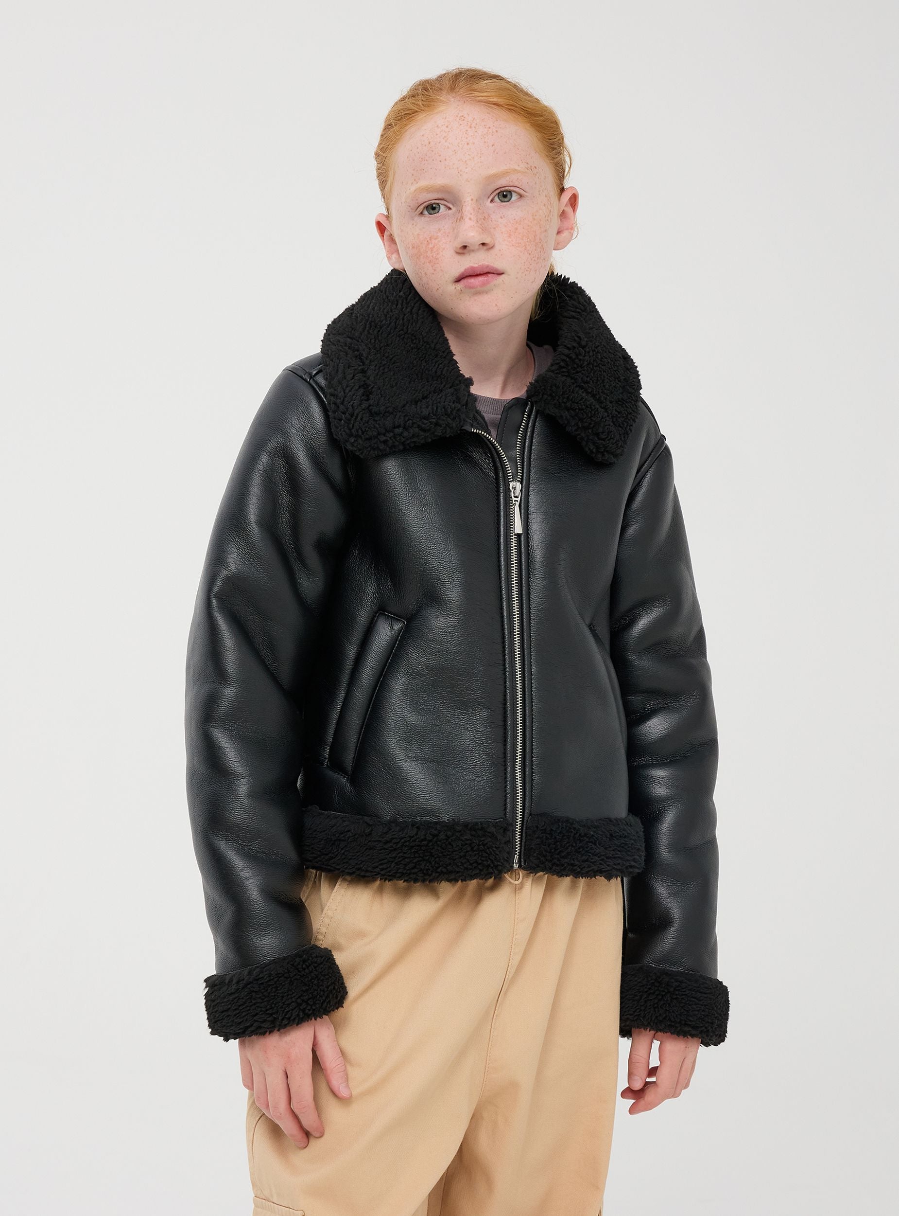 Questa giacca nera effetto pelle da bambina è il capo perfetto per aggiungere un tocco di stile all'outfit. Dotata di una zip centrale, tasche laterali e un colletto in pelliccia sintetica presenta rifiniture in pelliccia sintetica anche sui polsini e sull'orlo inferiore. Con una vestibilità regolare, è ideale per occasioni casual e urbane.