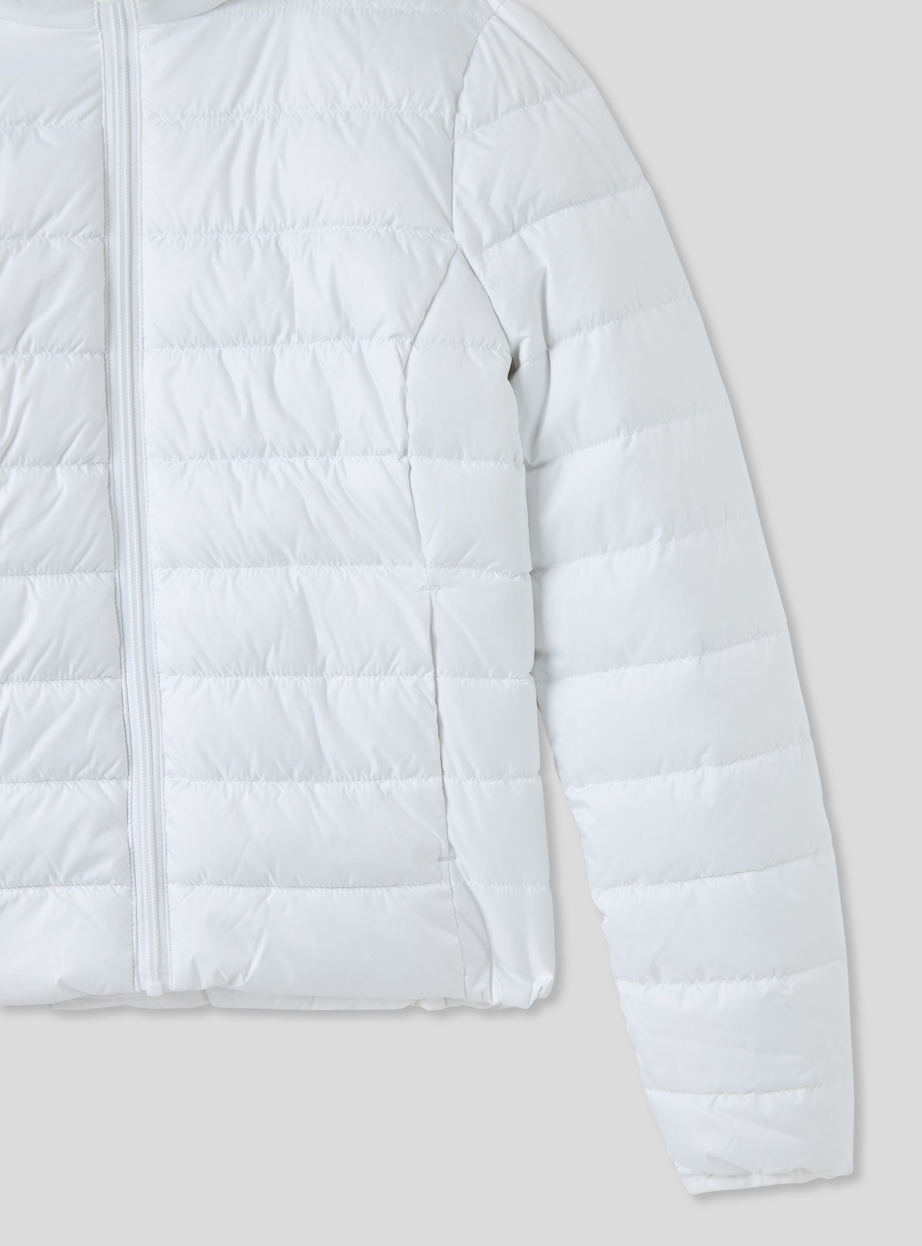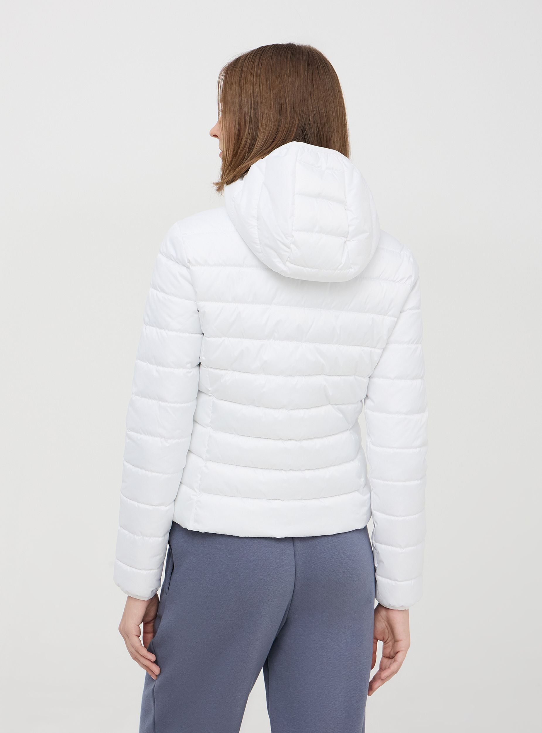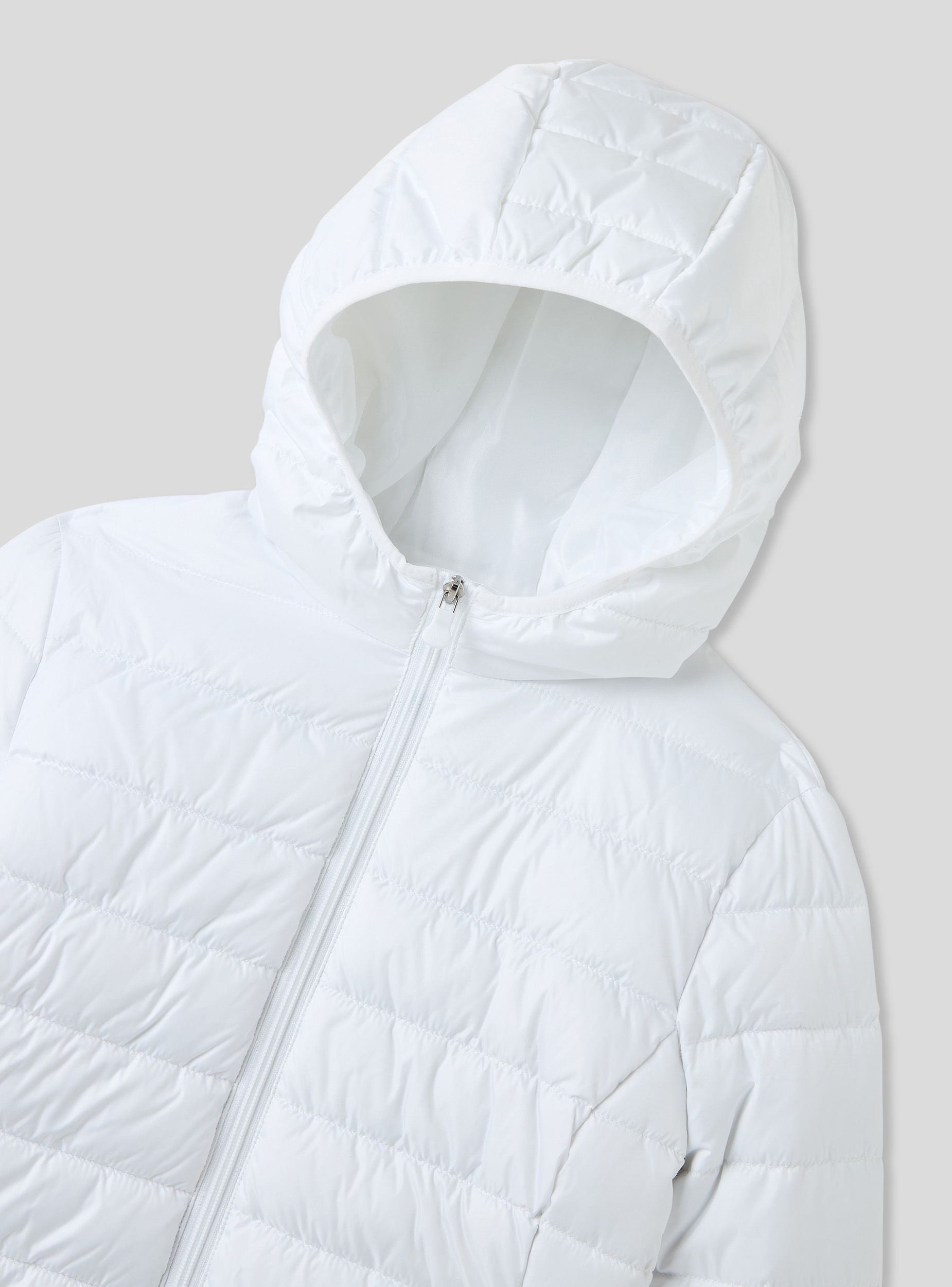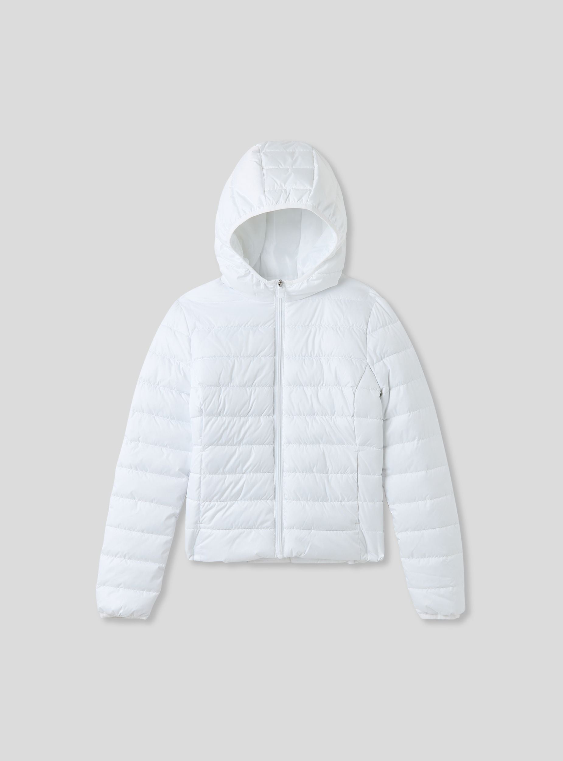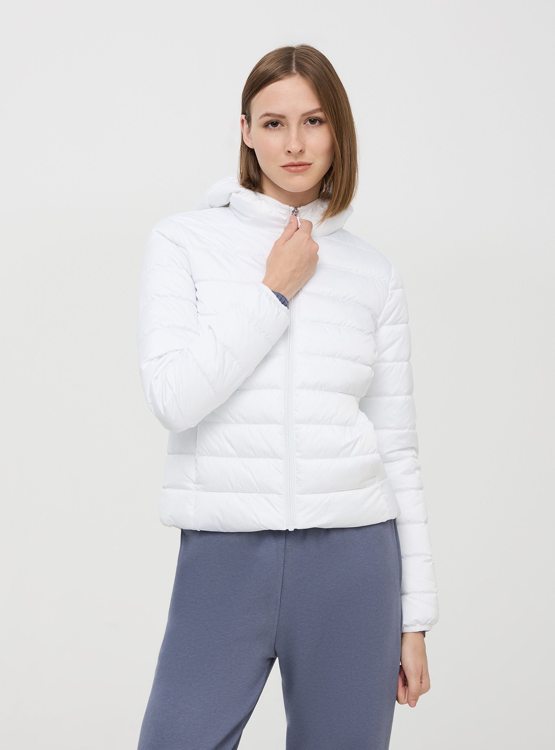 Giubbotto da donna in nylon tinta unita con imbottitura leggera, modello con cappuccio, chiusura con zip e tirazip tono su tono. Tasche a filetto con bottone a pressione e fondo manica con elastico. Vestibilità slim. Perfetto per le stagioni intermedie, capo versatile e funzionale.Dettagli