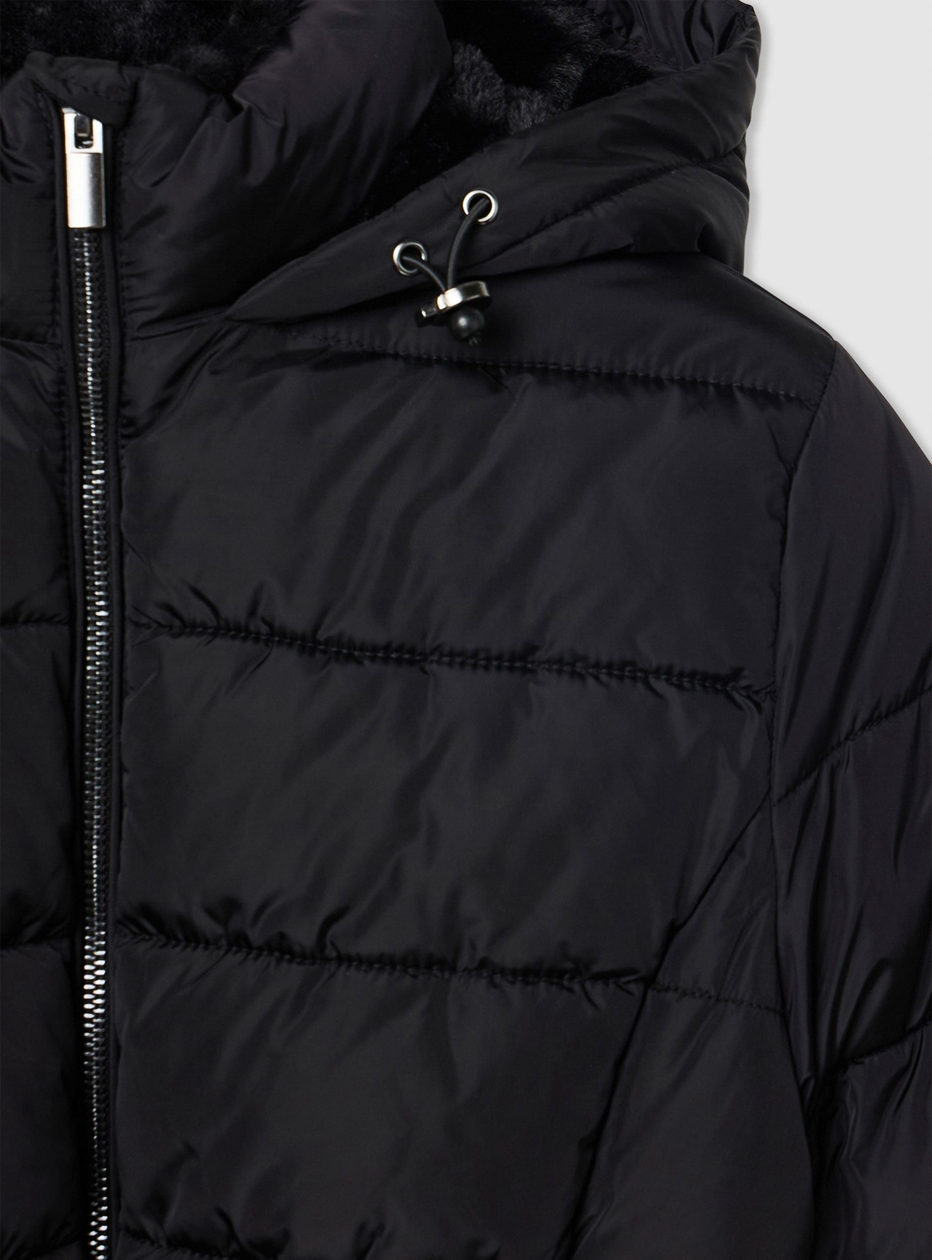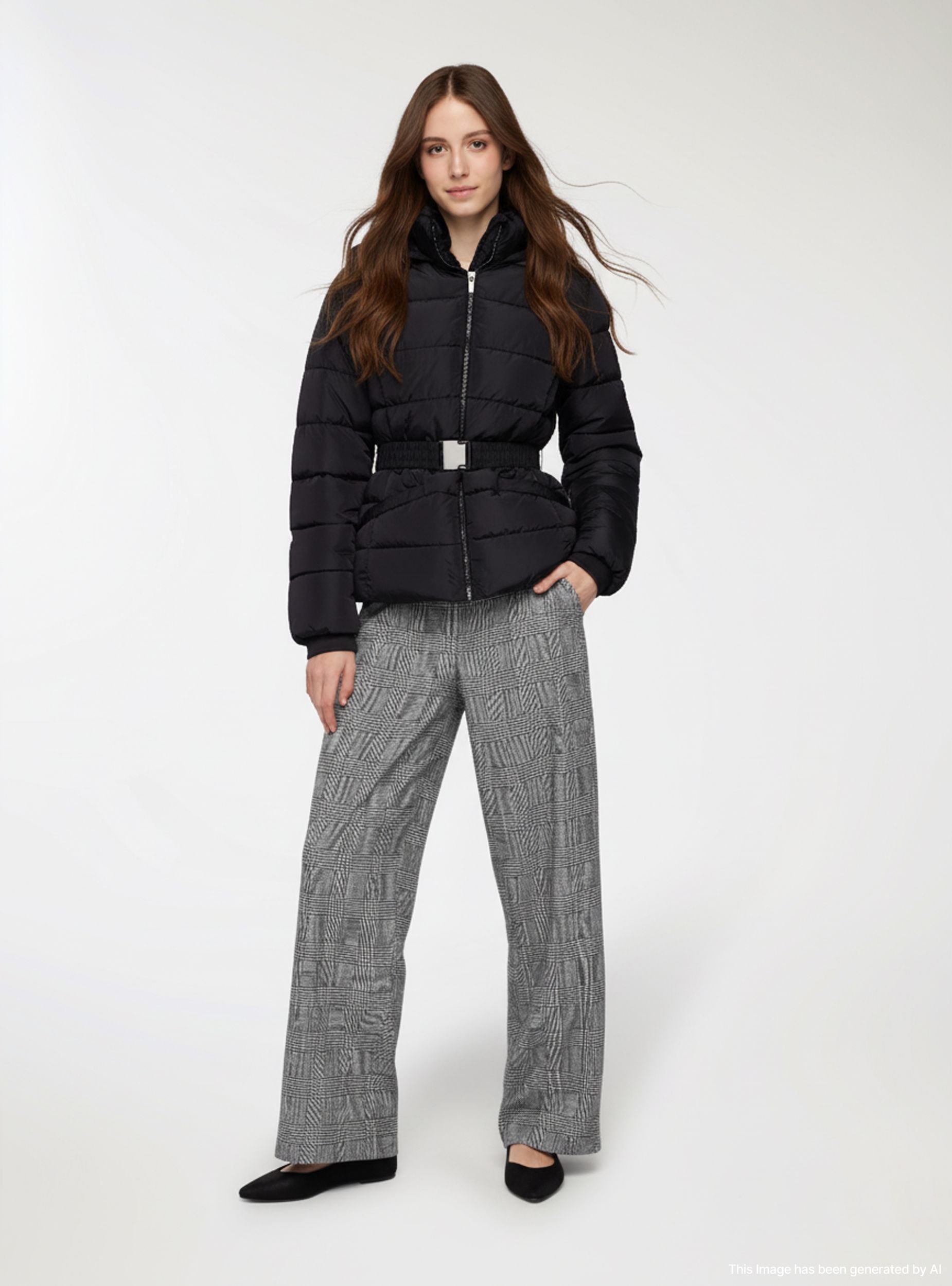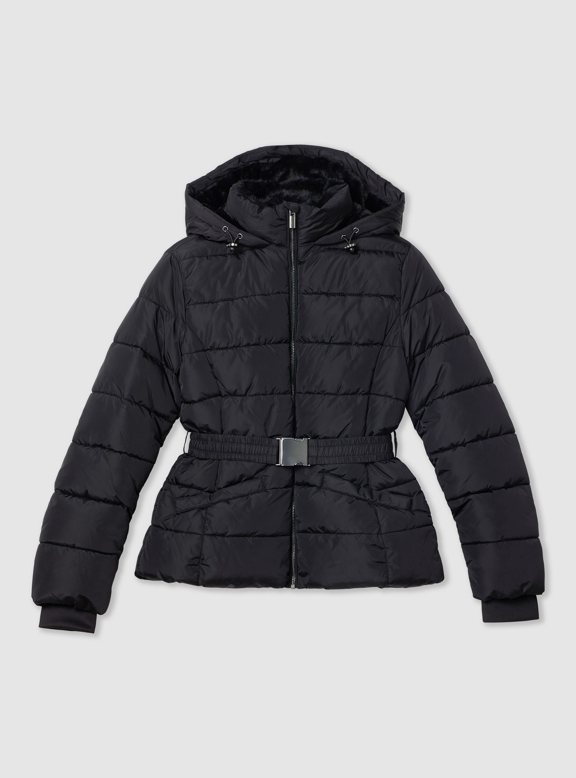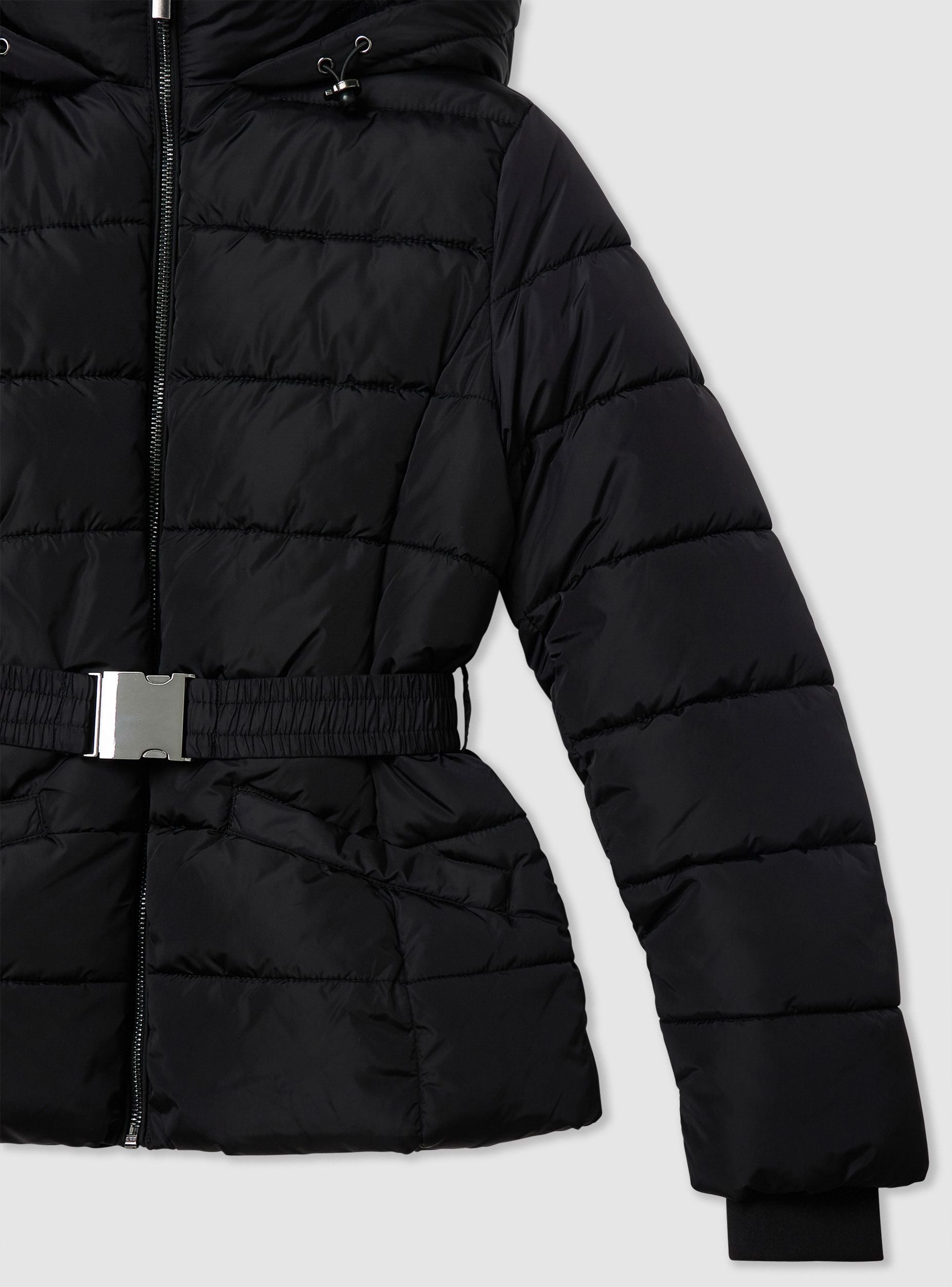 Imbottito da donna con cappuccio regolabile e zip frontale. Trapuntato con cintura in vita con fibbia metallica per definire la silhouette e polsini a costine. Tasche laterali. Ideale per la città e il tempo libero nelle giornate fredde, si abbina a jeans, maglione e stivali per un look curato.