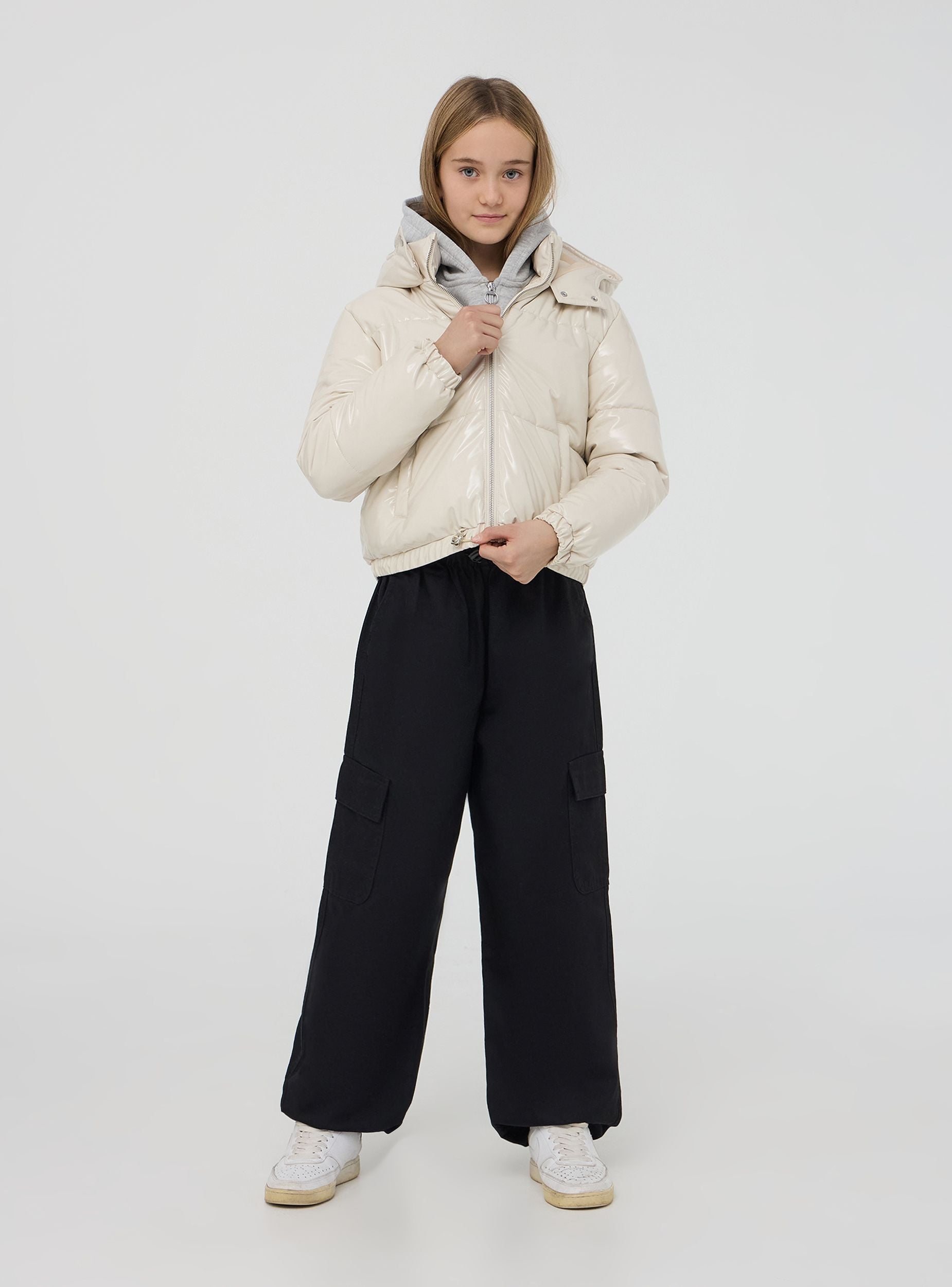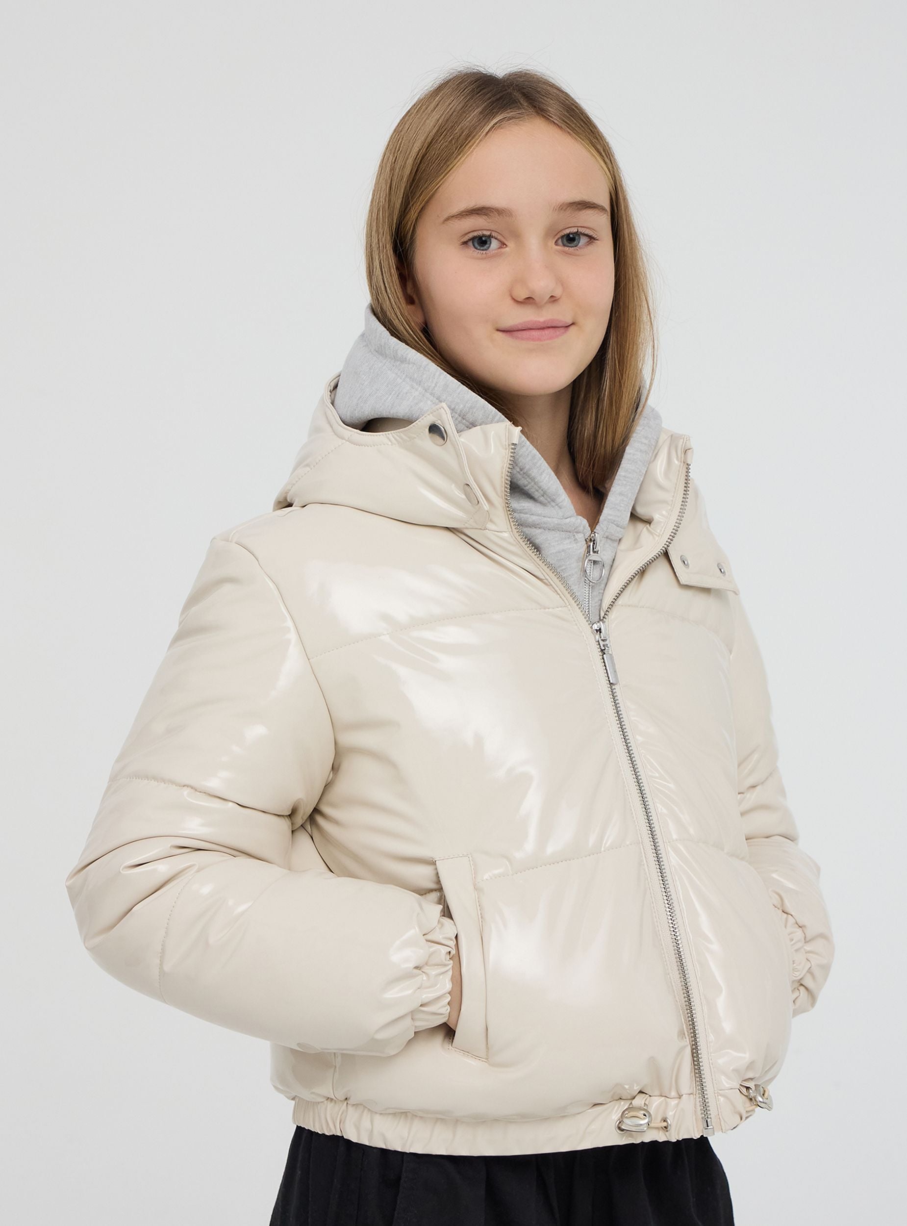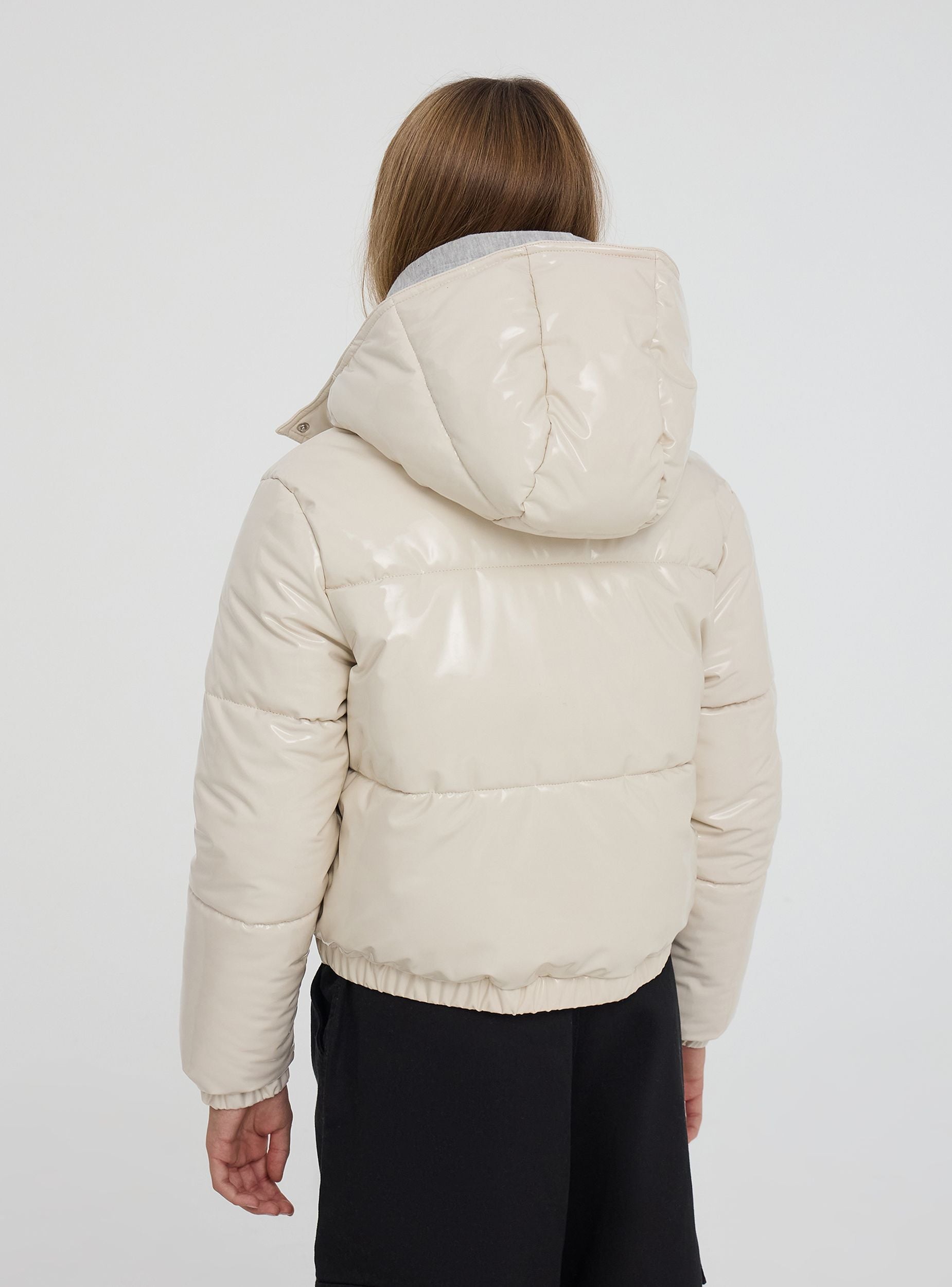 Giubbotto crop imbottito da bambina. Perfetto per l'inverno, con un design che include un cappuccio e dettagli funzionali come elastici con stopper per una migliore vestibilità e protezione. Chiusura frontale con zip, collo alto con bottoni per una maggior protezione contro il freddo. La finitura è lucida, effetto vinile, dando un aspetto moderno e alla moda.