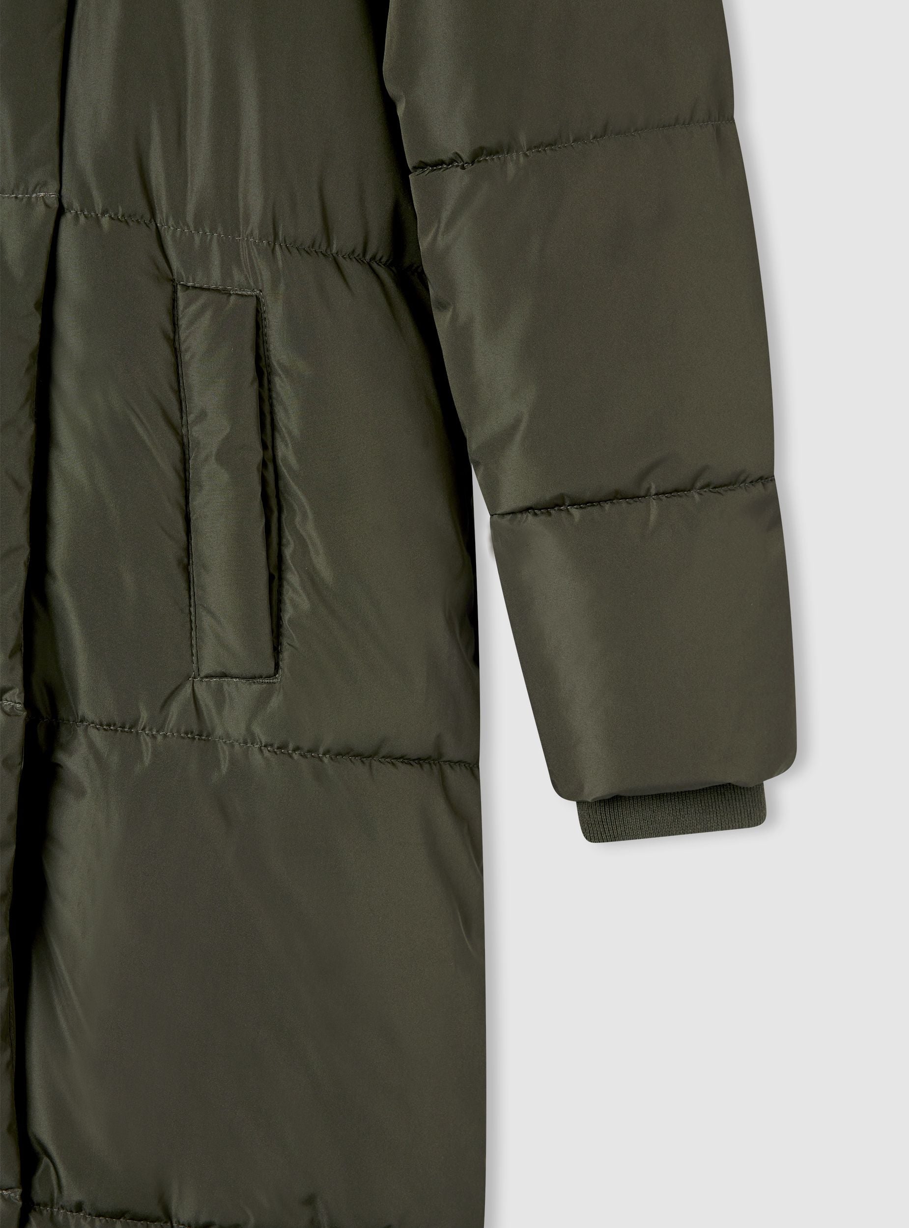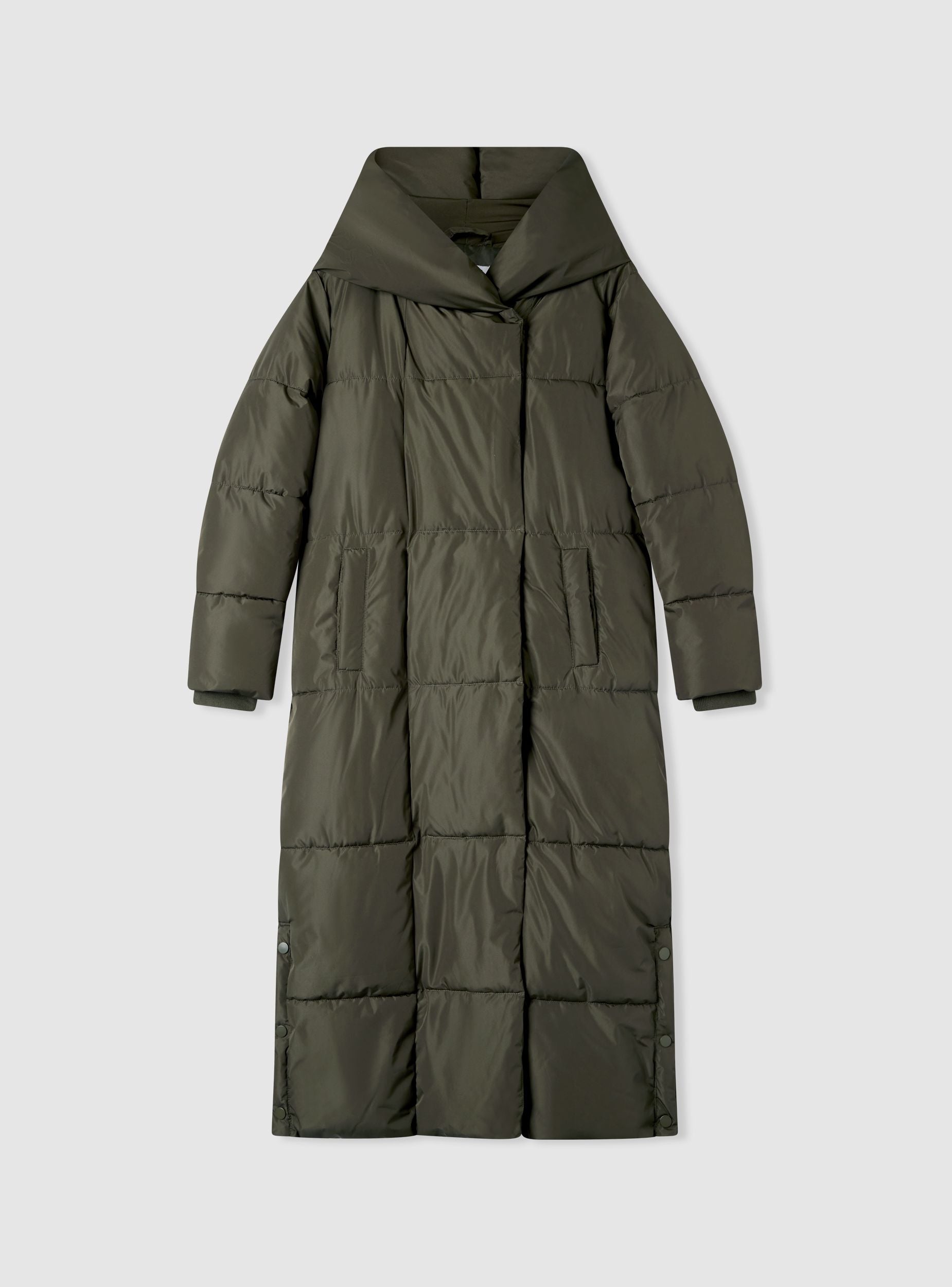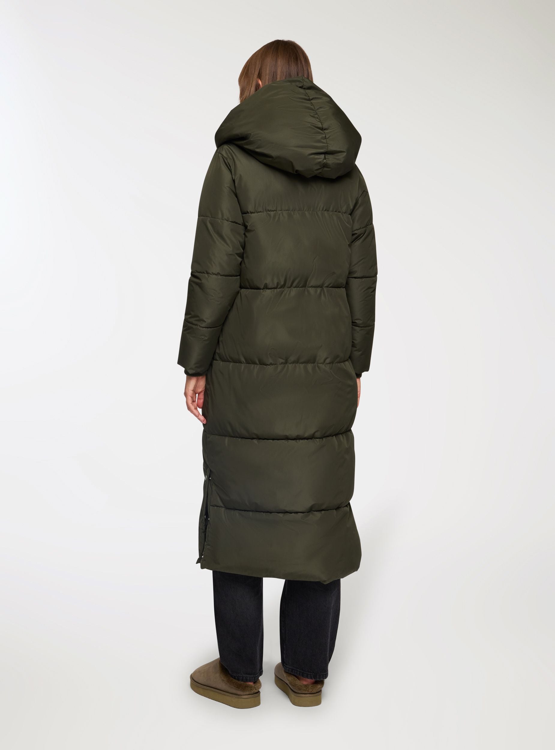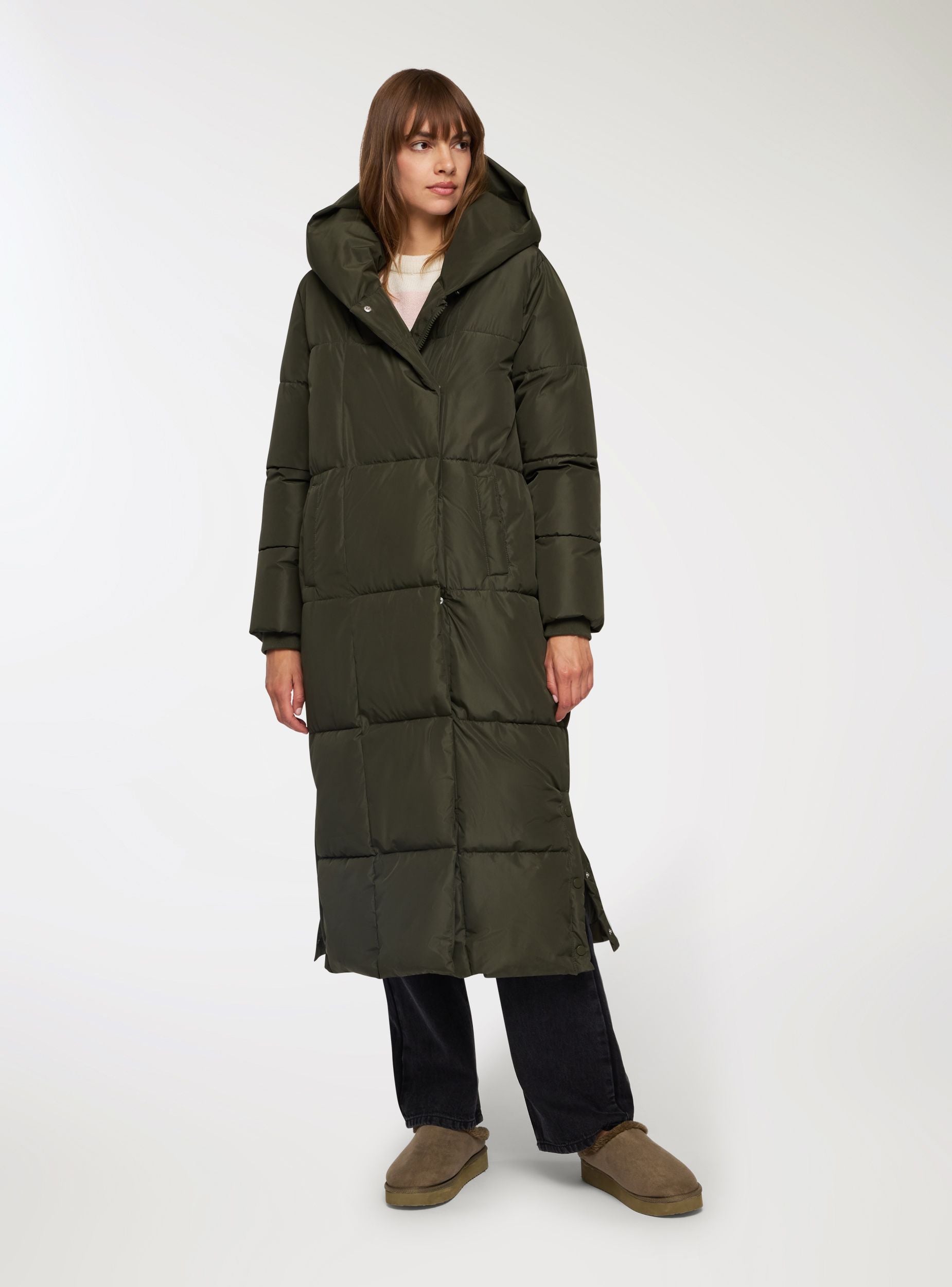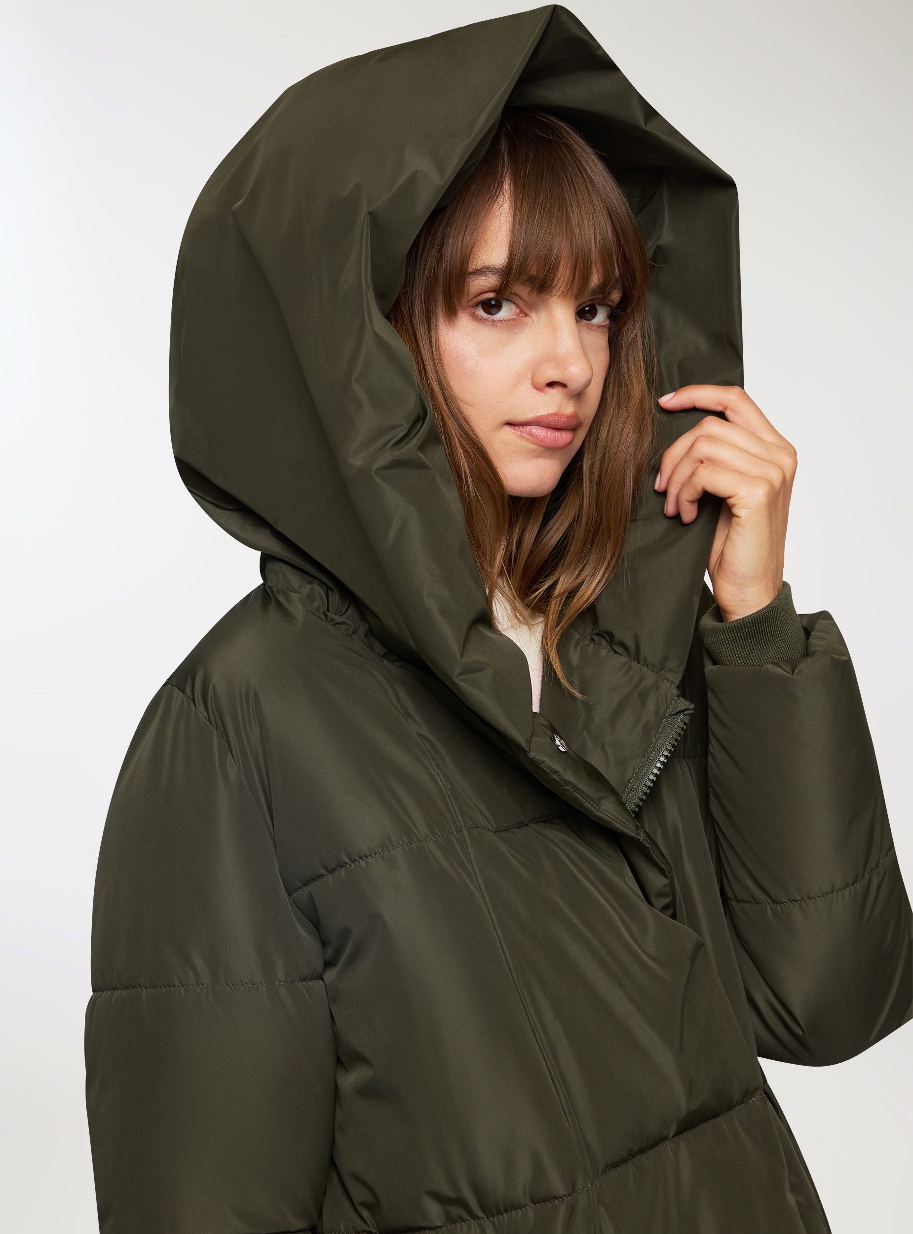 Giubbotto imbottito da donna con cappuccio, ideale per affrontare le giornate fredde con stile. La lunghezza sotto al ginocchio offre una protezione ottimale, mentre il design trapuntato aggiunge un tocco moderno. Dotato di chiusura con zip e bottoni a pressione e pratiche tasche laterali, questo capo si abbina perfettamente a look casual e urbani. Perfetto per passeggiate invernali o per completare outfit comodi e caldi.