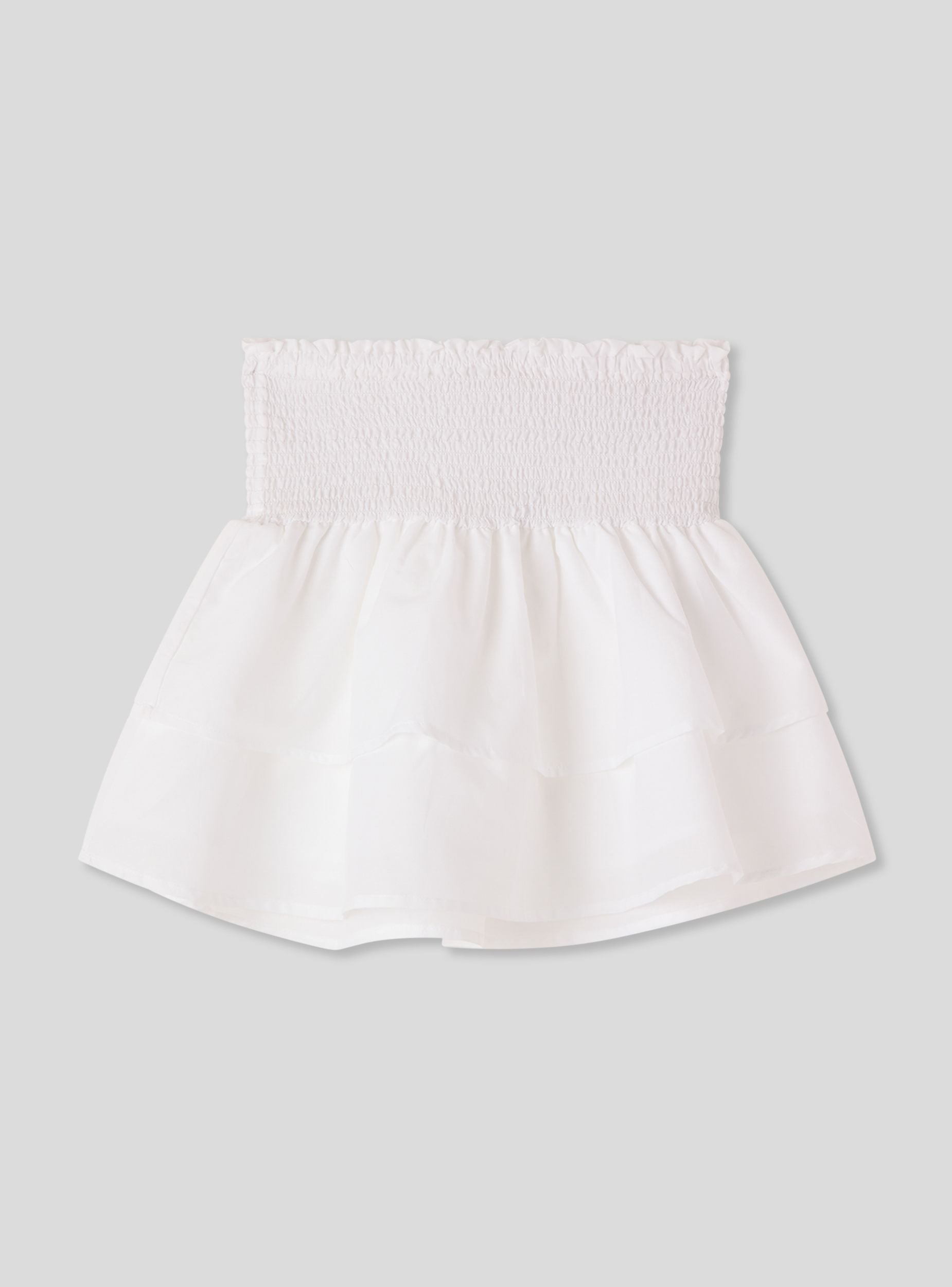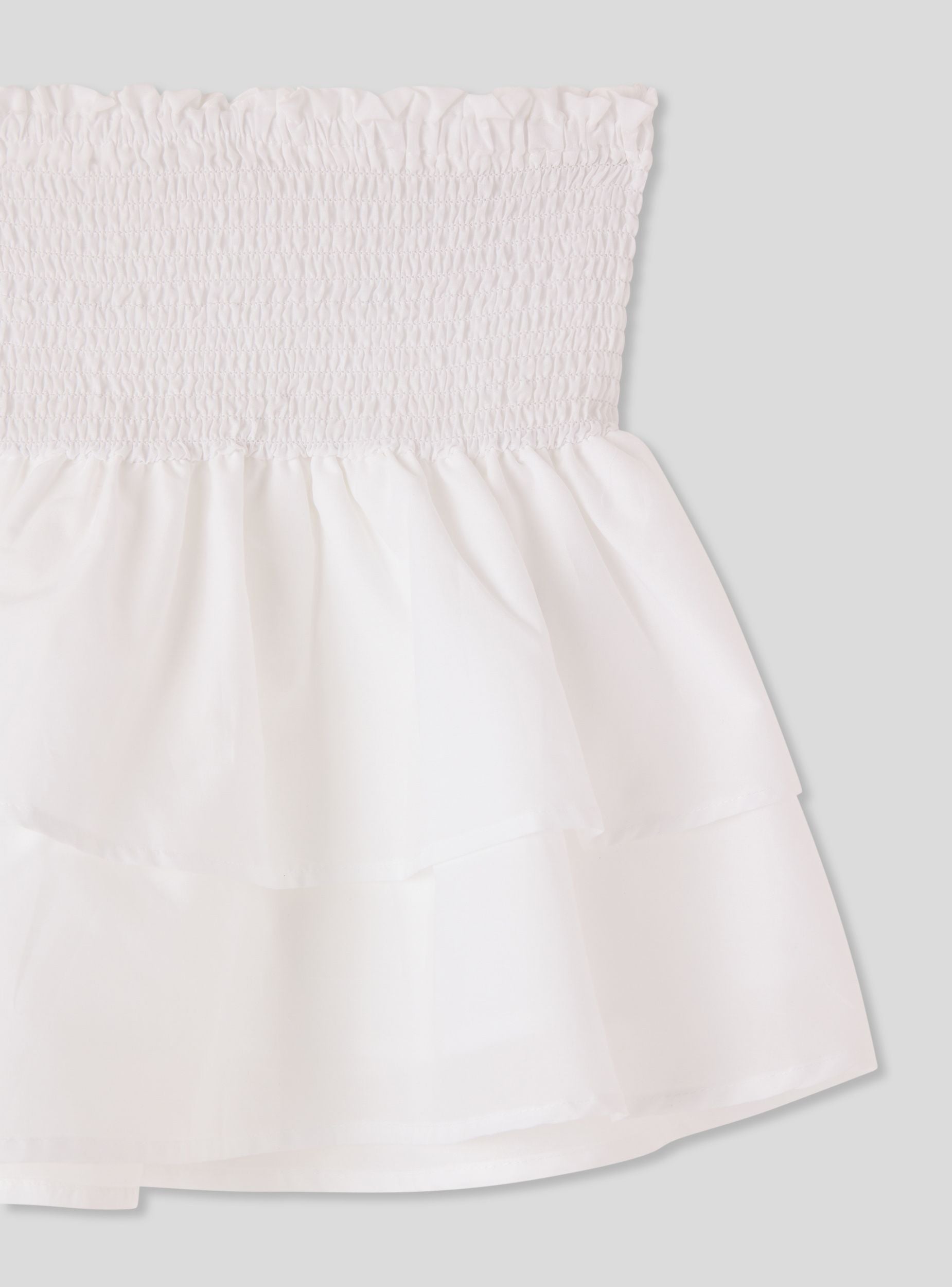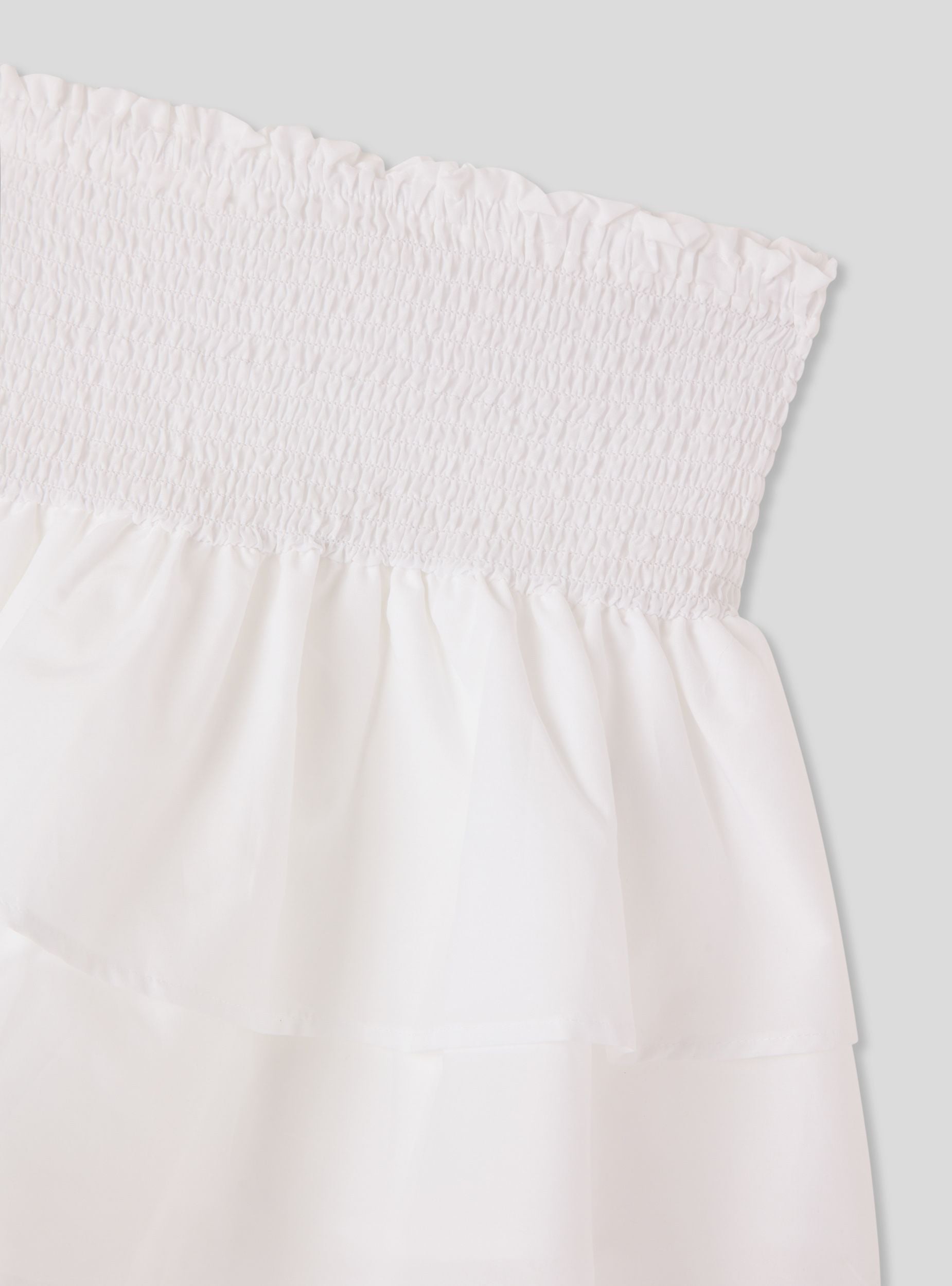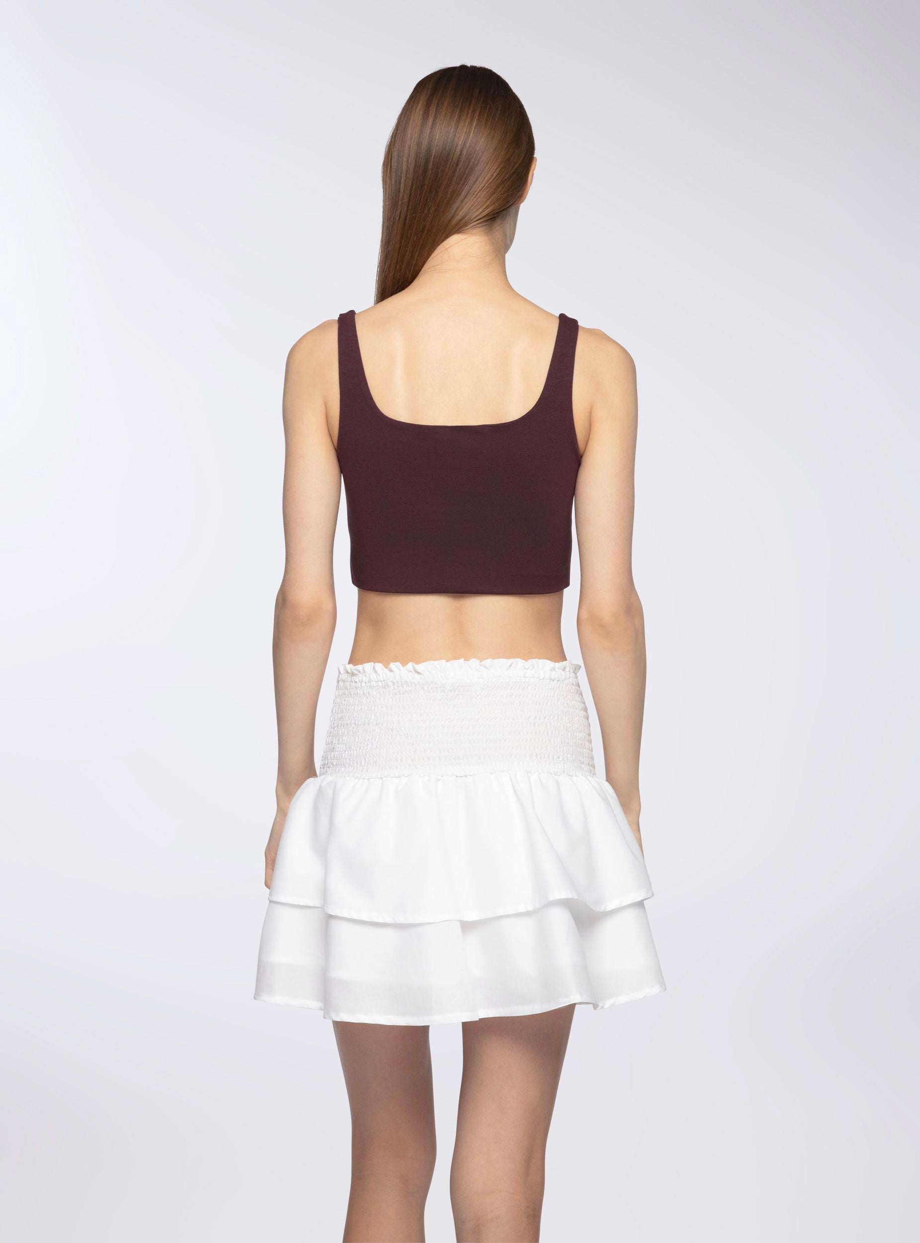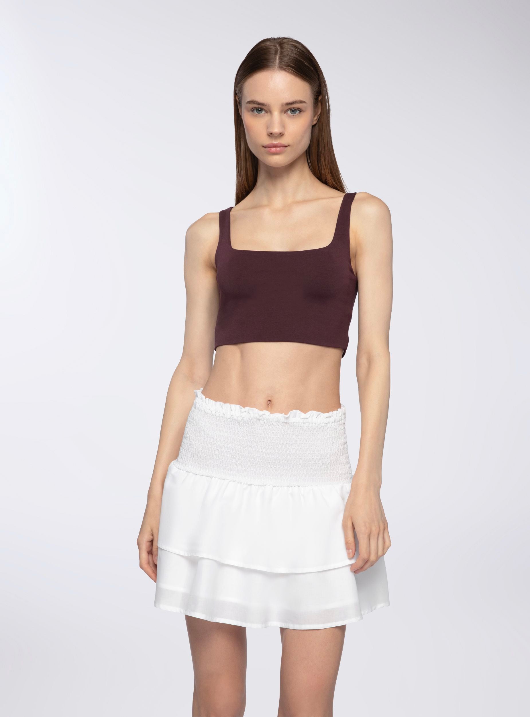 Gonna da donna a balze con punto smock in vita, pensata per offrire doppia versatilità: può essere indossata sia come gonna che come top. Il design tinta unita e la fascia elasticizzata permettono di trasformare il capo in base all'occasione, creando look sempre nuovi. Perfetta da portare con crop top o da usare come top su pantaloni a vita alta per un outfit originale e di tendenza.