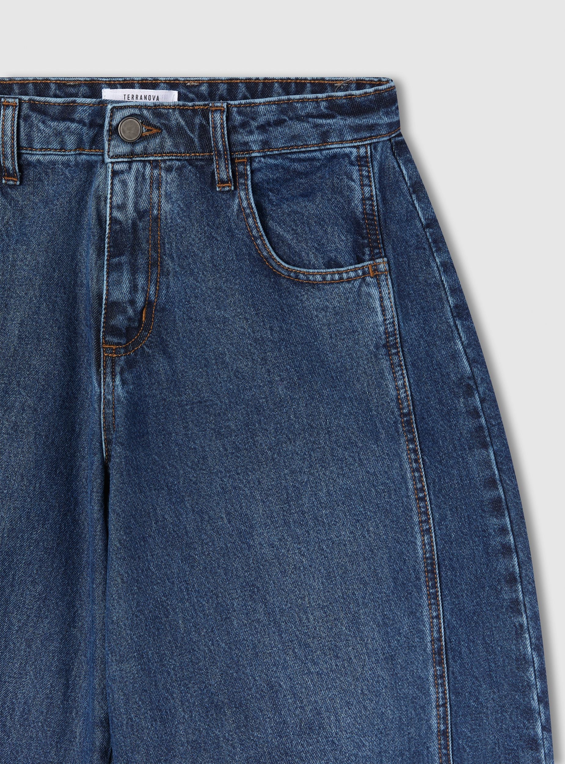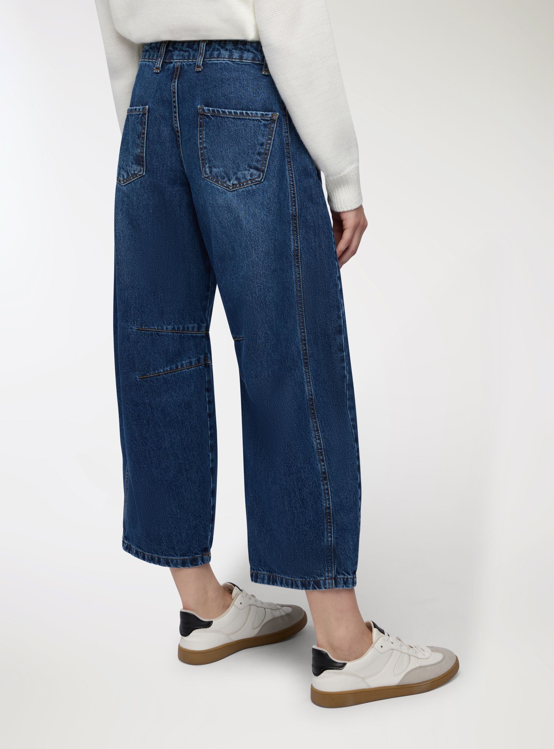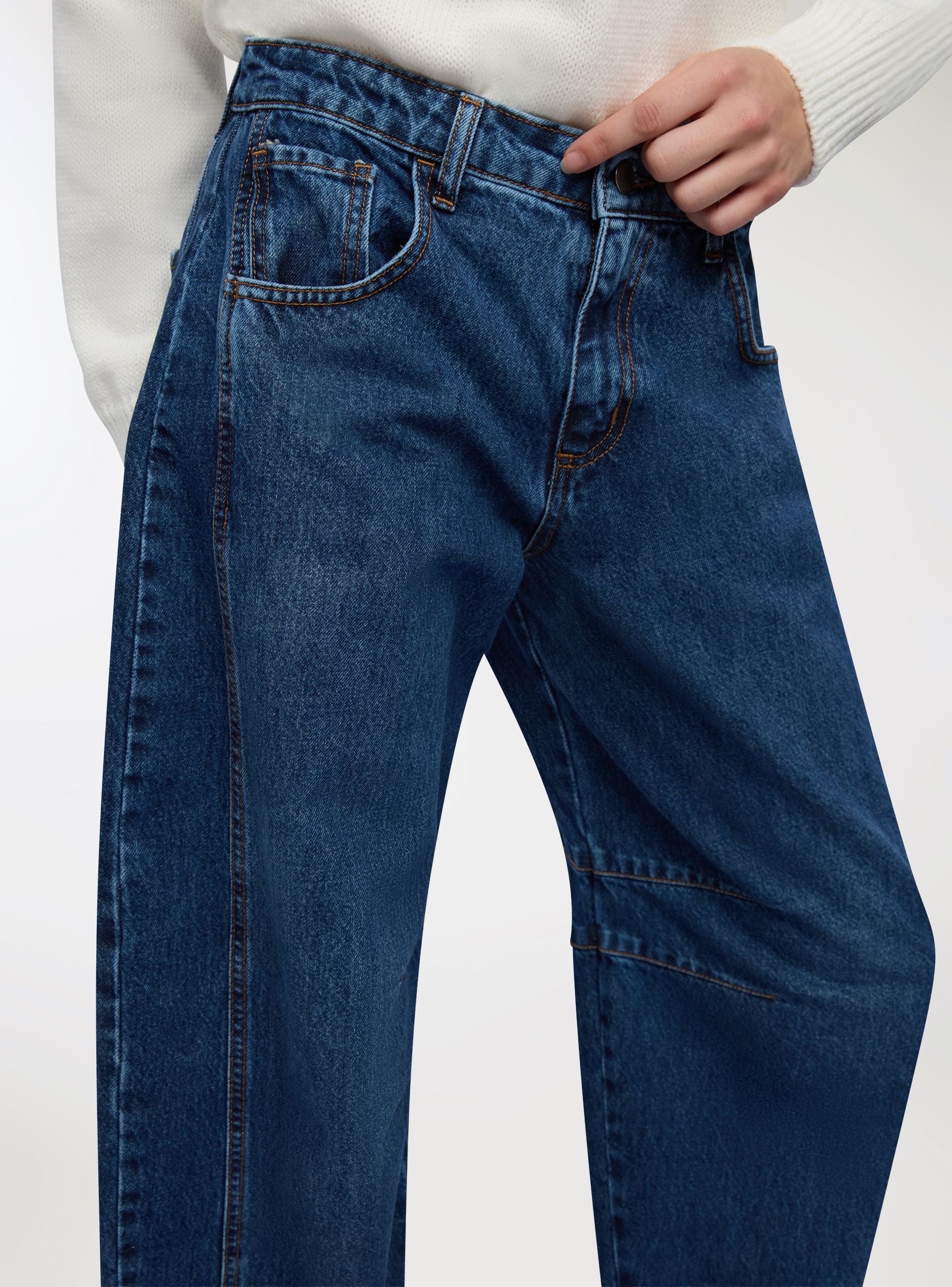 Jeans da donna a tinta unita con linea balloon e gamba lunga. Vita media con passanti, chiusura con bottone e zip, cinque tasche. Le cuciture frontali e i tagli sulle cosce aggiungono carattere, perfetti con maglietta infilata e sneakers per il giorno o con camicia e stivaletti per un look urbano.