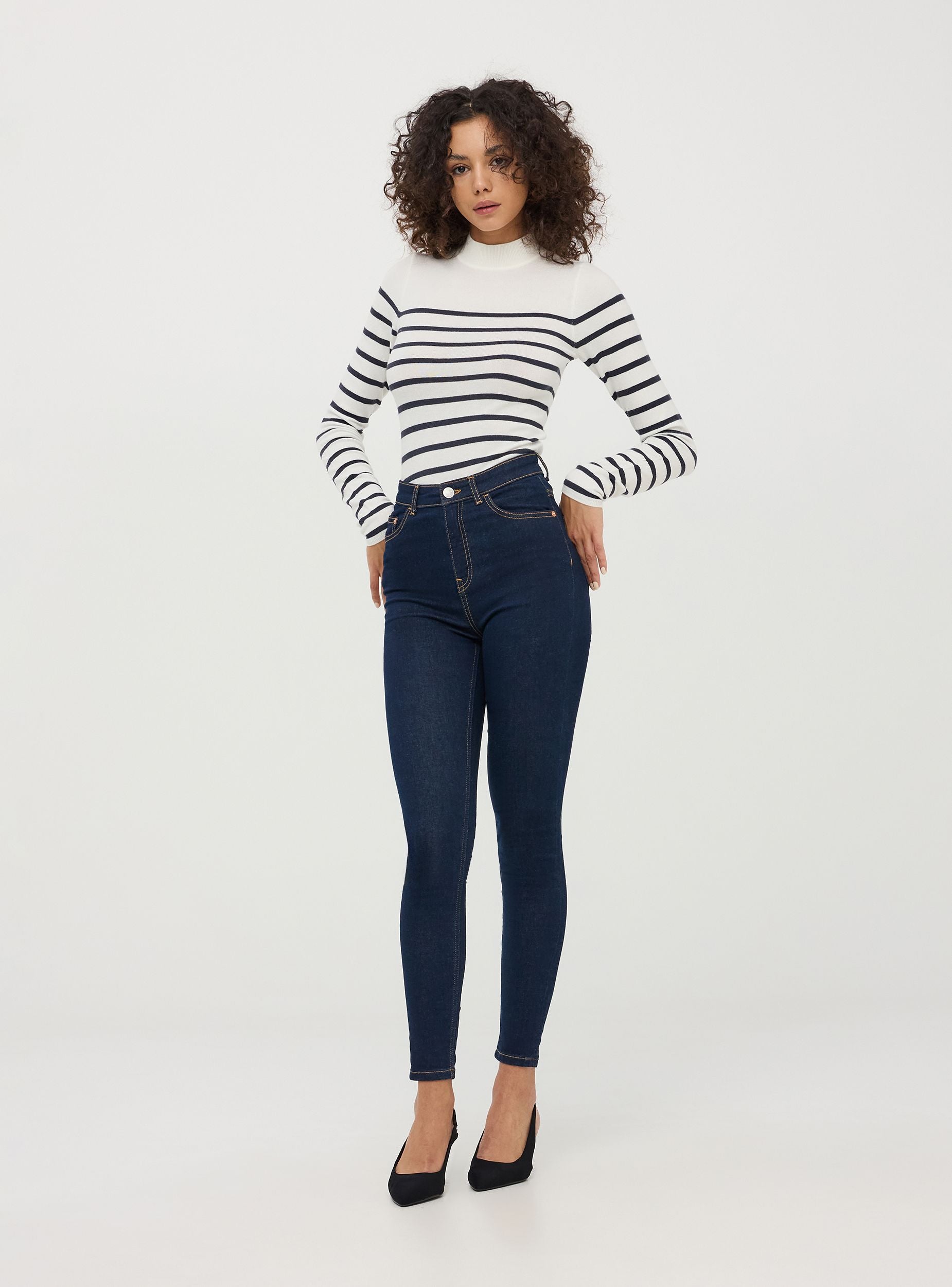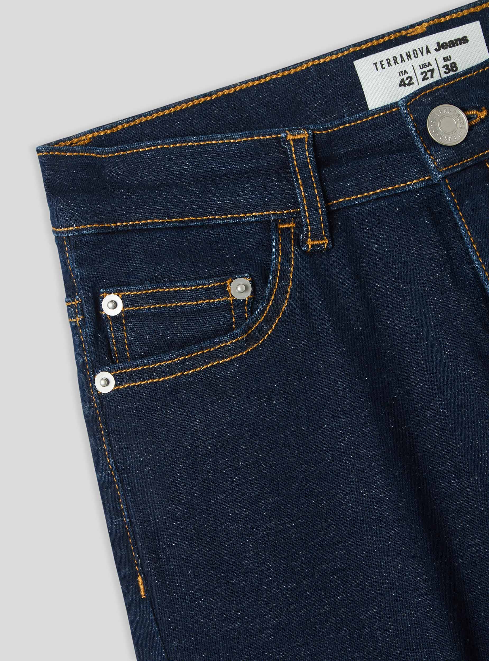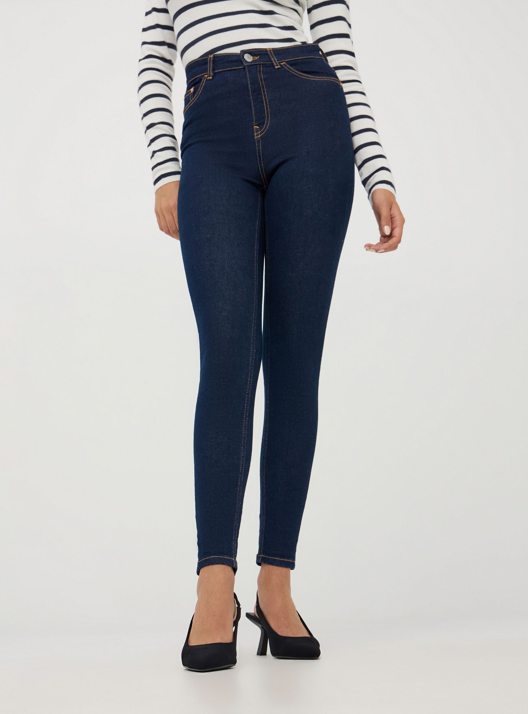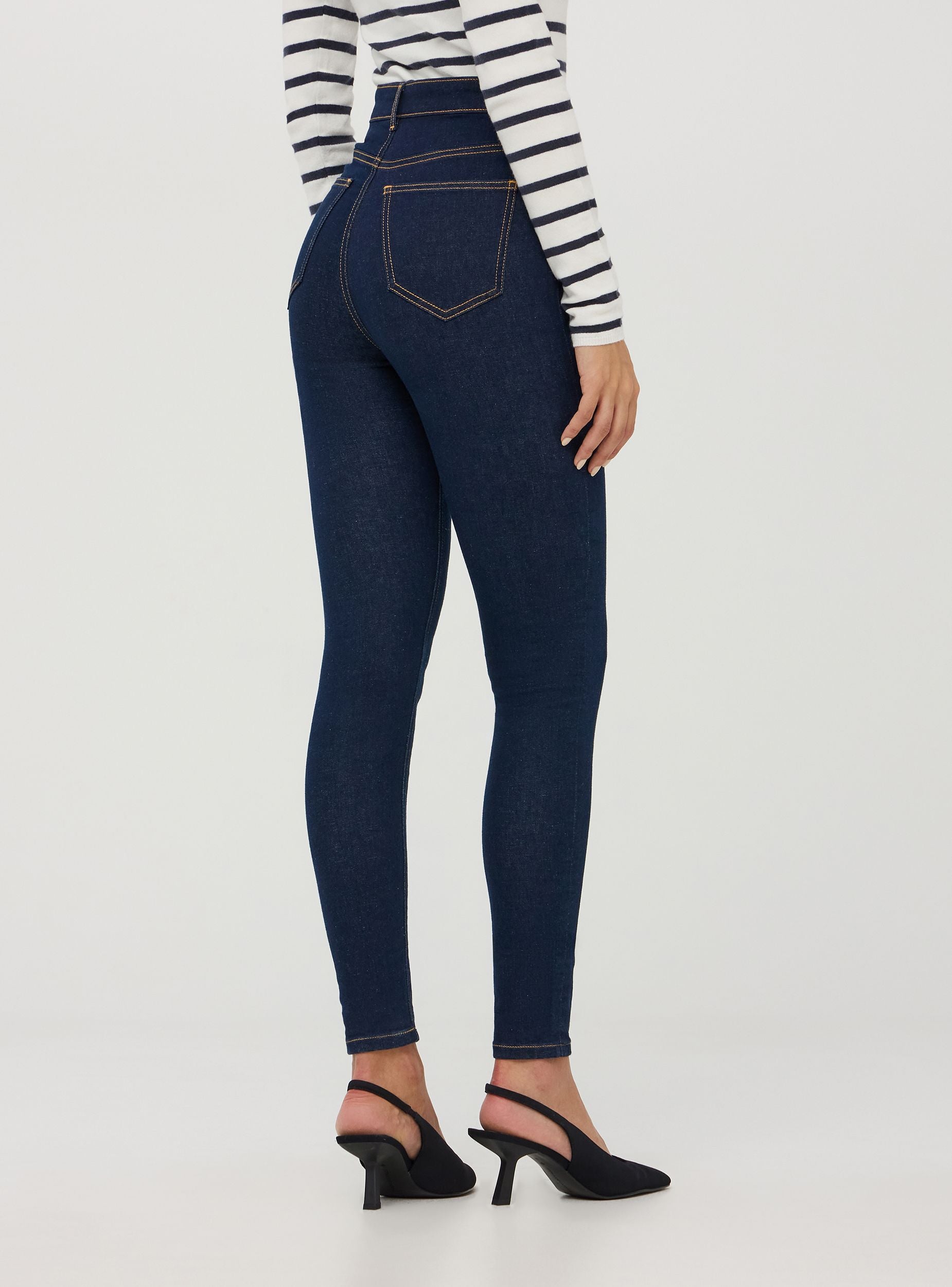 Jeans skinny da donna a vita alta perfetti per esaltare la silhouette. Il tessuto denim garantisce una vestibilità aderente e confortevole. Modello dotato di chiusura con zip e bottone, e cinque tasche, due anteriori, due posteriori e una piccola tasca anteriore aggiuntiva. Questi jeans sono ideali per un look casual e versatile. Perfetti per essere indossati durante il giorno o la sera, possono essere facilmente abbinati con una varietà di top e scarpe, rendendoli un capo essenziale nel guardaroba di ogni donna.