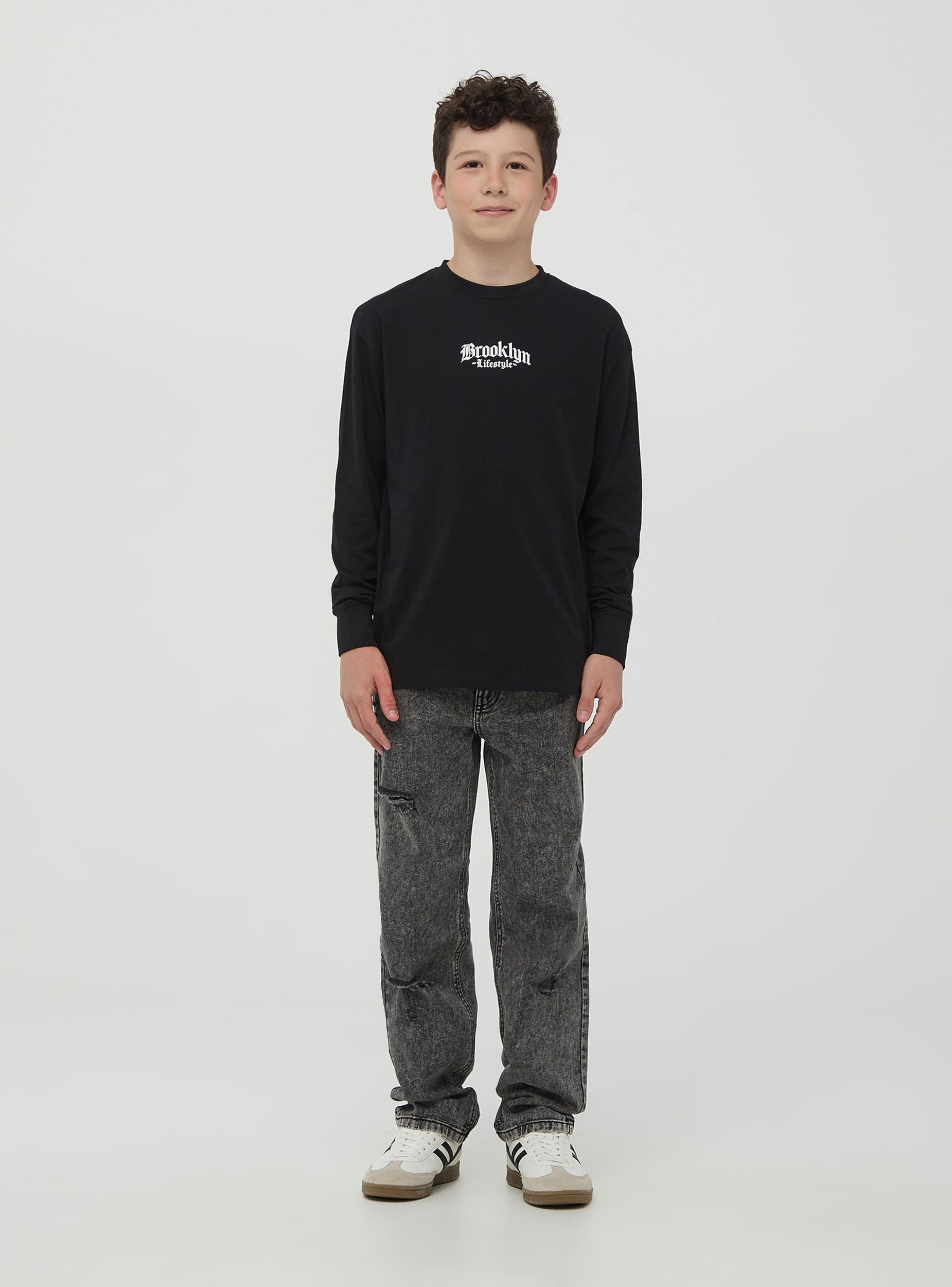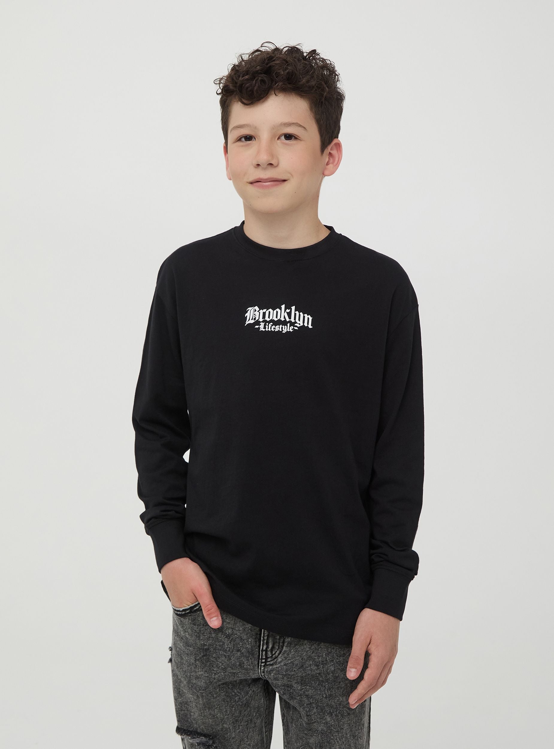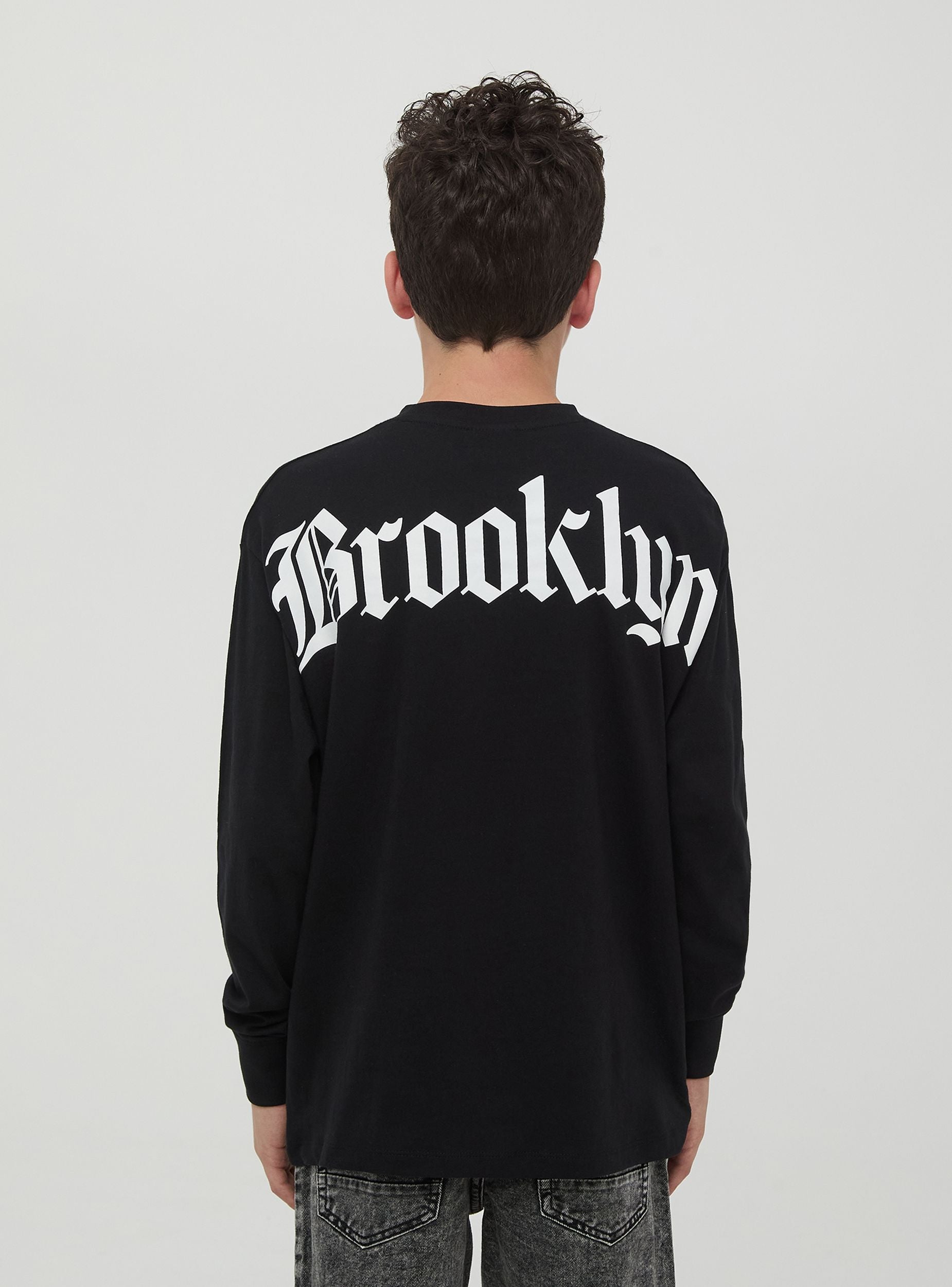 Maglia da bambino con stampa in stile gotico. Realizzata in cotone con tessuto in single jersey, presenta una stampa "Brooklyn Lifestyle" sul petto e una grande scritta "Brooklyn" sulla schiena. La maglia ha polsini e colletto in costina elasticizzata. Ideale per un look casual e comodo, perfetta per il tempo libero e le attività quotidiane.Dettagli