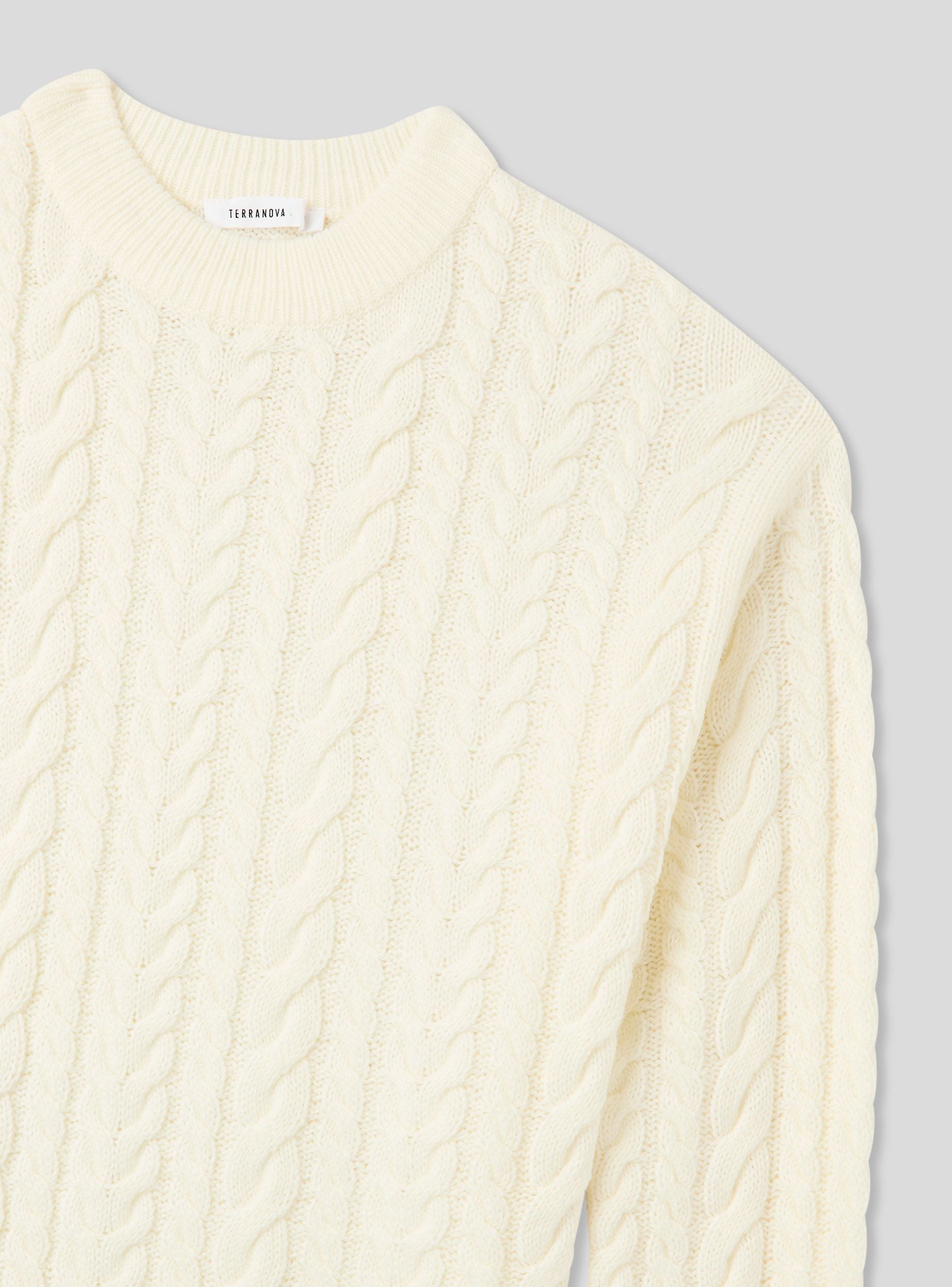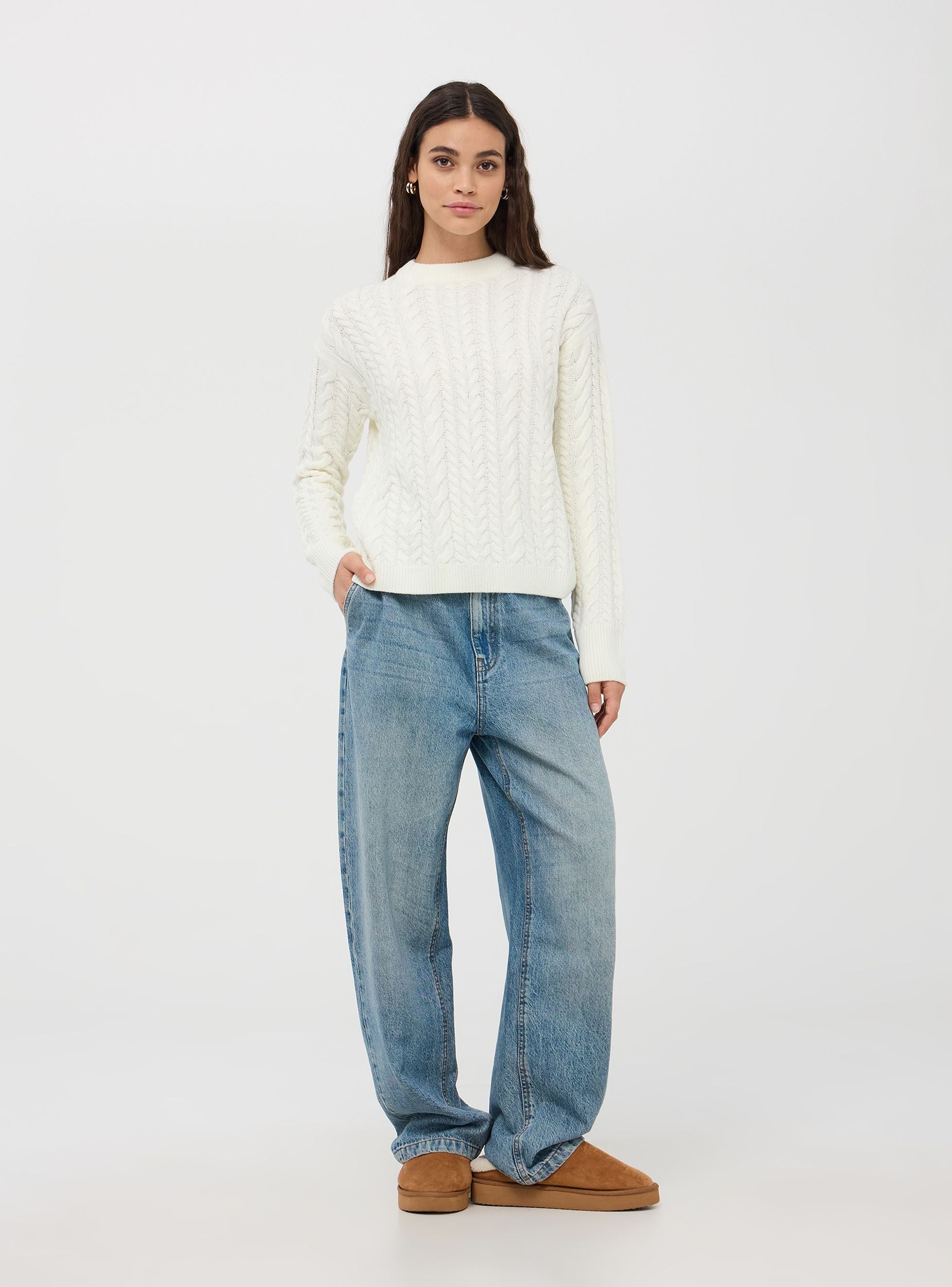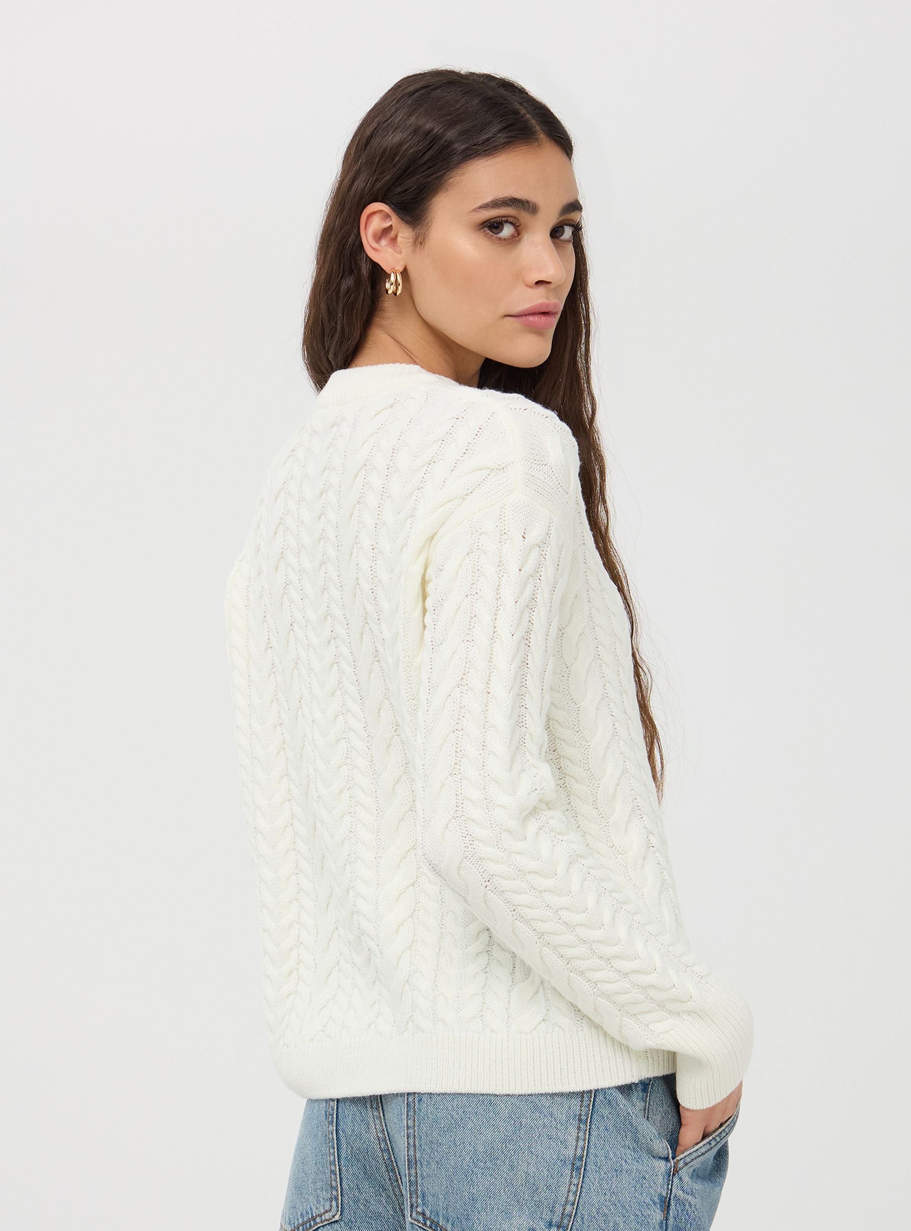 Maglia da donna a maniche lunghe realizzata in morbido tessuto a tinta unita. Il modello presenta un elegante motivo a trecce, finiture a costine e uno scollo rotondo, che aggiungono un tocco di stile al capo. Perfetta per le occasioni casual e quotidiane, questa maglia può essere indossata con jeans, pantaloni o gonne per un look semplice ma elegante. Ideale per l'ufficio, le uscite con amici o per una giornata di relax a casa. Capo versatile e alla moda che unisce stile e praticità. Vestibilità regular.