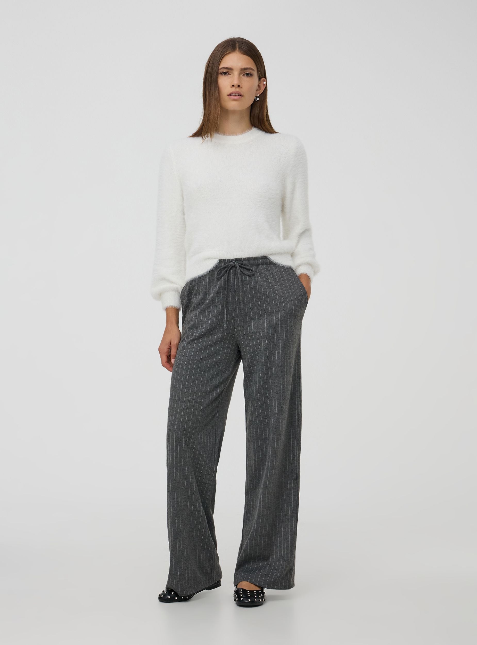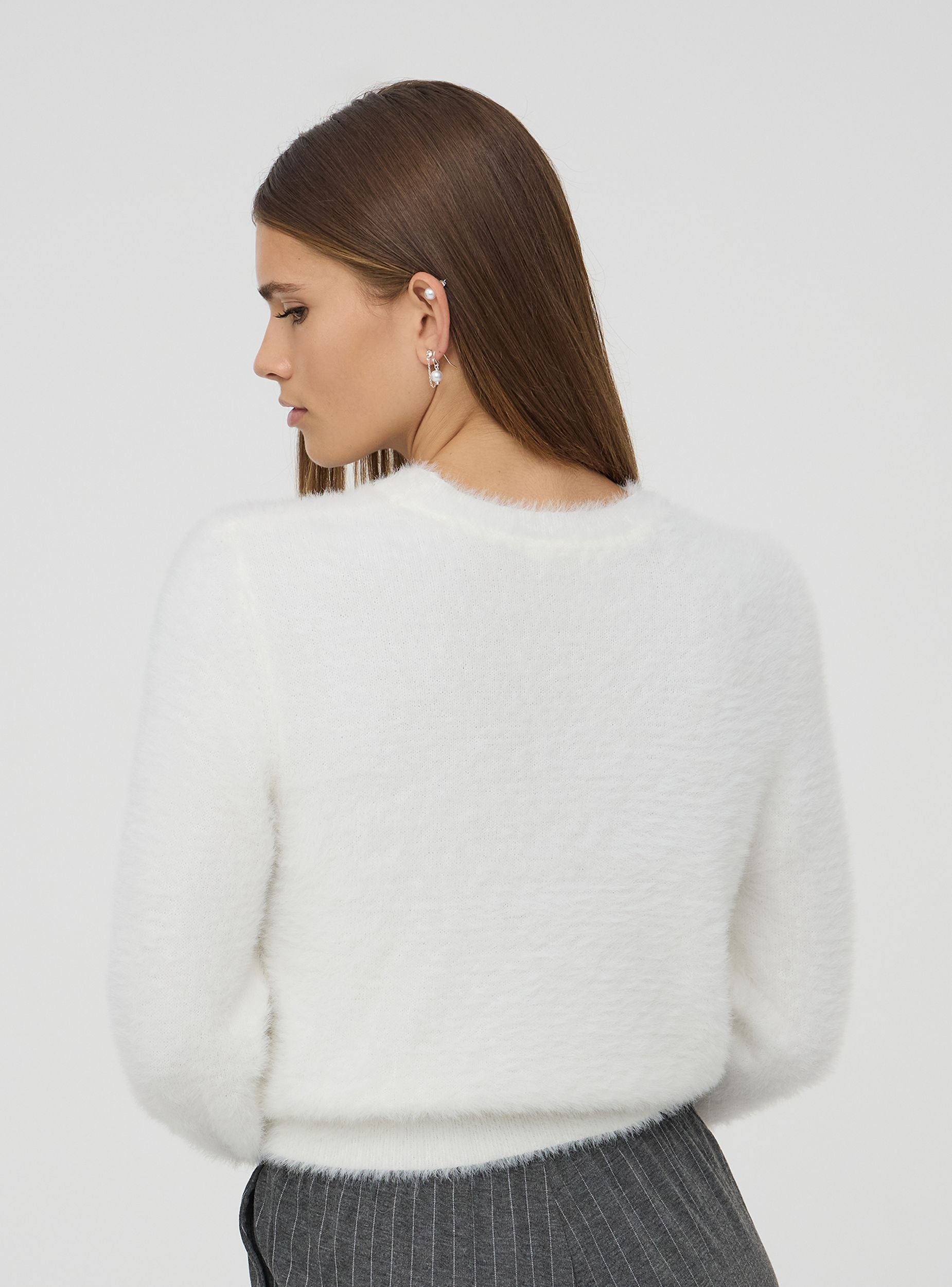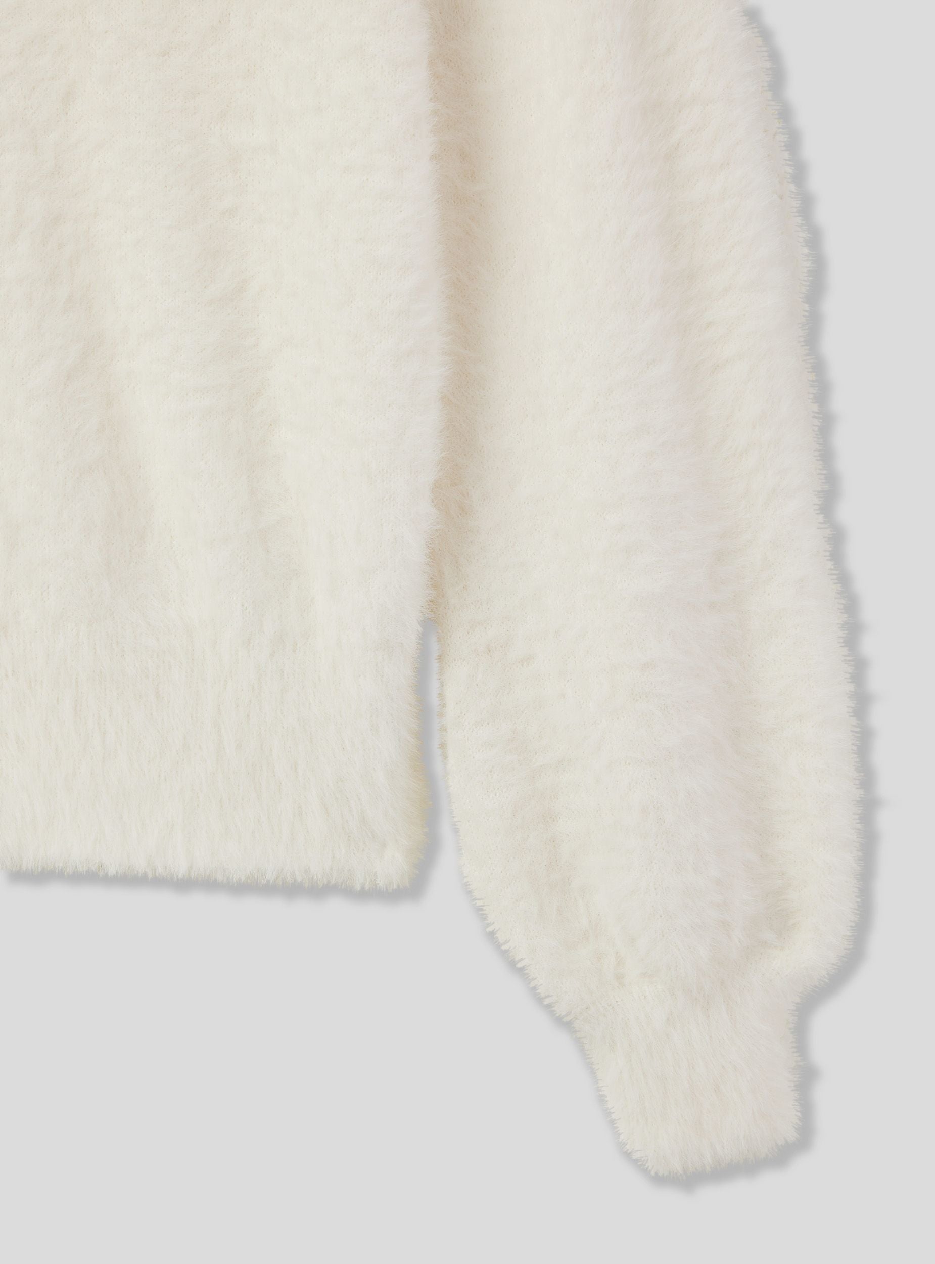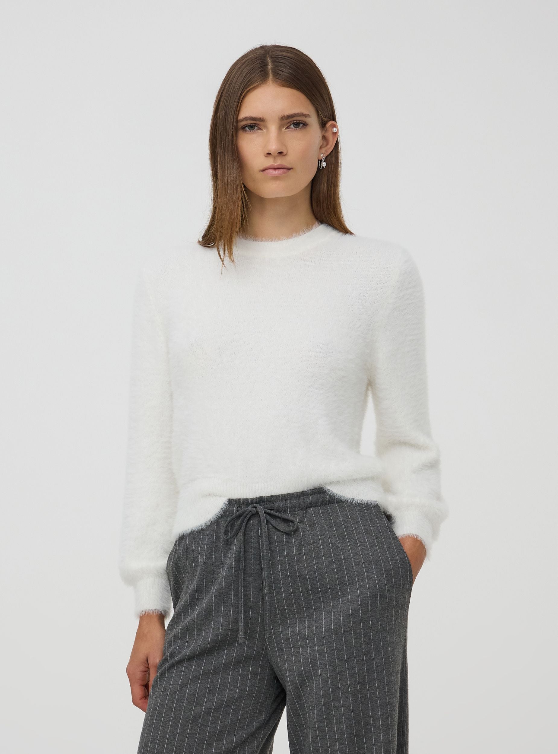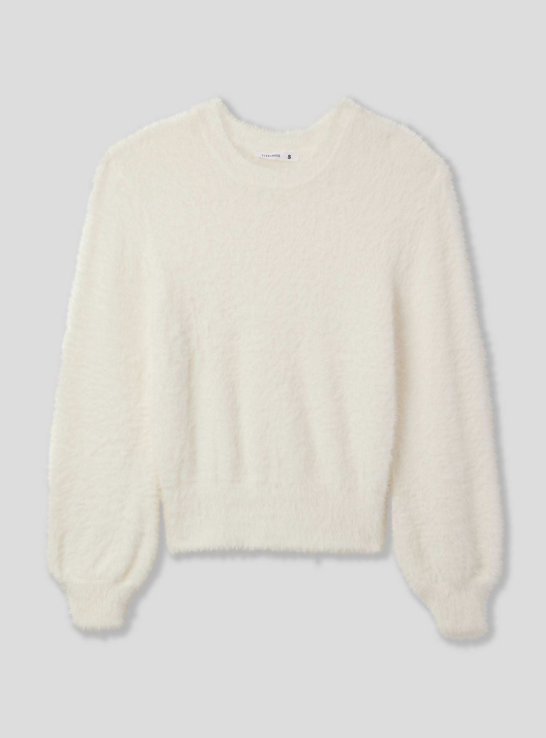 Maglia da donna in tessuto a tinta unita effetto pelo. Modello girocollo con maniche lunghe a palloncino. Vestibilità regular.