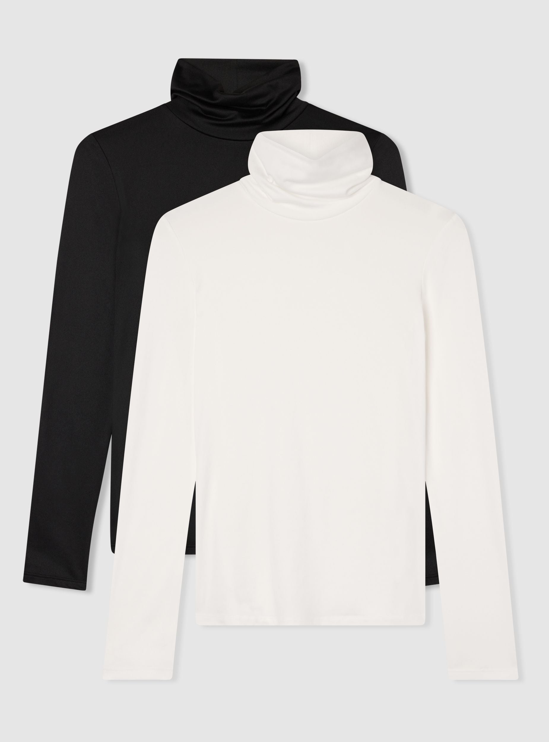 Confezione composta da 2 maglie da donna a tinta unita, aderenti a collo alto. Realizzate in tessuto jersey elasticizzato, offrono comfort e libertà di movimento. Ideali per le giornate invernali, possono essere indossate da sola o come strato aggiuntivo sotto giacche e cappotti, adatte per un look casual o per un outfit più formale. Perfette per un uso quotidiano o per un’occasione speciale. Capo basic indispensabile nell'armadio.