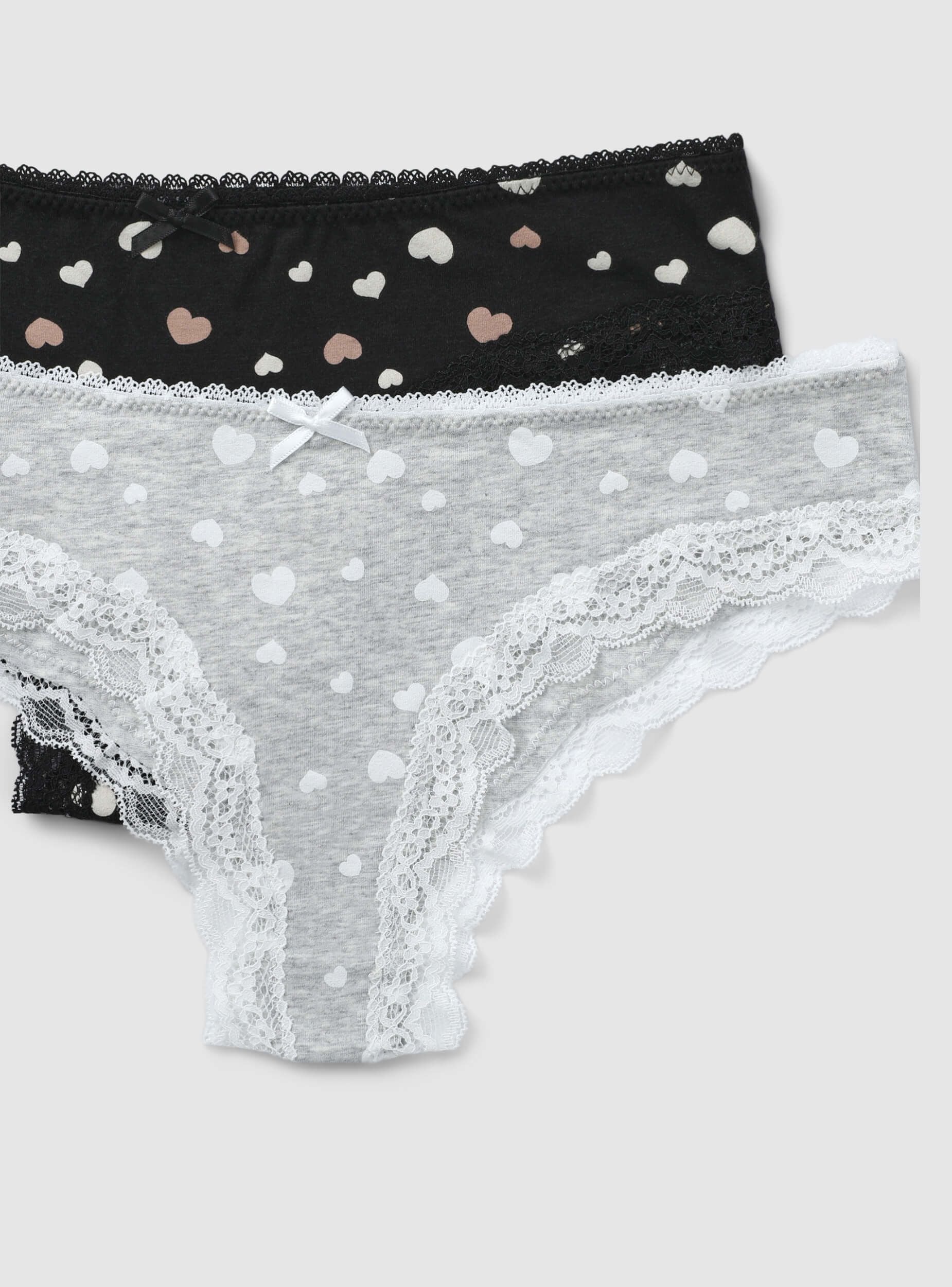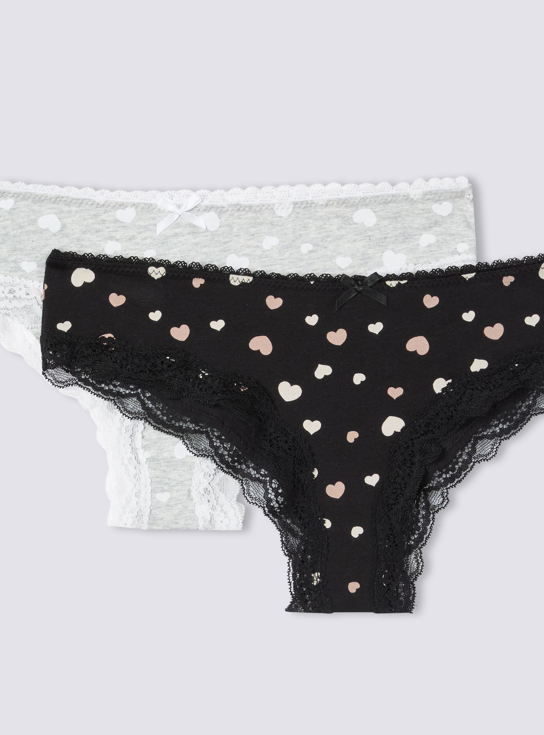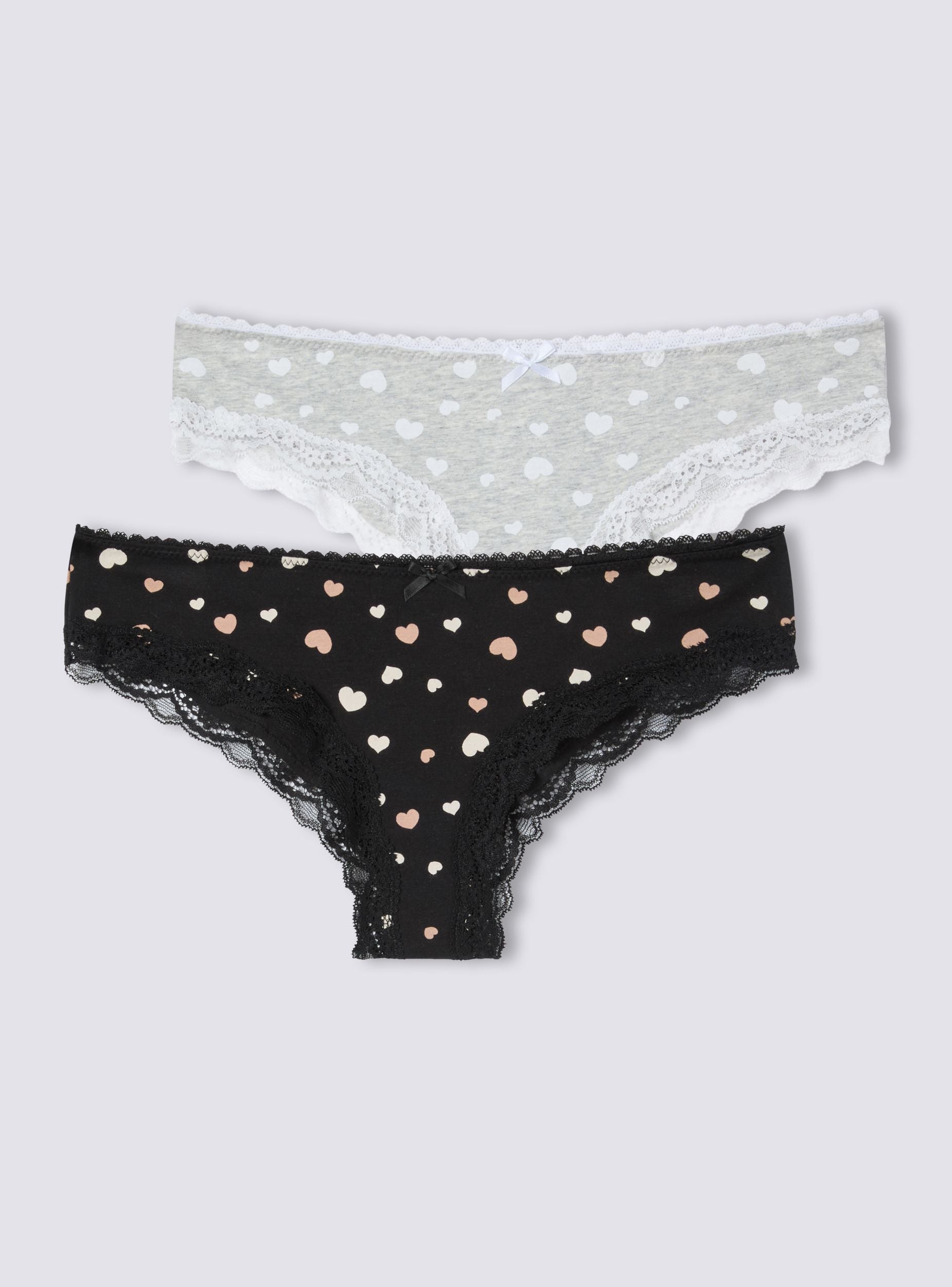 Confezione composta da 2 slip da donna dal design romantico e femminile. Entrambi i modelli sono decorati con un raffinato motivo a cuori, arricchiti da dettagli in pizzo che esaltano l’eleganza del capo. Uno degli slip è impreziosito da un delicato fiocco che dona un tocco di grazia e stile. Perfetti per chi desidera un intimo dolce e ricercato per ogni occasione.Dettagli