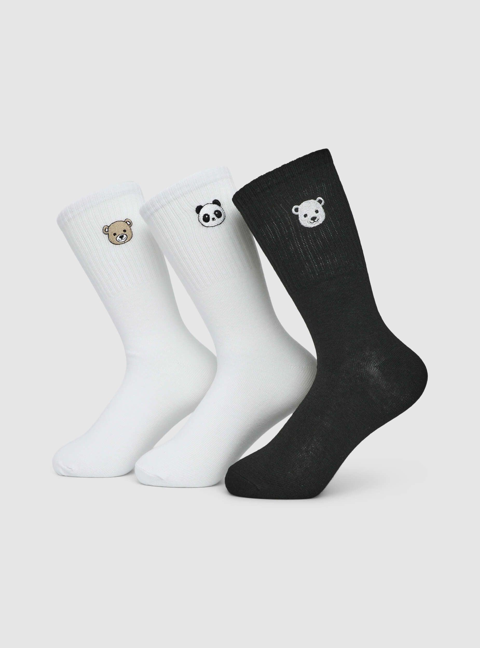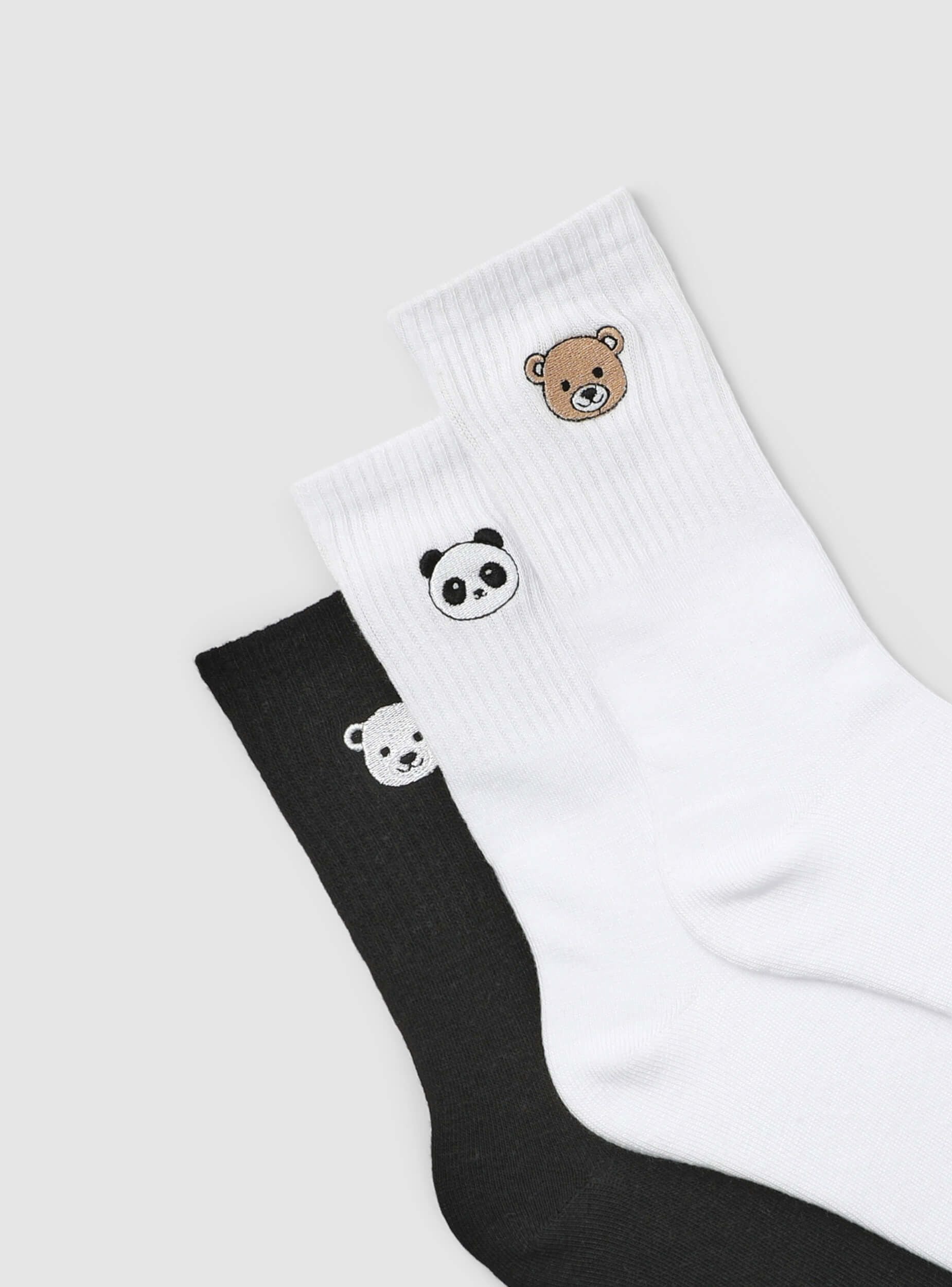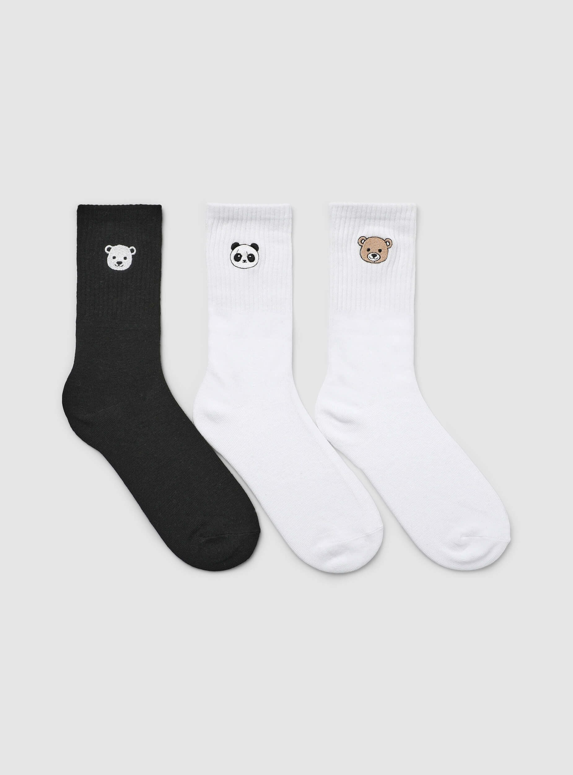 Confezione composta da 3 paia di calze da donna, ideali per l'uso quotidiano e per aggiungere un tocco casual chic ai tuoi outfit. Ogni paio presenta un ricamo diverso, perfette da abbinare a sneakers o scarpe basse. Vestibilità regolare e design a costine che garantisce comfort e aderenza durante tutta la giornata.