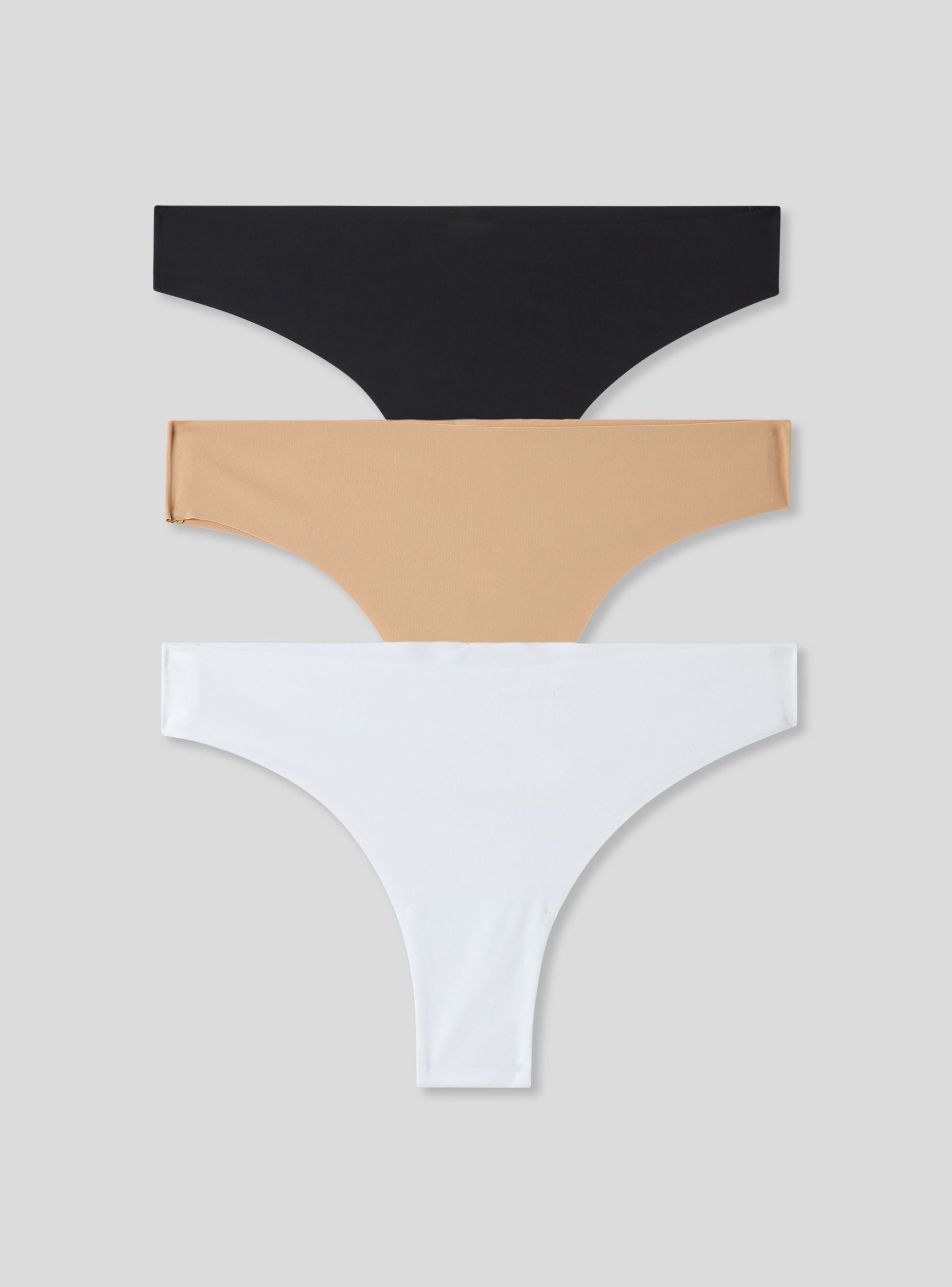 Confezione composta da tre slip modello brasiliana da donna in microfibra a tinta unita, in tre diverse colorazioni, taglio vivo.