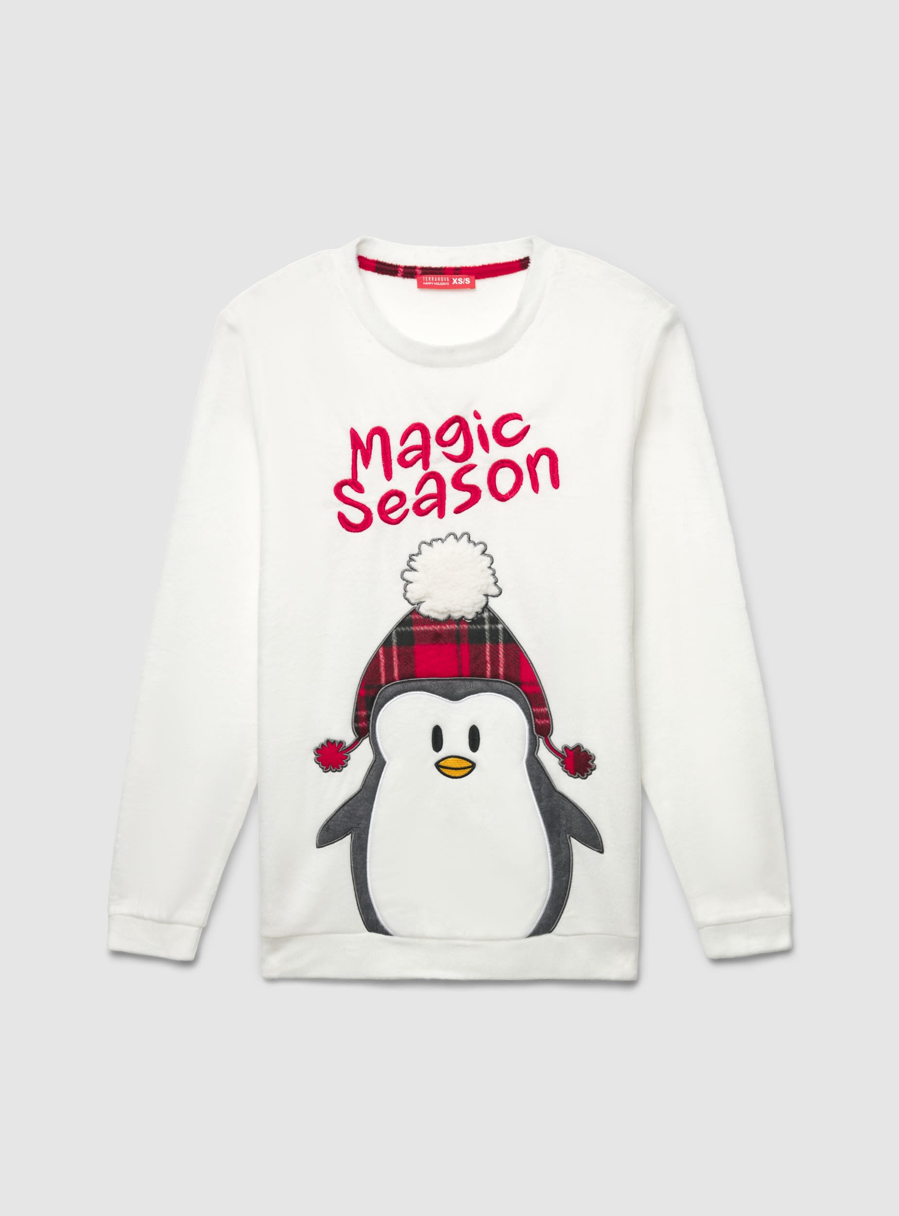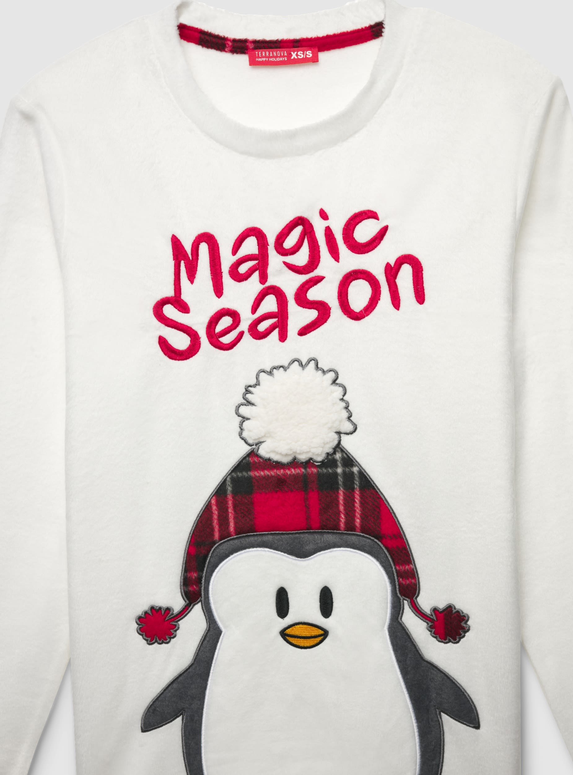 Pigiama unisex in morbido tessuto, composto da maglia a maniche lunghe con scollo tondo, scritta e pinguino, ideale per le serate a casa e il periodo natalizio. La maglia ha linea regular e finiture a polsino sul fondo manica. Pantaloni lunghi coordinati a quadri. Perfetto per un look comfy e divertente.