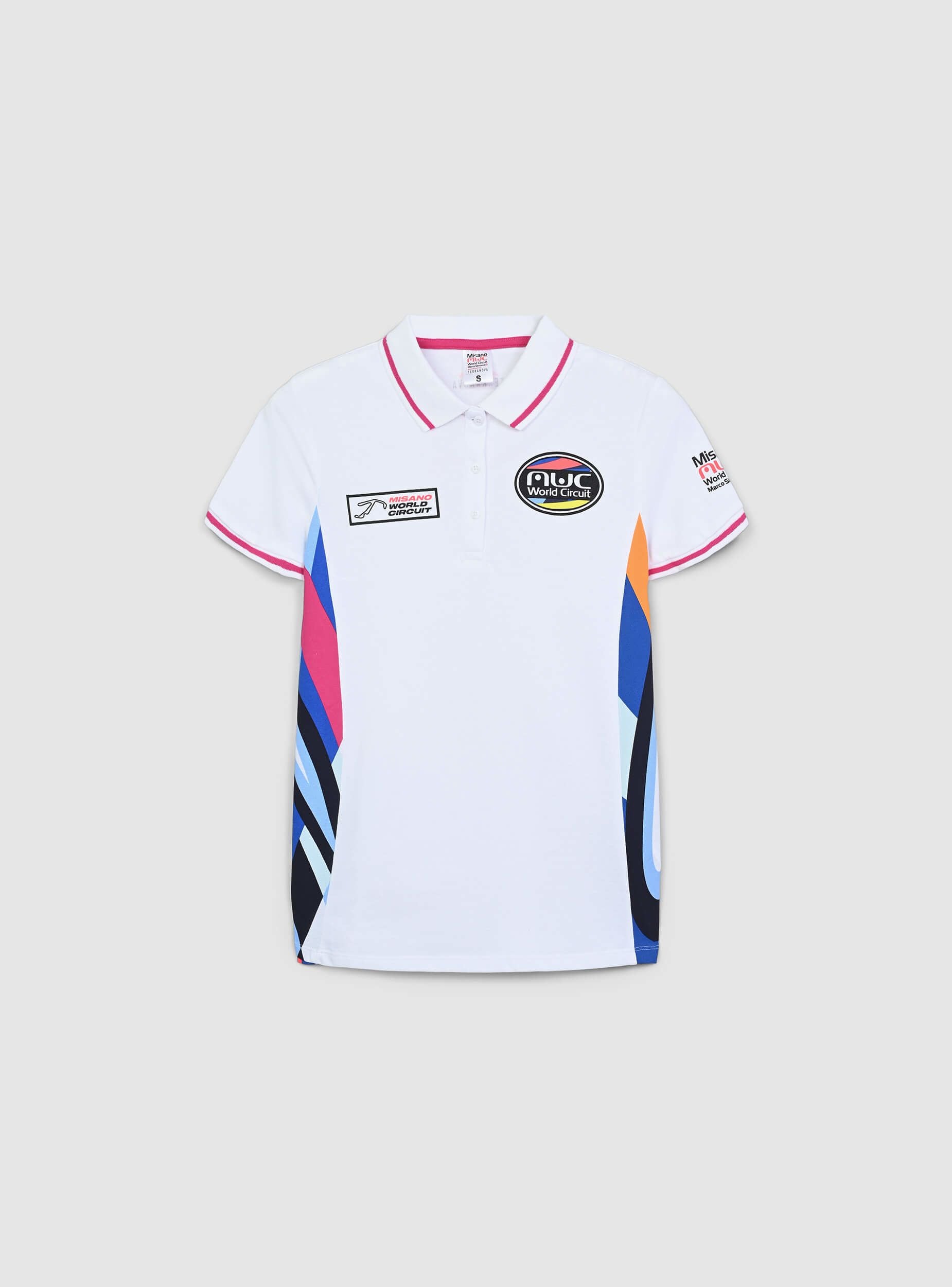 Maglietta da donna, modello polo, ideale per un look sportivo e dinamico, perfetta per il tempo libero o per eventi legati al mondo del motorsport. Caratterizzata da una vestibilità regolare, presenta un design con stampe dedicate al Misano World Circuit e strip colorati laterali. Una scelta versatile per chi ama lo stile sportivo e il comfort.