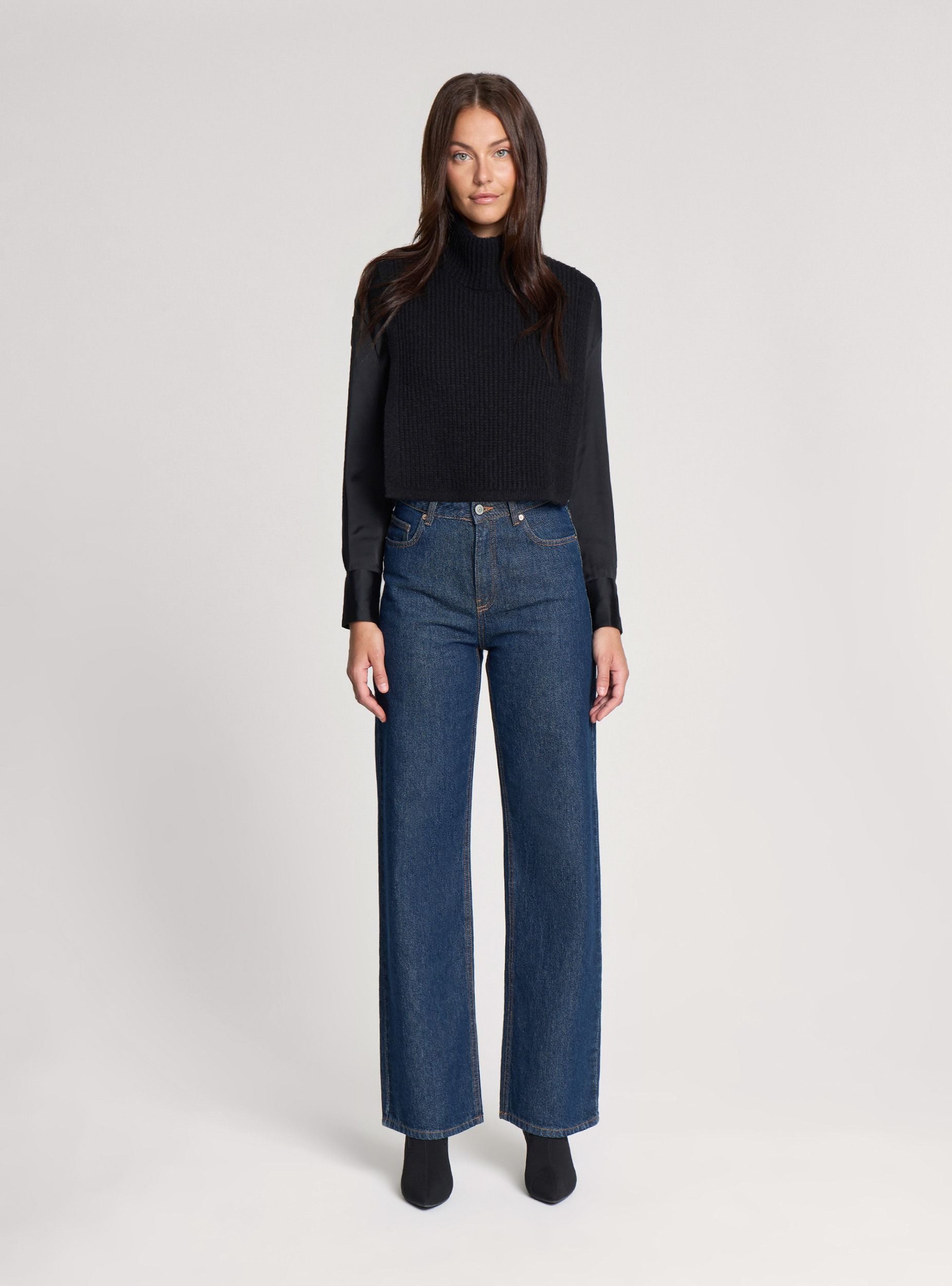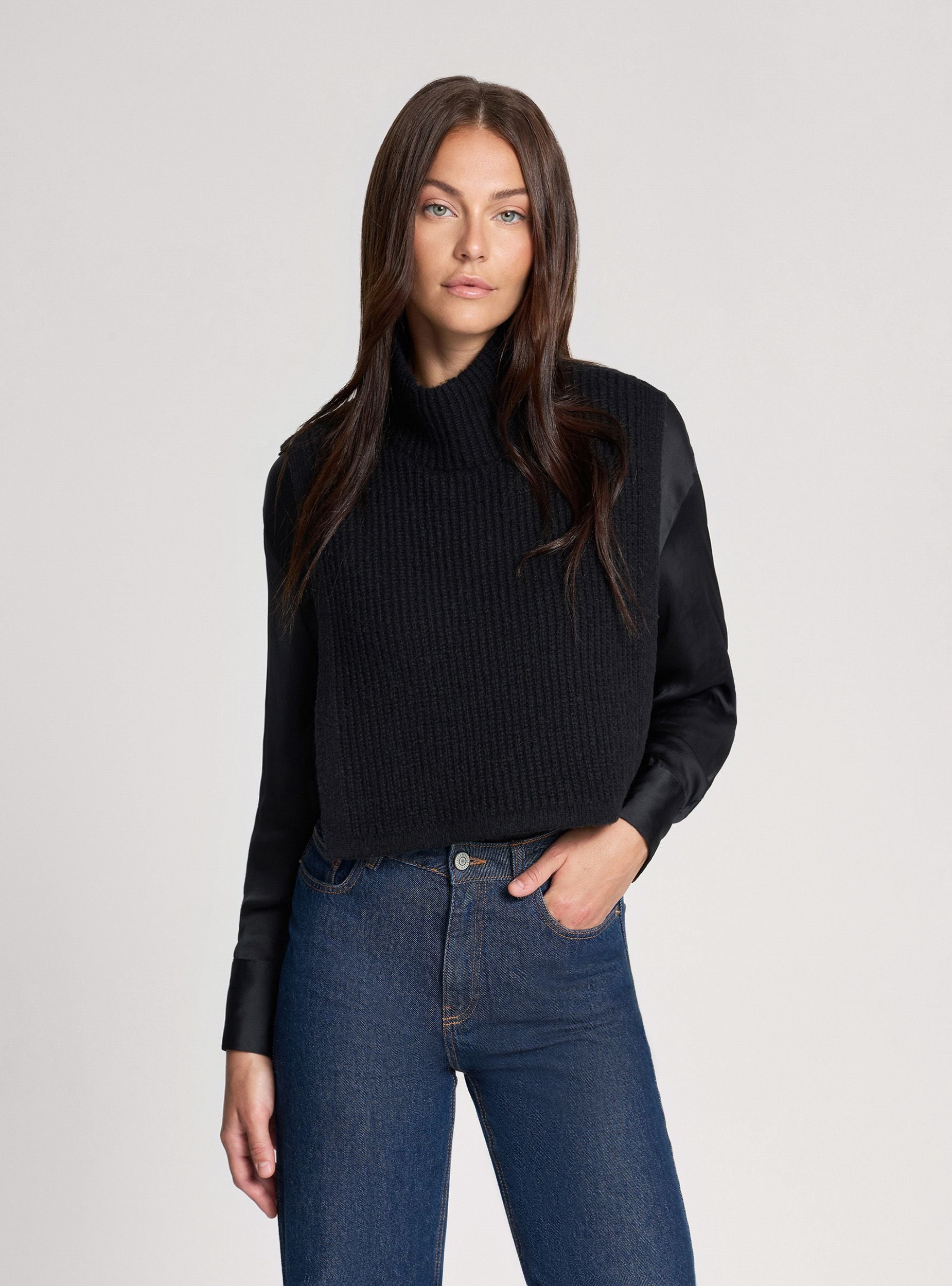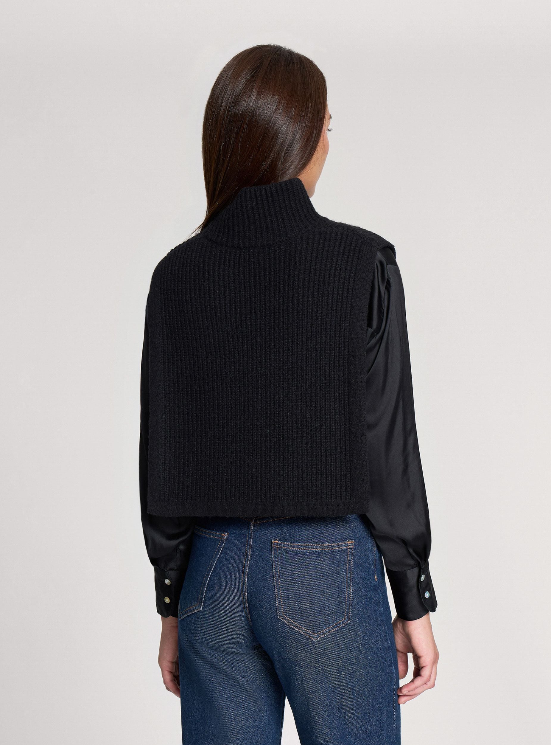 Poncho a maglia da donna con lavorazione a costine e collo alto avvolgente. Perfetto da indossare sopra cappotti o blazer per aggiungere un tocco moderno e proteggersi dal freddo. Pratico e versatile, dona calore senza ingombrare, ideale per completare look urbani o casual nei mesi più freddi.