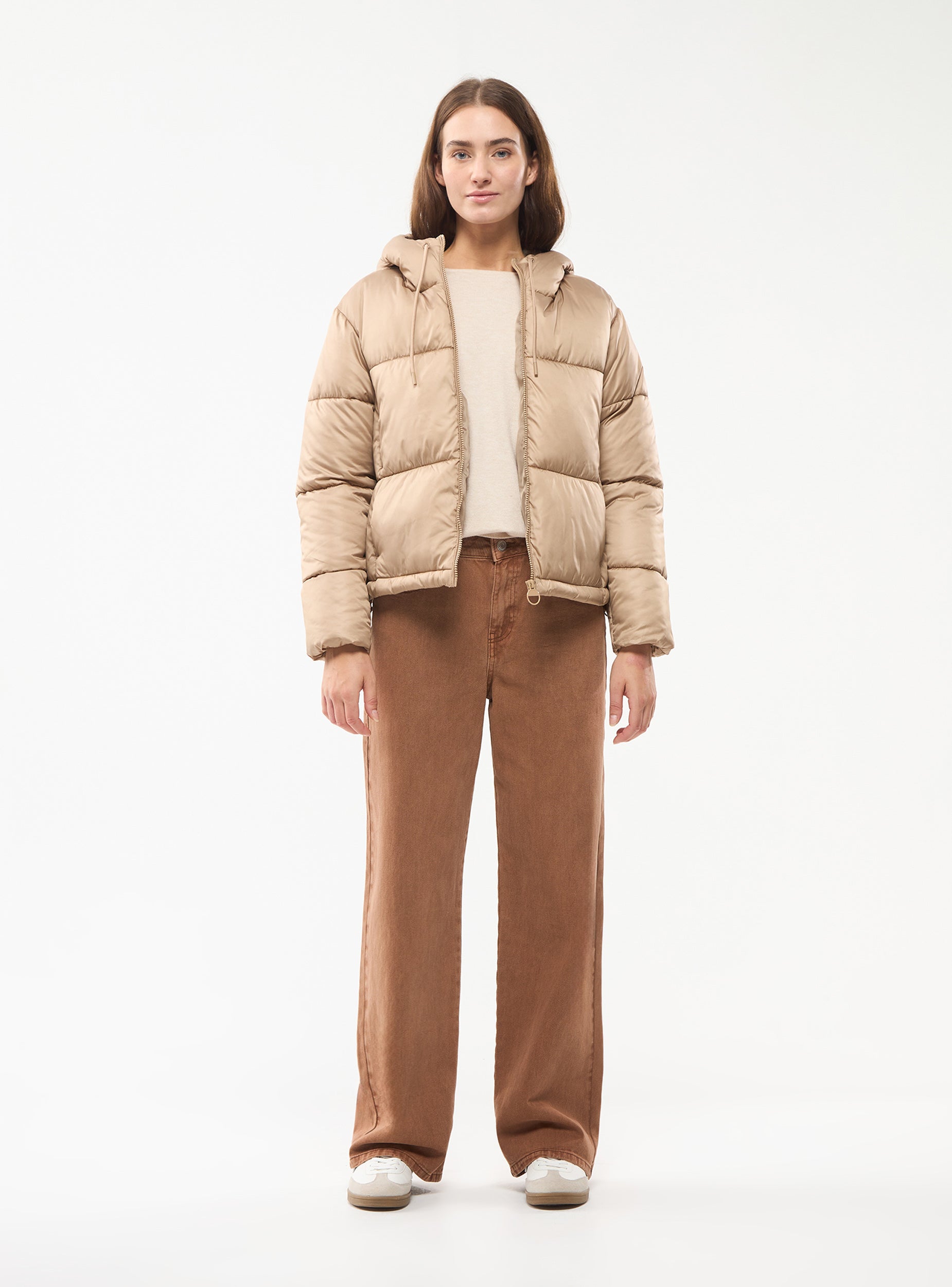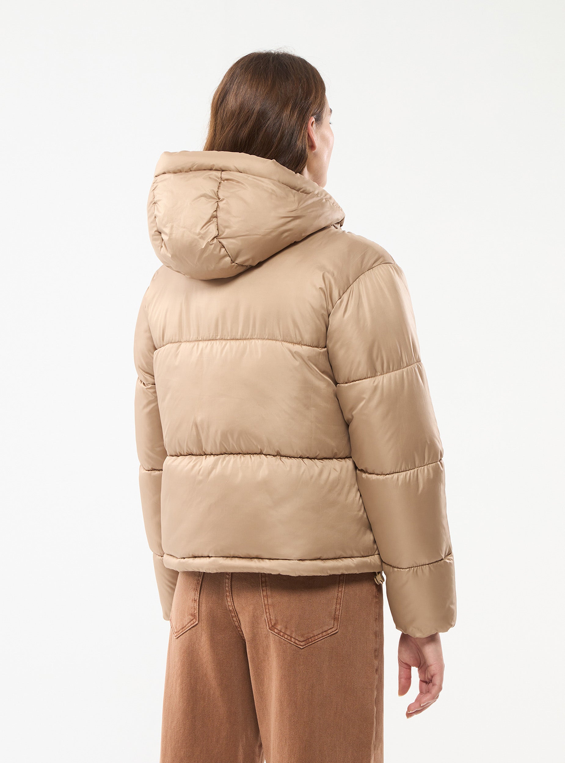 Giacca invernale imbottita puff tinta unita da donna. Modello con cappuccio Giacca invernale imbottita. Chiusura con cerniera frontale e tasche laterali. Coulisse in vita.Vestibilità è  ampia.