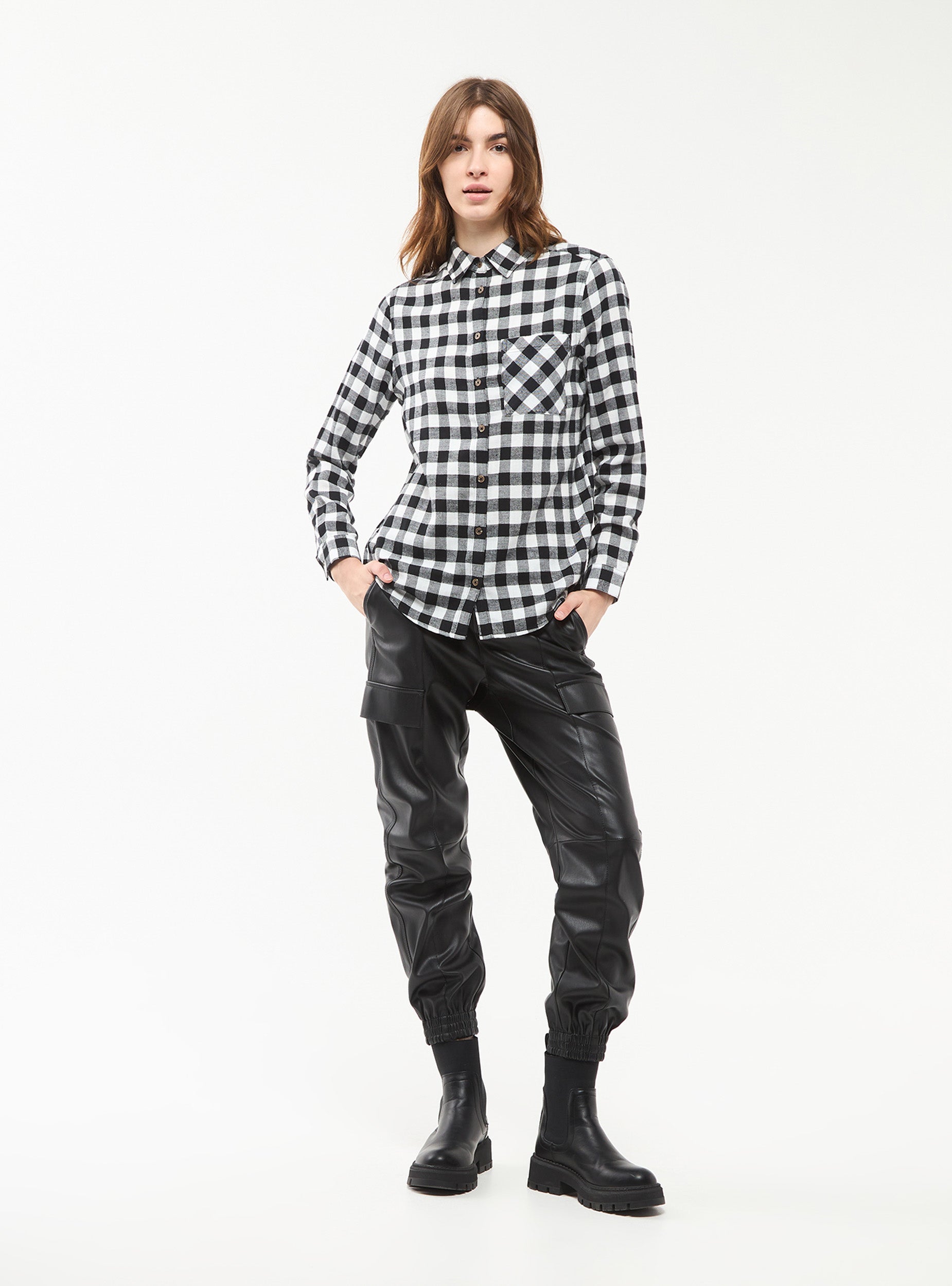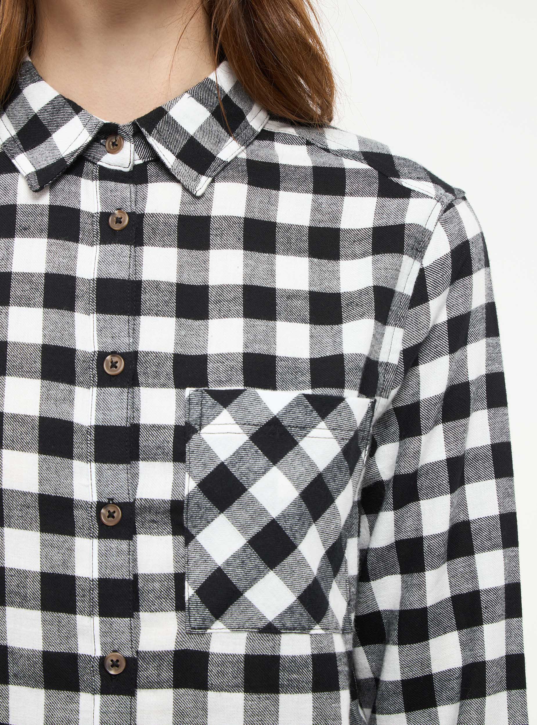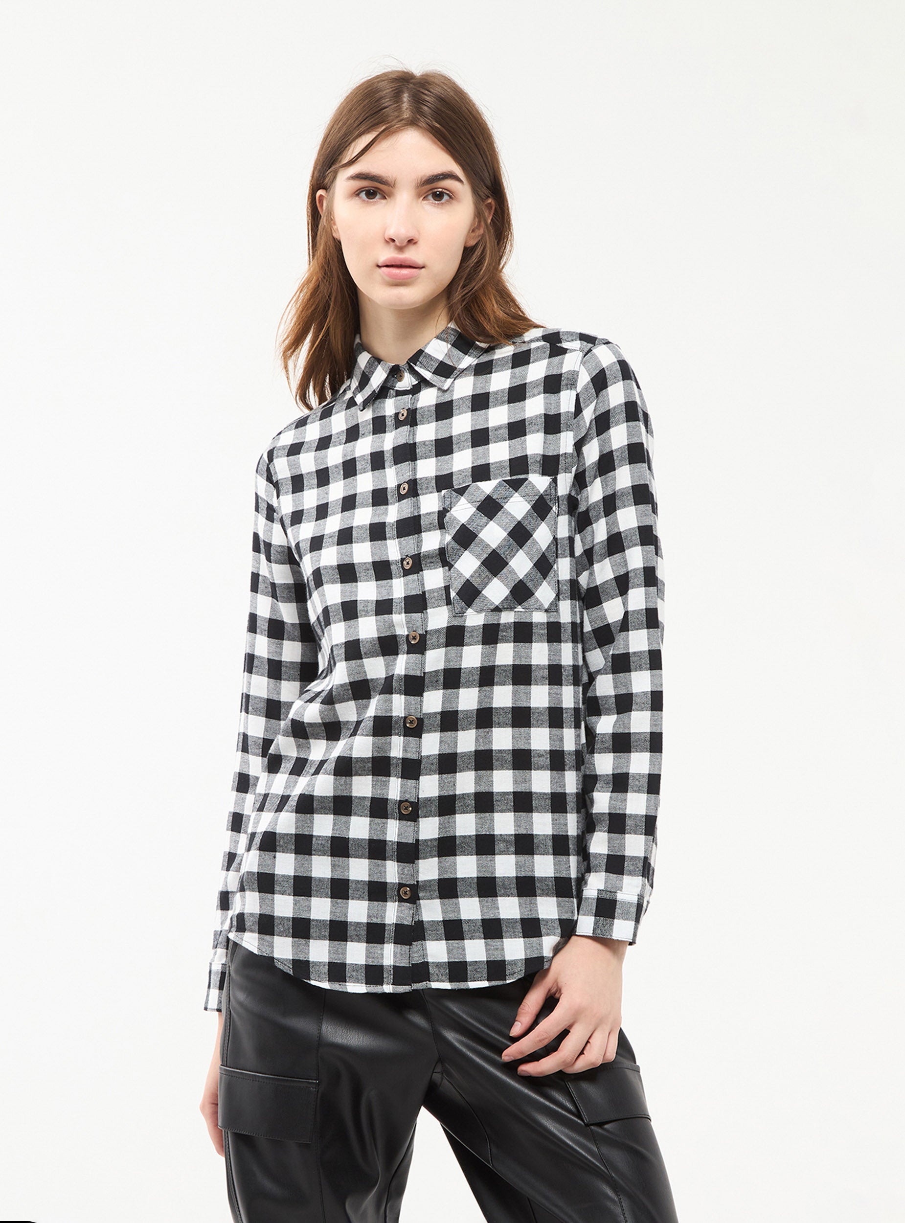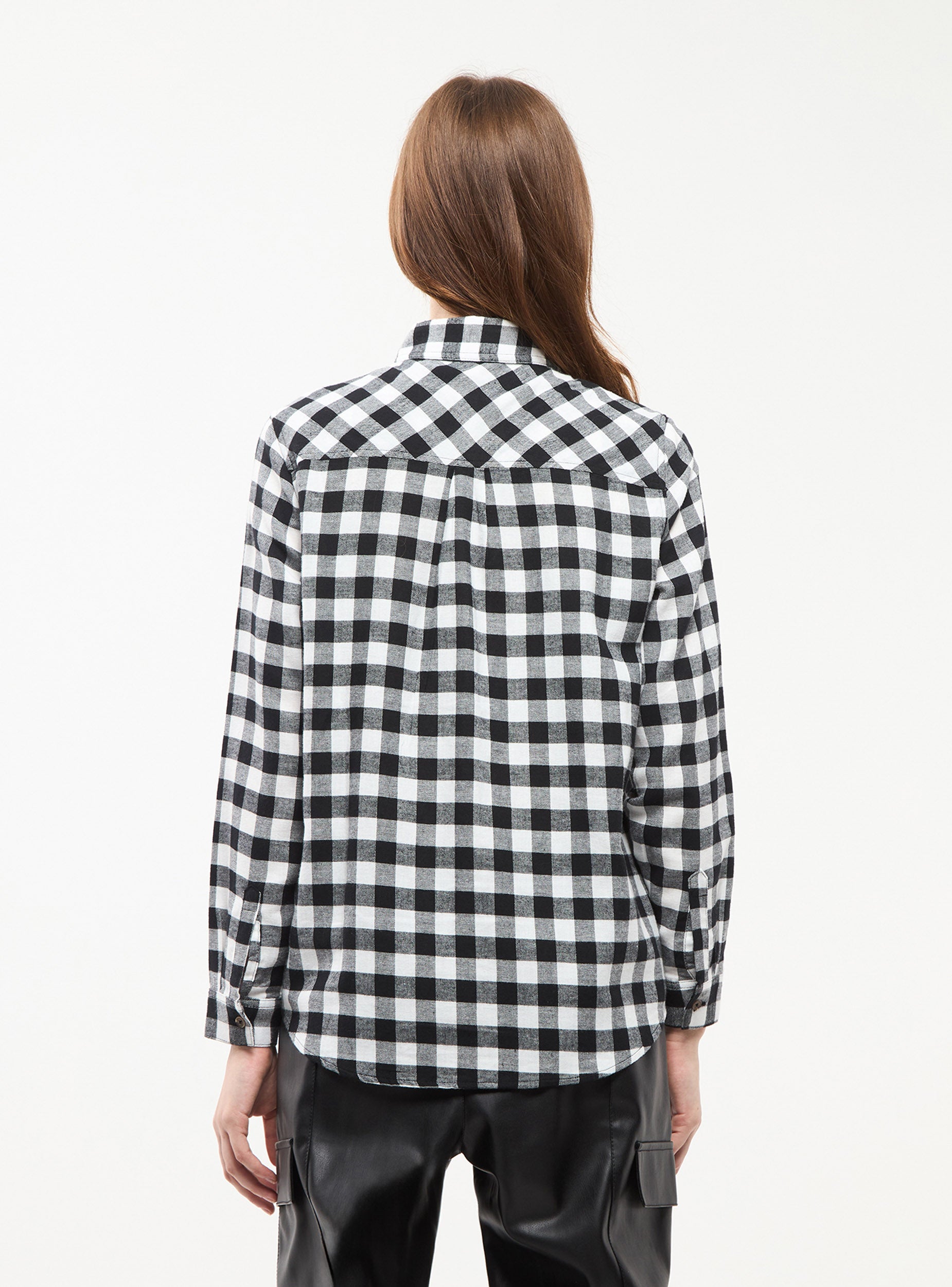 Camicia da donna a maniche lunghe. Fantasia a quadri, tessuto flanella.