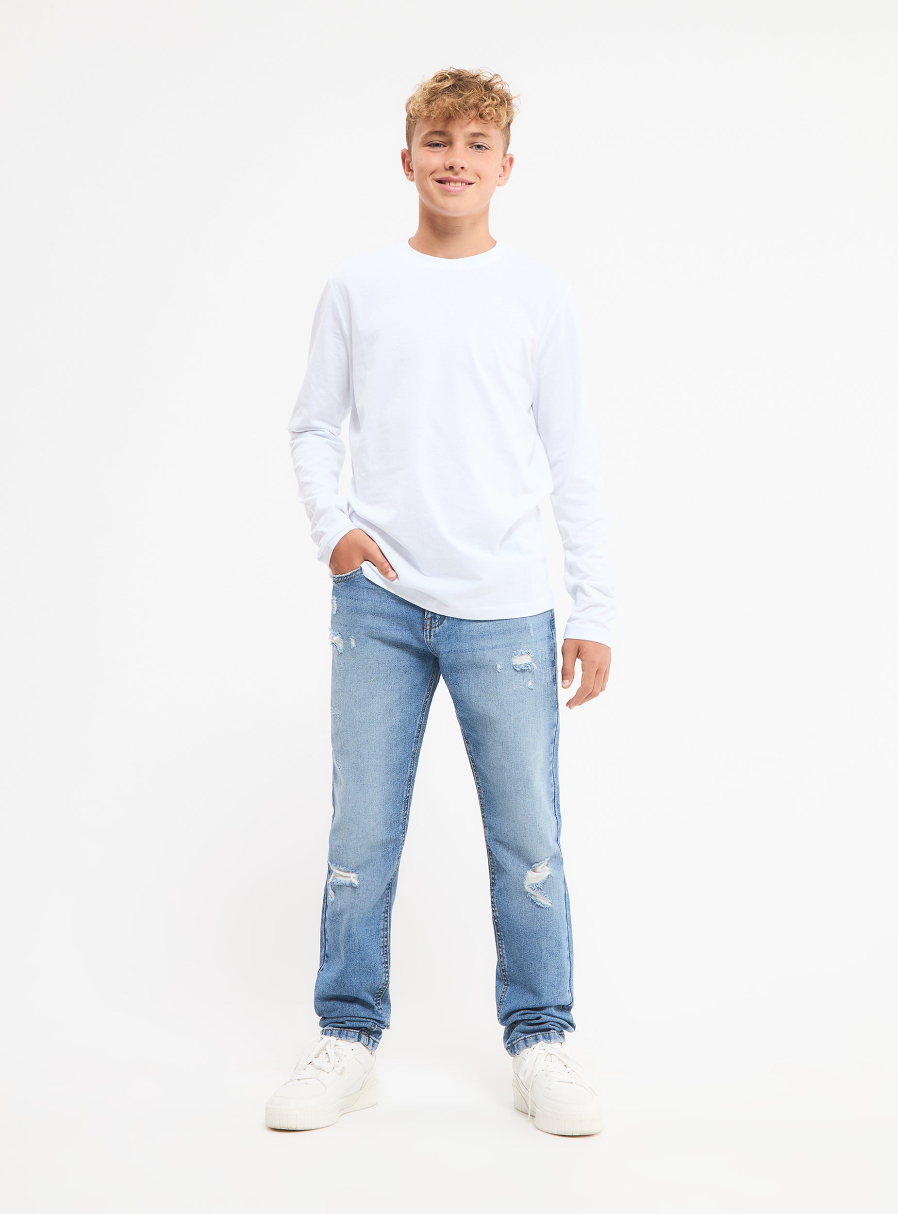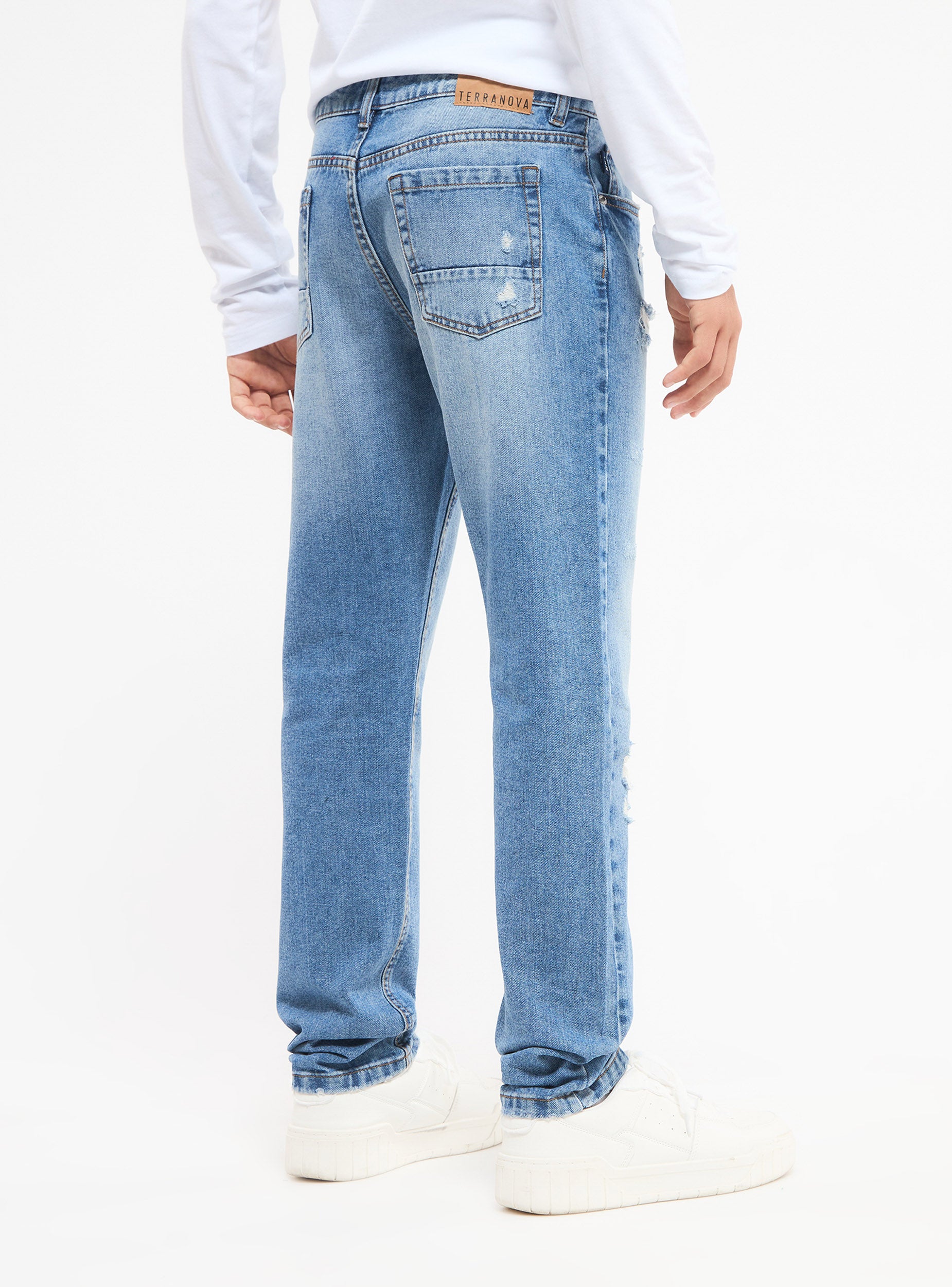 Jeans da bambino a 5 tasche con rotture. Lavaggio blu denim medio. Vestibilità  regular.